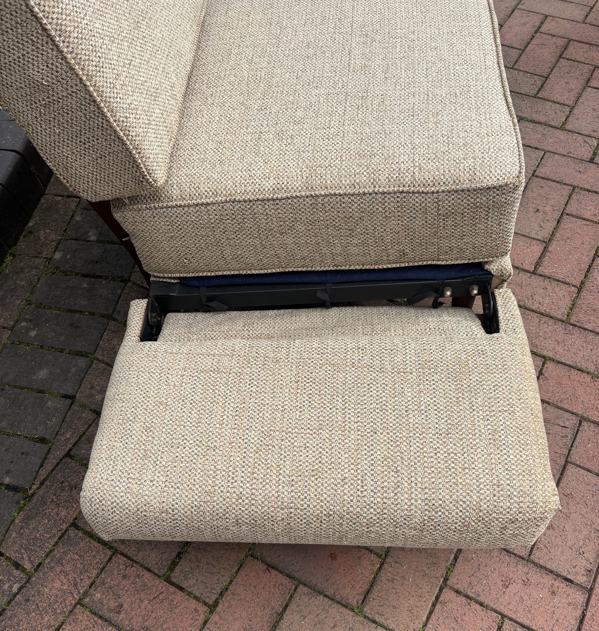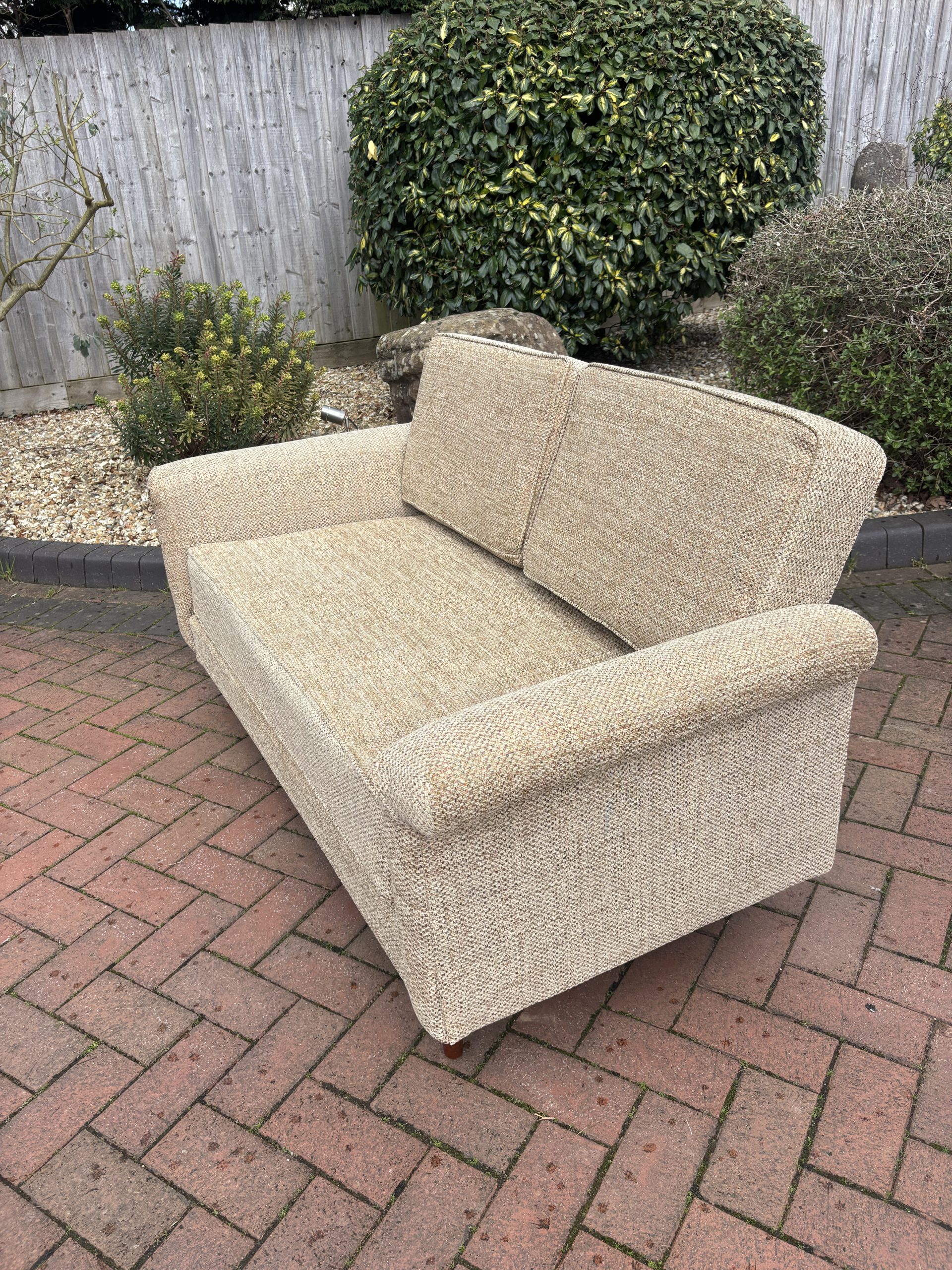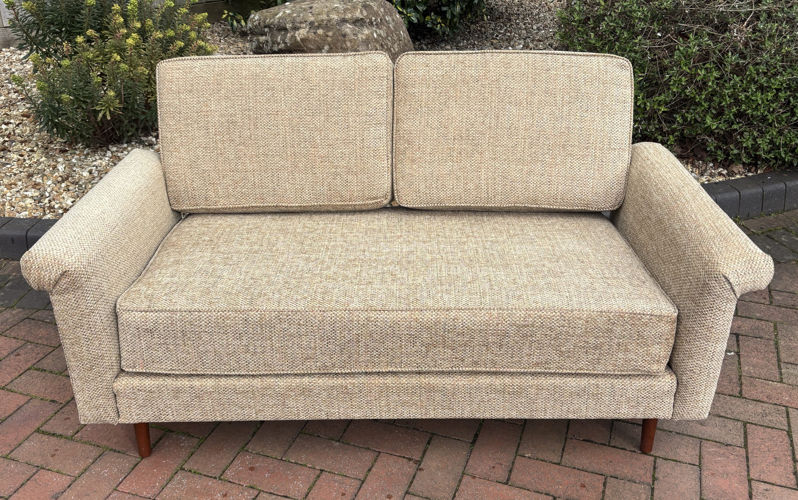 Newly and fully upholstered, taken back to the frame to include new cushions and fabric to meet with fire regulations.