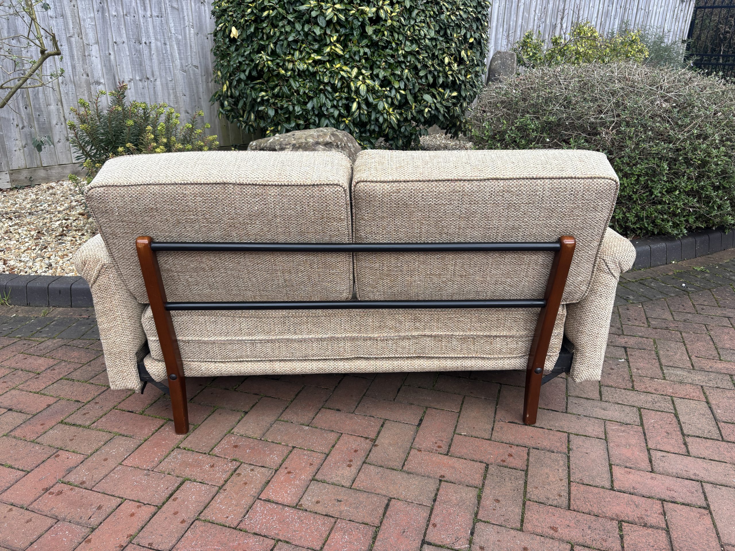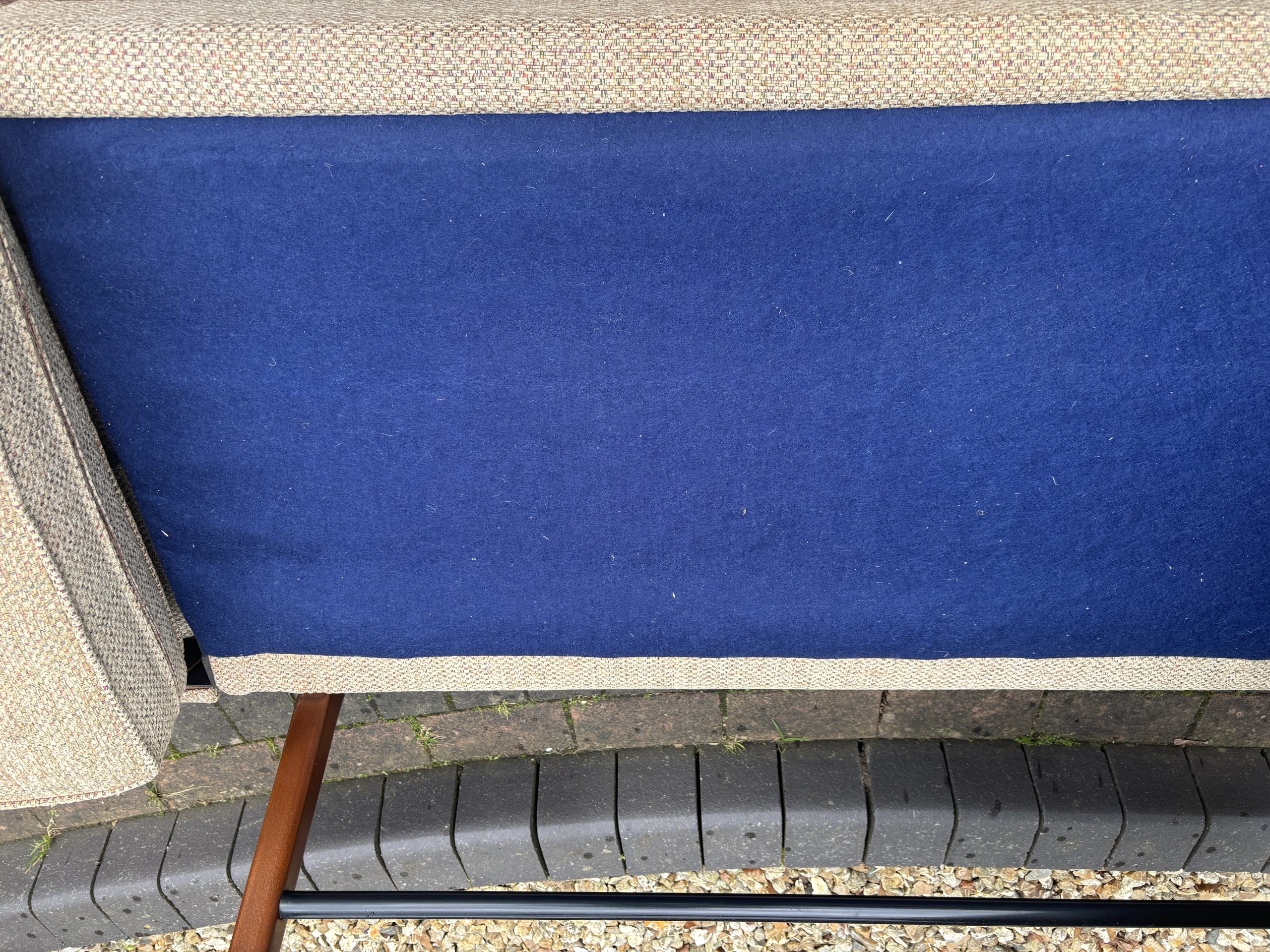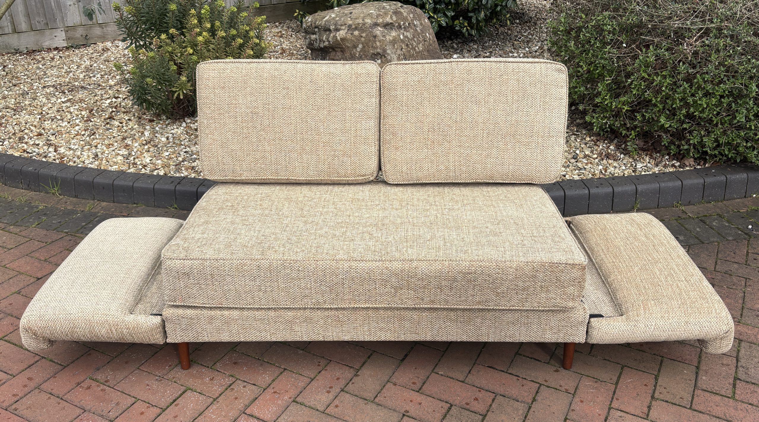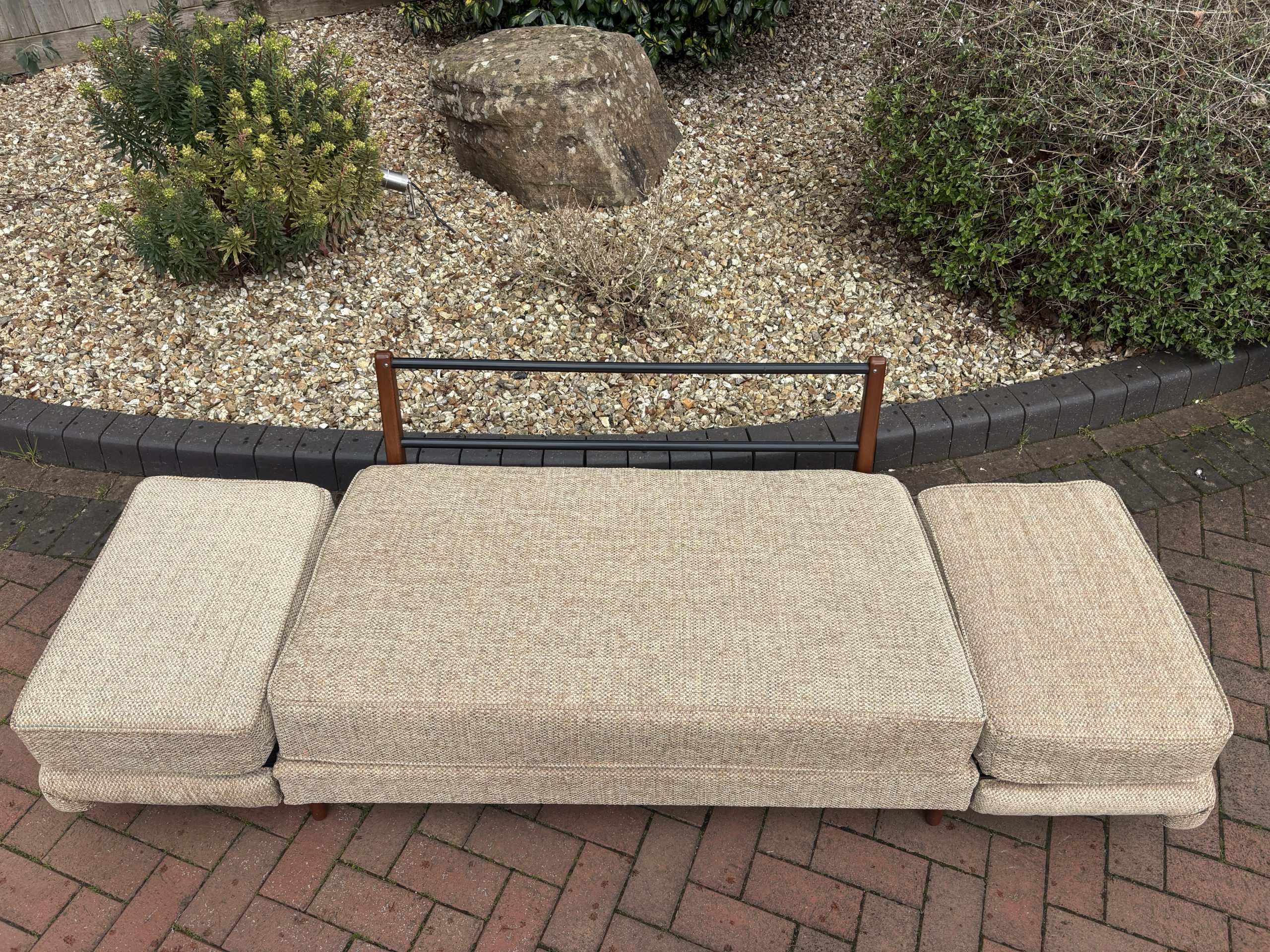 A mid century sofa / day bed c1960’s. The sofa has a teak frame, metal back supports and a steel sprung mattress base. The armrests lift up and drop down to support the back cushions when converted to a sofa bed / day bed.