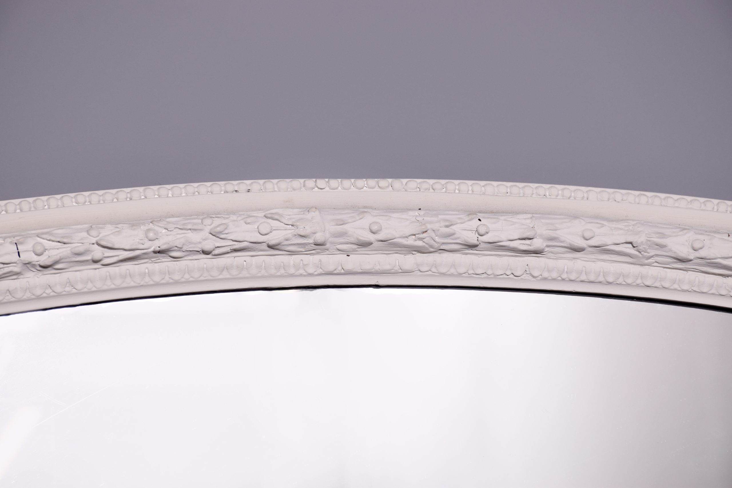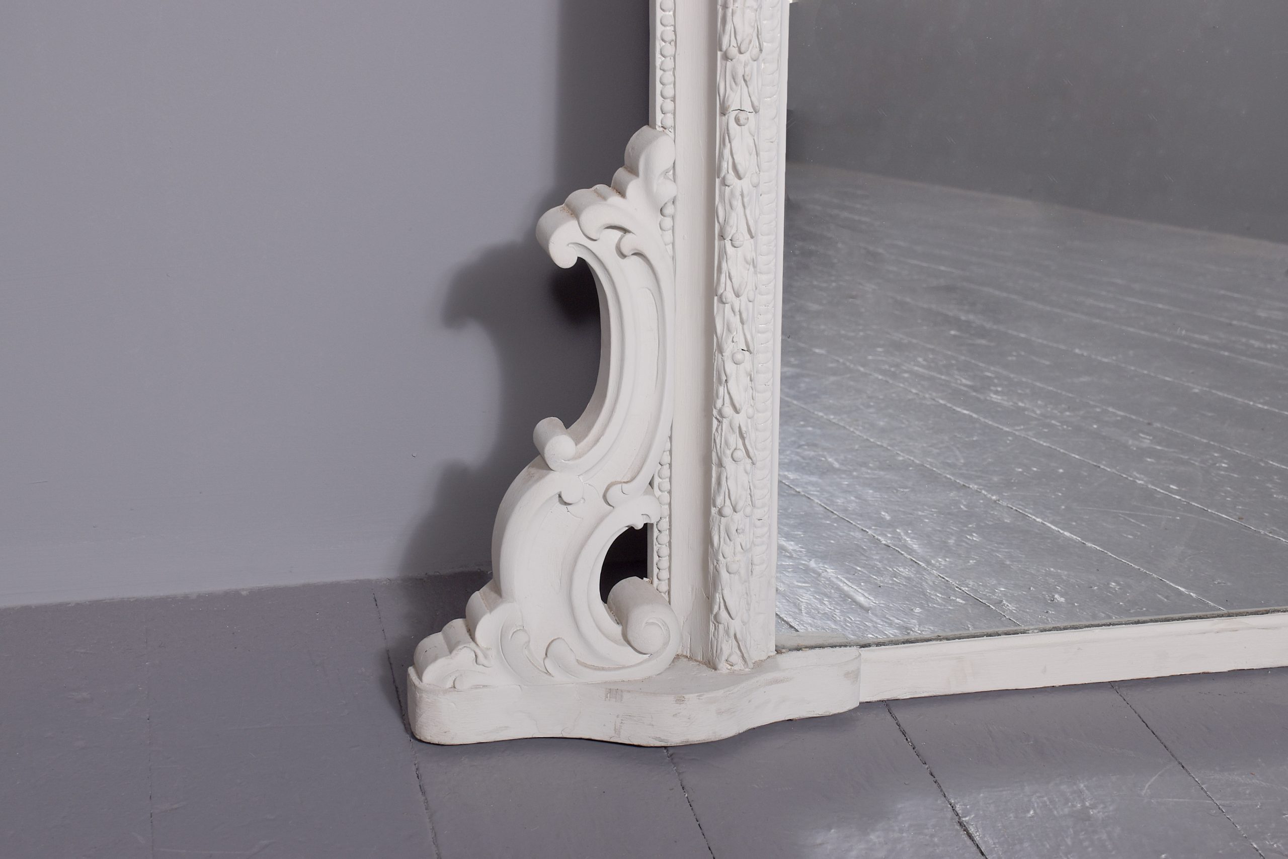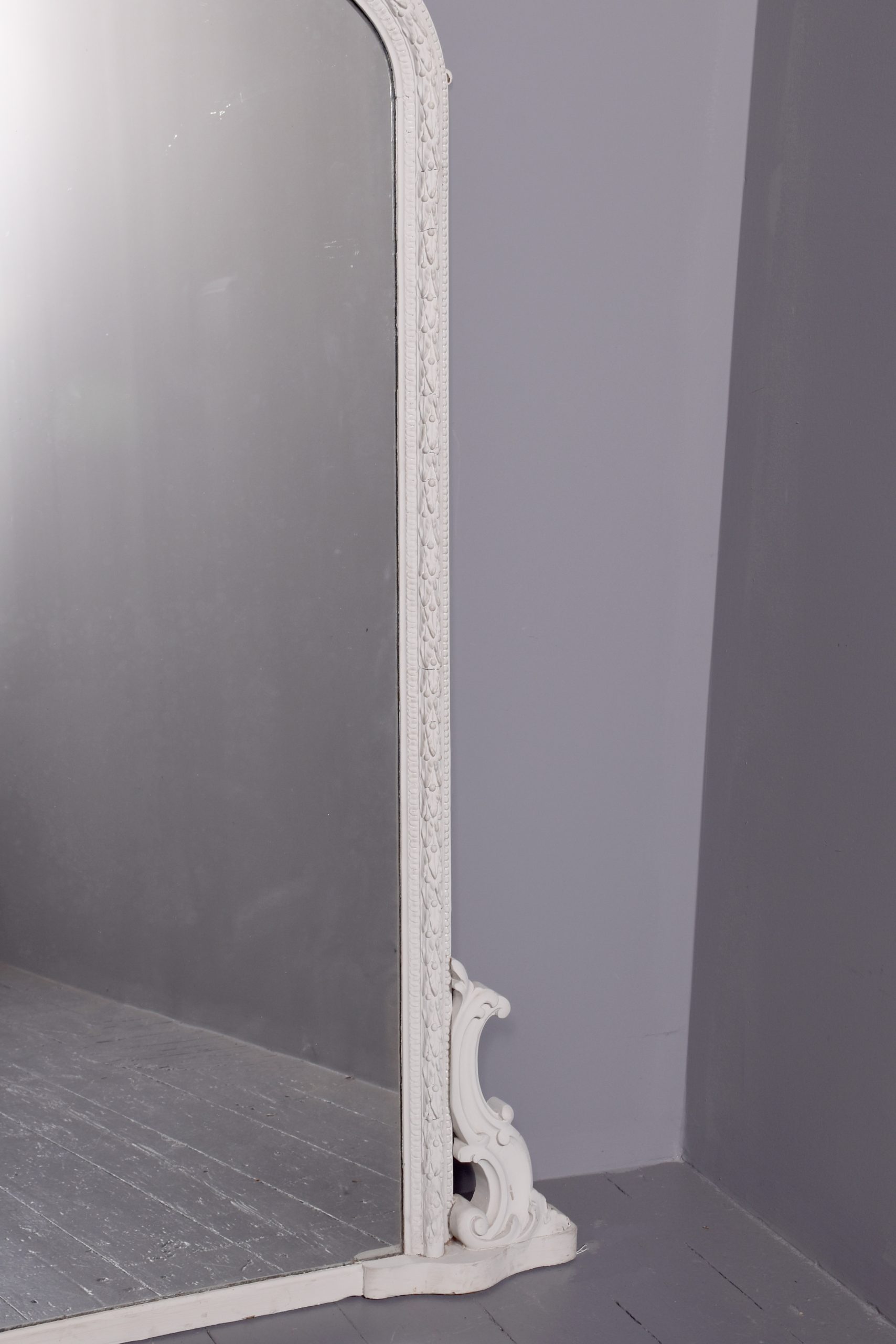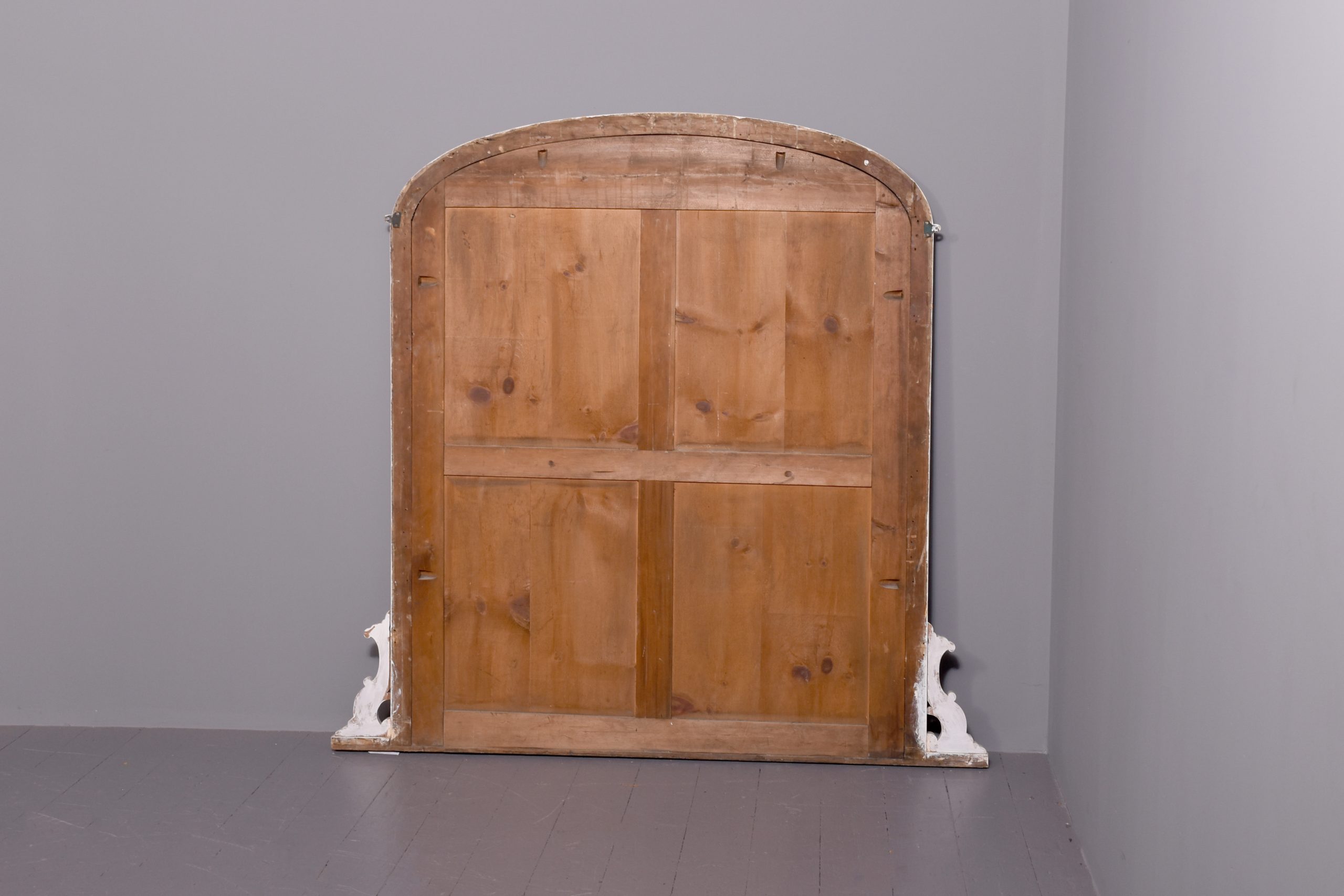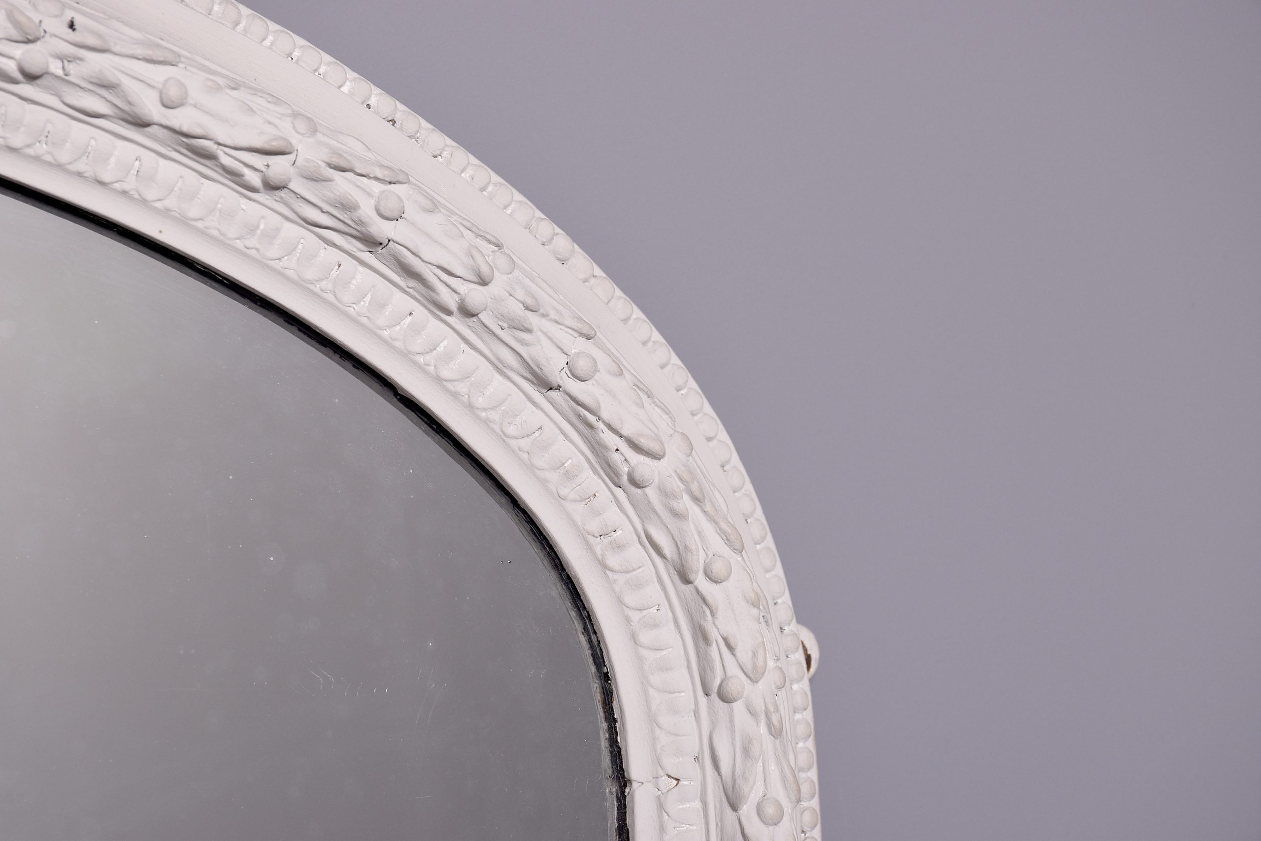Circa 1860. Mid Victorian grey painted &gesso overmantel mirror, recently restored with Farrow & Ball paint. The arched top and beaded rim above the moulded frame with laurel foliate decorations and the original mirror plate.