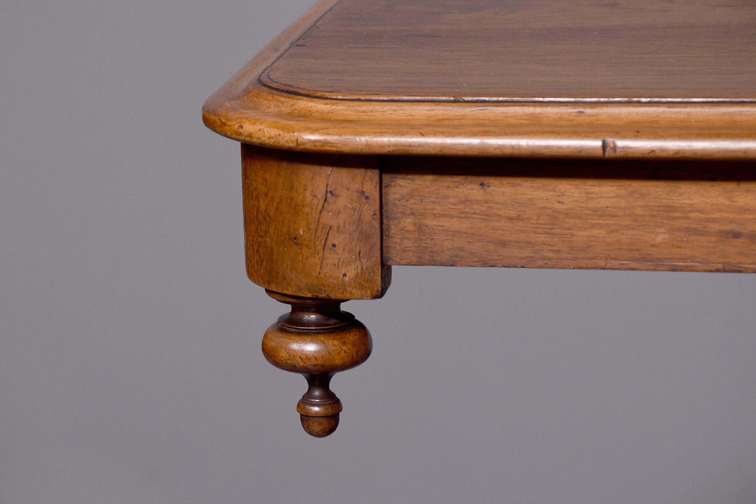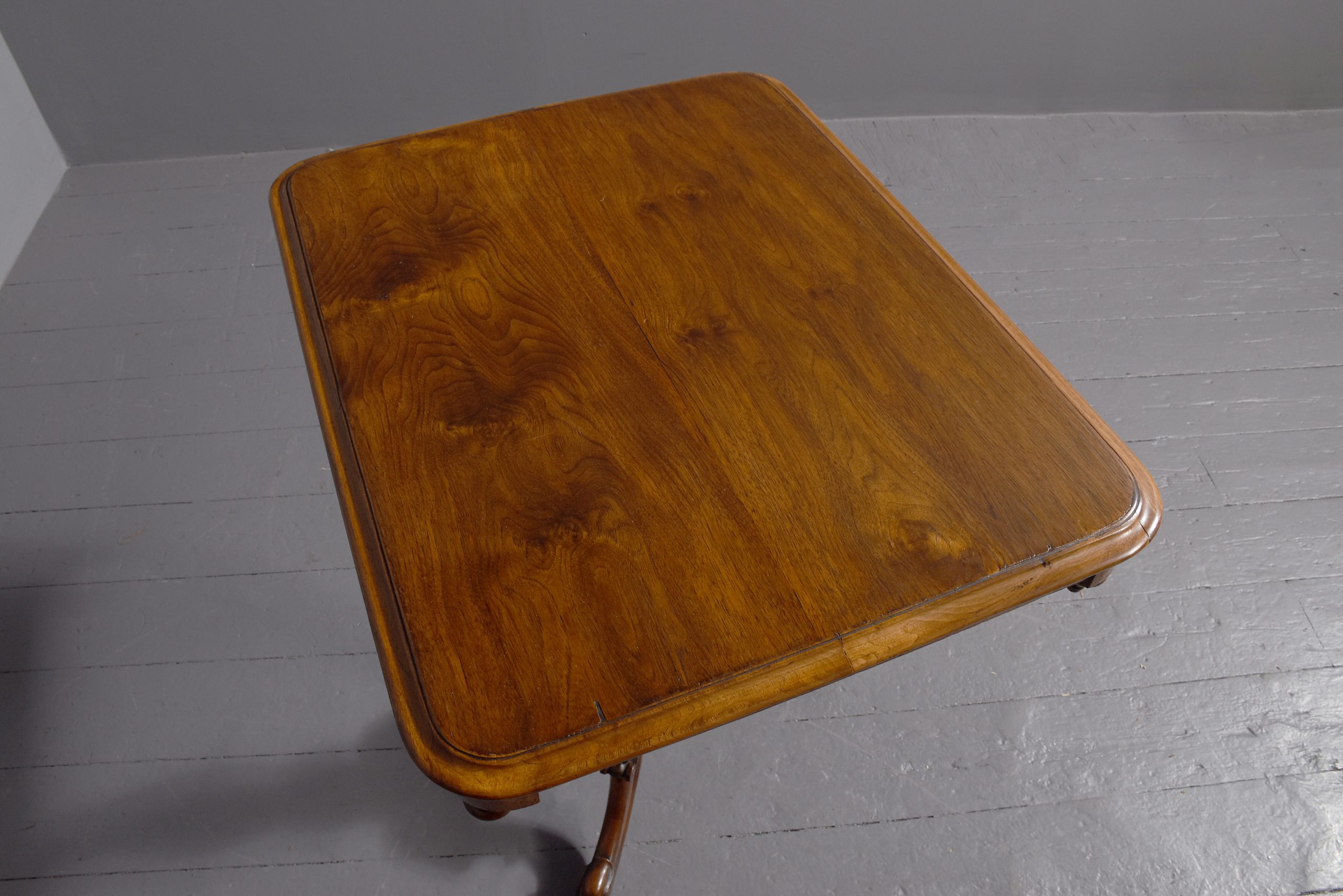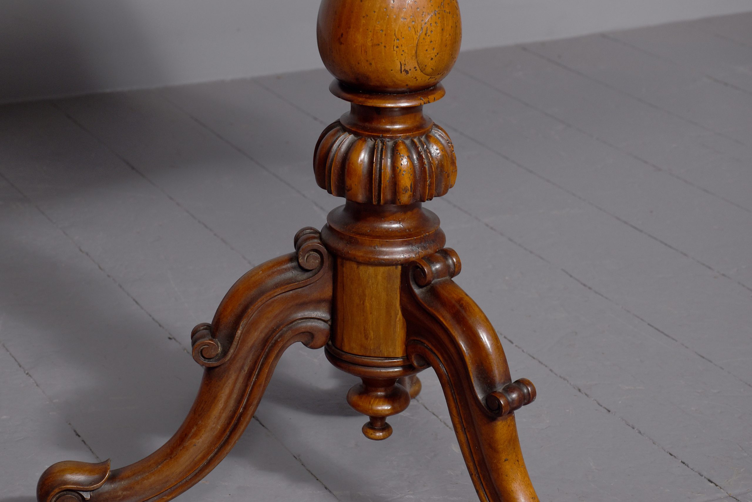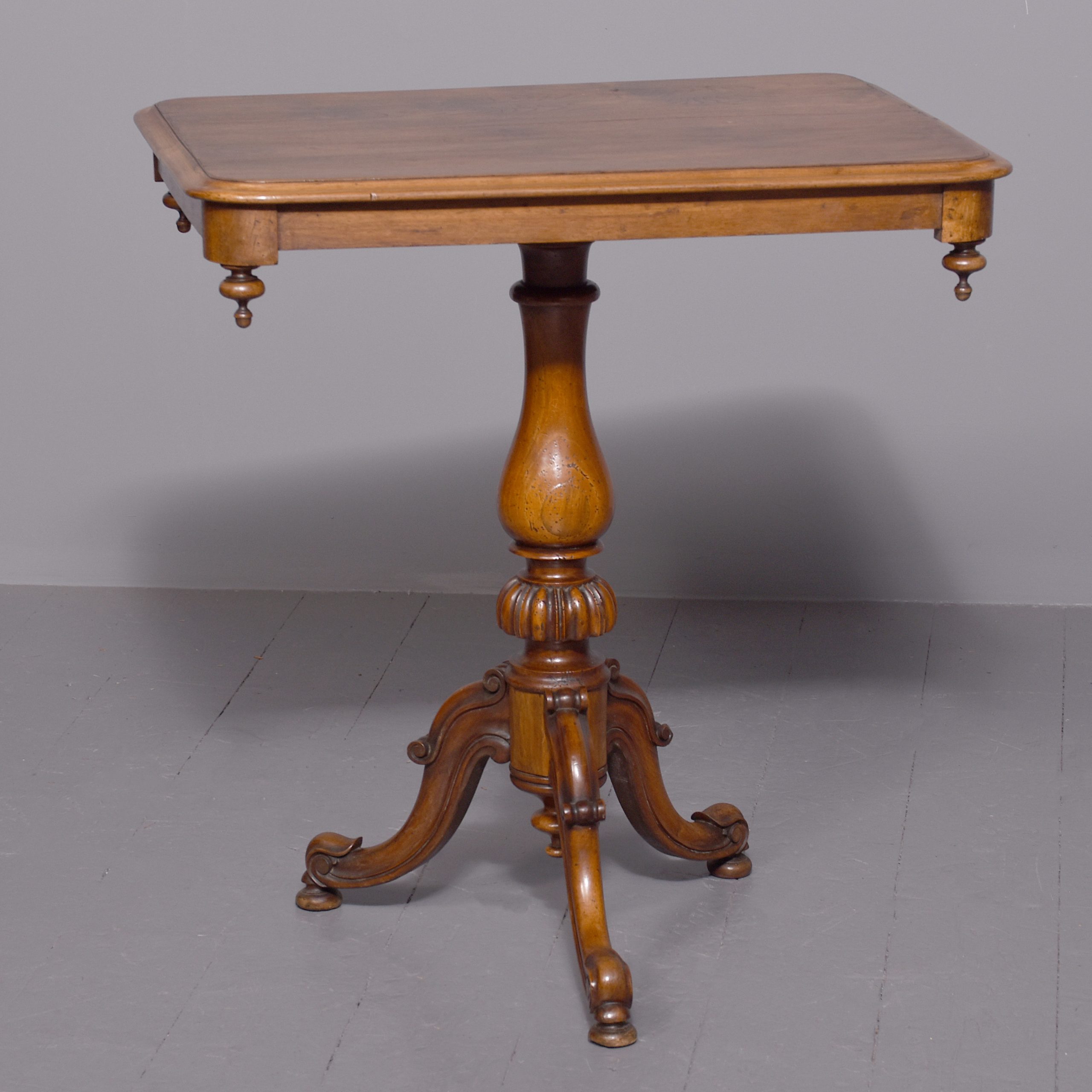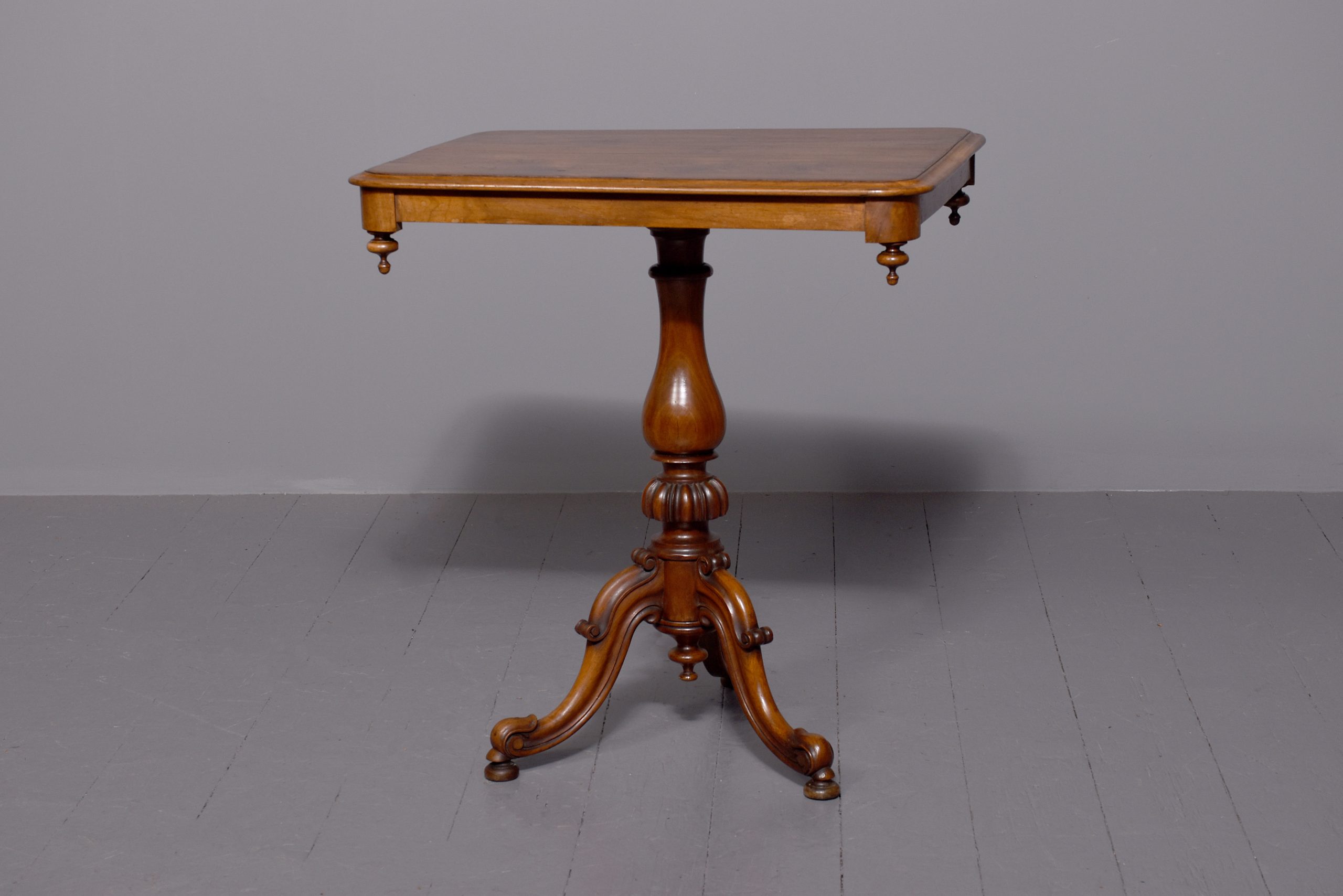 Circa 1860. Mid Victorian octagonal shaped, figured walnut occasional table on a stylish tripod base. The rectangular top in nicely figured walnut with moulded fore-edges and a supported on a vasiform and fluted stem over three scrolled cabriole legs with scrolled toes over neat pads. Lovely colour and patina