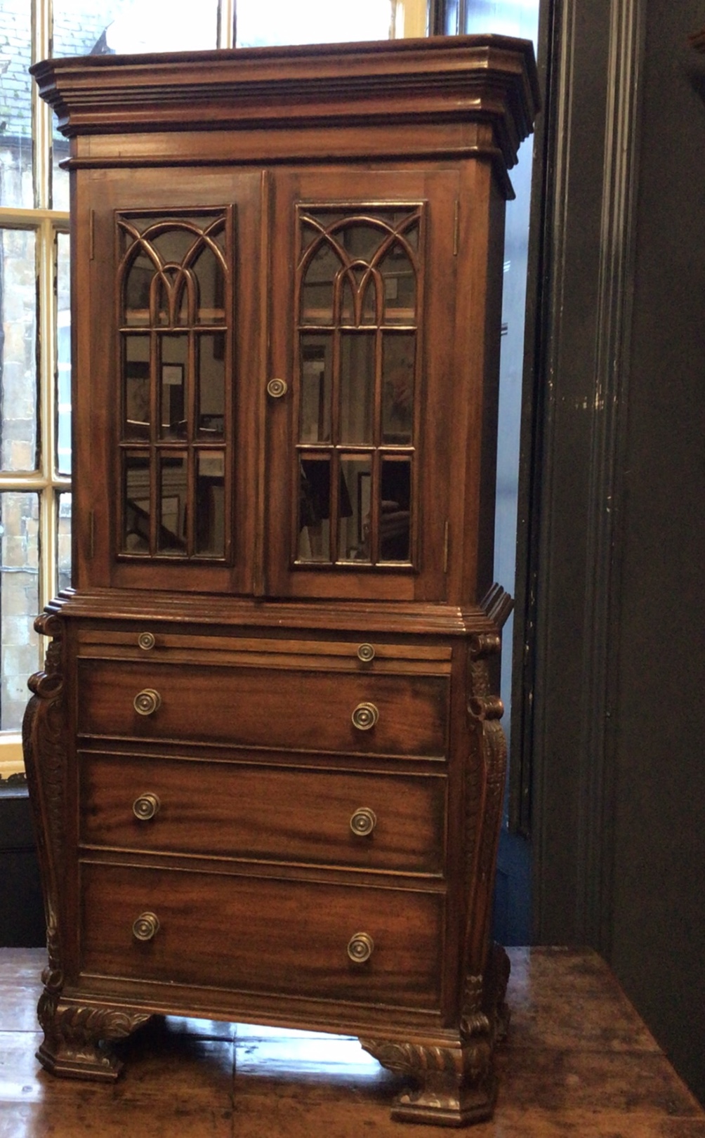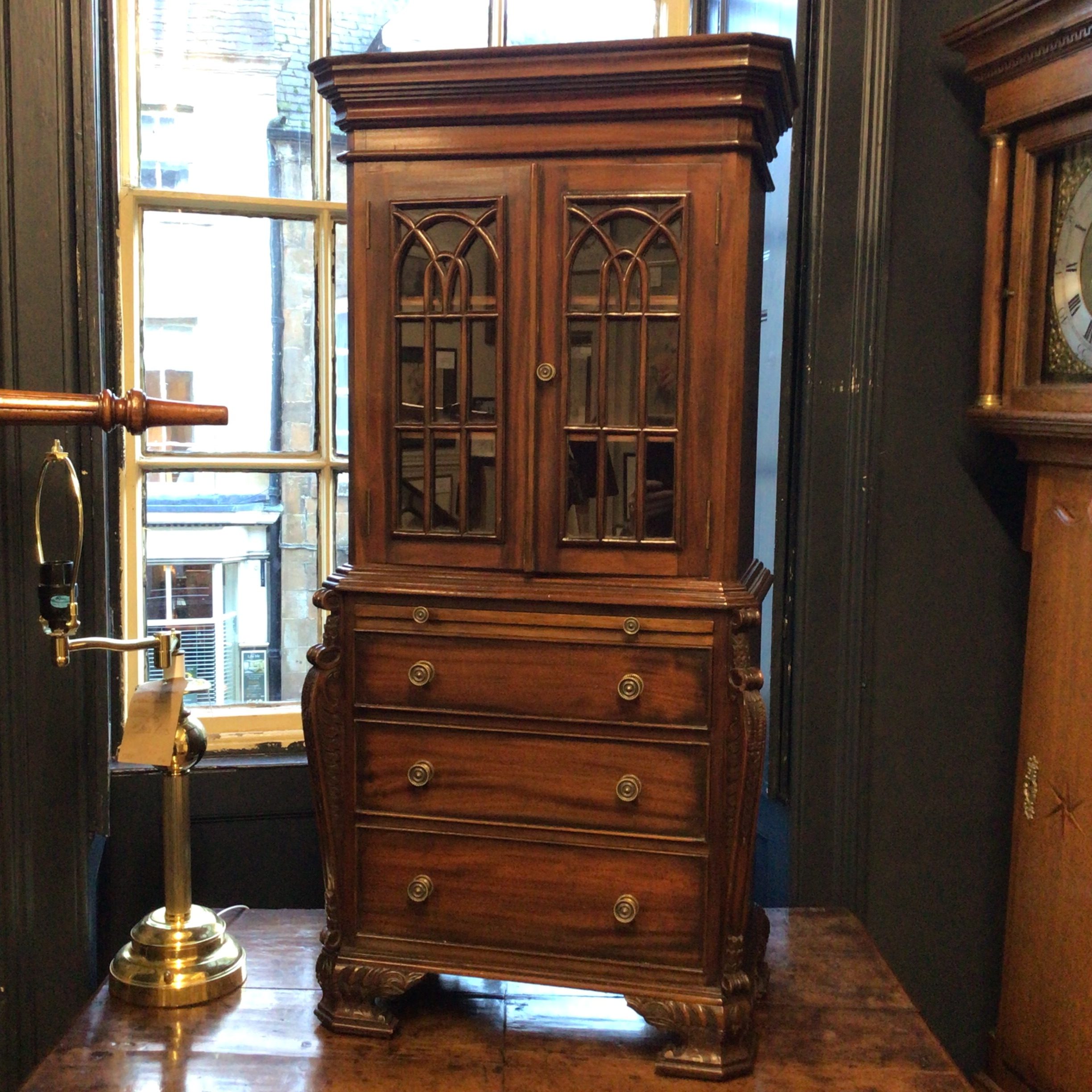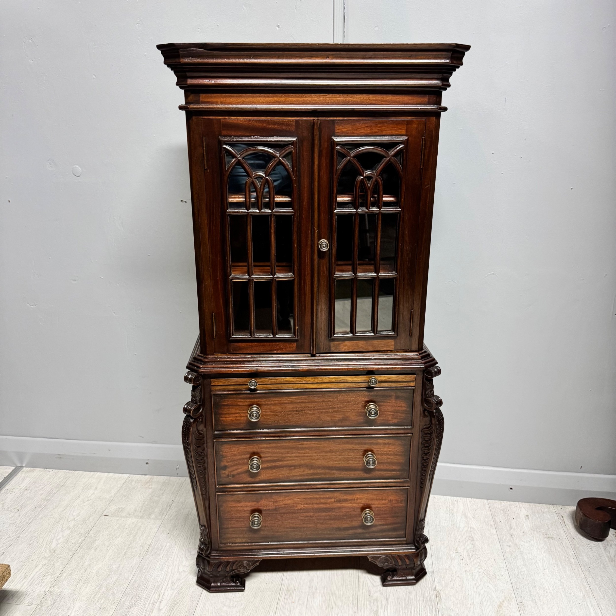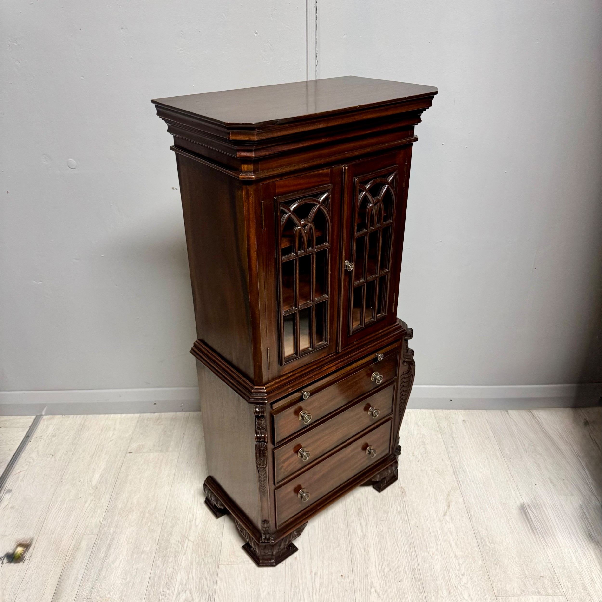 Small Reduced to 1/4 size Miniature Bureau Bookcase cabinet with a 3 drawer base and pull out writing slope below the glazed cabinet with fixed shelves and the top surface ideal for display items such as clocks and ornaments.