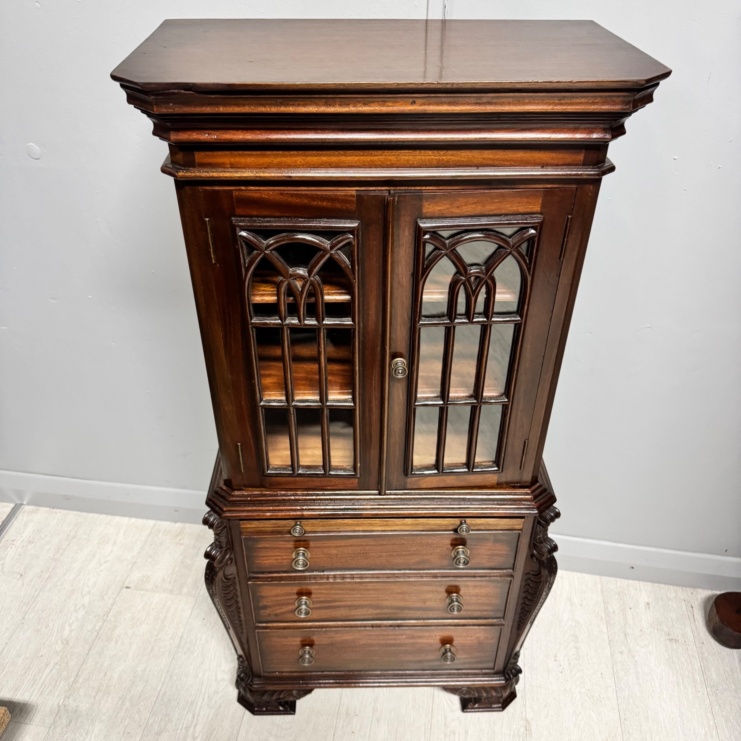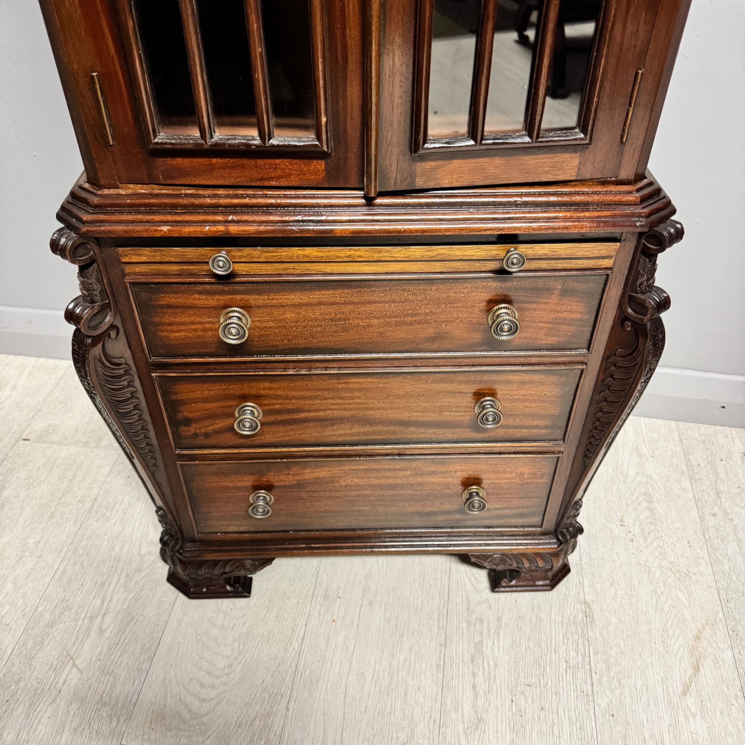 French polished finish with glazed cabinet doors.