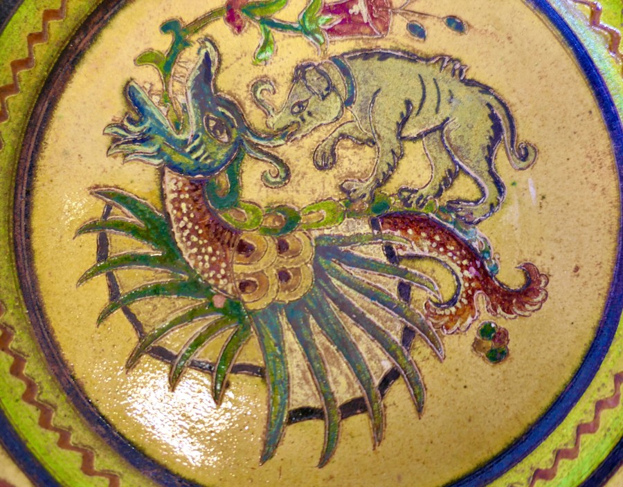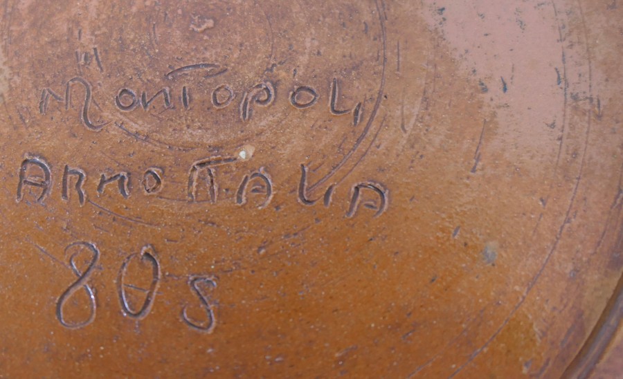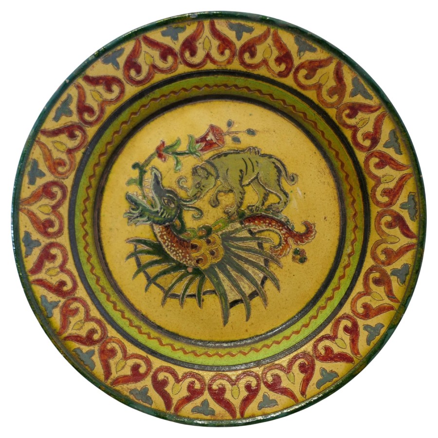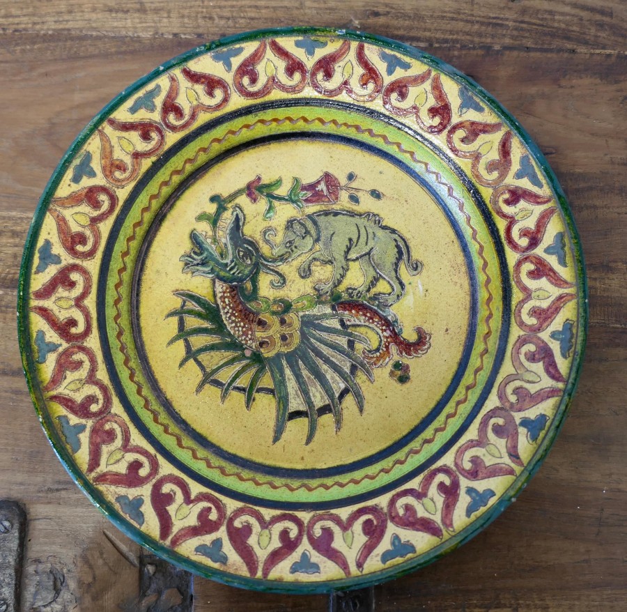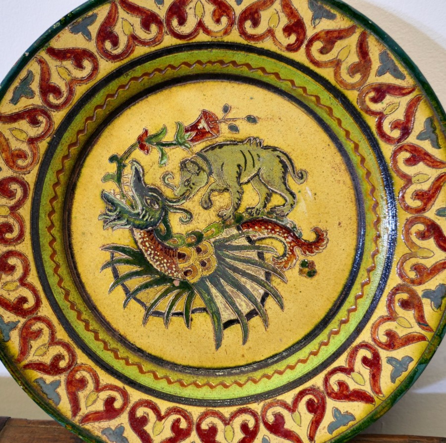 Montopolyi Arno Italian Plate with Dragon and Bear An unusual piece made in terracotta marked Montopolyi Arno, the plate is a very attractive piece relief decorated with plants, a bear like creature and a flying creature In sound condition the plate is 12” in diameter ZX91 Manufacture Date : 1950 Materials : Terracotta