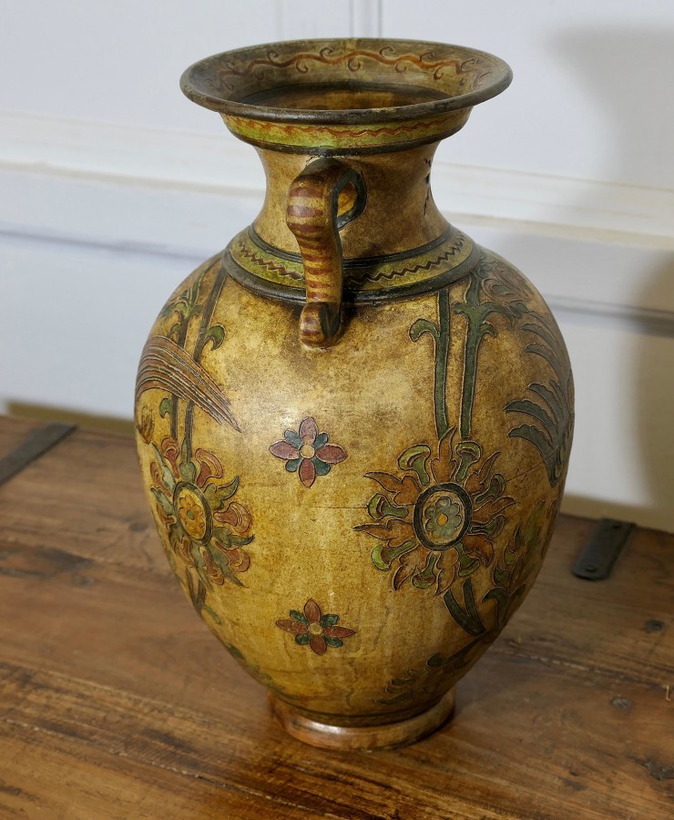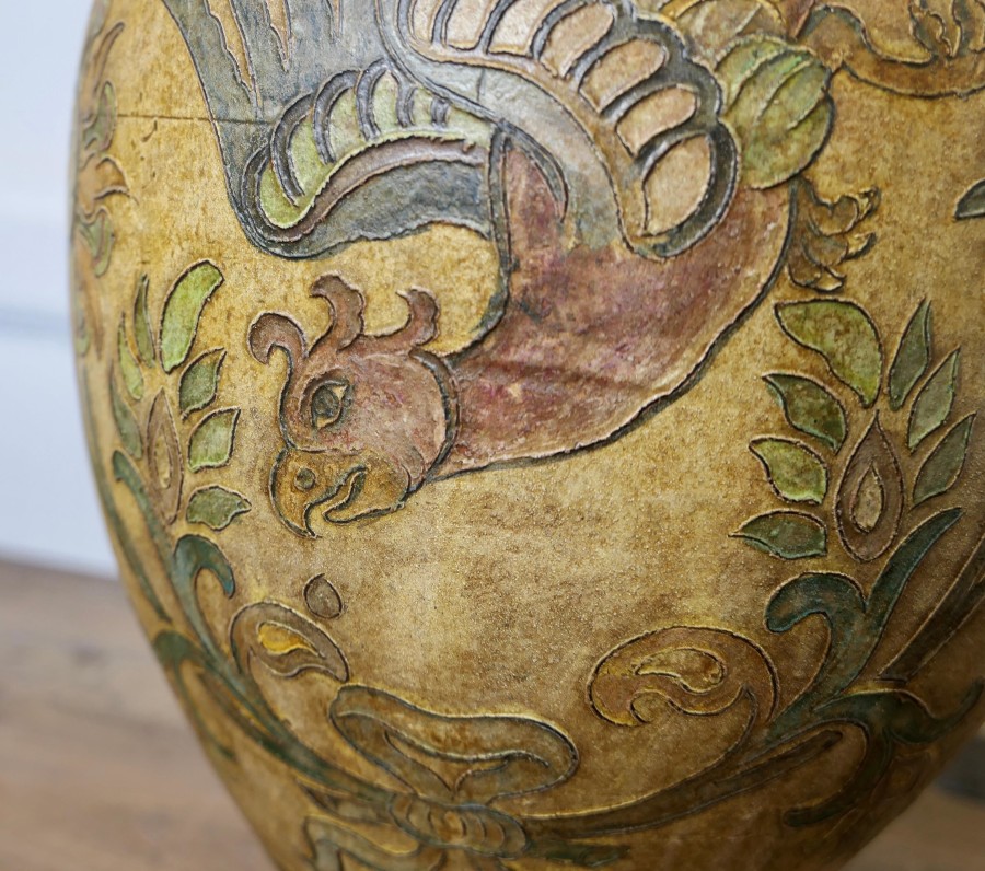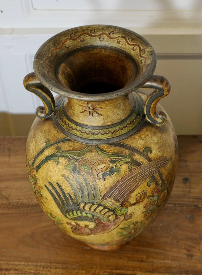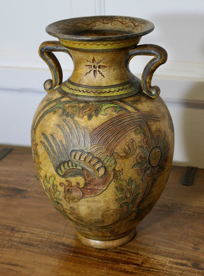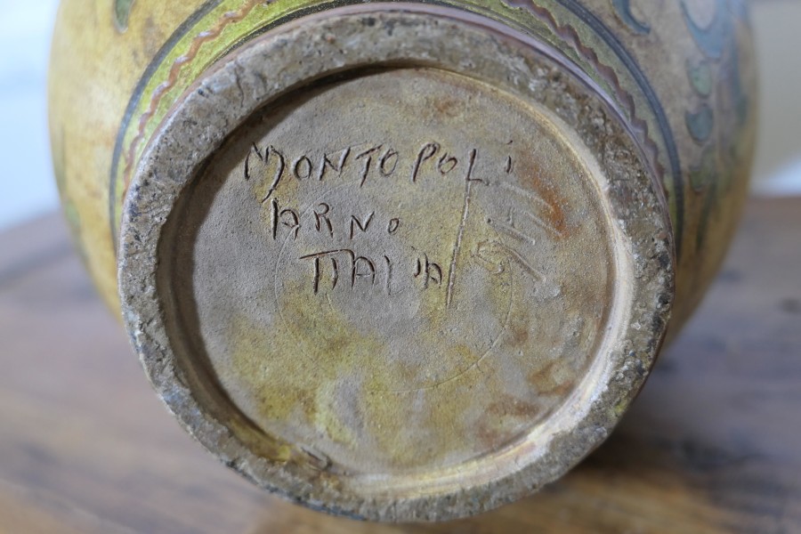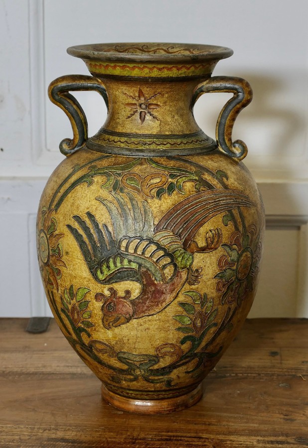 Montopolyi Arno Italian Vase with Dragons An unusual piece made in terracotta marked Montopolyi Arno, the vase a very attractive piece relief decorated with plants and flying creatures In sound condition13” high ams 9” in diameter ZX82 Manufacture Date : 1950 Materials : Terracotta