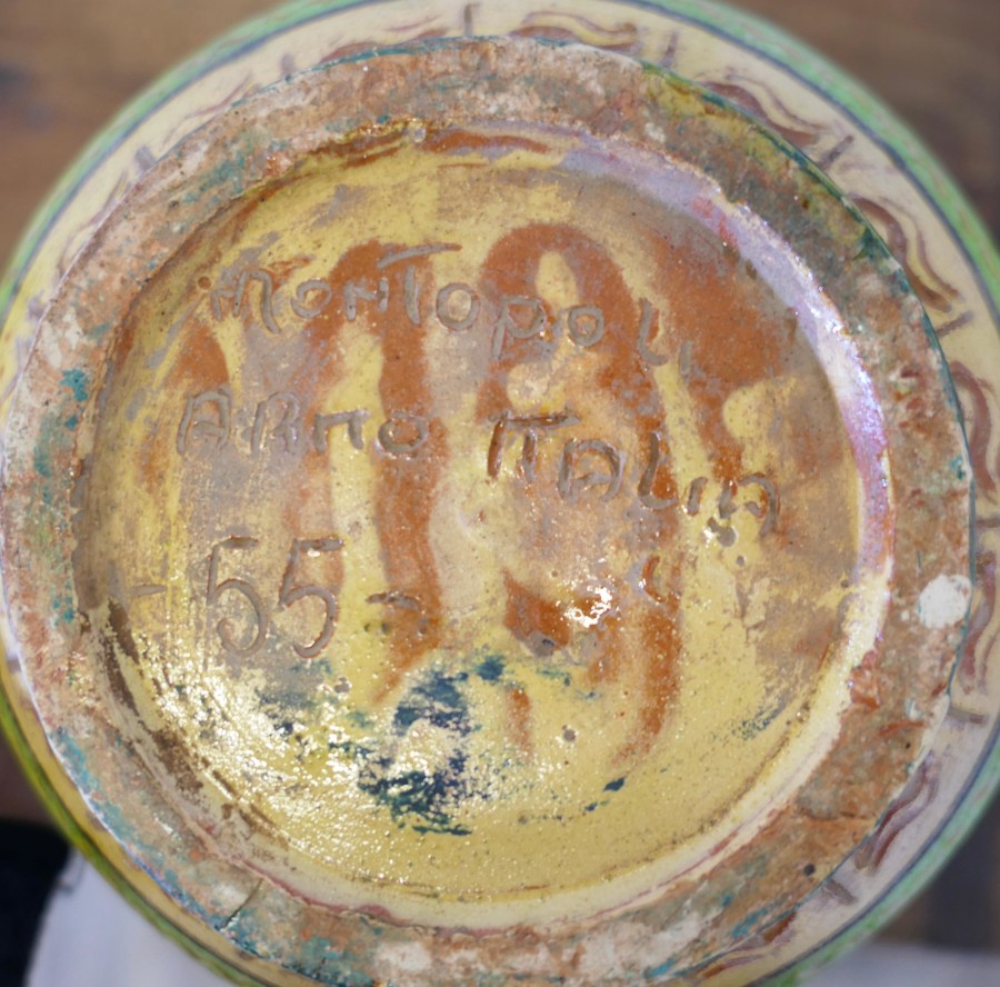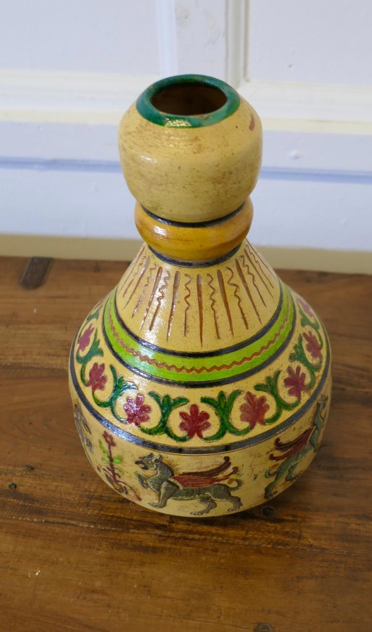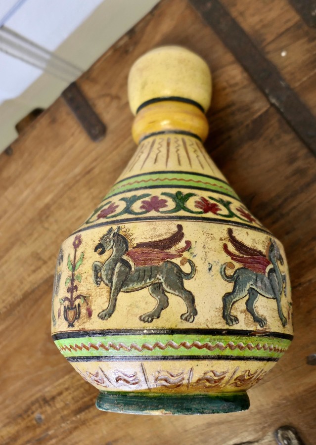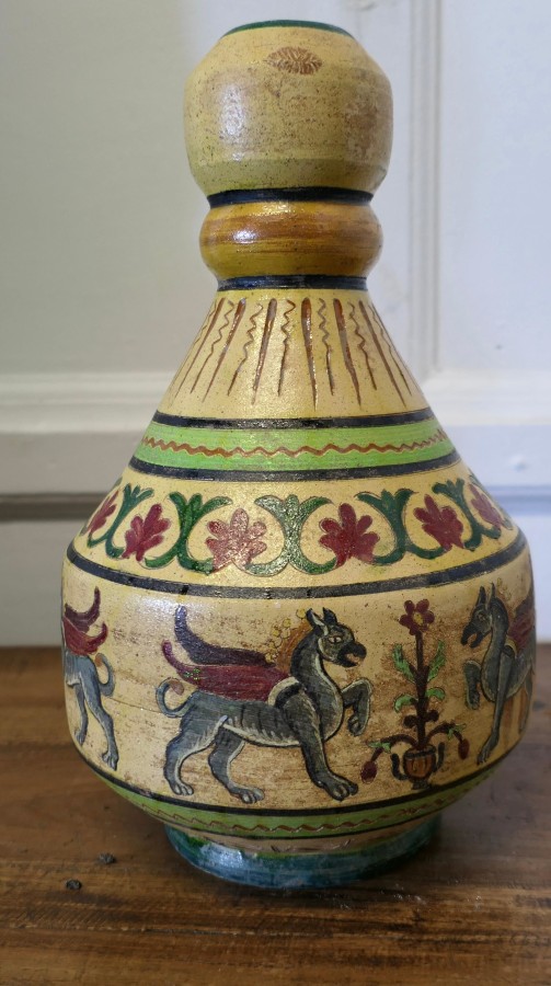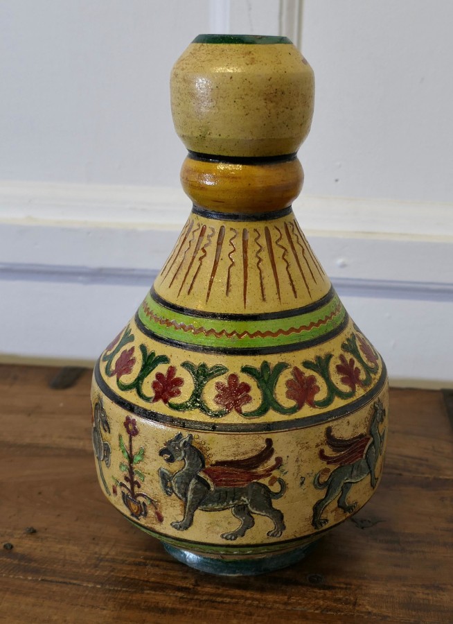 Montopolyi Arno Italian Vase with Winged Guardians An unusual piece made in terracotta marked Montopolyi Arno, the vase a very attractive piece relief decorated with plants and 4 legged winged creatures In sound condition 13” high amd 9” in diameter ZX92 Manufacture Date : 1950 Materials : Terracotta