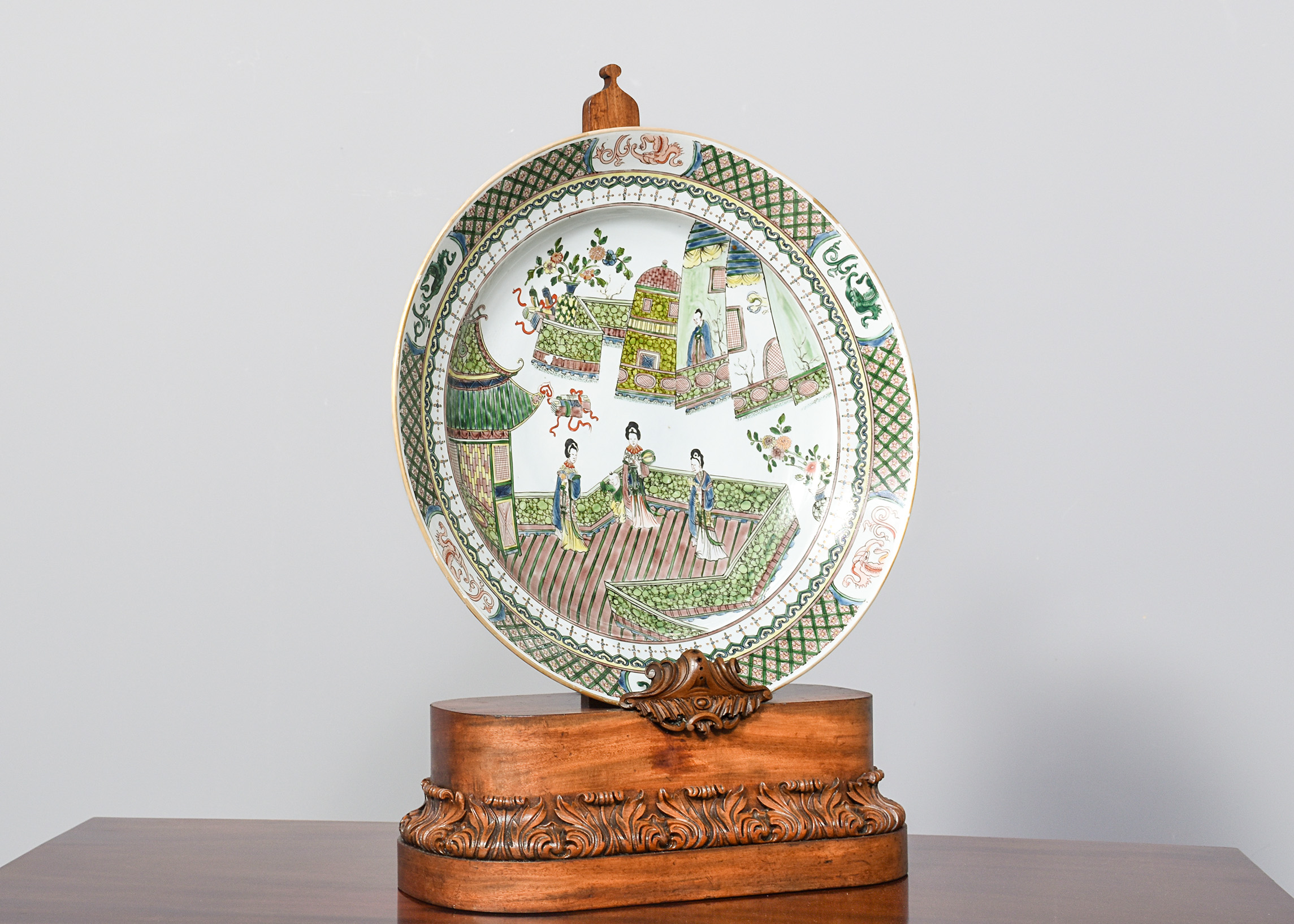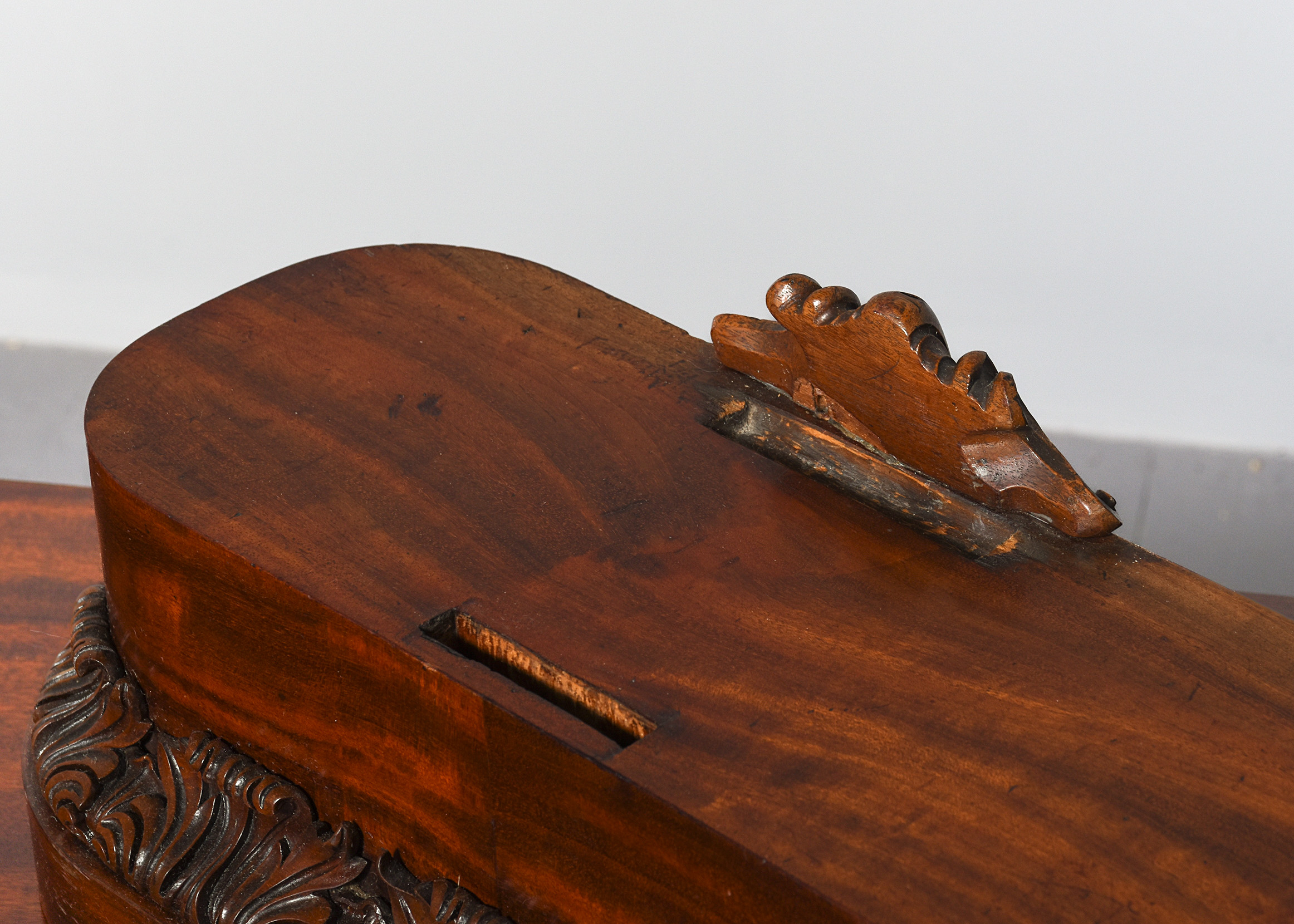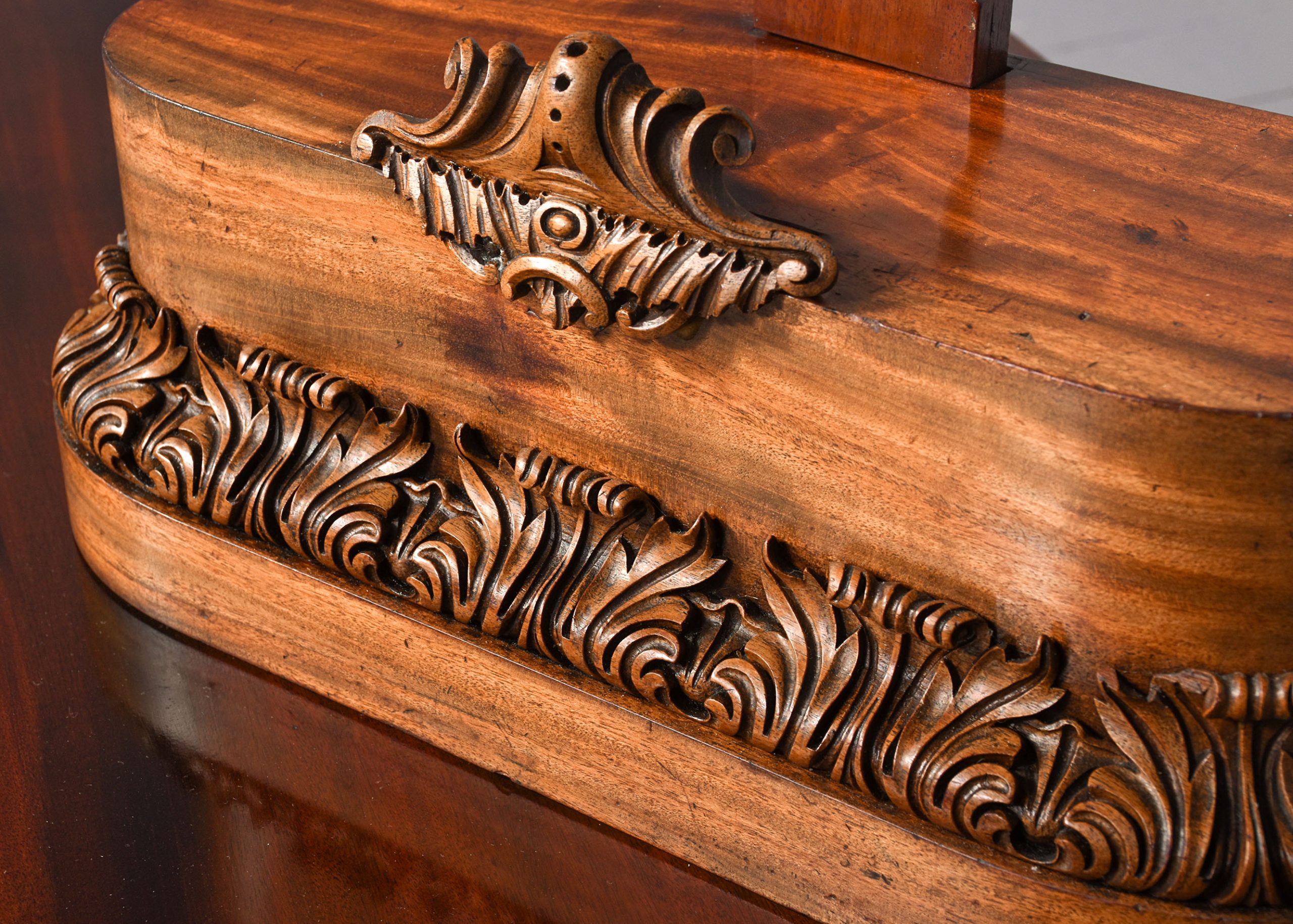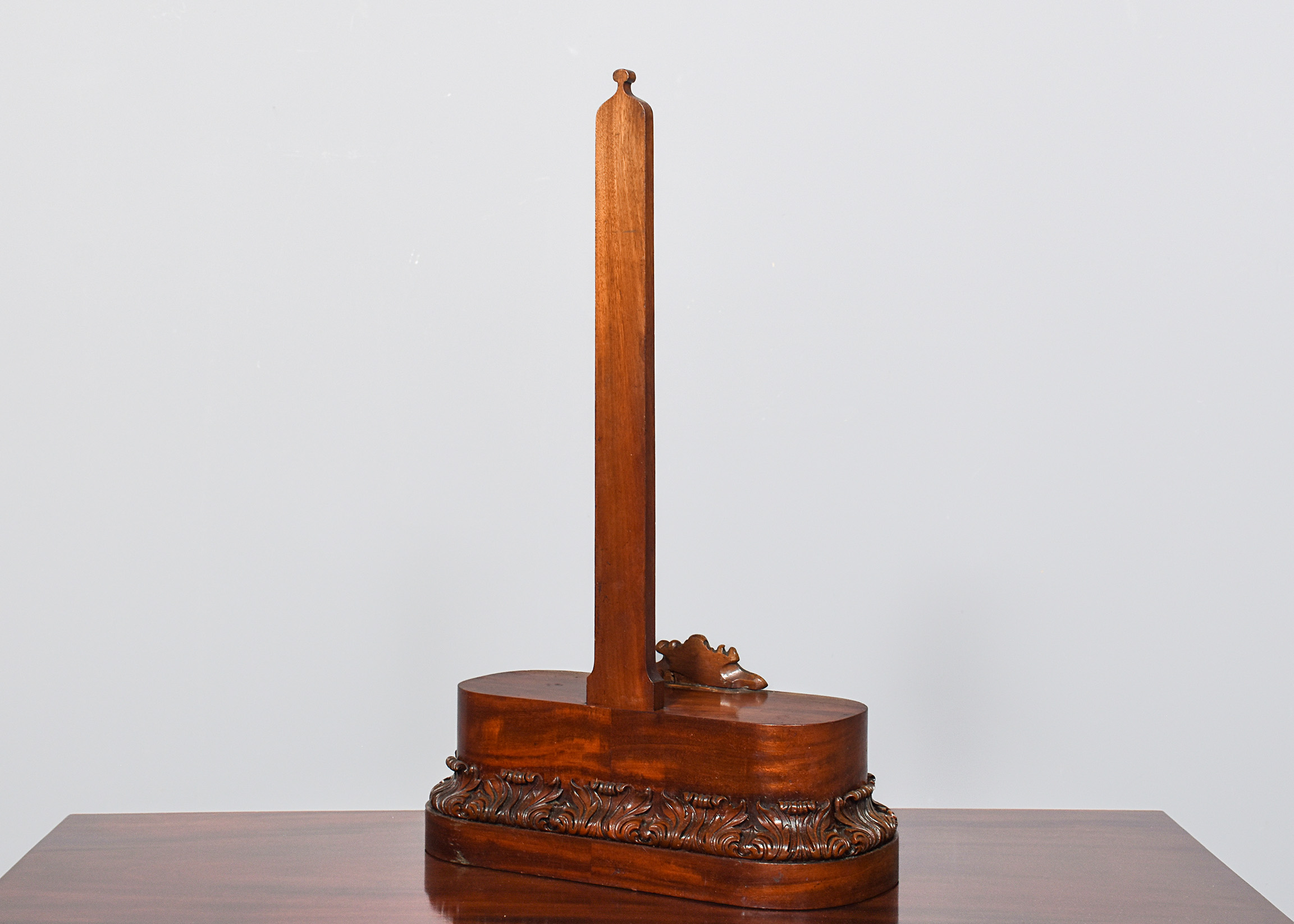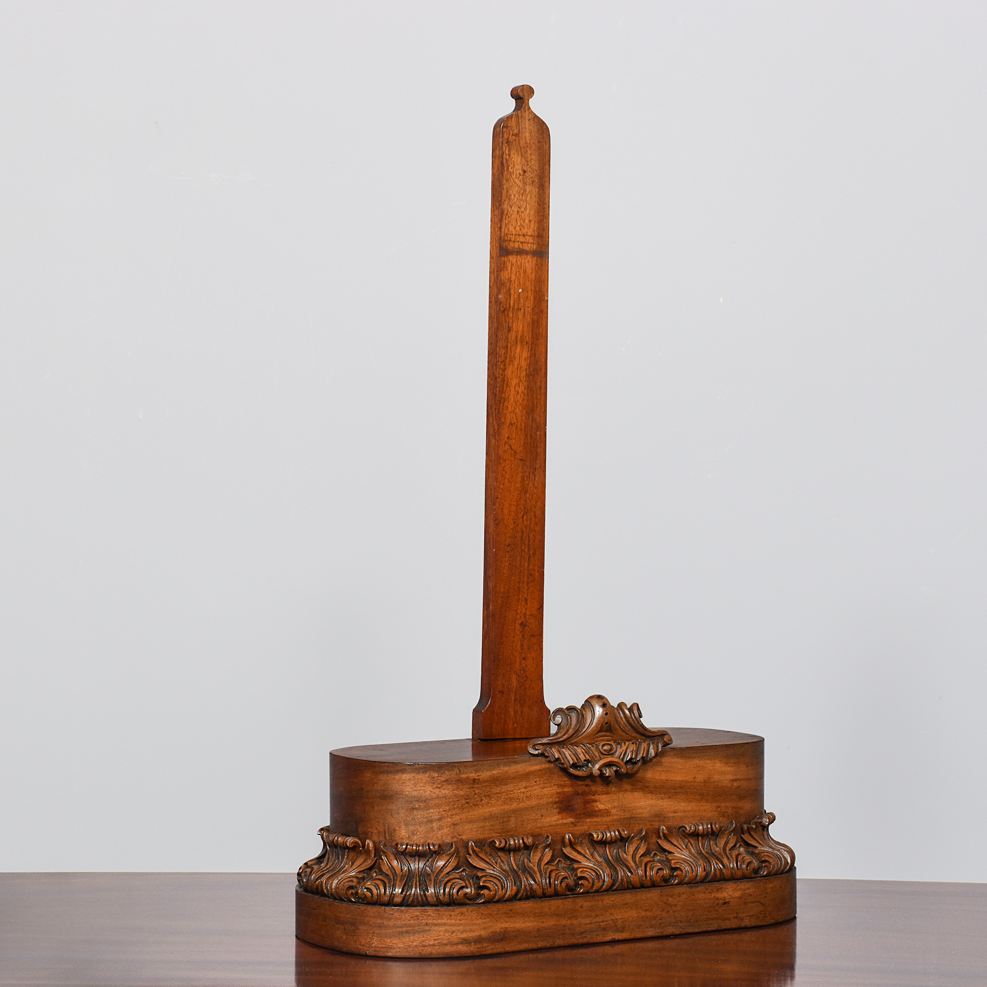 Circa 1820. Quality carved mahogany George IV plate stand of monumental proportions, with the shaped upright surmounted with a small elegant shape, the elongated oval base with a small aperture towards the front for holding the plate in place, faced by a carved raised section with foliate carving and scrolling C and S scroll, the oval body with a foliate carved wrap around, all resting on an enclosed mahogany plinth.