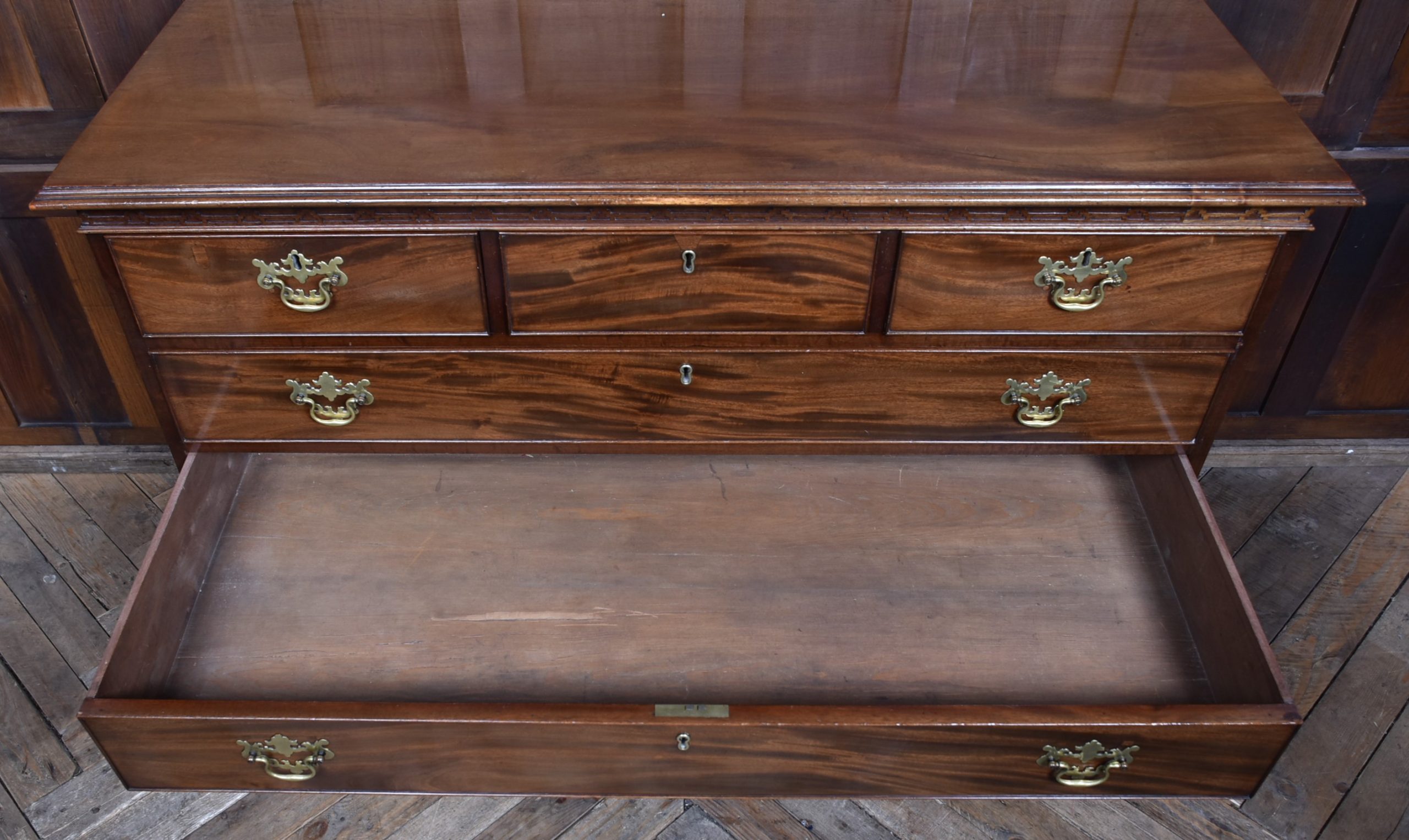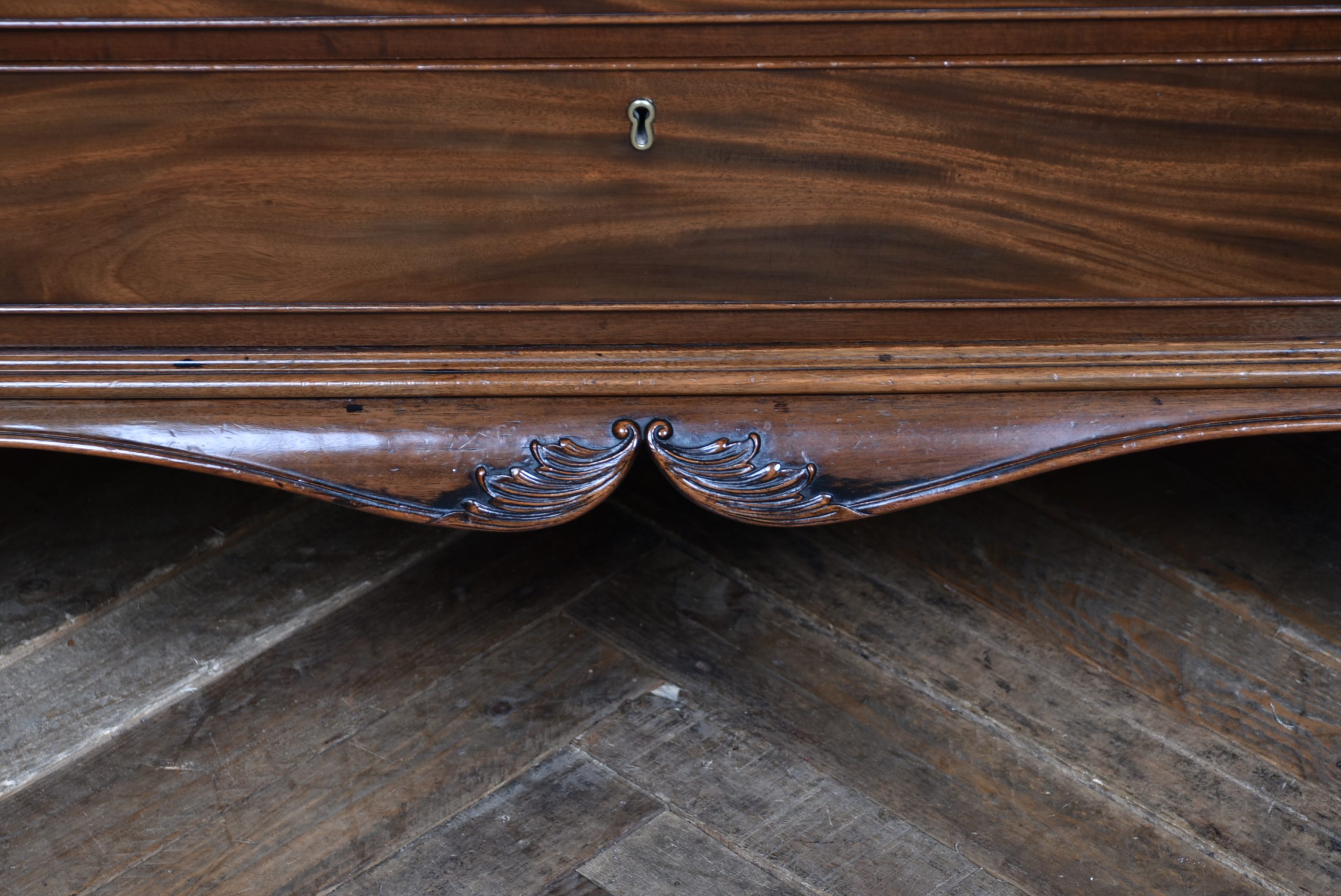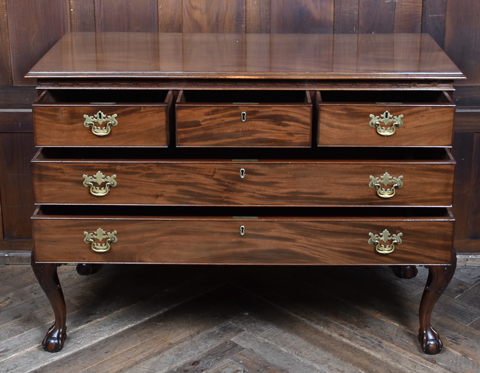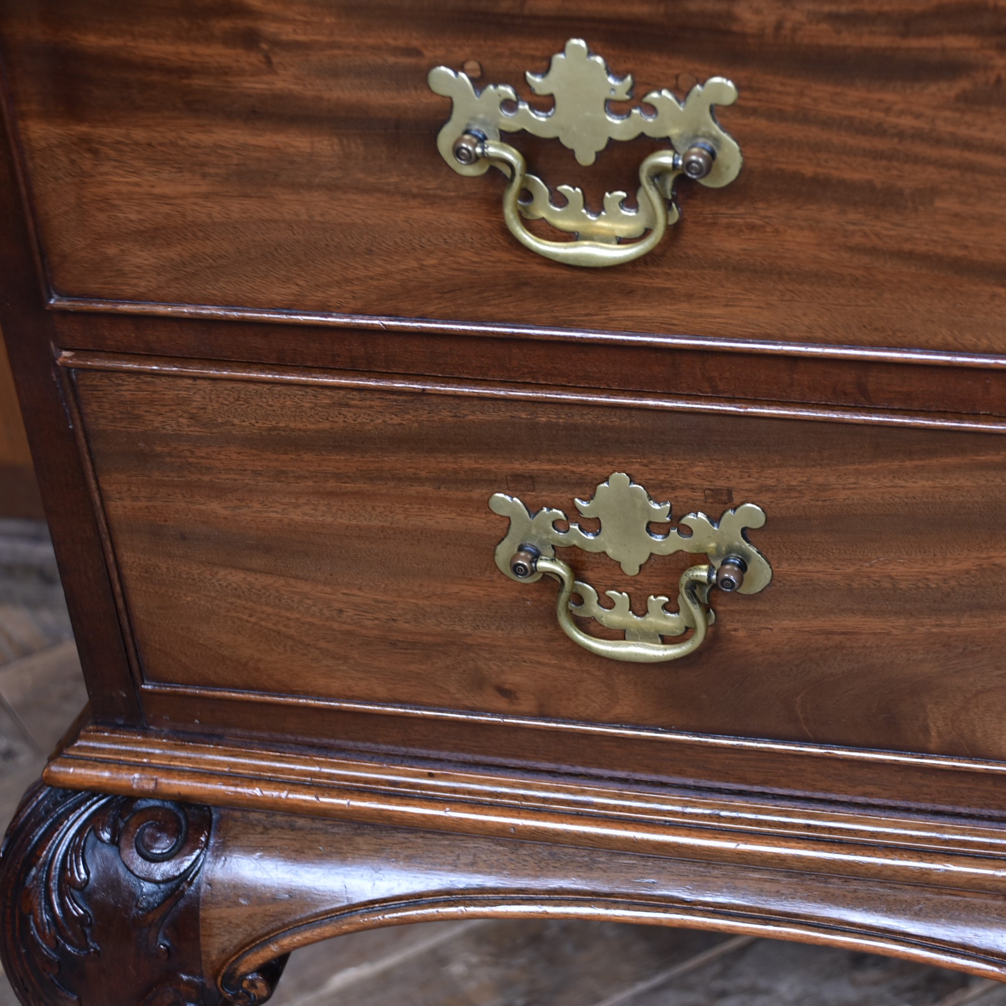 A beautifully proportioned lowboy of rich, mellow mahogany, attributed to the esteemed Glasgow firm Muirhead Moffat & Co—renowned for their discerning eye and quality craftsmanship. The rectangular top sits above an arrangement of five drawers: three smaller above two full length , each retaining its original brass handles with elegant foliate backplates. The gently scalloped apron units four cabriole legs with acanthus-carved knees and terminating in bold claw-and-ball feet. Like all antiques, this piece bears the gentle marks of age and use, which only add to its character. The mahogany is well-figured, with a warm patina and excellent colour throughout. Stamped to the rear with the maker’s name, this lowboy exemplifies the firm’s reputation for refined, historically sympathetic furniture, and would sit comfortably in both traditional and eclectic interiors.