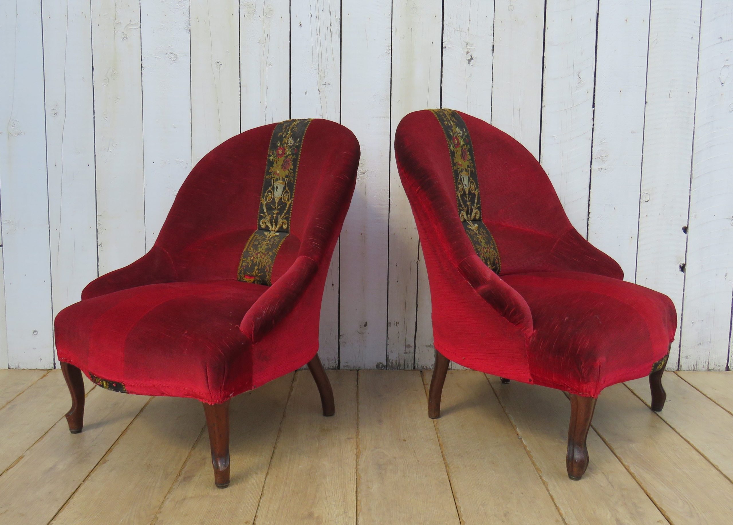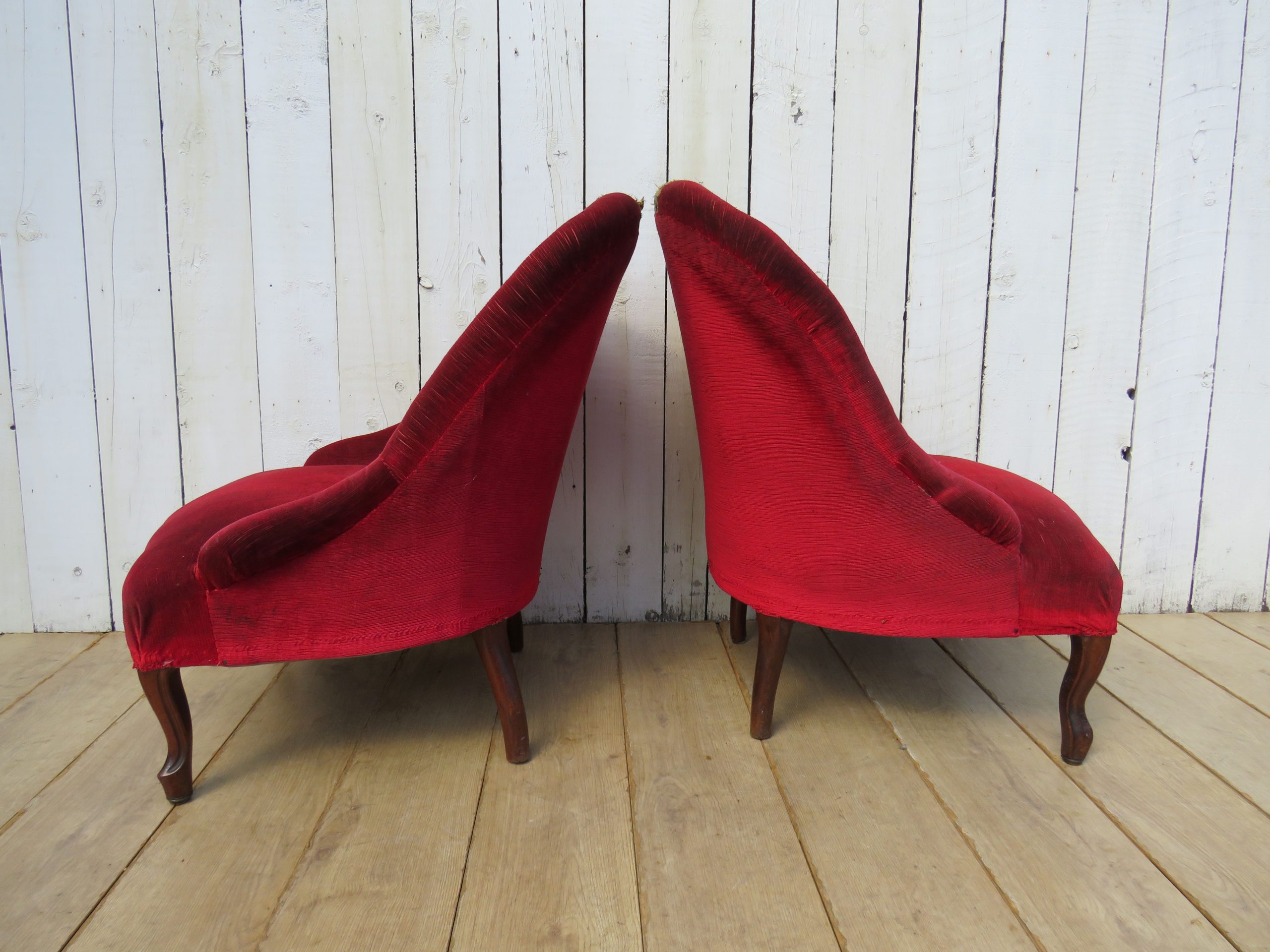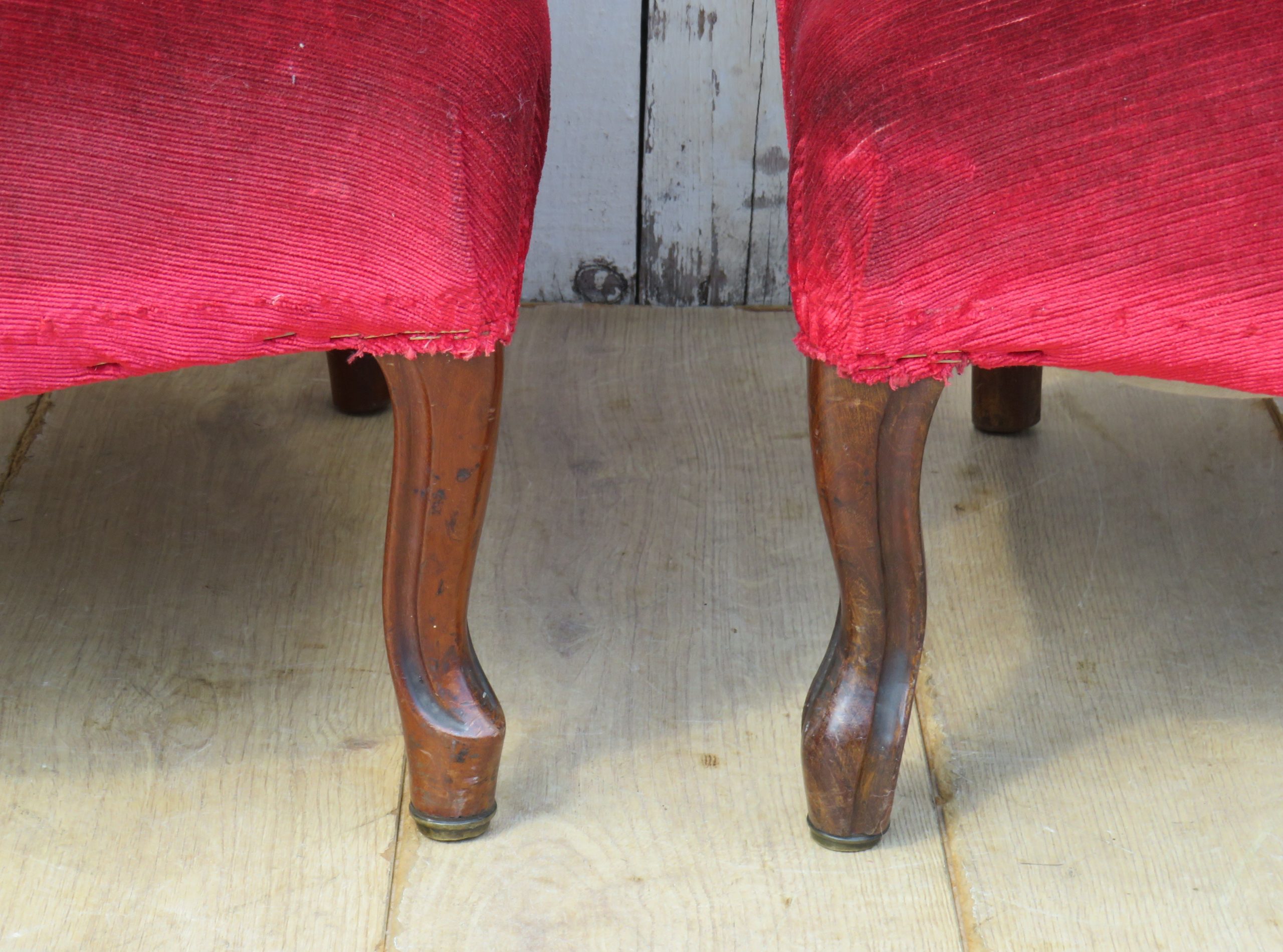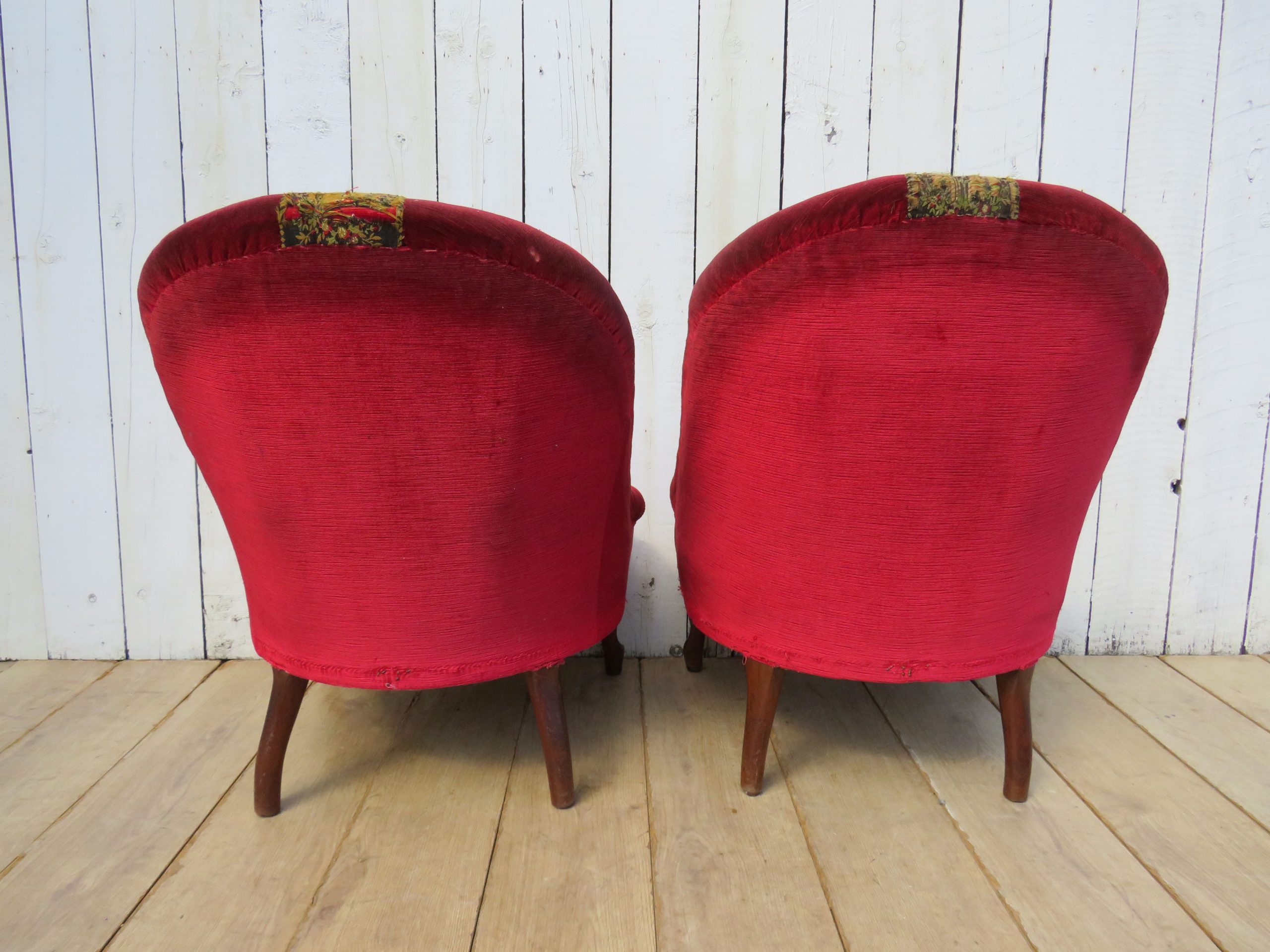 Near pair of shapely 19th century French serpentine fronted Napoleon III nursing, boudoir, tub armchairs on oak legs for re-upholstery. Height 76cm, width 61cm, depth 70cm, seat height 36cm, seat depth 46cm.