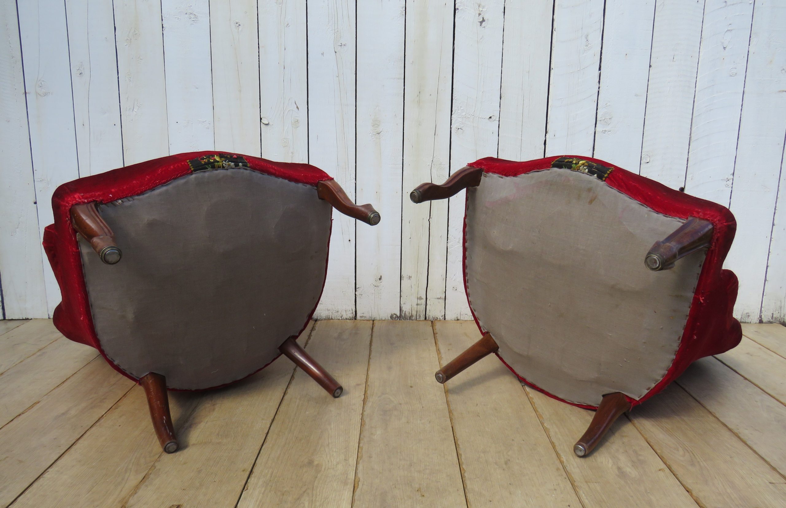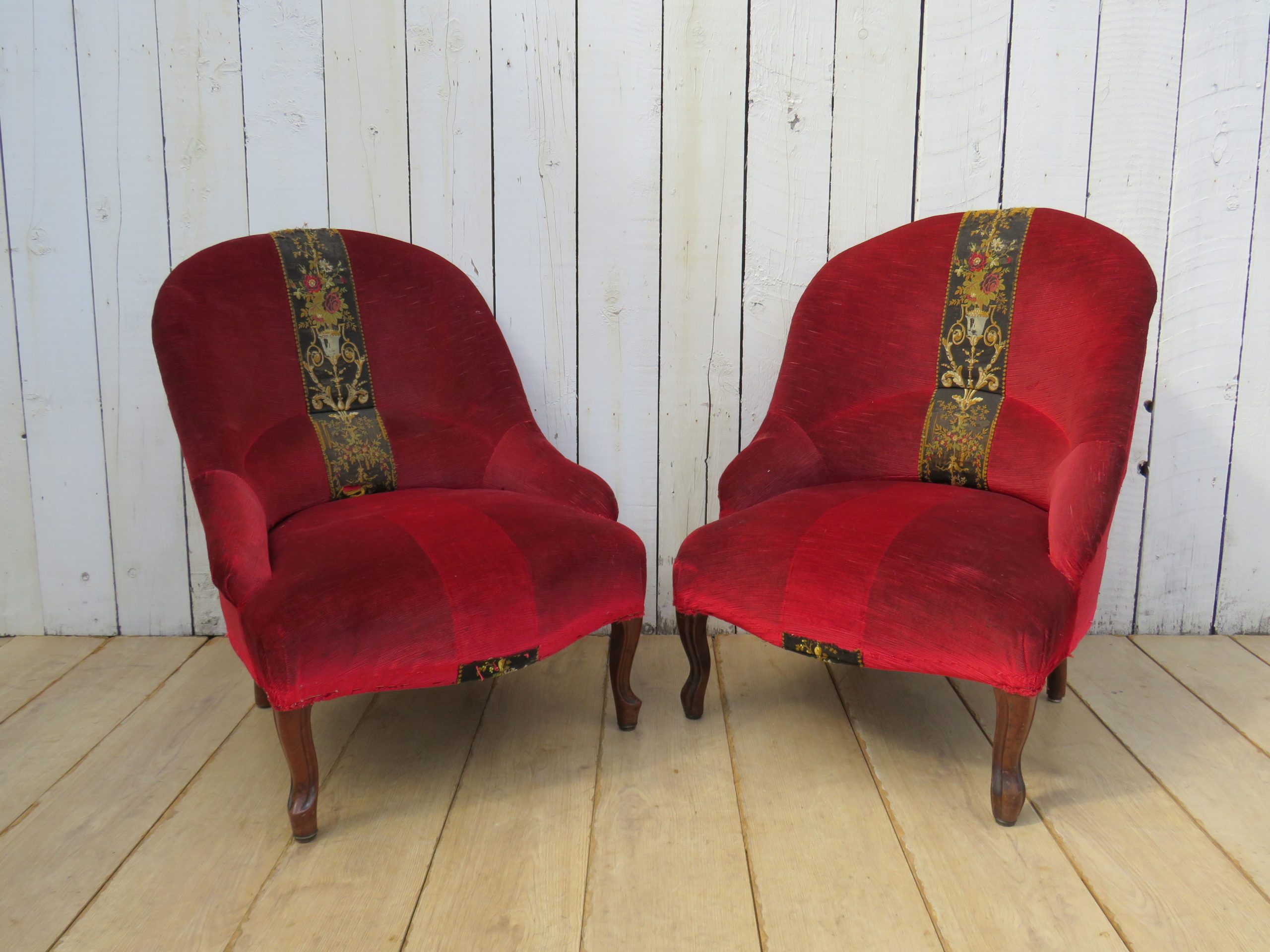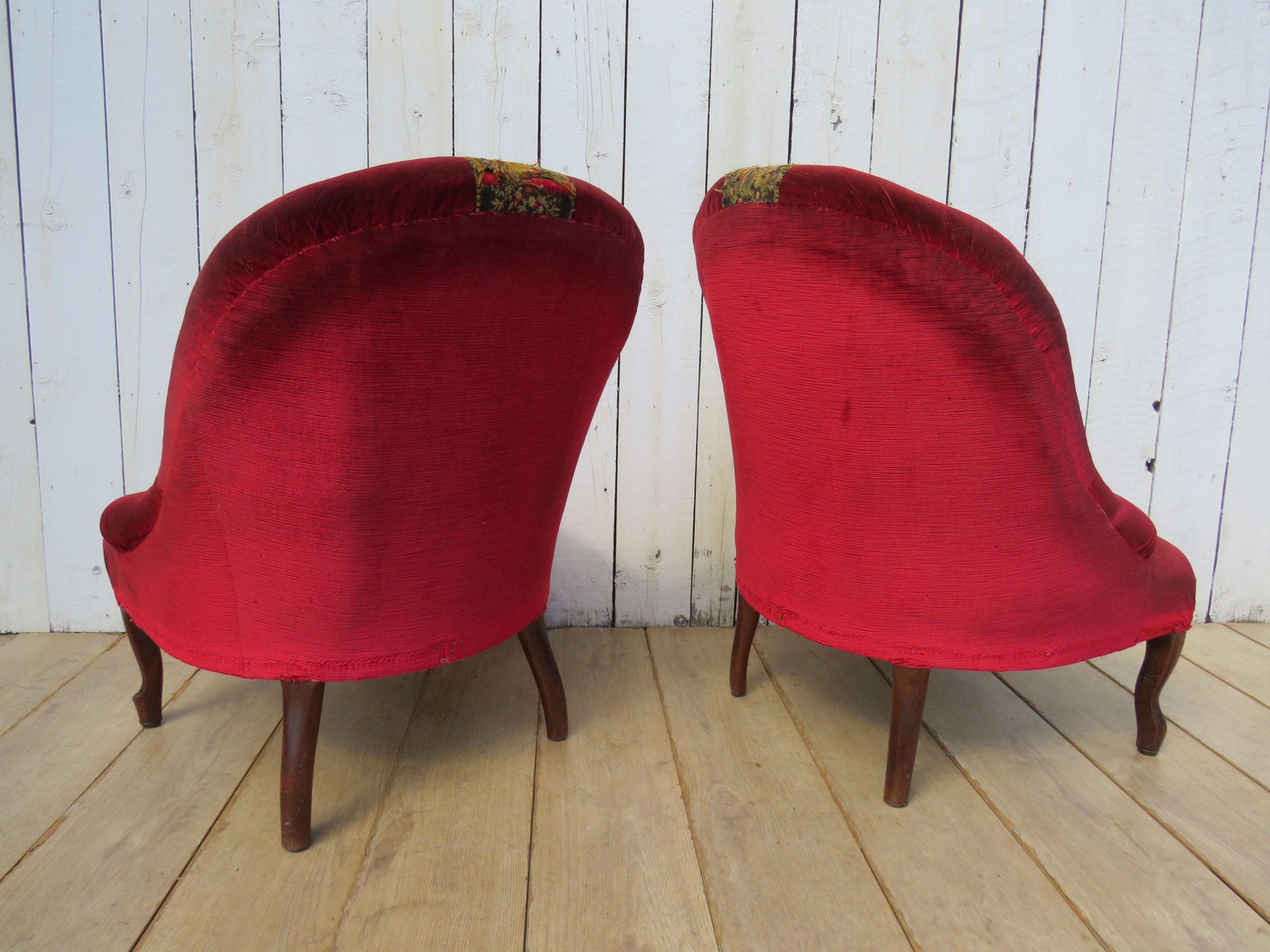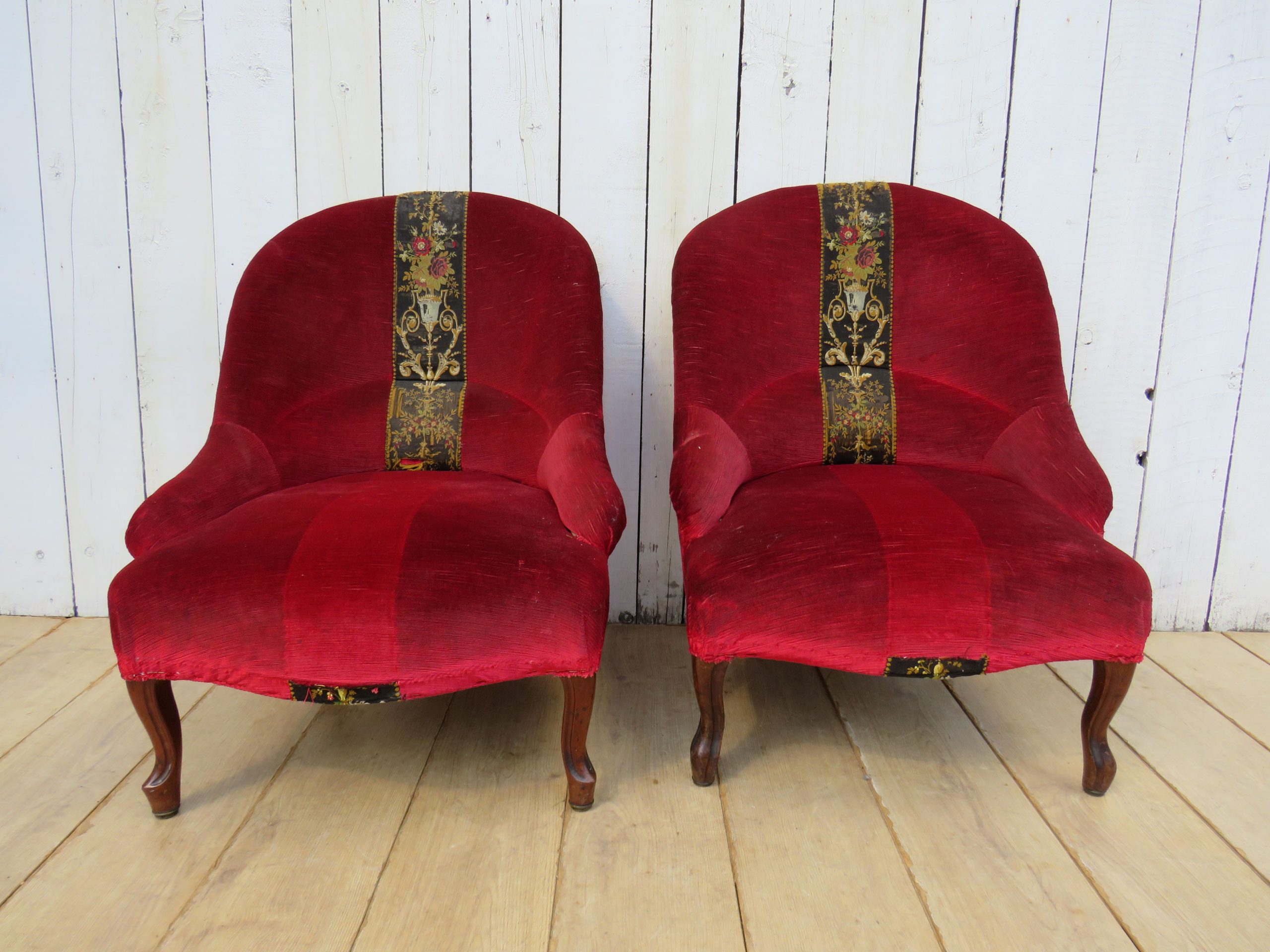 Near pair of shapely 19th century French serpentine fronted Napoleon III nursing, boudoir, tub armchairs on oak legs for re-upholstery. Height 76cm, width 61cm, depth 70cm, seat height 36cm, seat depth 46cm.