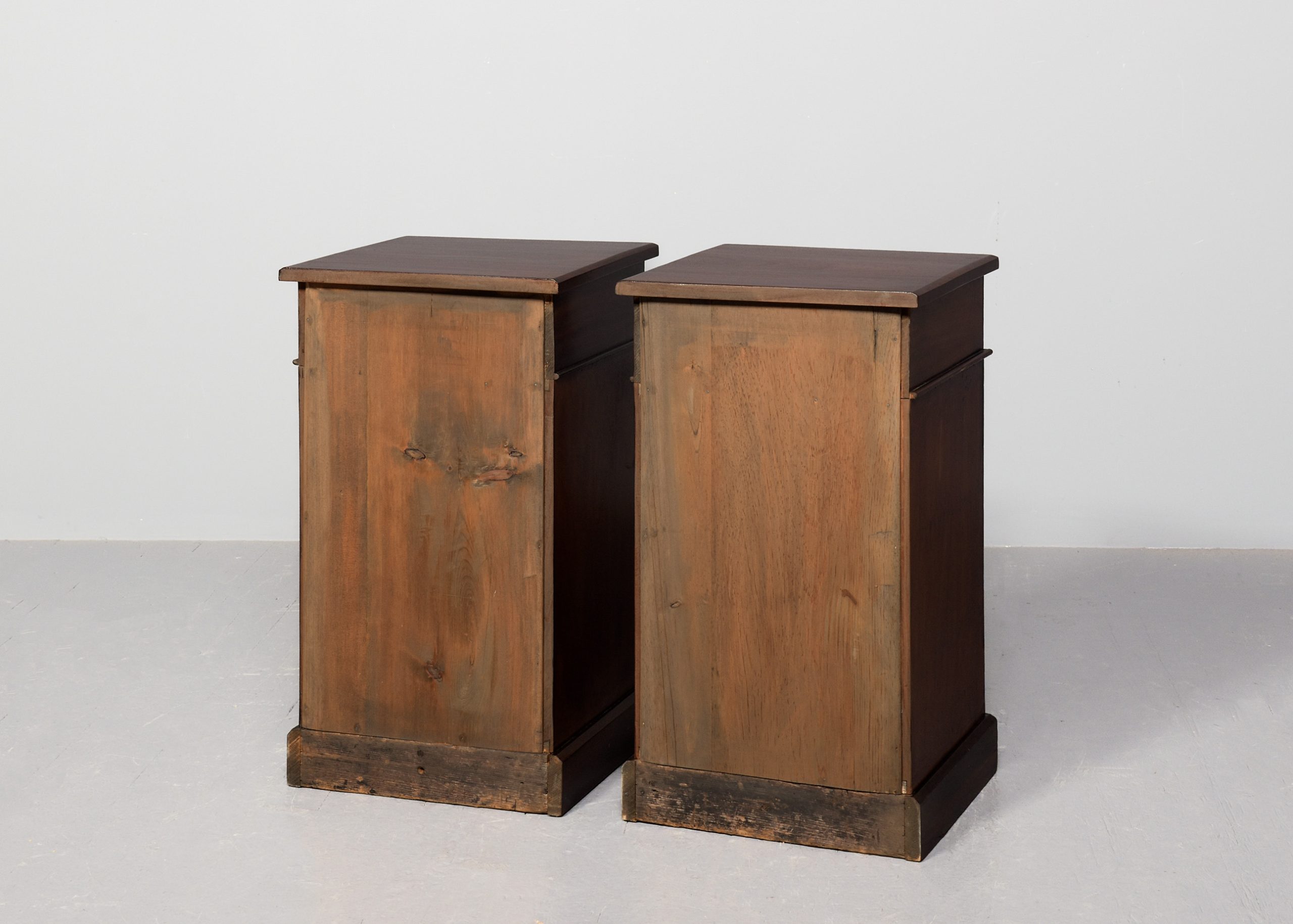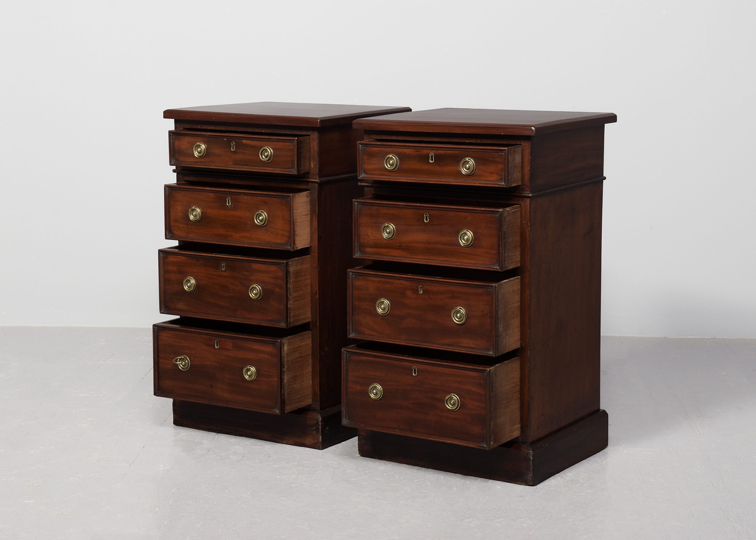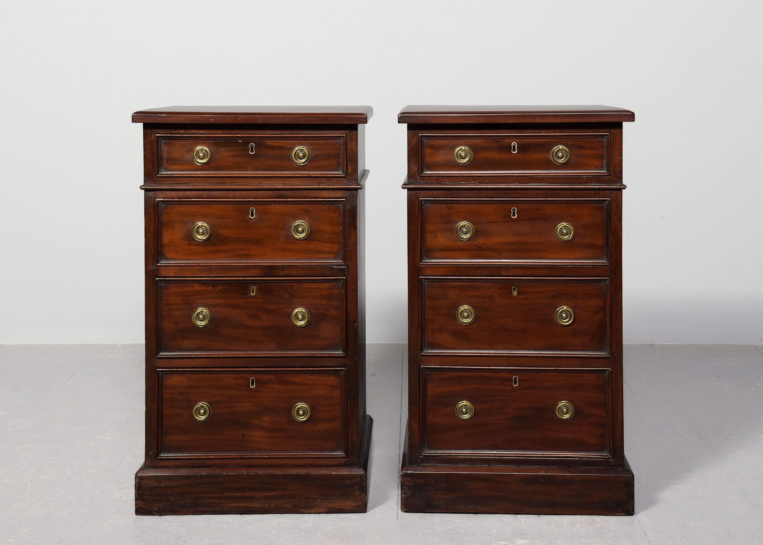 Circa 1840 with adaptations. Neat-sized pair of Victorian chests of drawers/bedside lockers. The rectangular tops in figured mahogany with canted fore-edges above four moulded-front, graduated drawers with circular brass handles and brass locks. All supported on enclosed plinth bases.