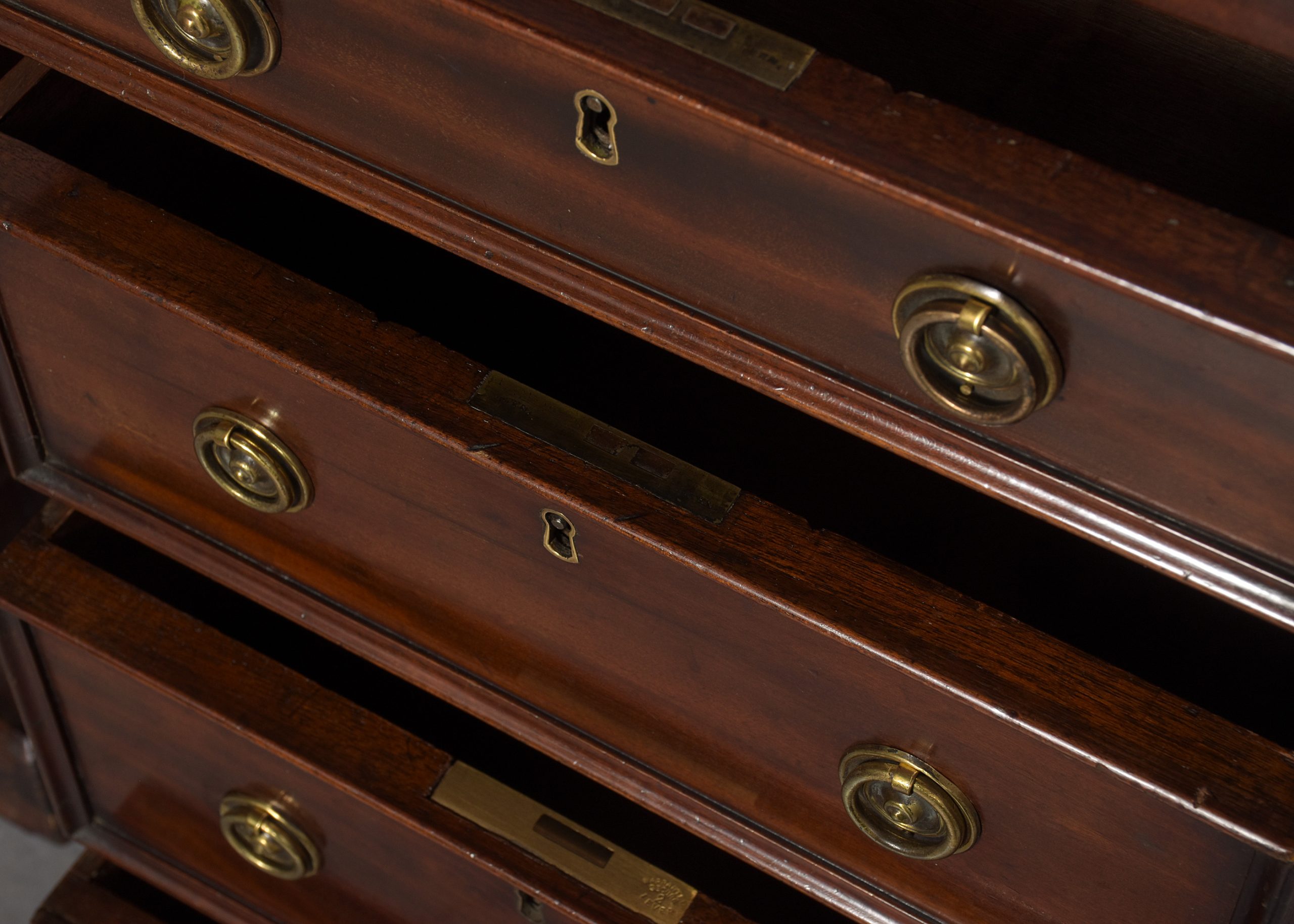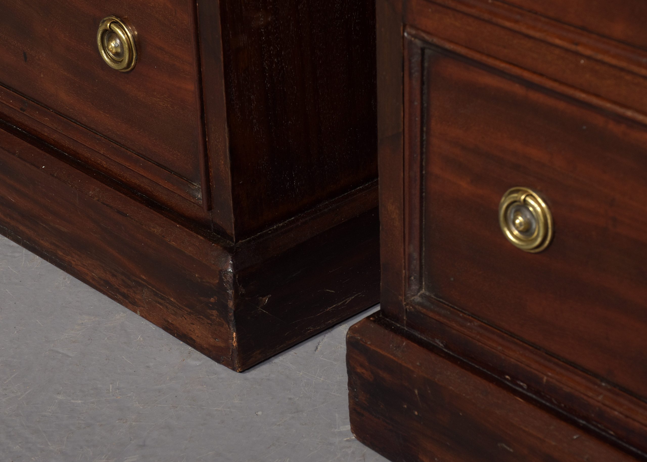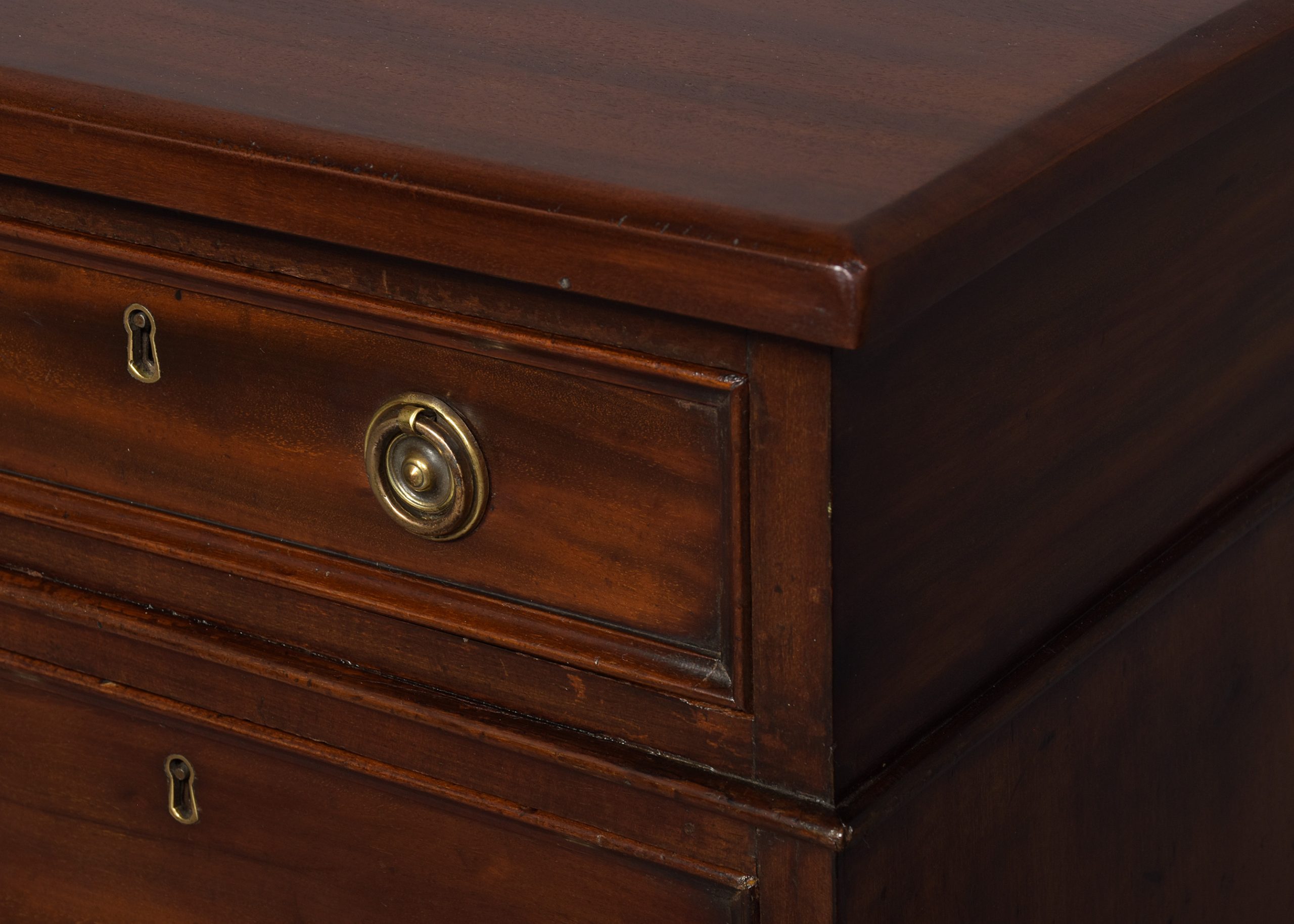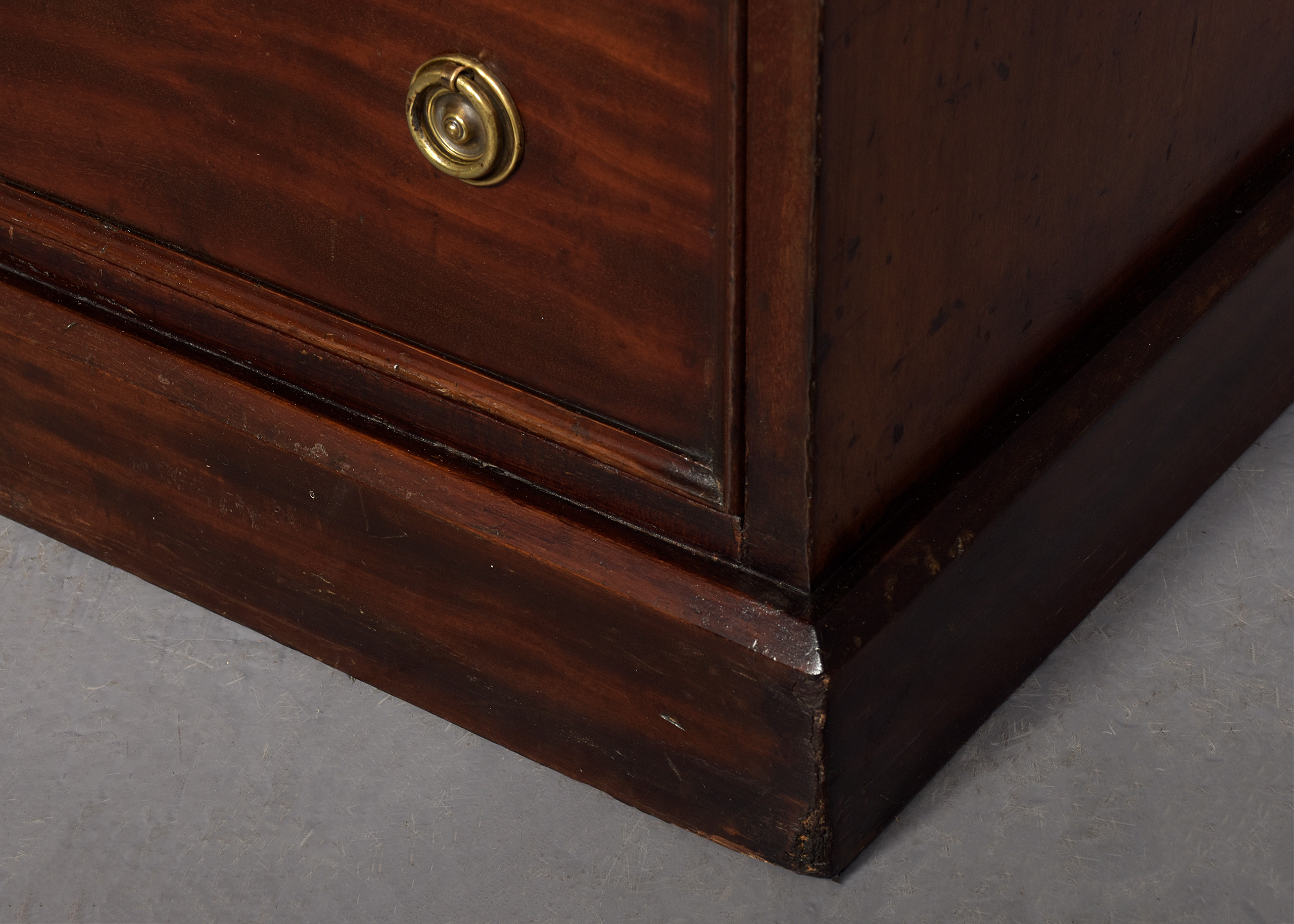 Circa 1840 with adaptations. Neat-sized pair of Victorian chests of drawers/bedside lockers. The rectangular tops in figured mahogany with canted fore-edges above four moulded-front, graduated drawers with circular brass handles and brass locks. All supported on enclosed plinth bases.