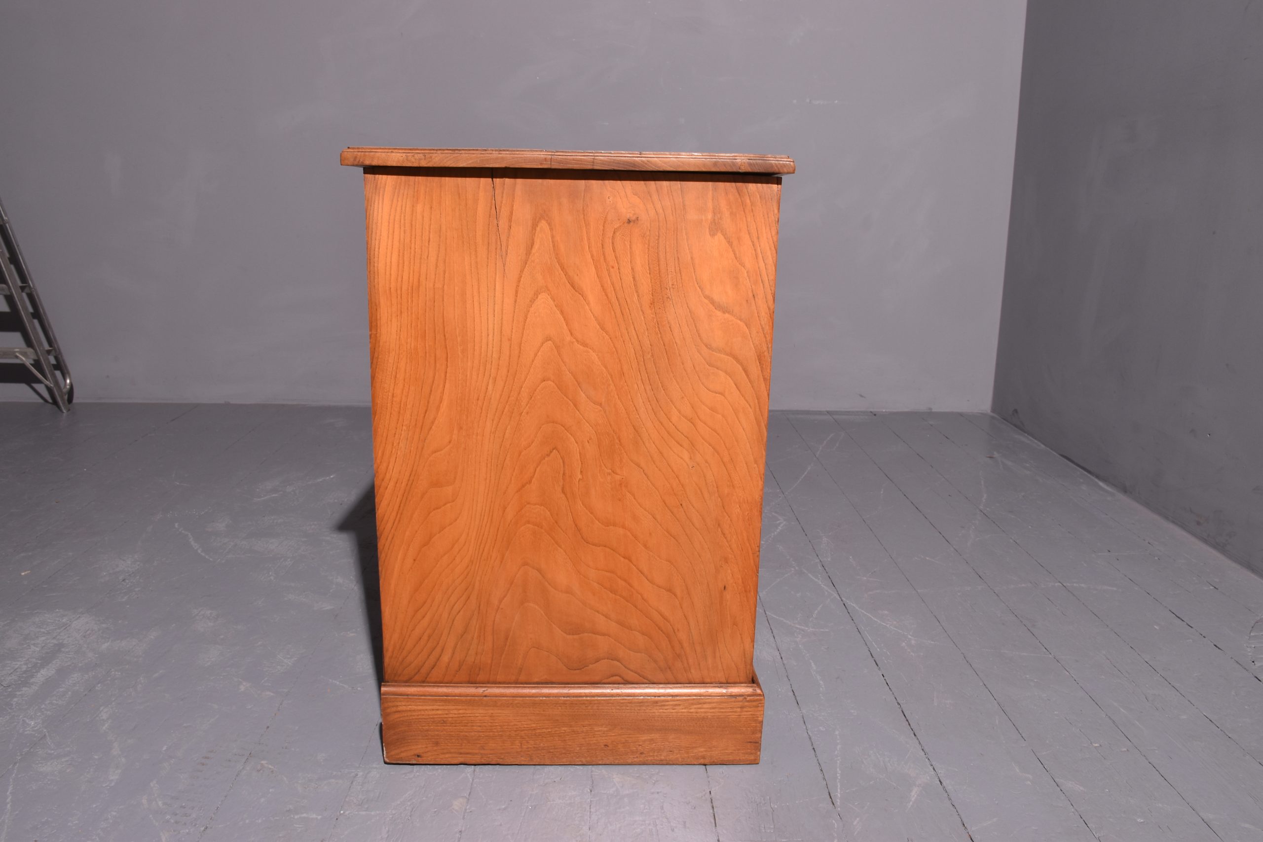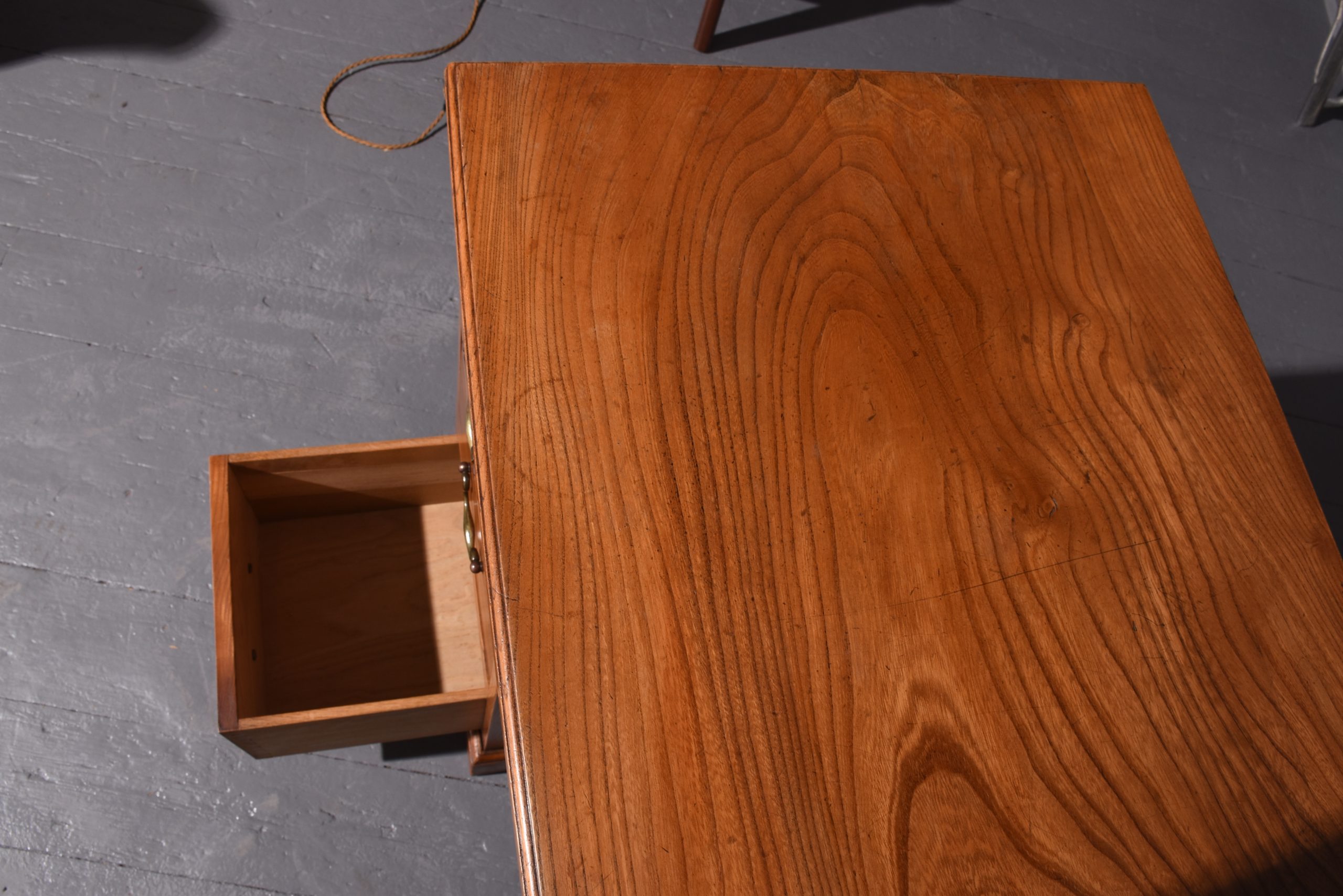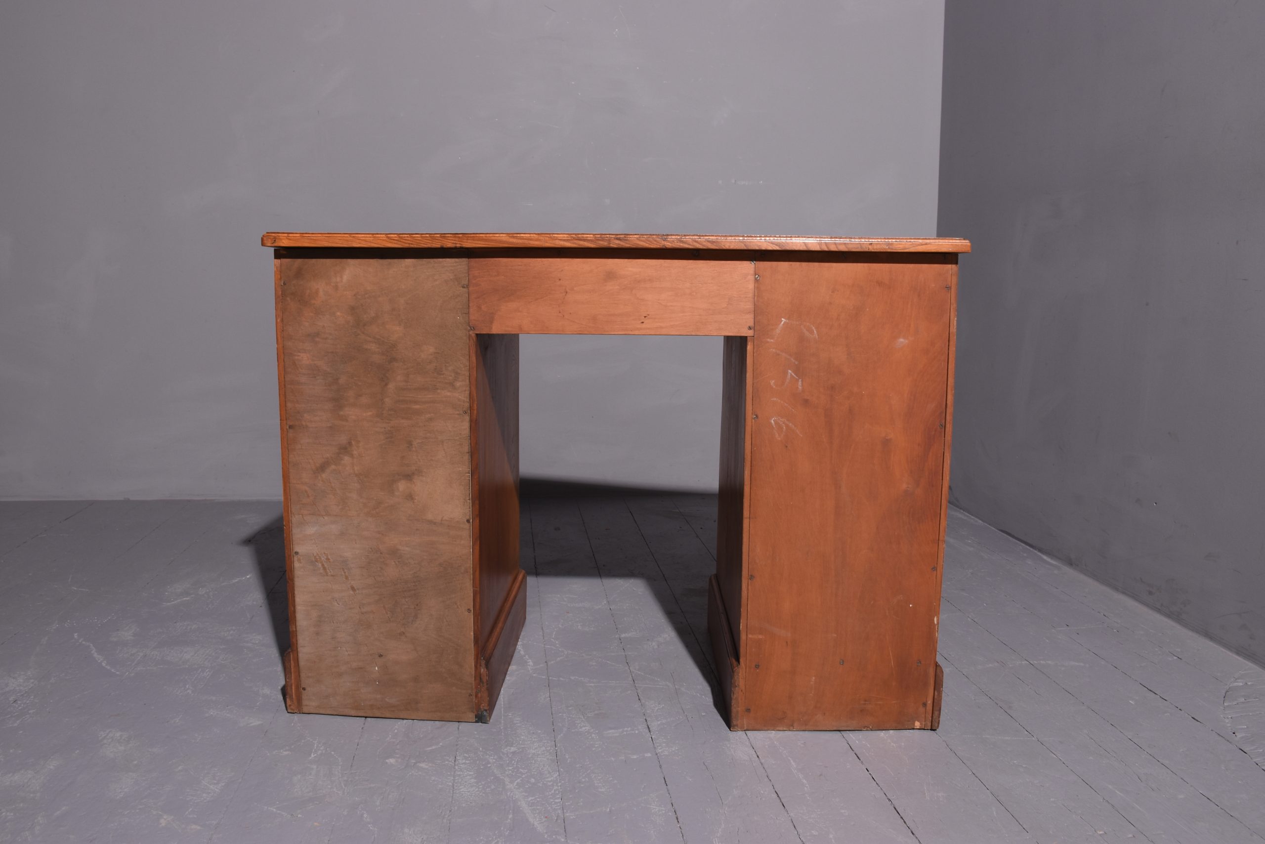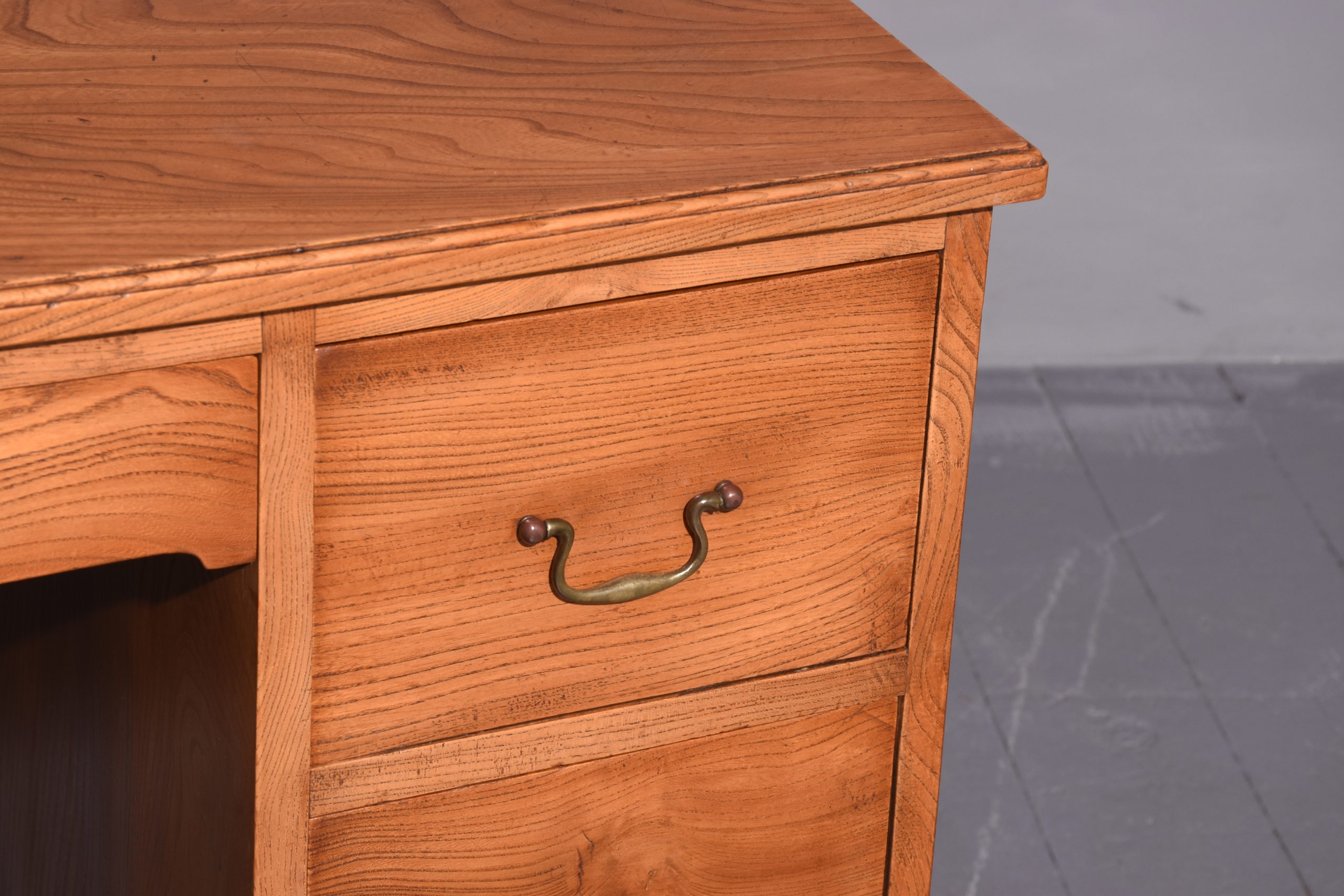 Circa 1930 Neat-sized Quality Figured Oak Desk. The rectangular polished top in figured oak above a kneehole with a shaped front drawer. Flanked by banks of three drawers with brass swan-neck handles. All supported on moulded bases with shaped bracket feet. In excellent condition.