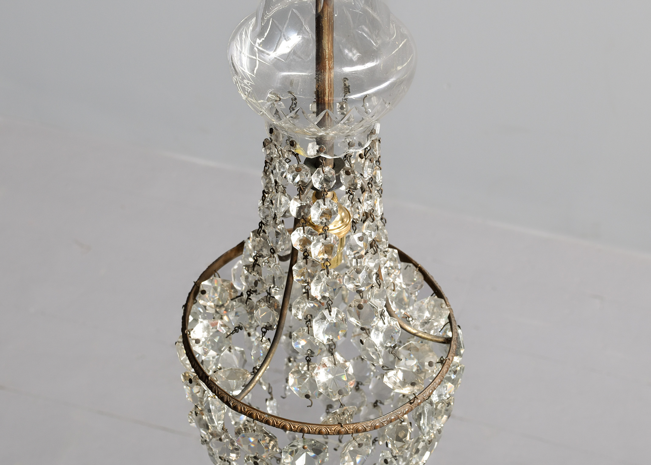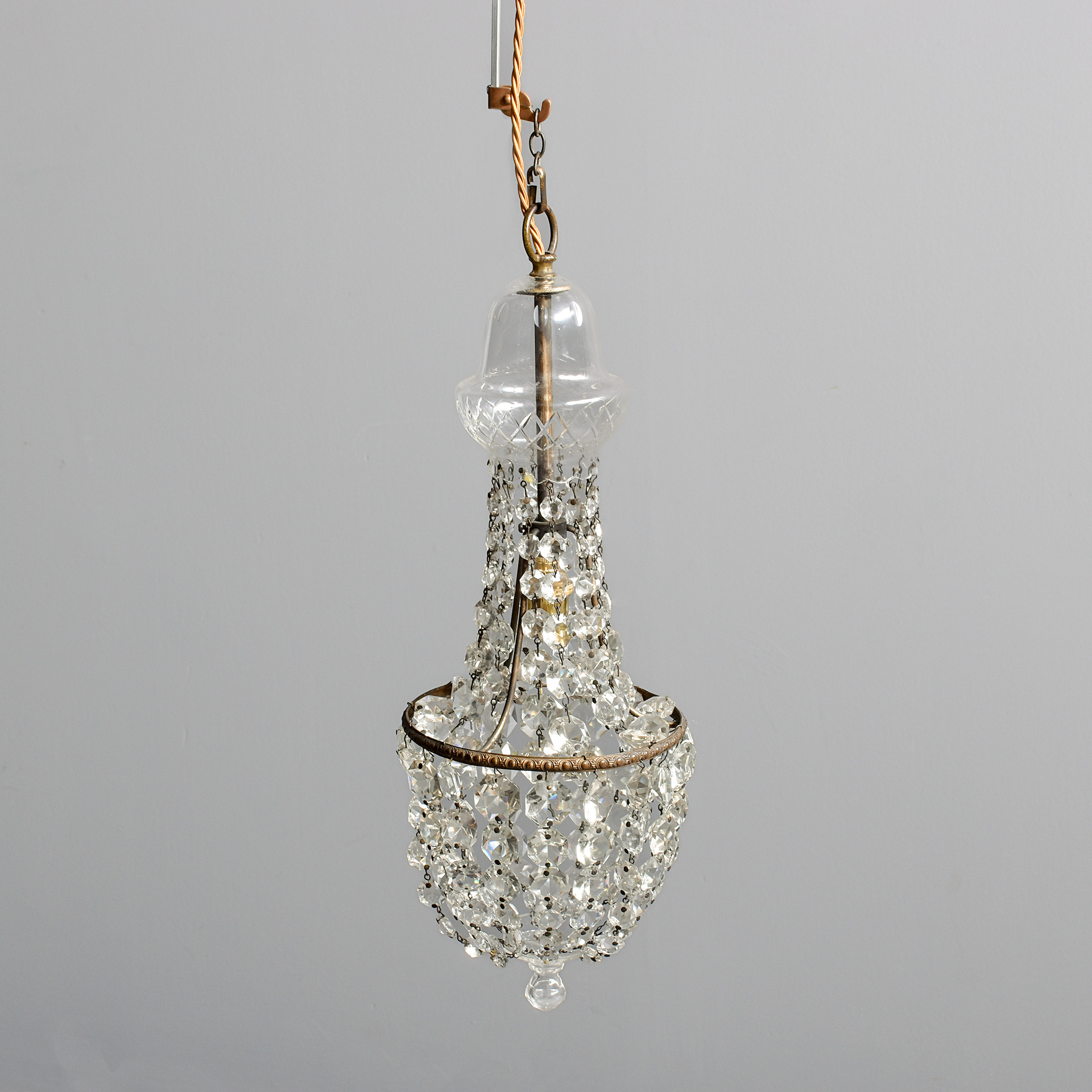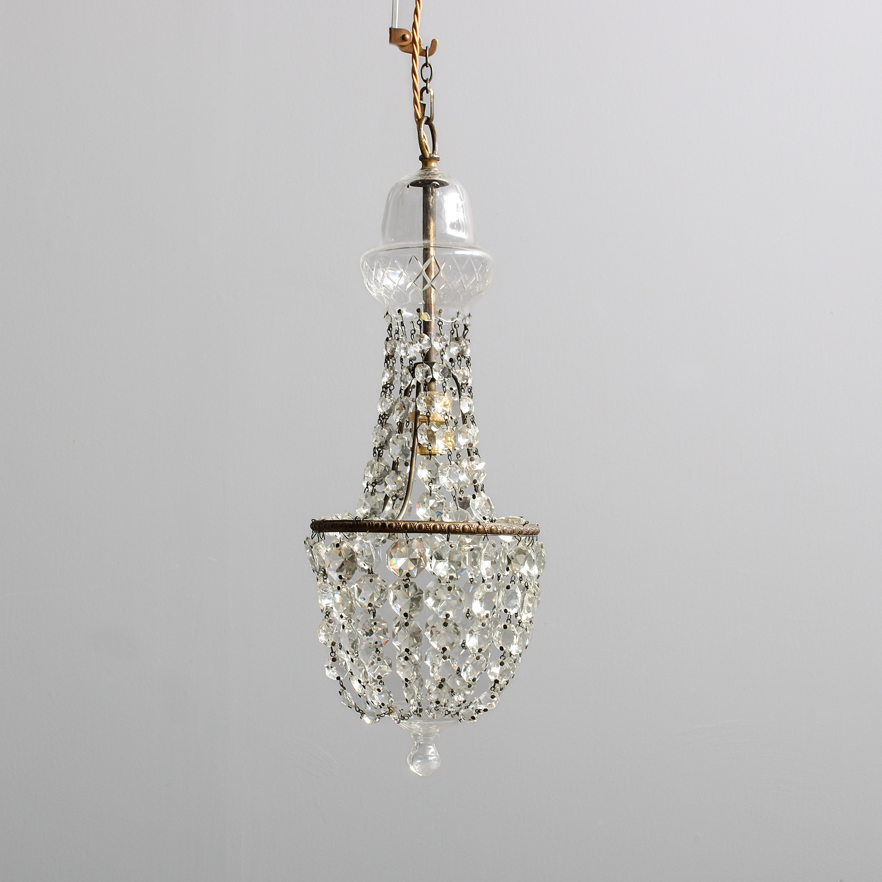 Circa 1920s. A diminutive glass and crystal French-style tent and waterfall single light chandelier, with a glass cap with etching on the facing, supporting strands of tapering faceted crystal, with a simple engraved bezel with tapering faceted crystals, finishing with a downward-facing glass finial. Recently rewired and PAT tested.