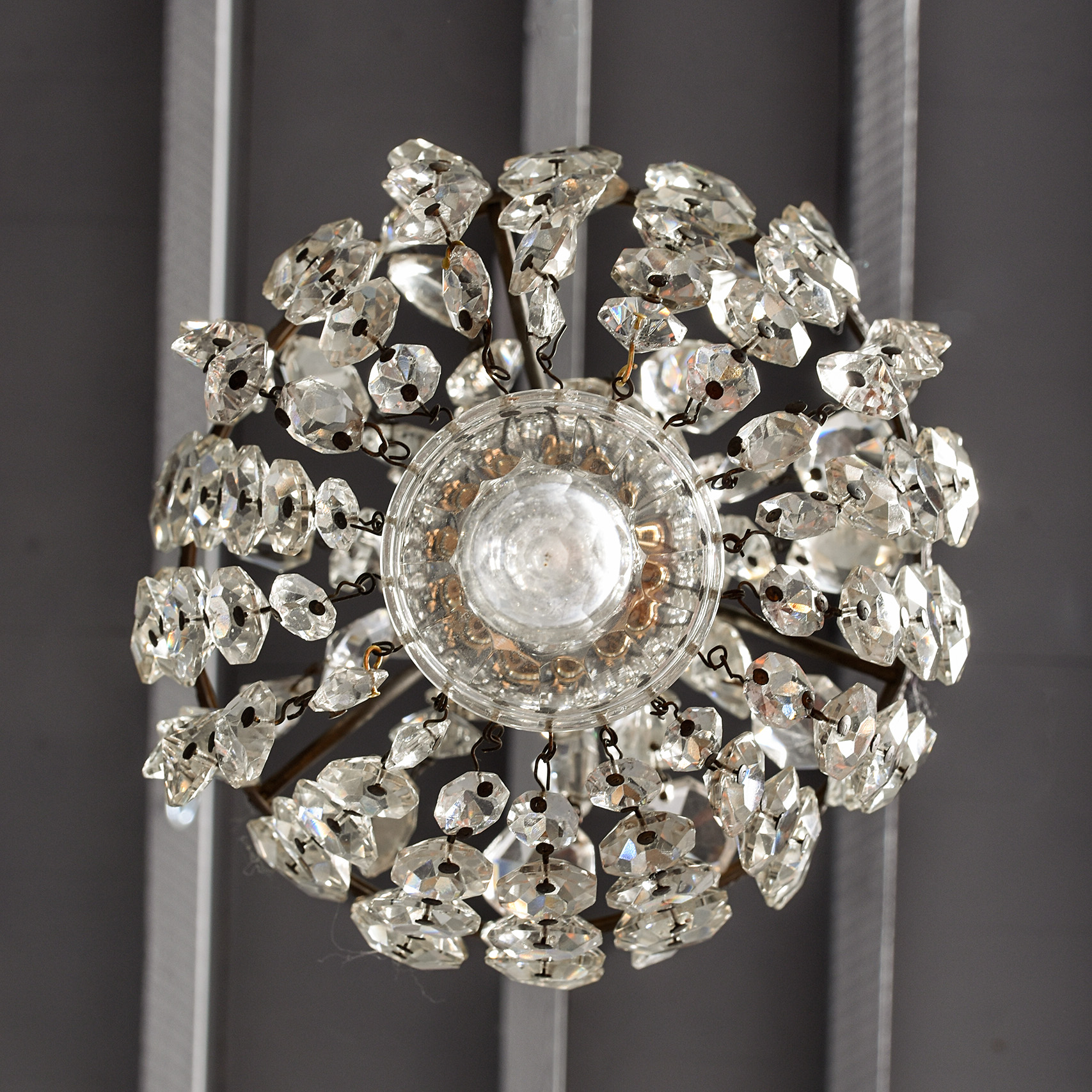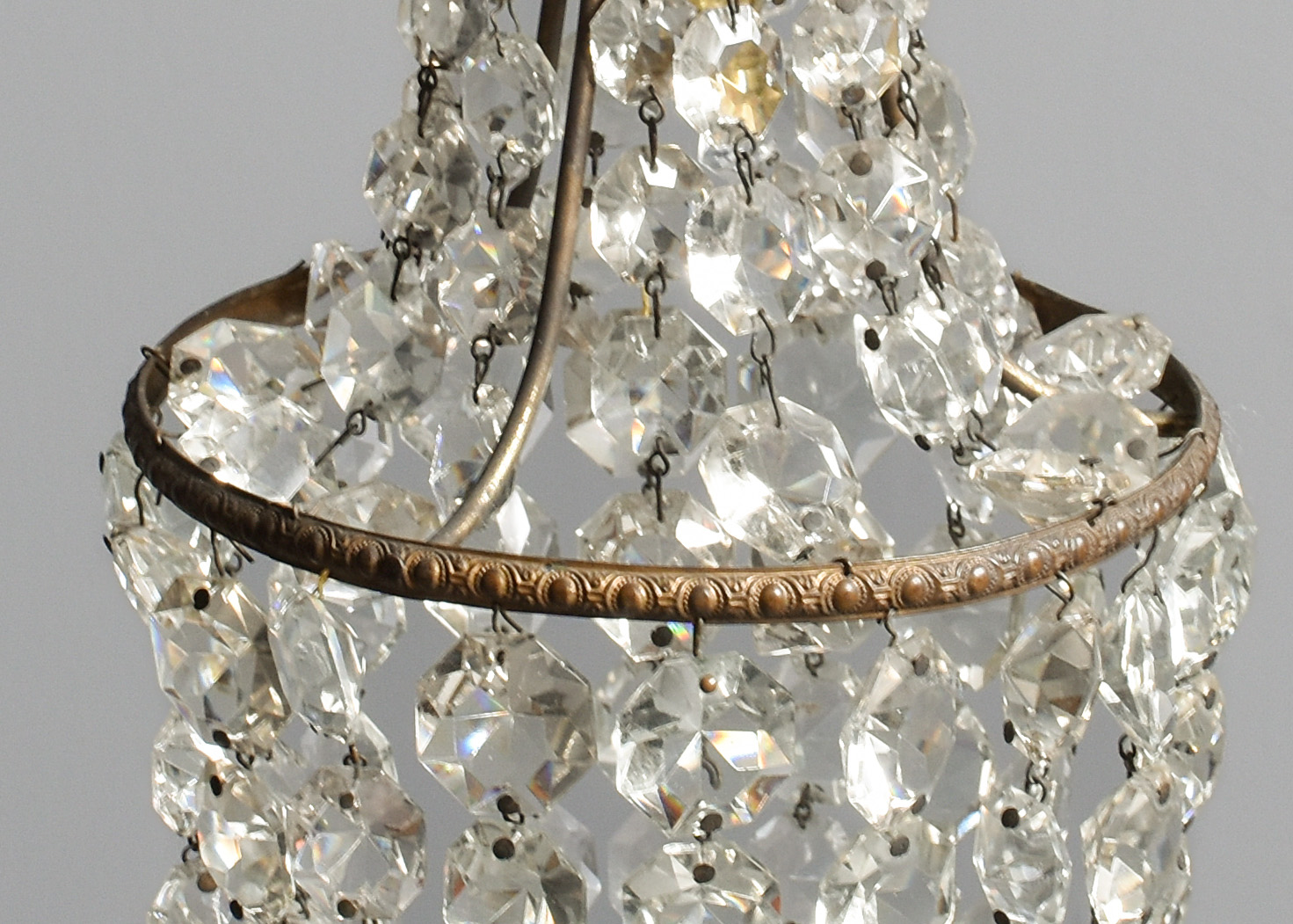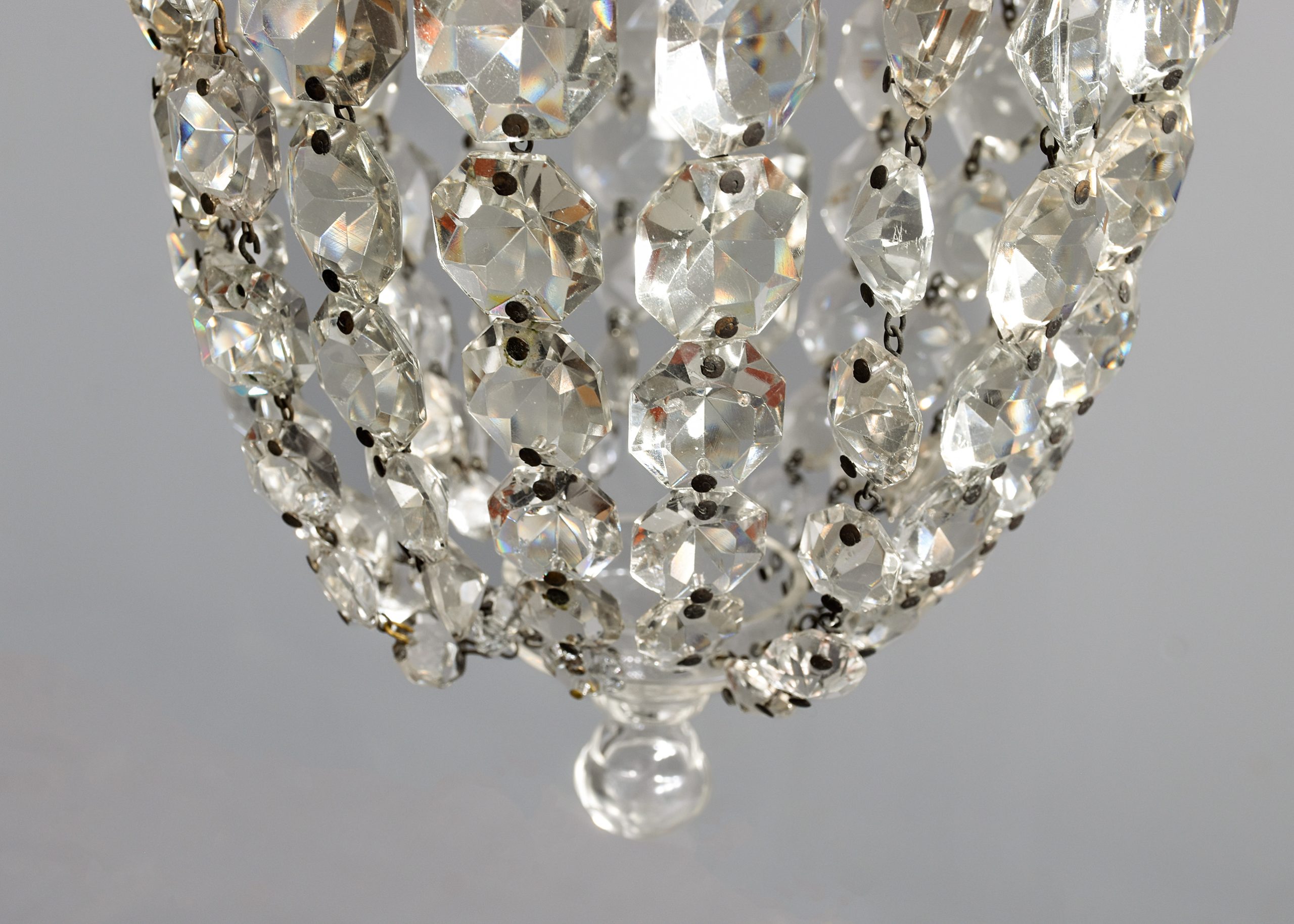 Circa 1920s. A diminutive glass and crystal French-style tent and waterfall single light chandelier, with a glass cap with etching on the facing, supporting strands of tapering faceted crystal, with a simple engraved bezel with tapering faceted crystals, finishing with a downward-facing glass finial. Recently rewired and PAT tested.