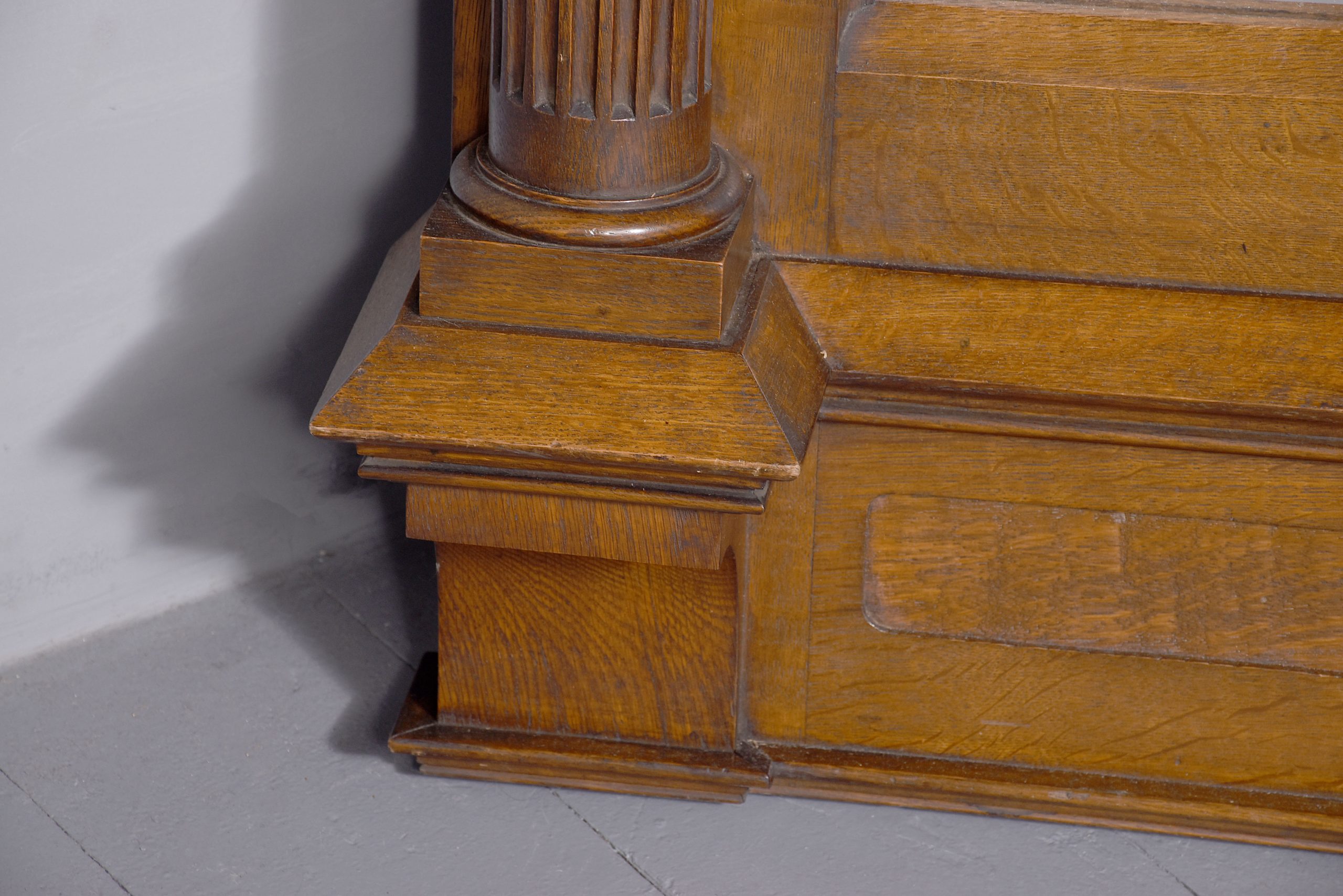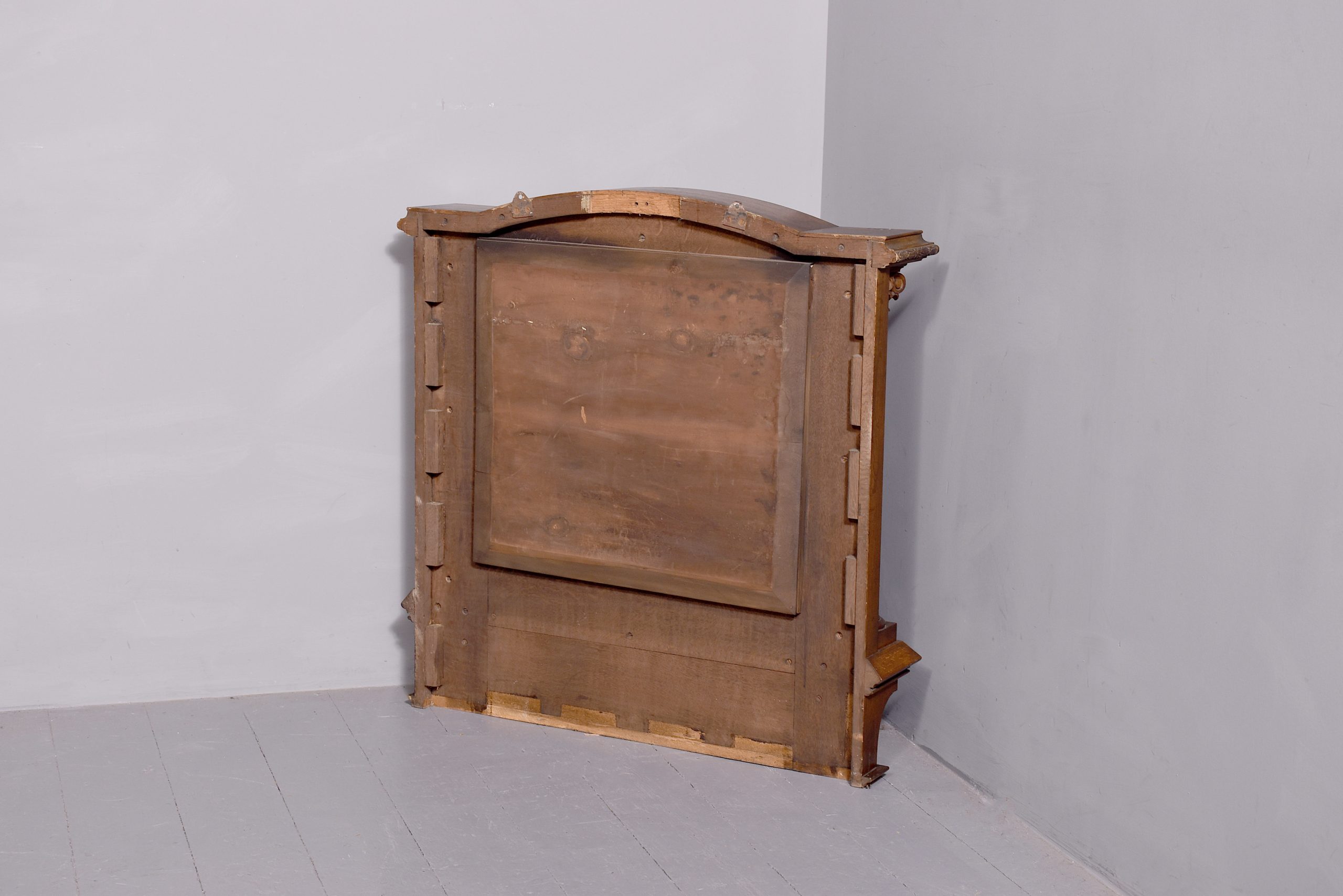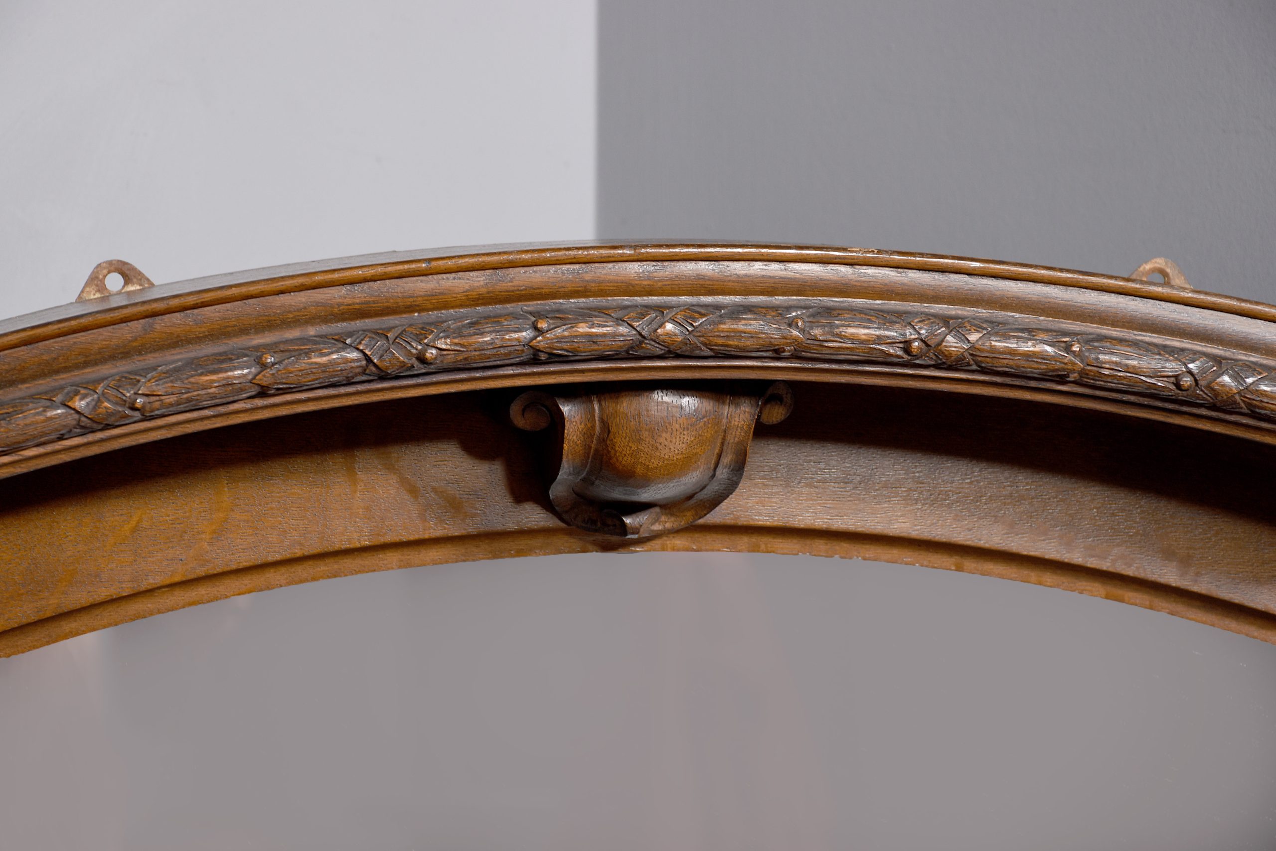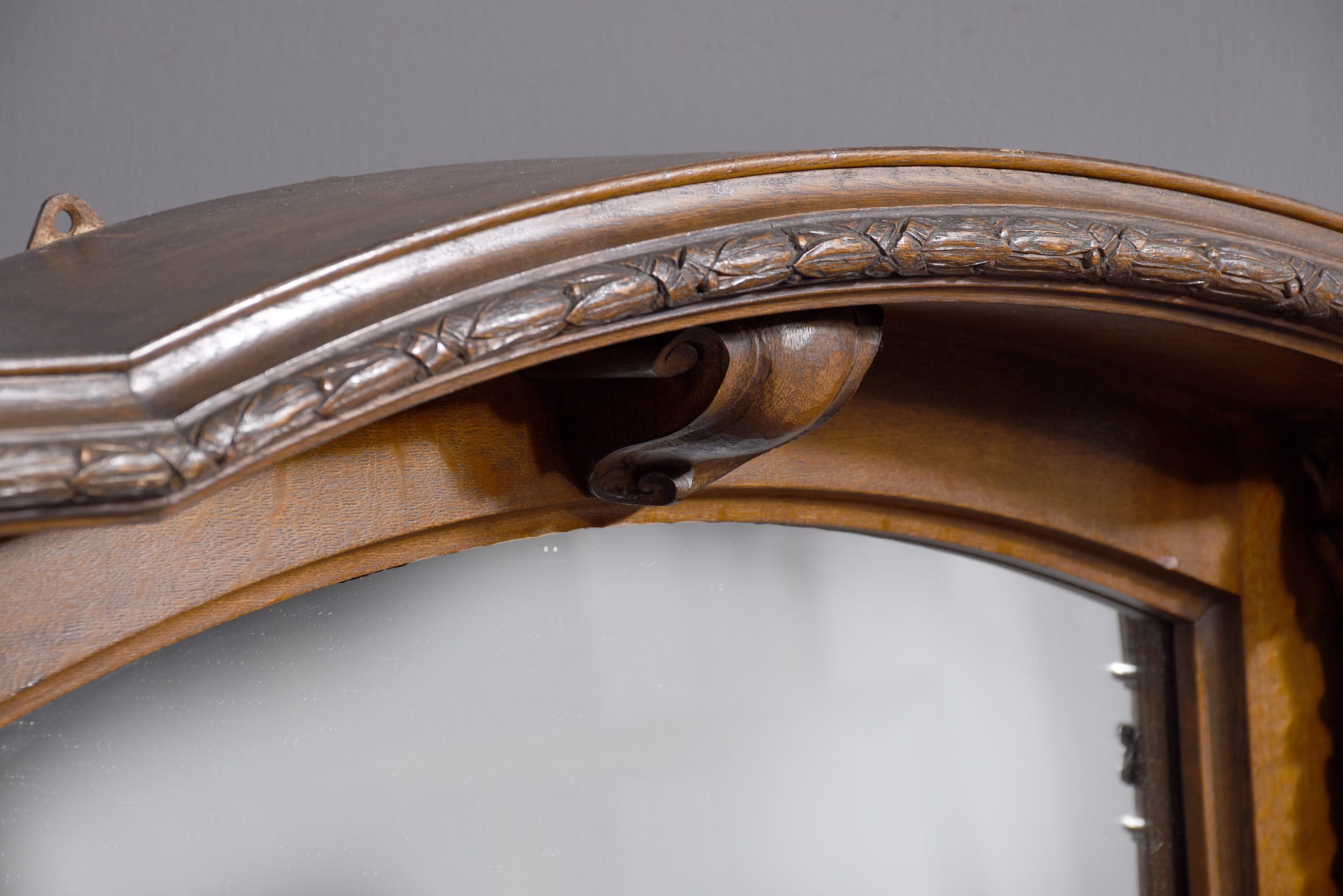 Circa 1880. An unusual, stylish oak-framed mirror, with a domed top with a flat section at each end, stylish moulding with foliate carving to the fore-edge, supported by a carved corbel in the centre. The domed top of the mirror in an oak slip, flanked by a pair of Corinthian columns with carved capitols, flower-heads and fluted stems, resting on platform bases with sloping moulding. Beneath, there are two flat sections and a simple beading.