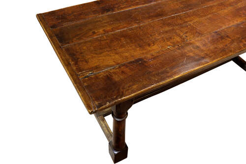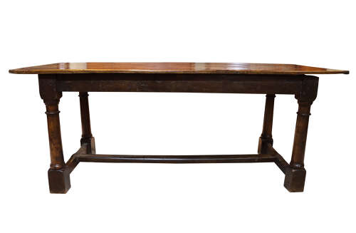 The table stands on four strong turned legs, each square-blocked at the foot, and united by sturdy H-form stretchers for stability. The timber has a deep, warm tone with the rich surface wear expected from over 300 years of use.