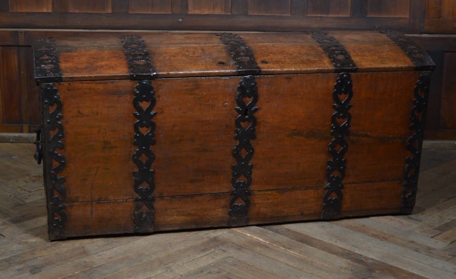 Superb oak storage/ blanket box cover in fabulous iron work with original iron carry handles in wonderful untouched condition. It’s wonderful three plank top with iron hinges opens to reveal a spacious clean interior with original candle box. There are historic knocks, marks, cracks and scratches as is to be expected with an item of its age, however these only add to the character and charm of this very functional antique coffer. Perfect at the end of your bed for storing extra blanket , pillows etc however with it’s gorgeous warm colour and incredible graining why not show it off in the main room.