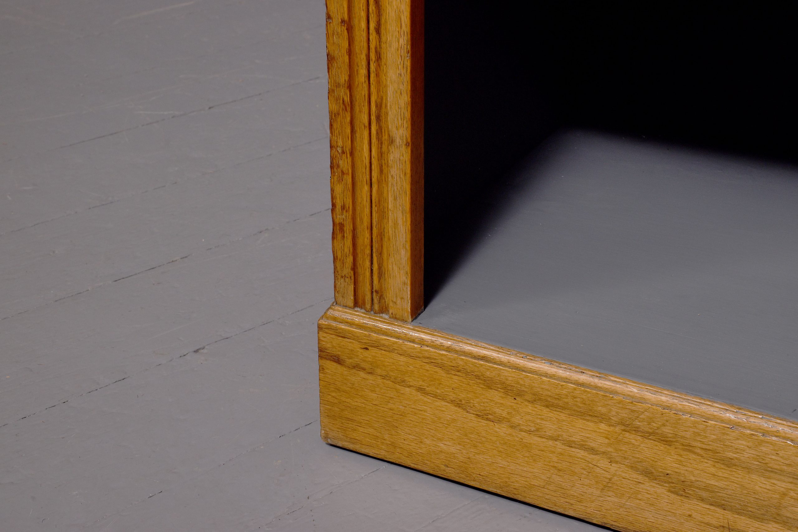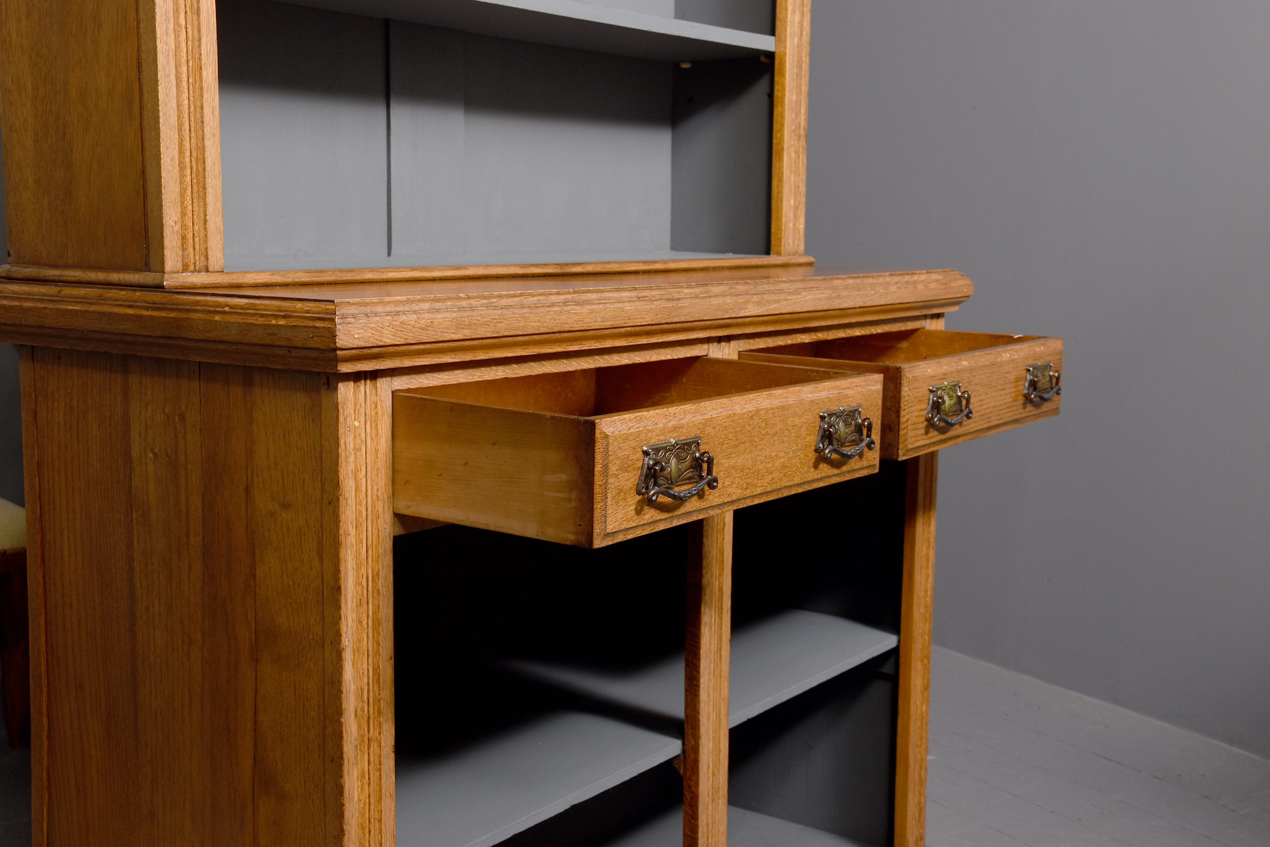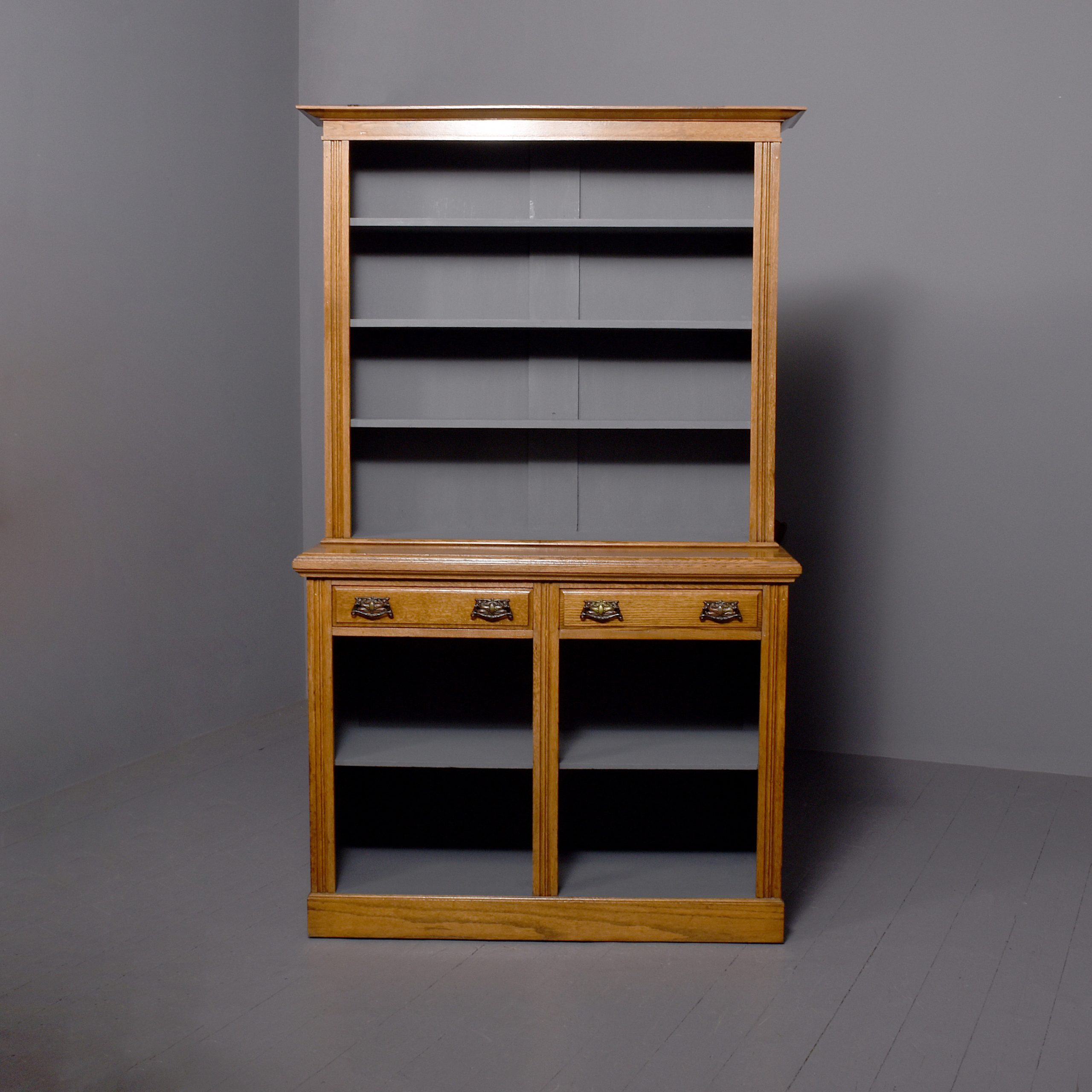 Circa 1890. A mid Victorian oak two-part bookcase (with alterations), the top with a moulded cornice and simple frieze, with three adjustable shelves with ribbed facings, the polished flat section with a moulded edge, beneath this a pair of drawers with classic Art Nouveau pressed handles, the bottom section with a single shelf with a ribbed section in the center and on the sides, the insides of the bookcase has been painted, all resting on an enclosed moulded plinth, the bookcase comes in two sections.