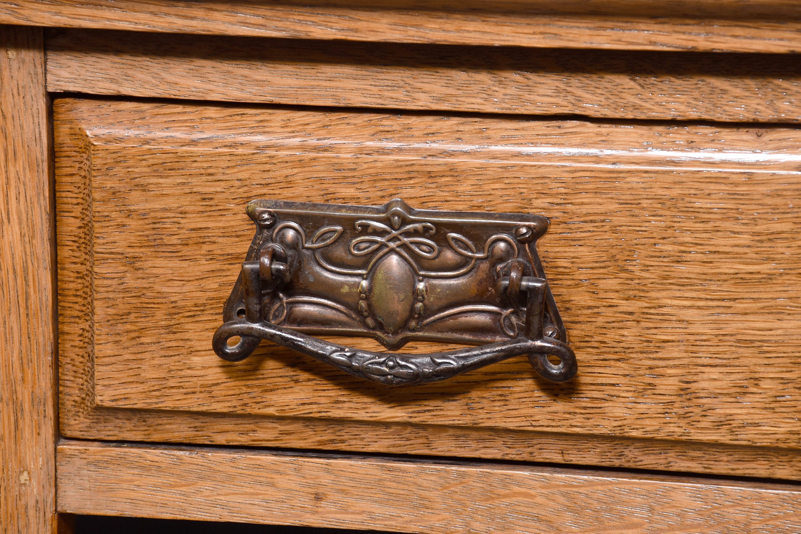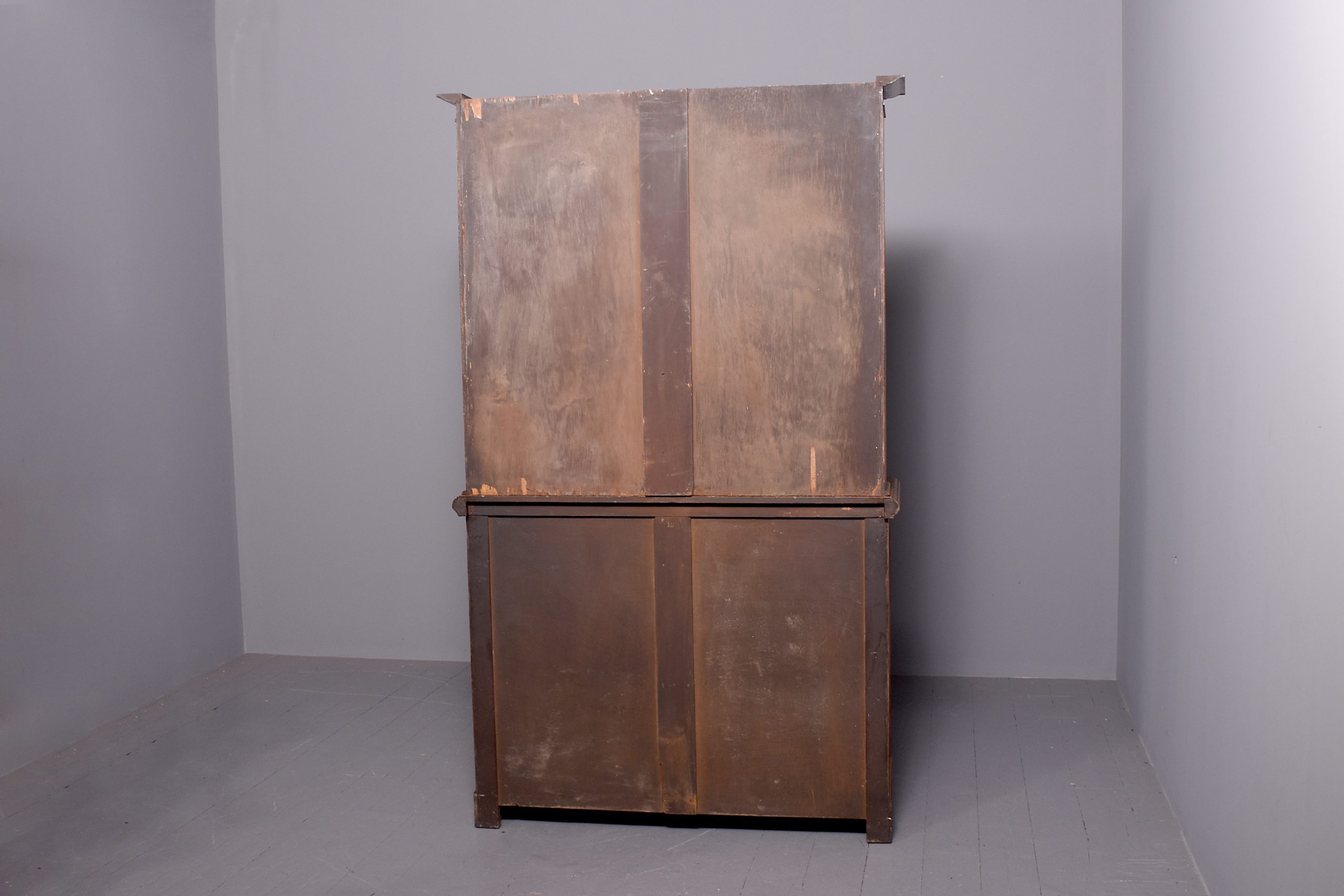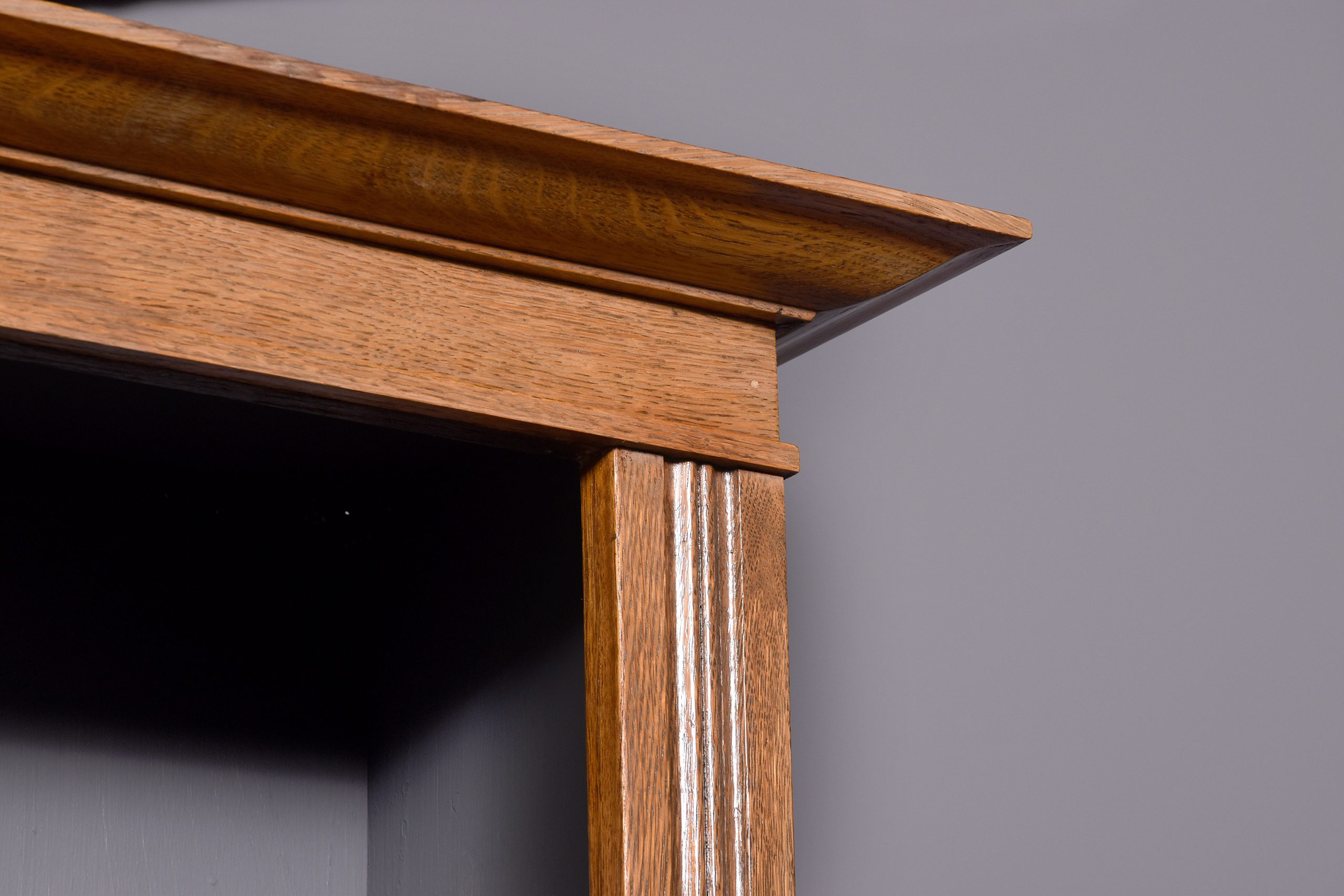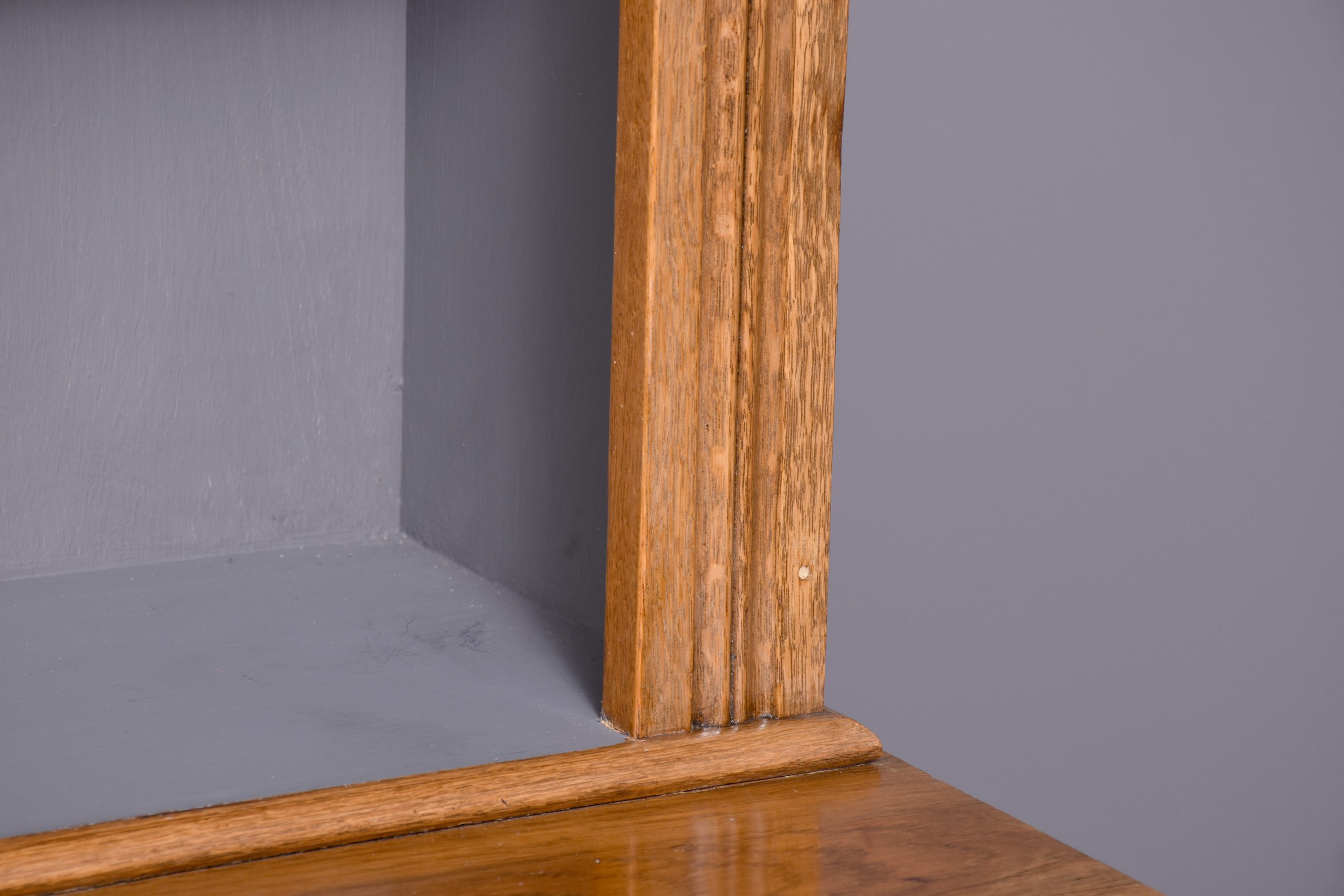 Circa 1890. A mid Victorian oak two-part bookcase (with alterations), the top with a moulded cornice and simple frieze, with three adjustable shelves with ribbed facings, the polished flat section with a moulded edge, beneath this a pair of drawers with classic Art Nouveau pressed handles, the bottom section with a single shelf with a ribbed section in the center and on the sides, the insides of the bookcase has been painted, all resting on an enclosed moulded plinth, the bookcase comes in two sections.