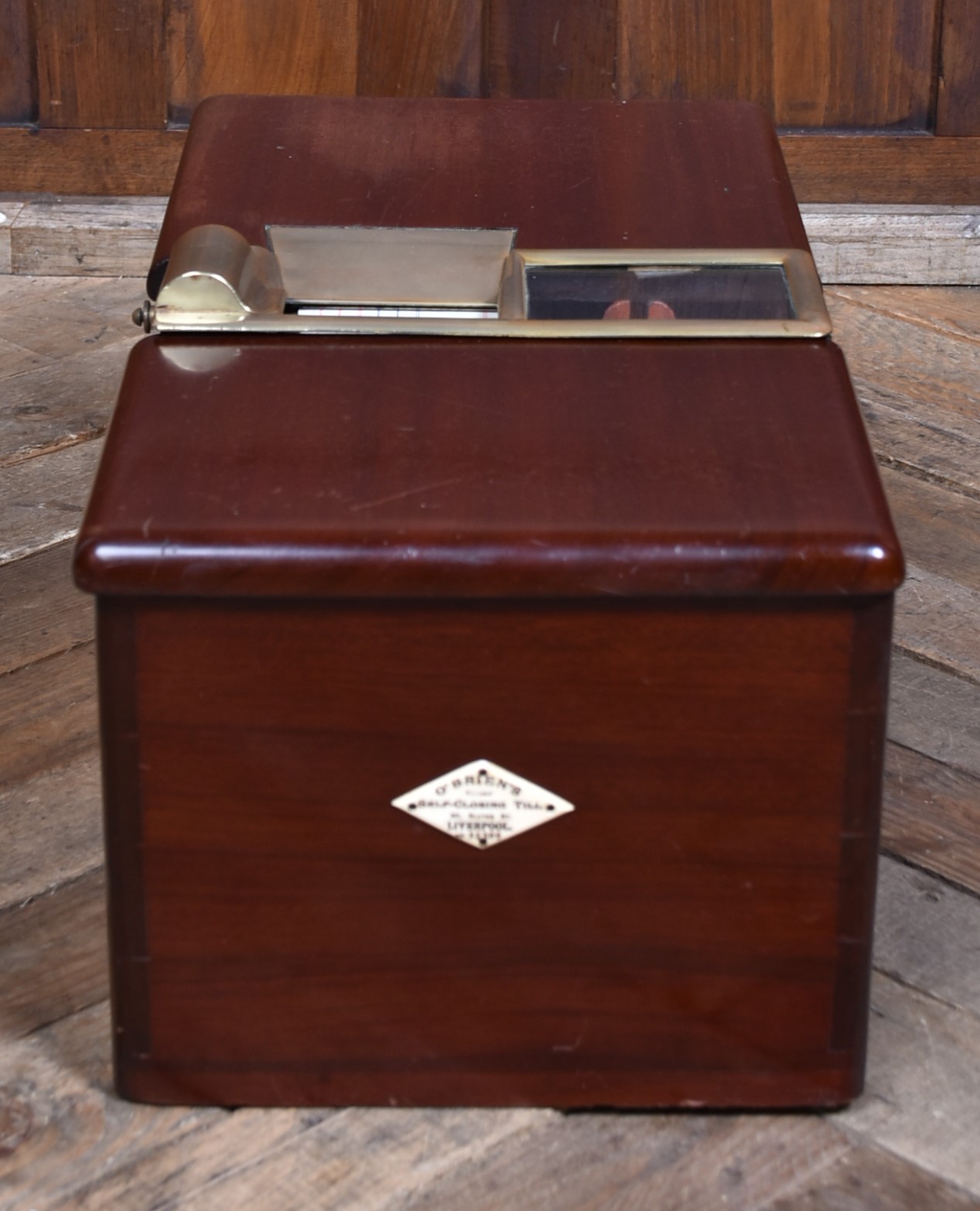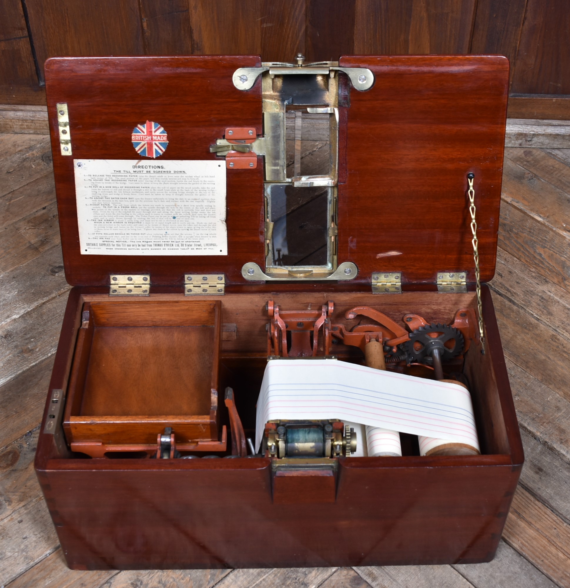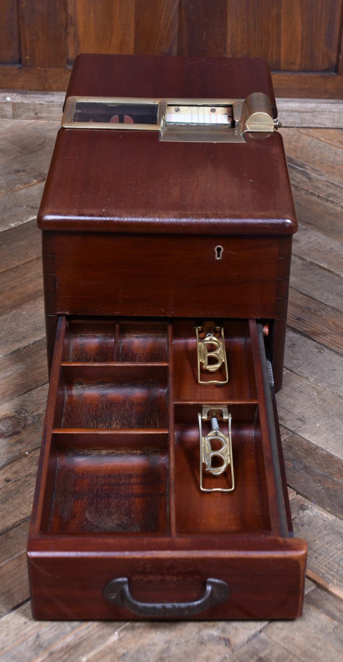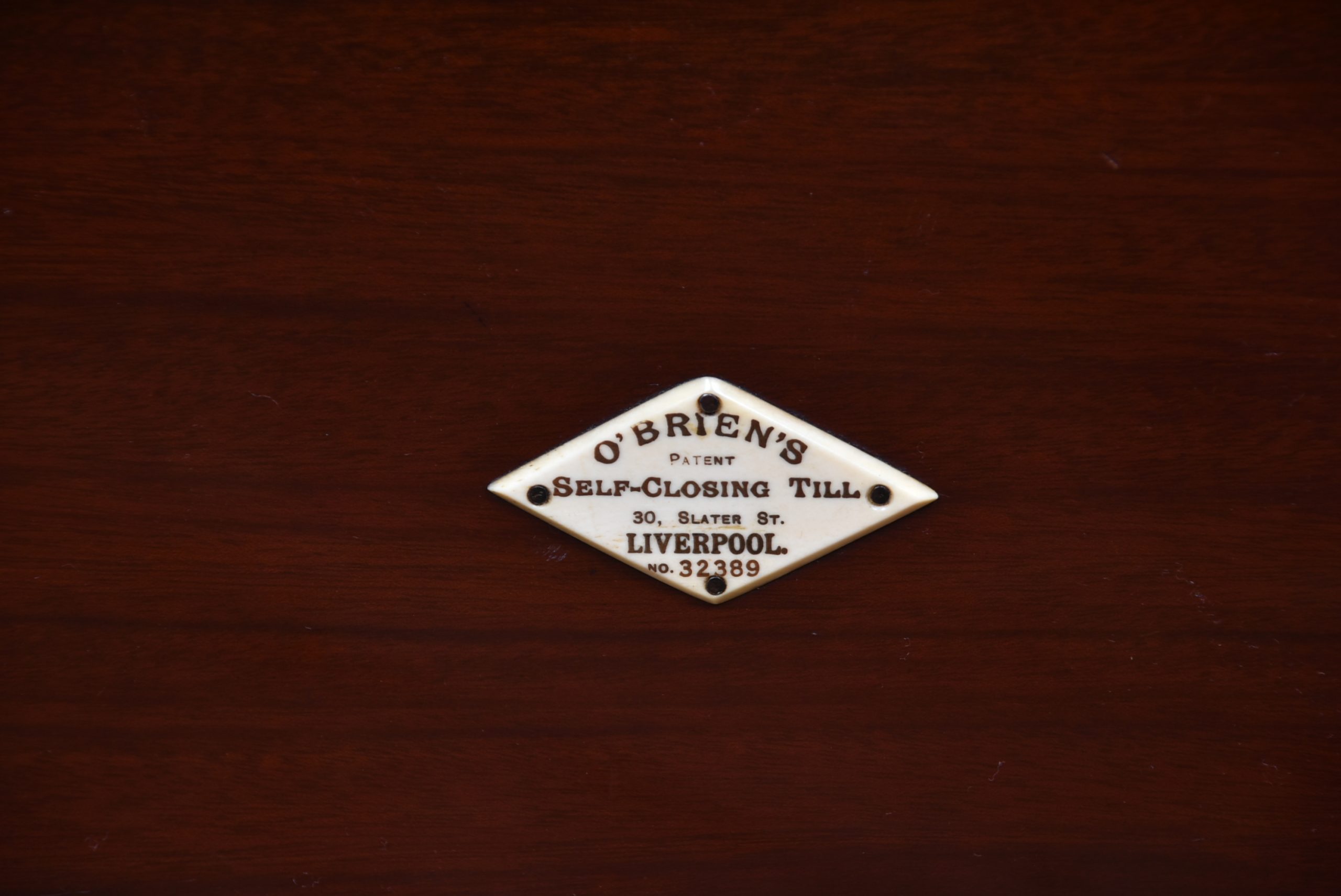 A superb example of Obrien’s self-closing till, crafted in rich mahogany with brass detailing in excellent condition. The internal mechanism is visible through a brass-framed glass panel, offering a glimpse into its ingenious design. The drawer is neatly compartmentalised for coins and notes, complete with brass bill clips. The back of the till bears a diamond-shaped label reading “O’Brien’s Self-Closing Till, Liverpool.” Inside the lid, original operating instructions remain intact, accompanied by a note from the previous owner, adding a personal touch to its provenance. Although the key is no longer present, the till remains a fascinating piece of commercial history, blending elegant craftsmanship with mechanical innovation.