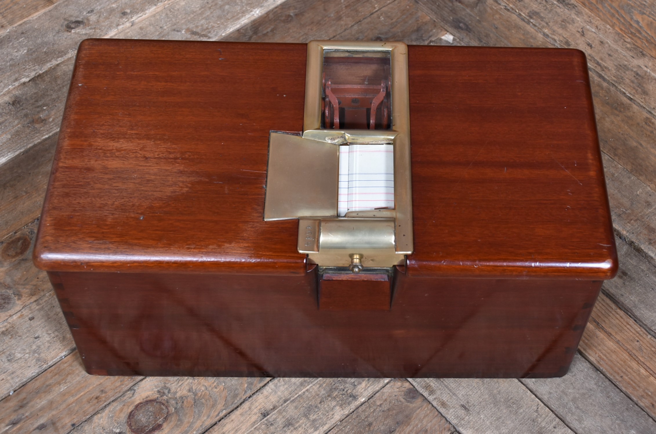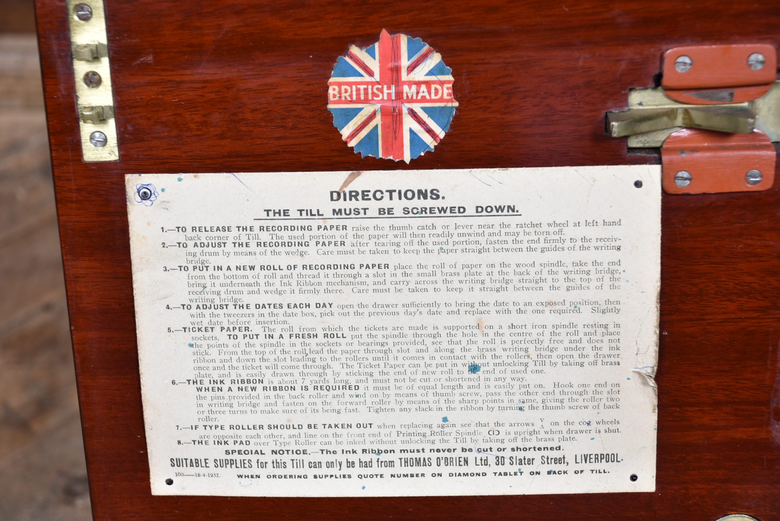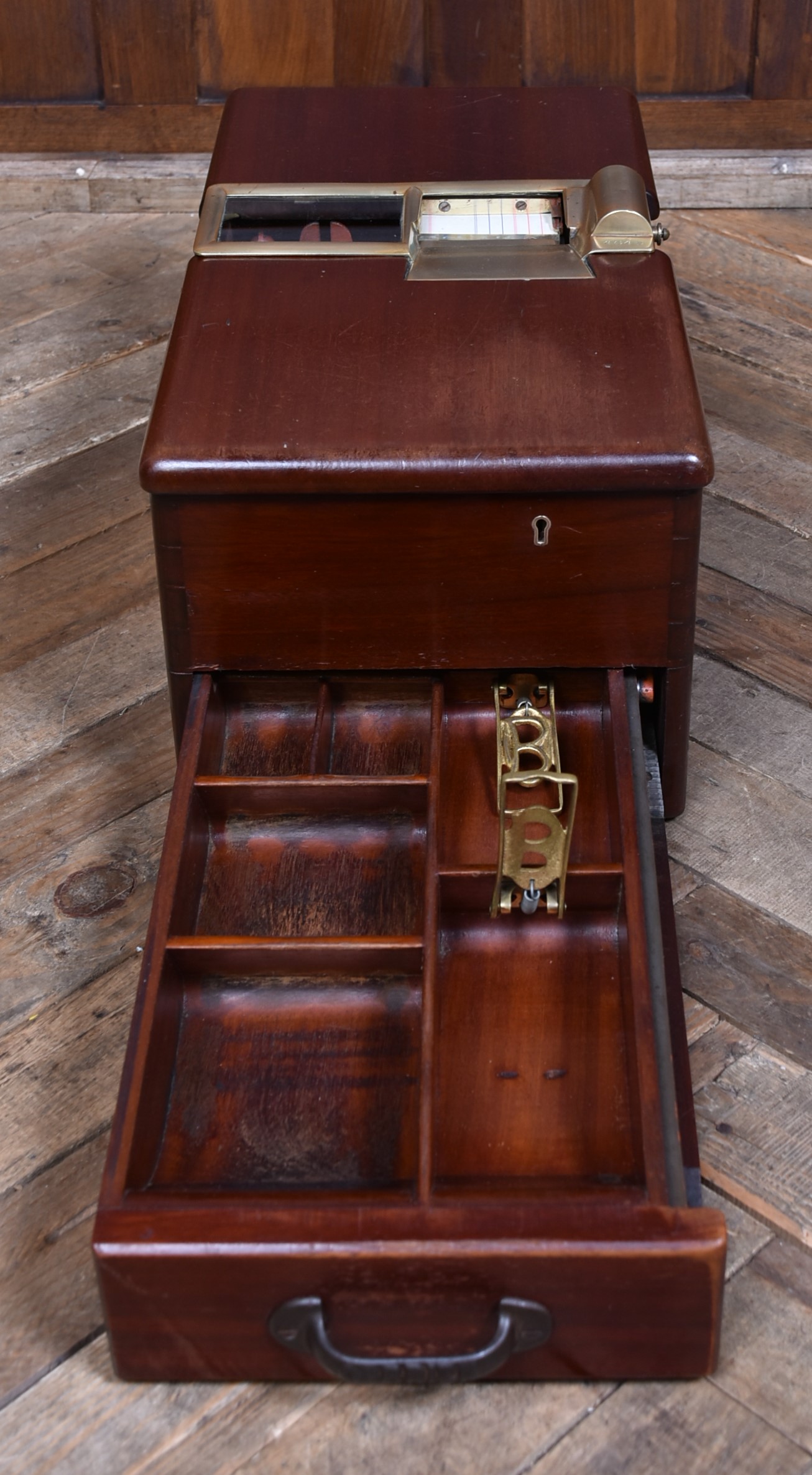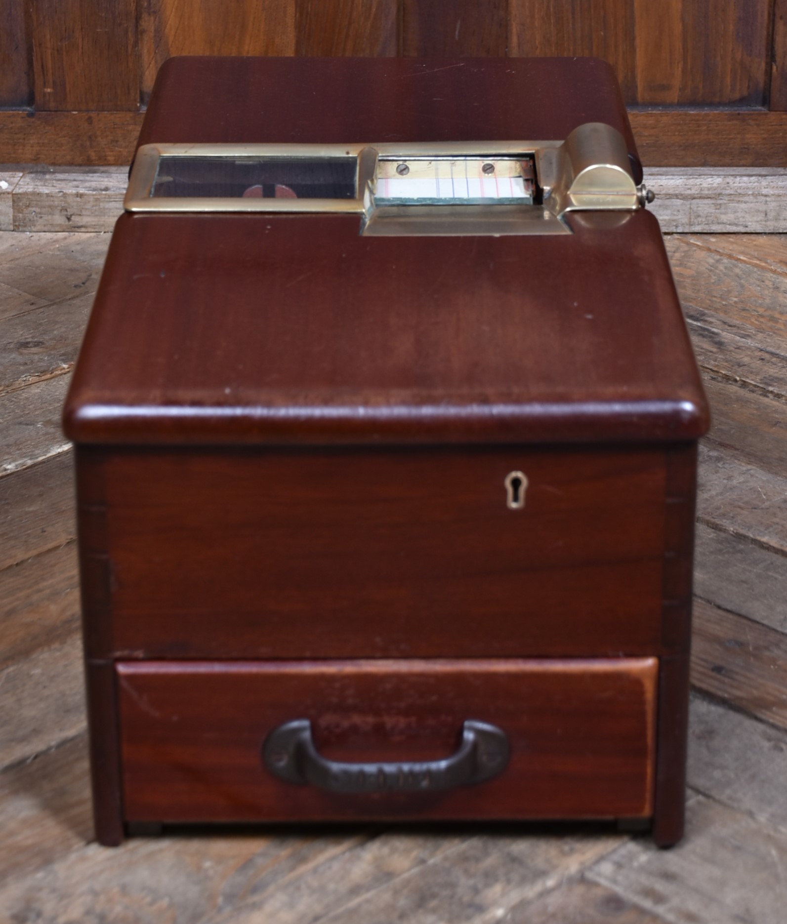 A superb example of Obrien’s self-closing till, crafted in rich mahogany with brass detailing in excellent condition. The internal mechanism is visible through a brass-framed glass panel, offering a glimpse into its ingenious design. The drawer is neatly compartmentalised for coins and notes, complete with brass bill clips. The back of the till bears a diamond-shaped label reading “O’Brien’s Self-Closing Till, Liverpool.” Inside the lid, original operating instructions remain intact, accompanied by a note from the previous owner, adding a personal touch to its provenance. Although the key is no longer present, the till remains a fascinating piece of commercial history, blending elegant craftsmanship with mechanical innovation.