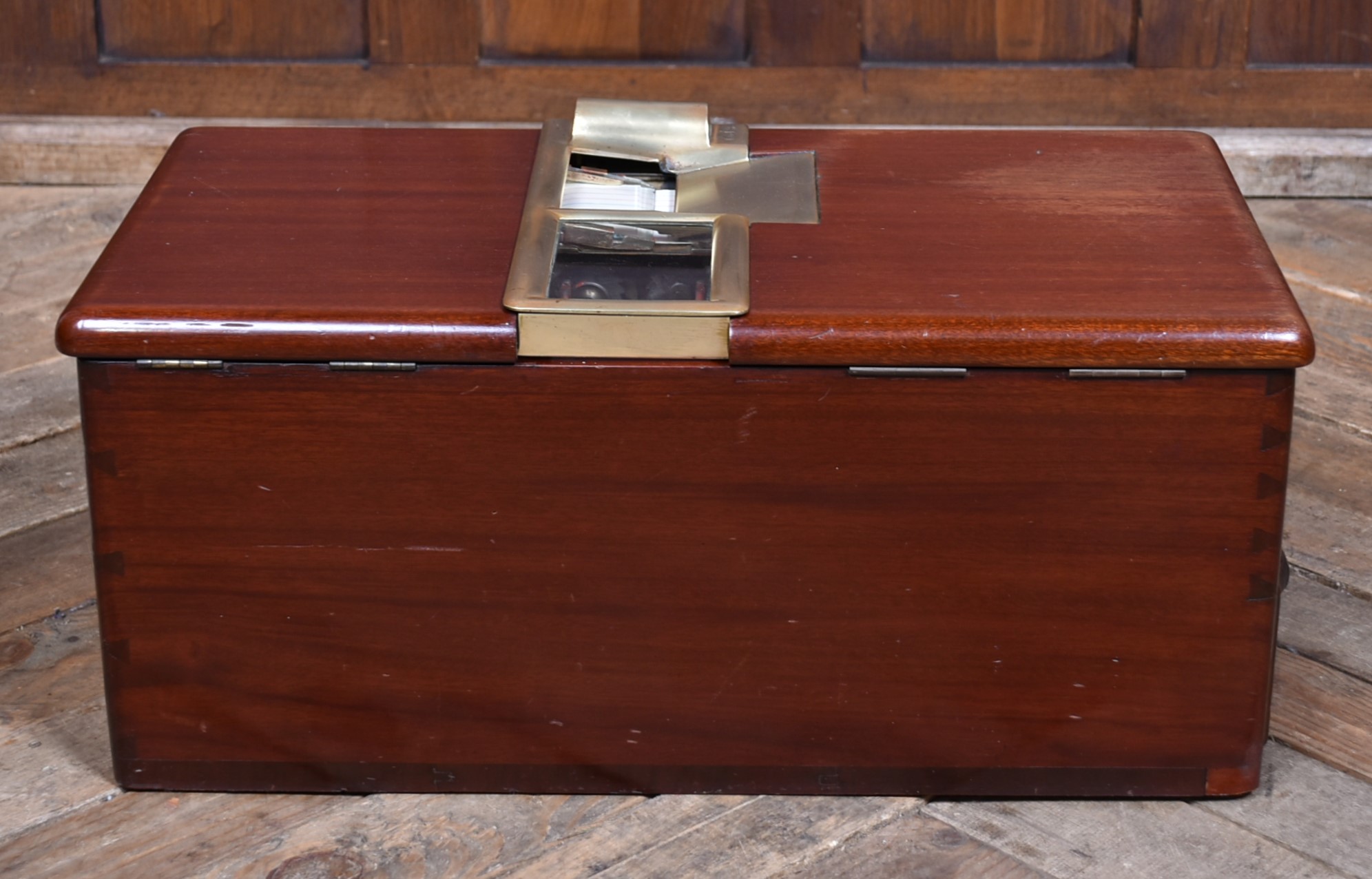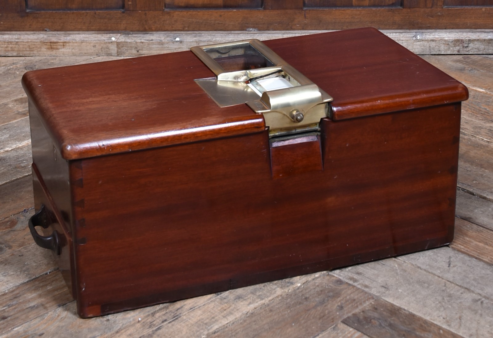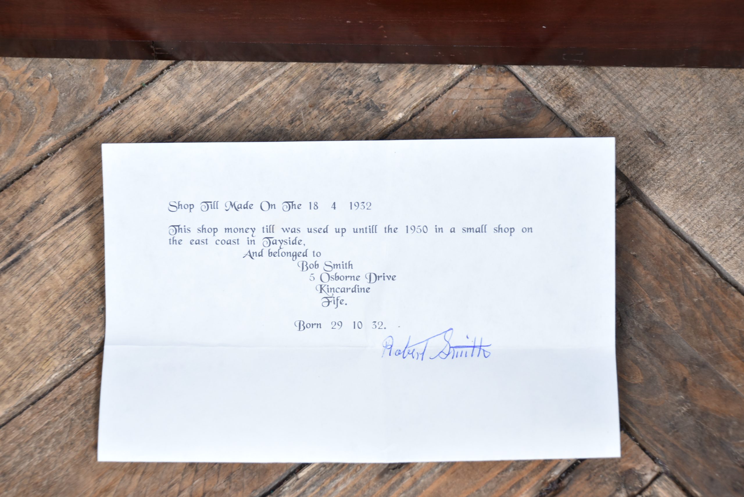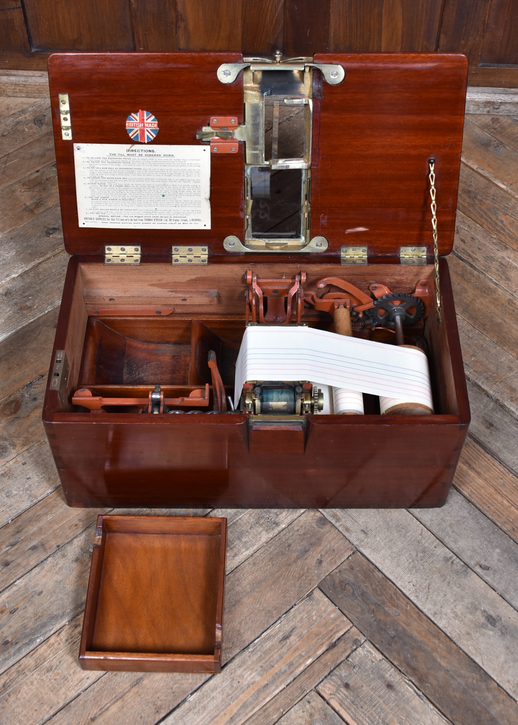 A superb example of Obrien’s self-closing till, crafted in rich mahogany with brass detailing in excellent condition. The internal mechanism is visible through a brass-framed glass panel, offering a glimpse into its ingenious design. The drawer is neatly compartmentalised for coins and notes, complete with brass bill clips. The back of the till bears a diamond-shaped label reading “O’Brien’s Self-Closing Till, Liverpool.” Inside the lid, original operating instructions remain intact, accompanied by a note from the previous owner, adding a personal touch to its provenance. Although the key is no longer present, the till remains a fascinating piece of commercial history, blending elegant craftsmanship with mechanical innovation.