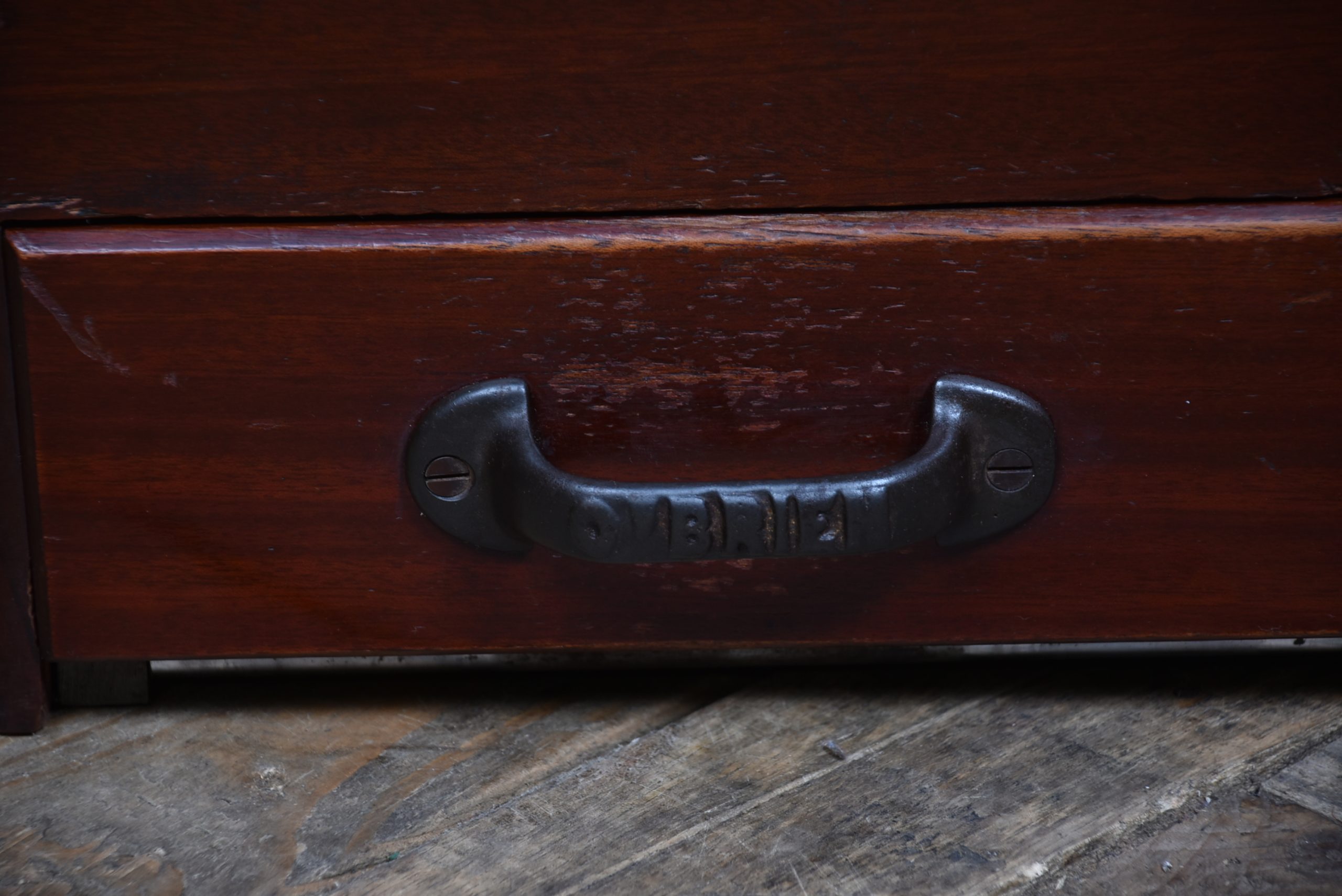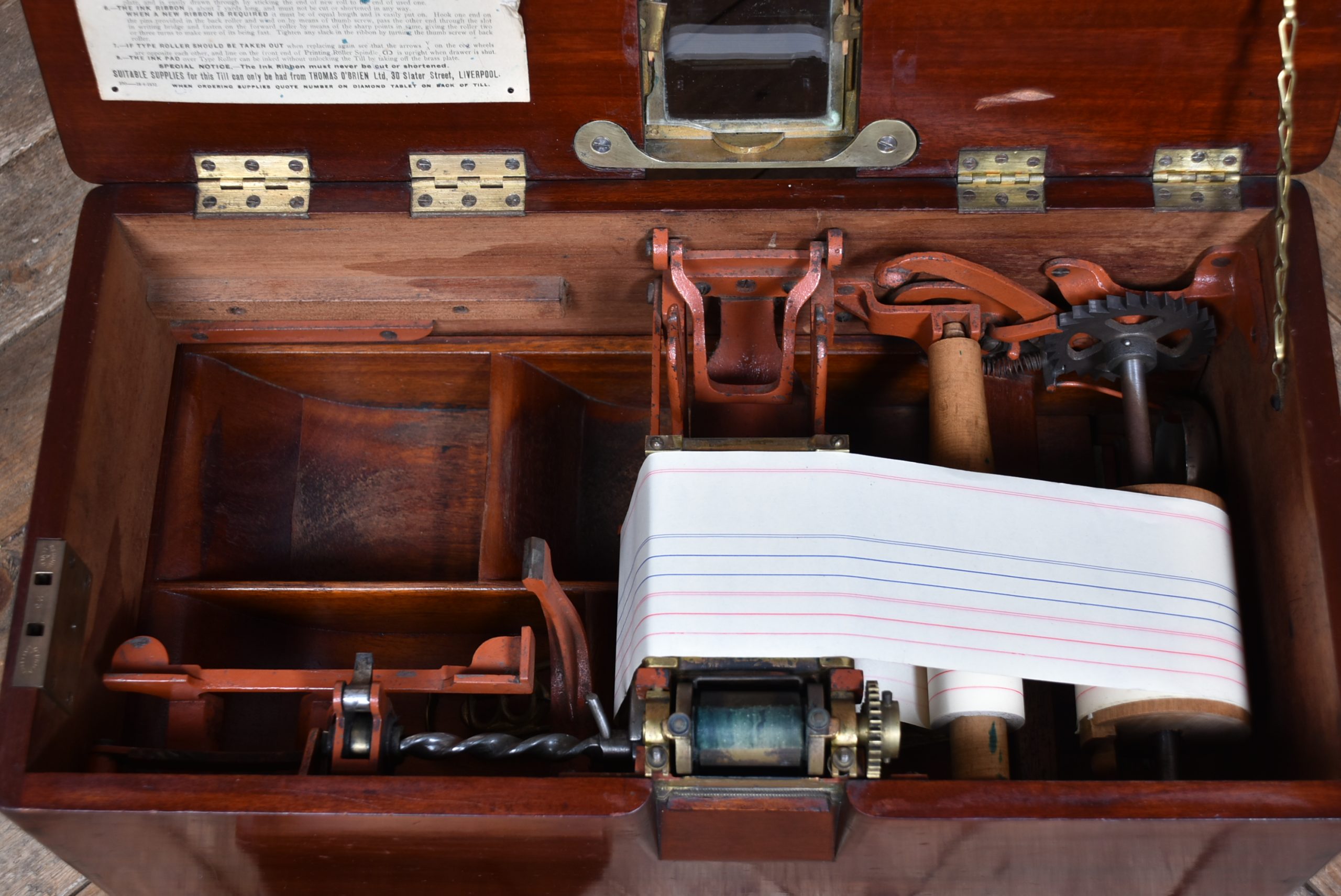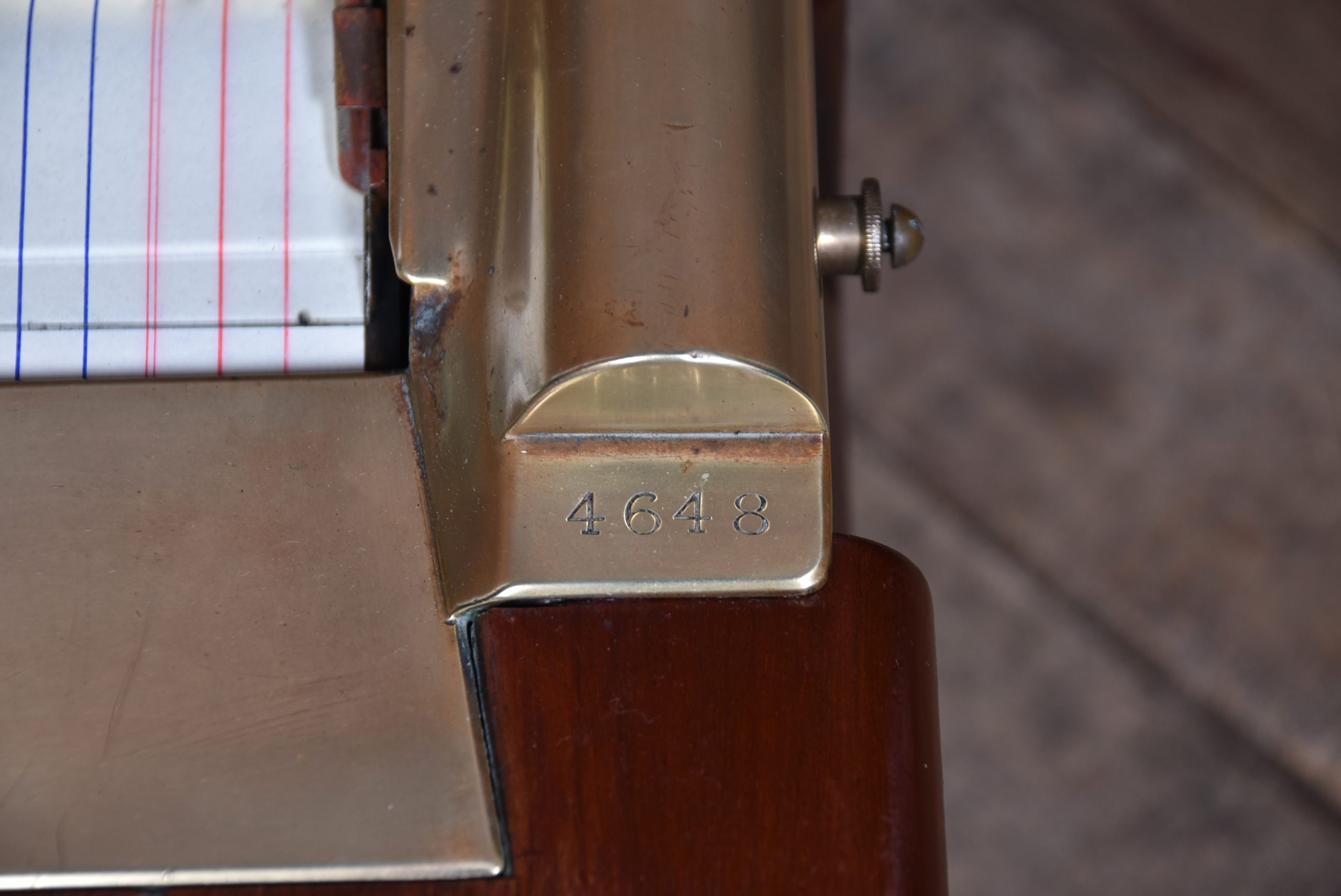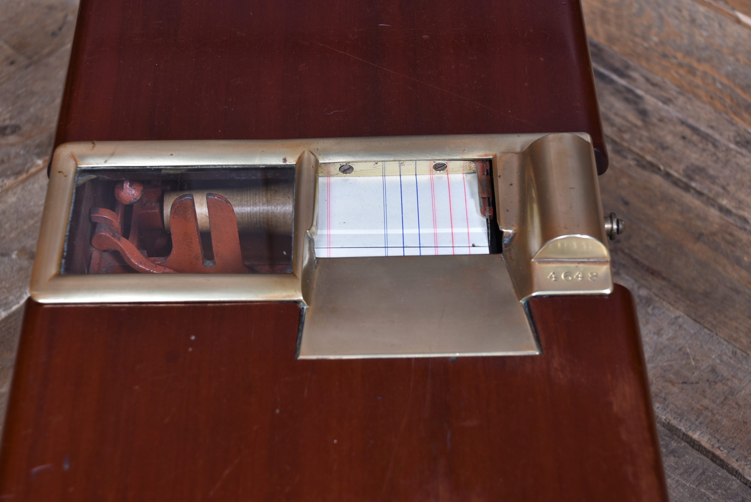 A superb example of Obrien’s self-closing till, crafted in rich mahogany with brass detailing in excellent condition. The internal mechanism is visible through a brass-framed glass panel, offering a glimpse into its ingenious design. The drawer is neatly compartmentalised for coins and notes, complete with brass bill clips. The back of the till bears a diamond-shaped label reading “O’Brien’s Self-Closing Till, Liverpool.” Inside the lid, original operating instructions remain intact, accompanied by a note from the previous owner, adding a personal touch to its provenance. Although the key is no longer present, the till remains a fascinating piece of commercial history, blending elegant craftsmanship with mechanical innovation.