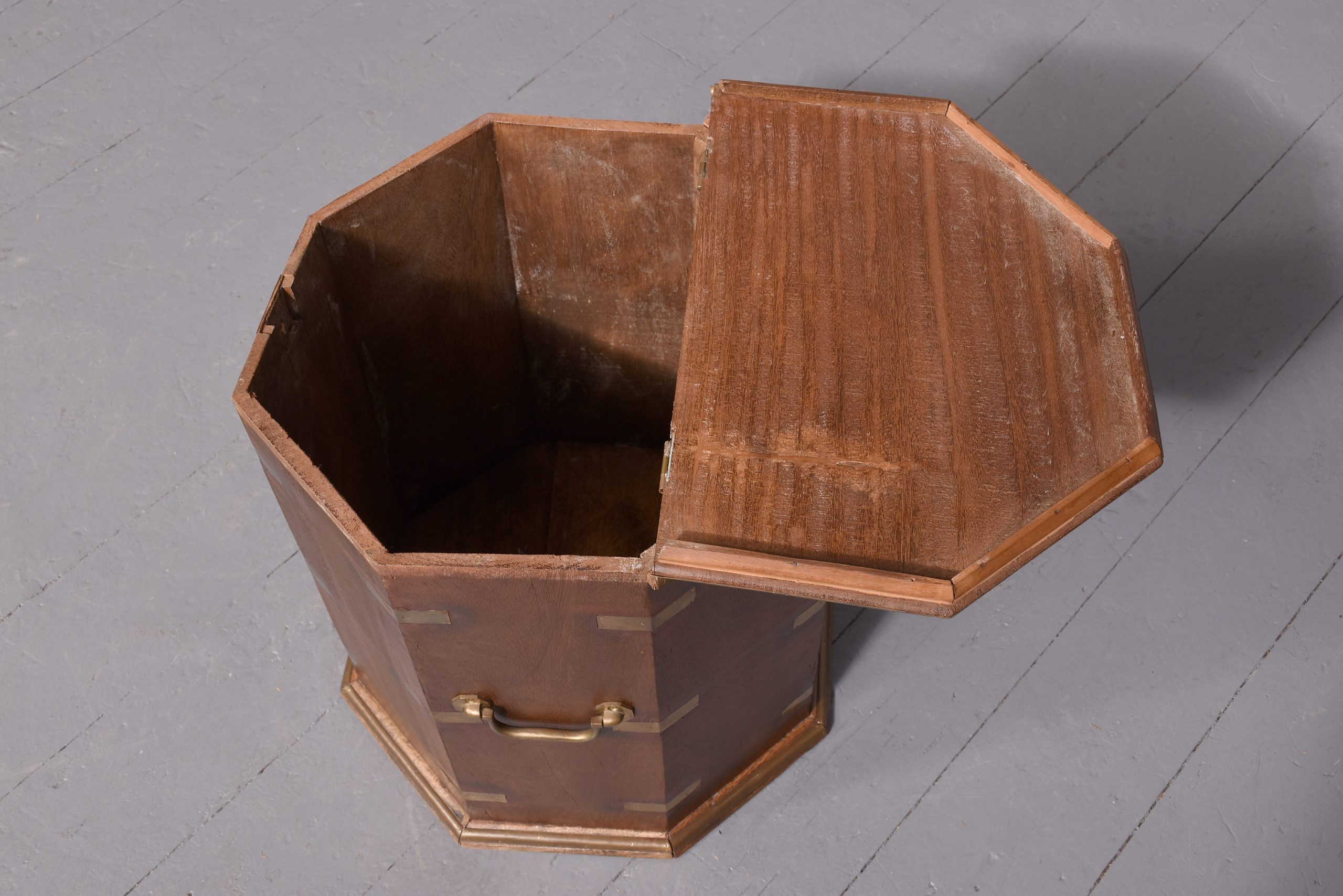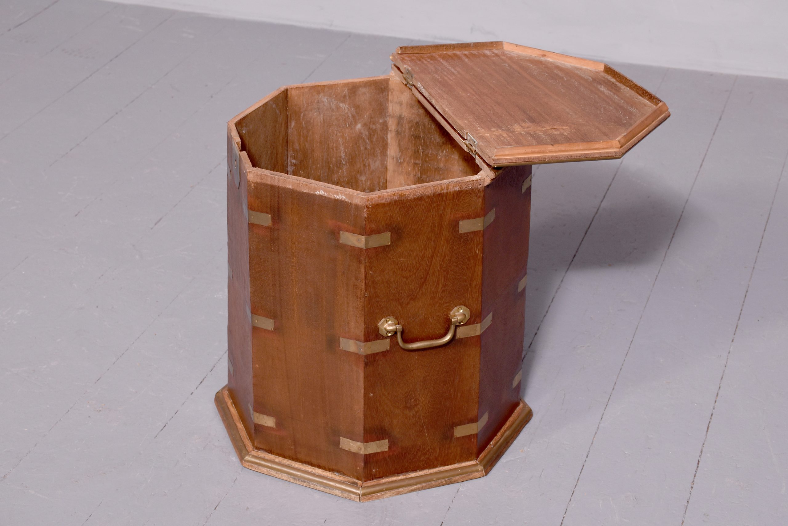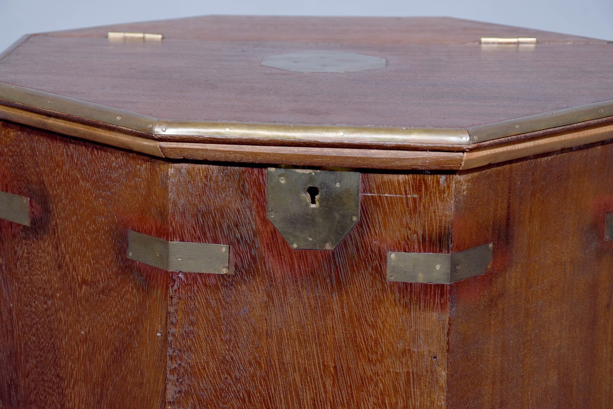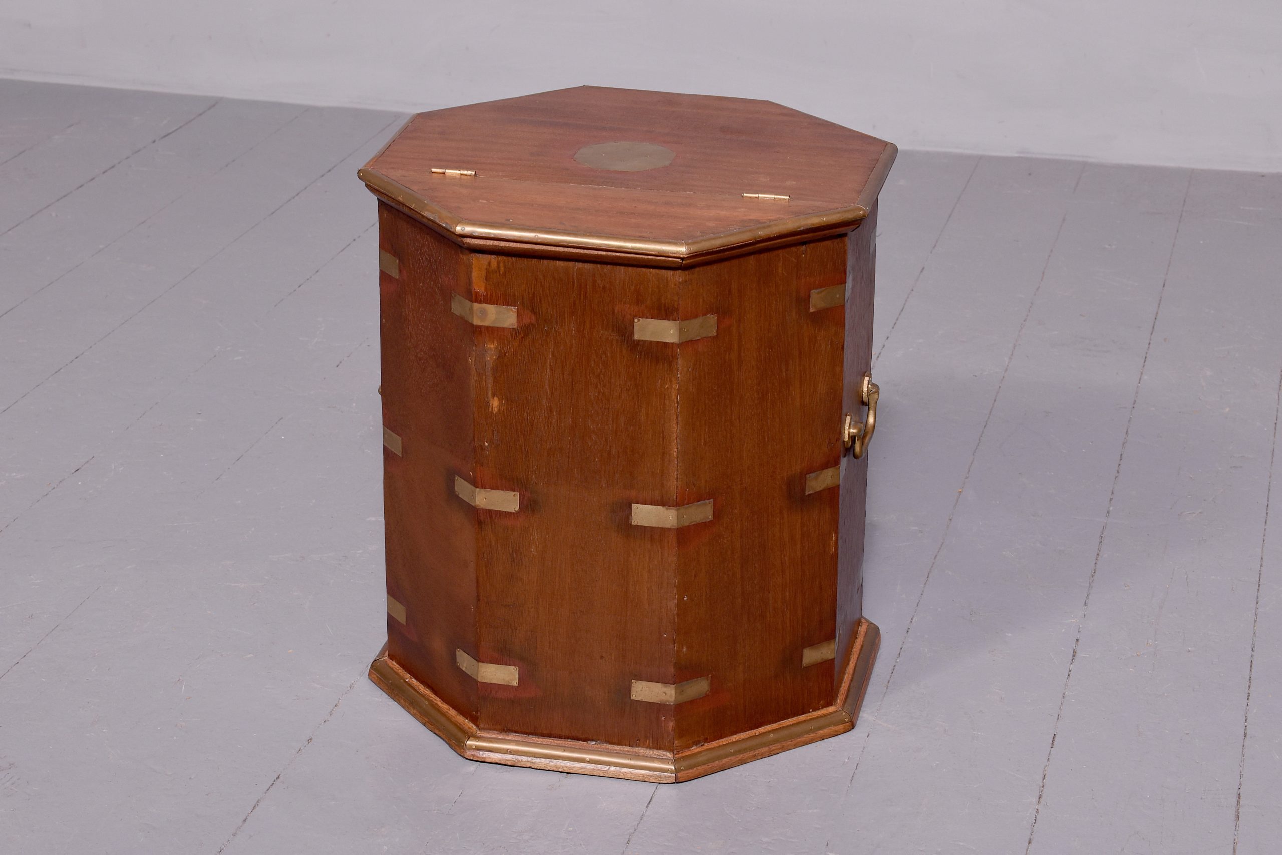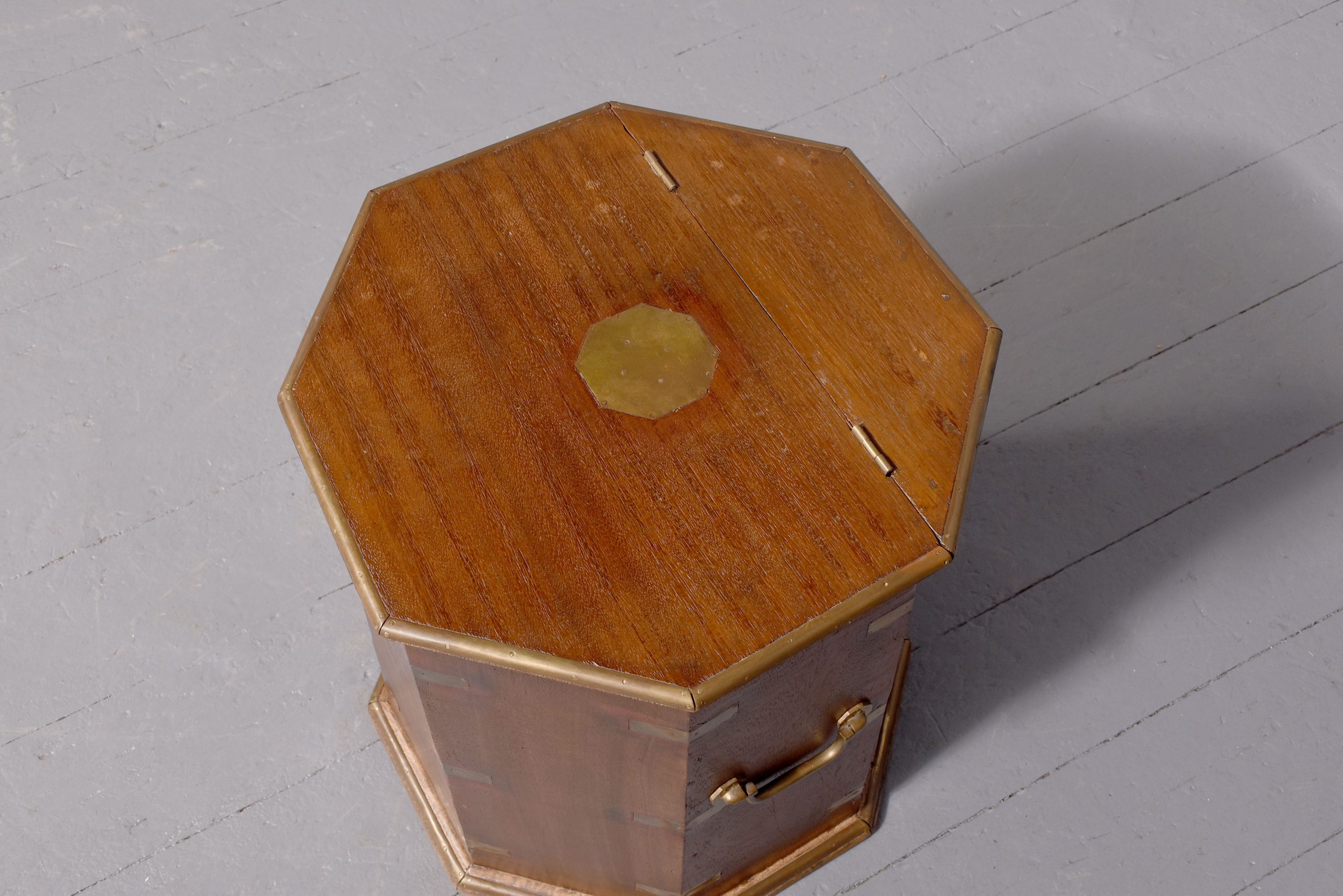 Circa 1950. Octagonal brassbound coffee table/storage box with a central brass plaque and brass banding to the top which opens to a storage area. The sides with brass carrying handle and brass strapping and moulded brass base