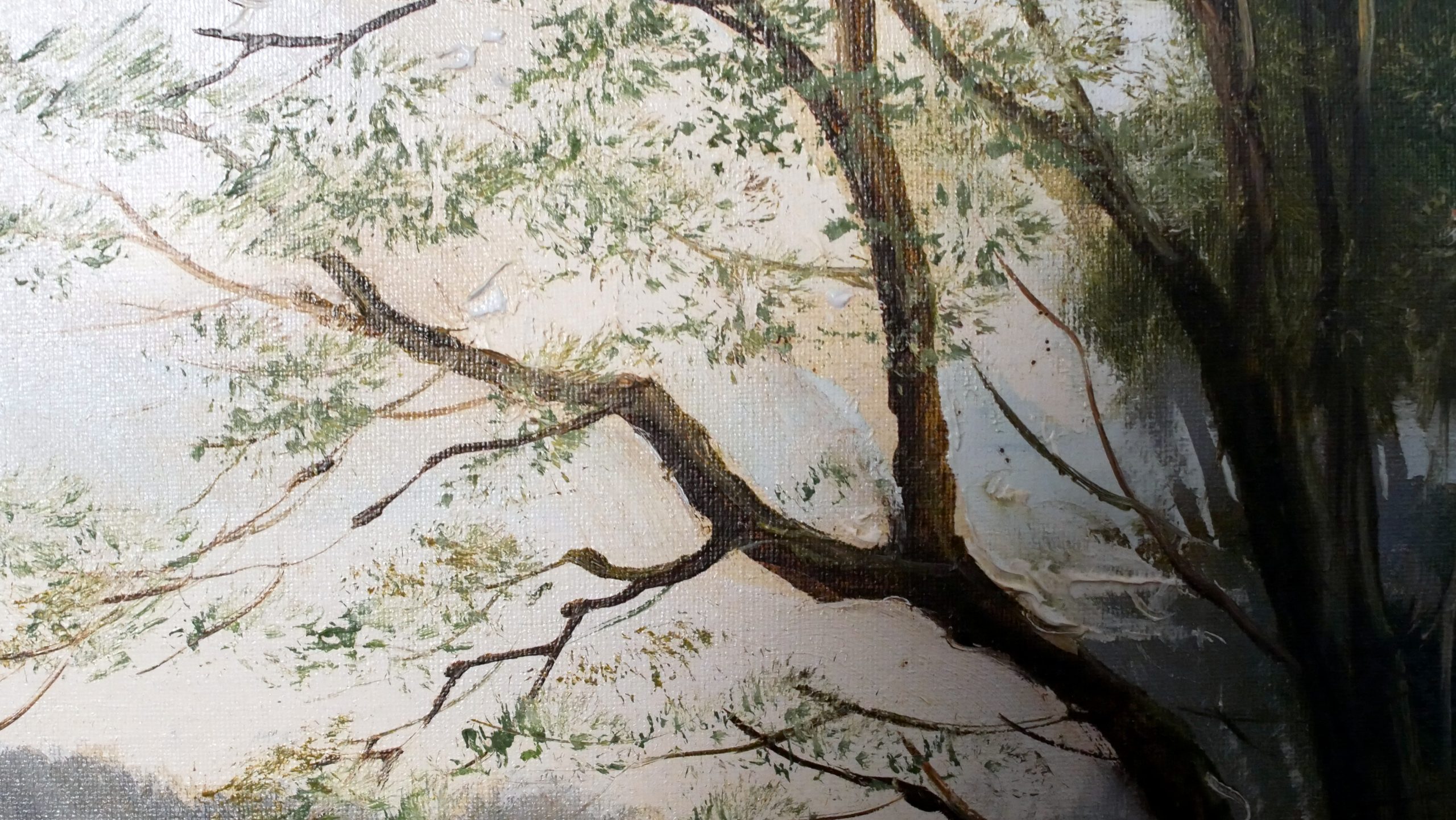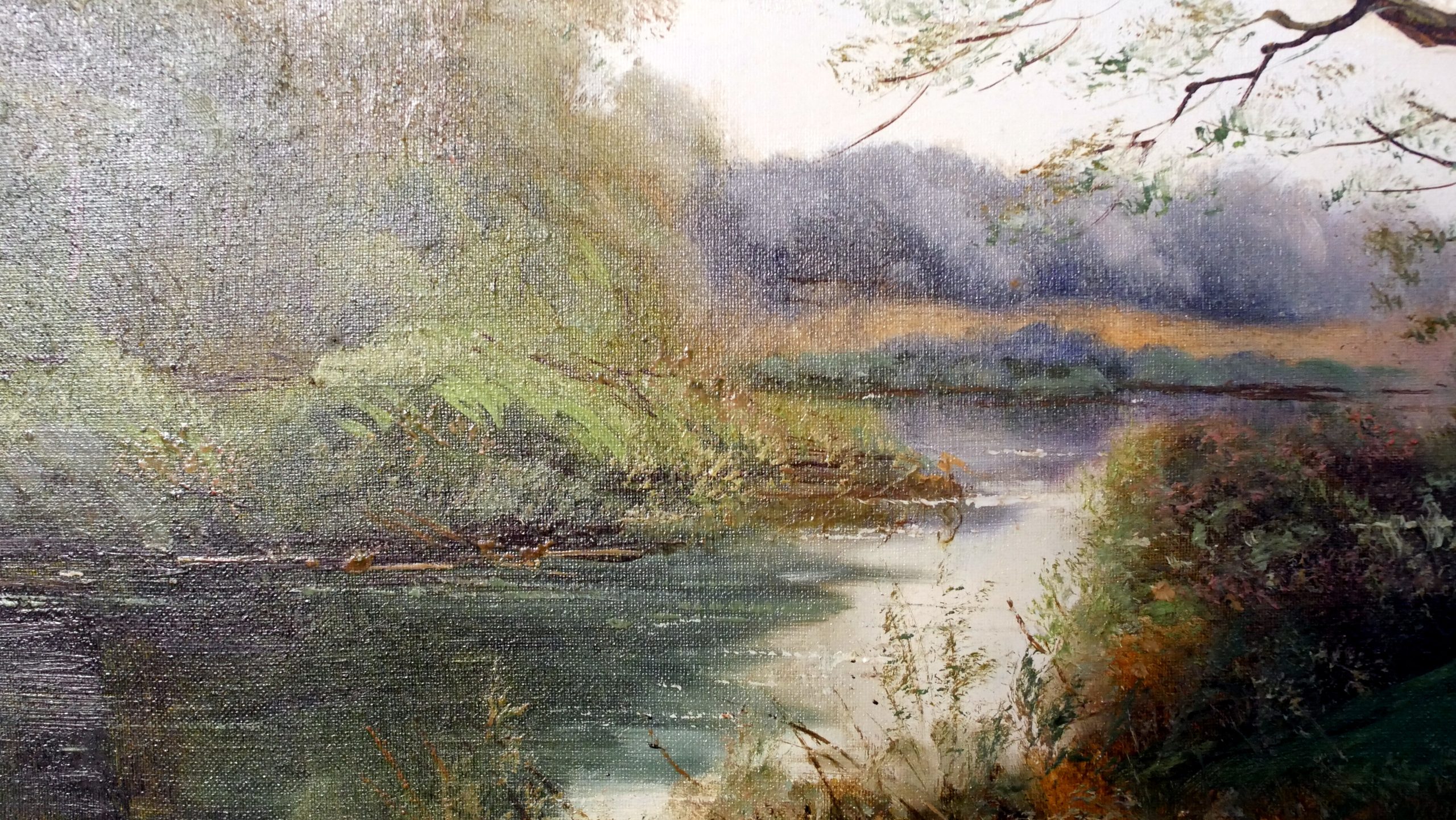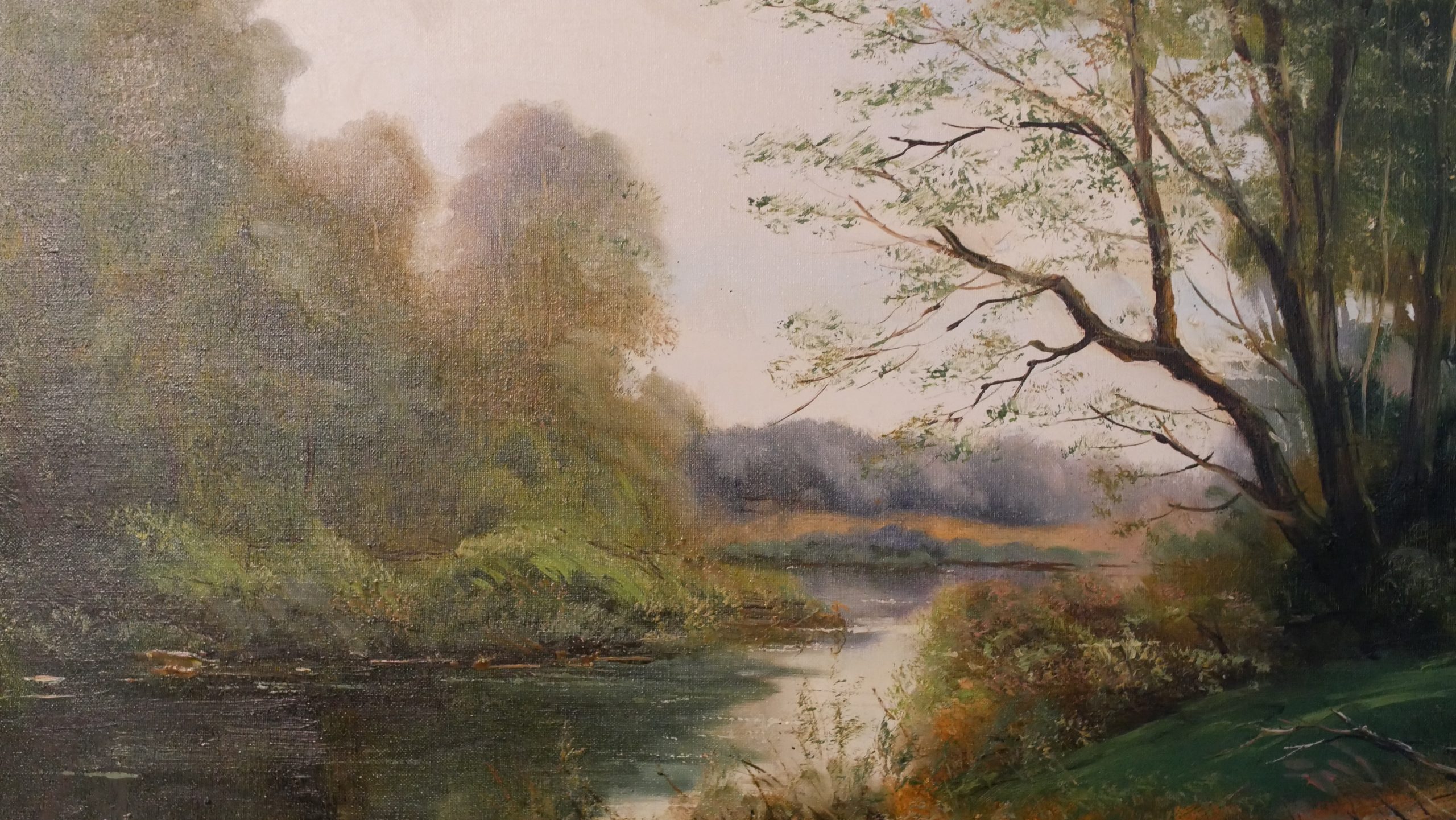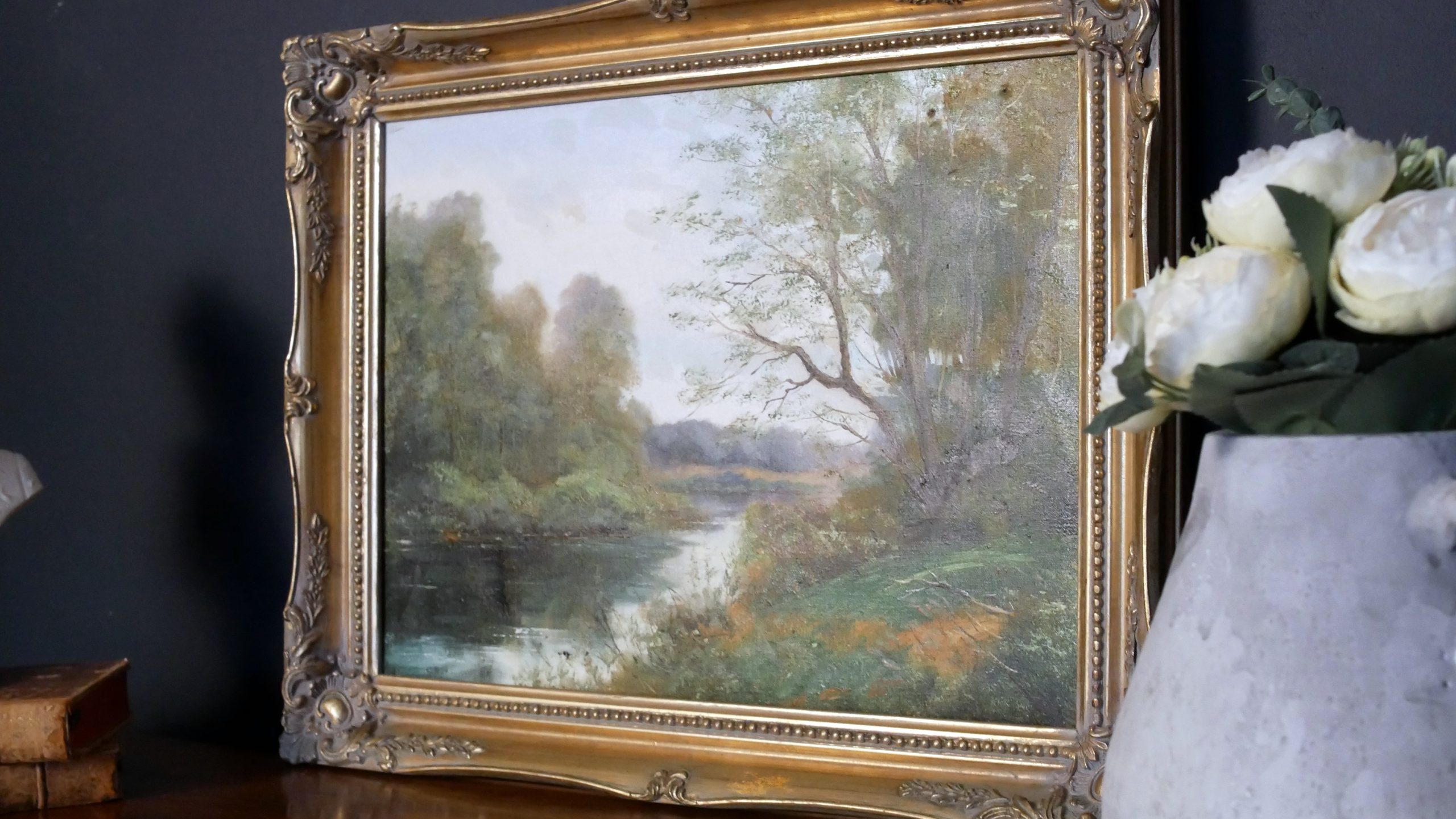 A serene and evocative oil painting by Peter Snell, capturing the quiet beauty and timeless atmosphere of the English countryside. Bathed in soft light, the composition draws the viewer into a tranquil river landscape framed by gently arching trees and distant hills—an exquisite study in balance, tone, and natural harmony.