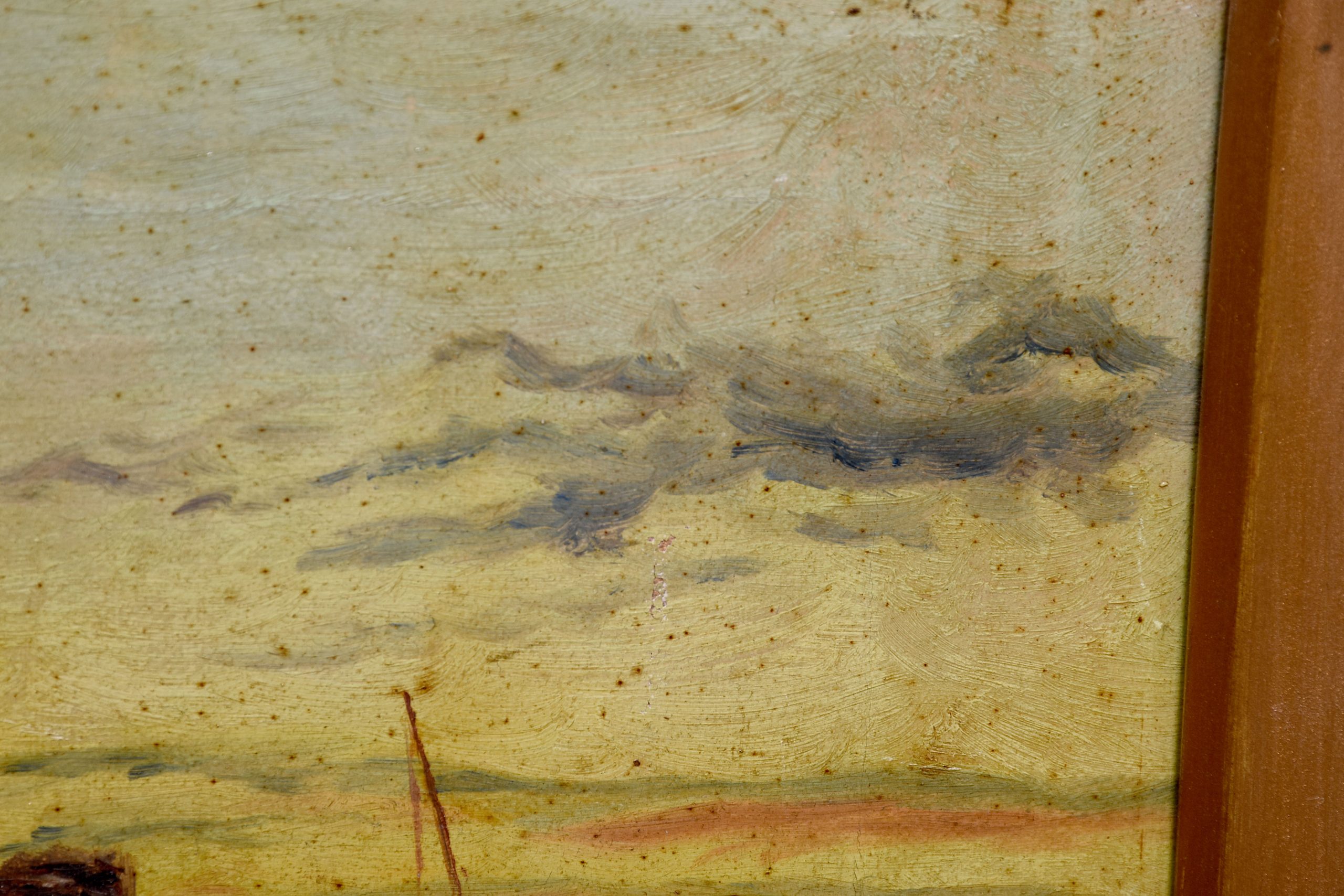 Circa 1900. A small oil on canvas in a gilded frame, the rectangular painting depicting a figure with a ruined castle with sailing boats in the foreground and background, the fort is sitting on a small raised mound, contained in a gilded slip and gilded and moulded gesso frame.