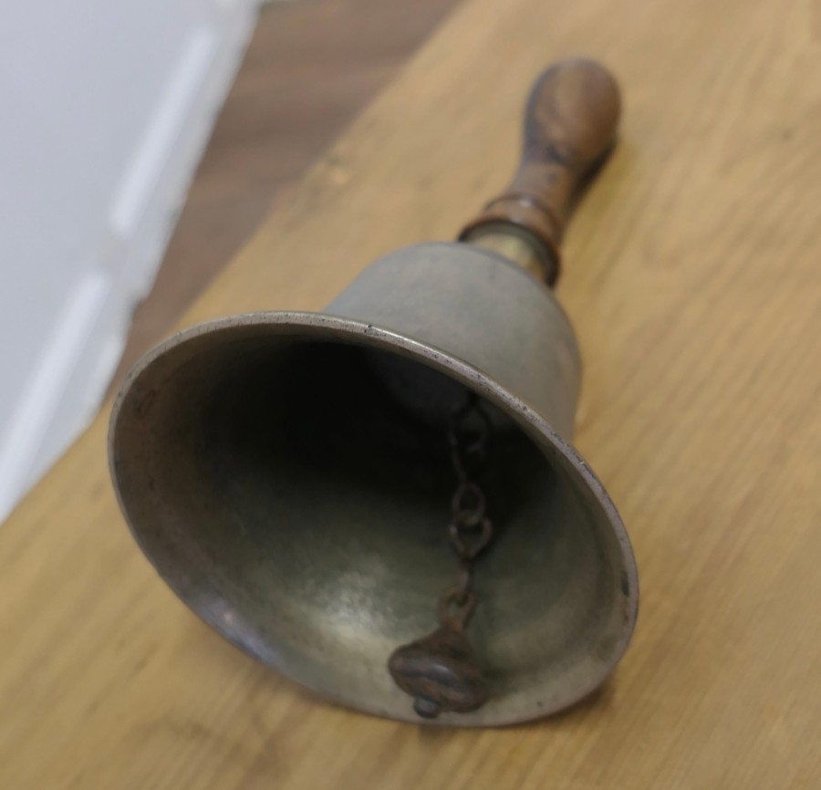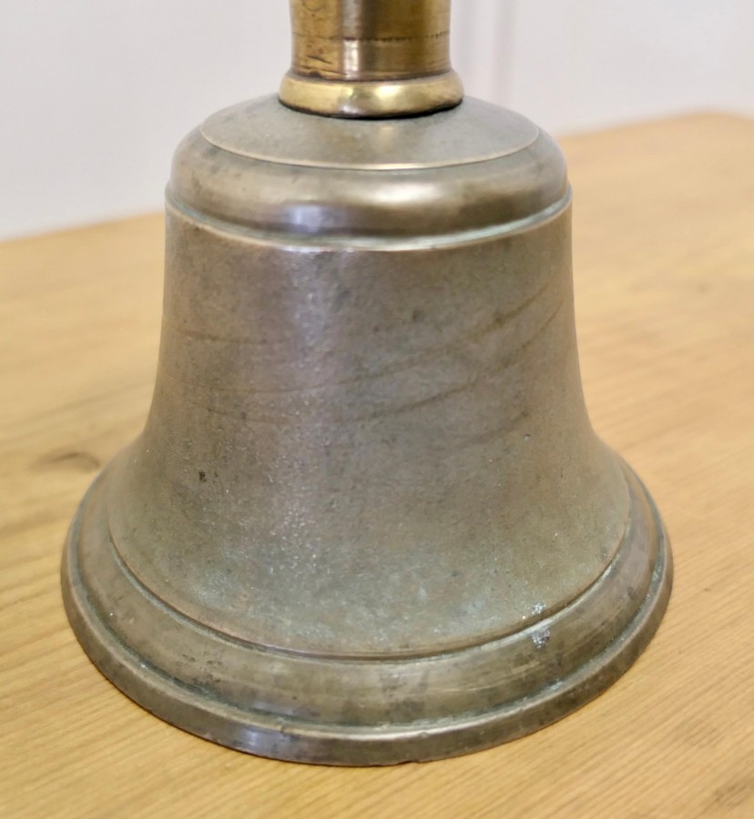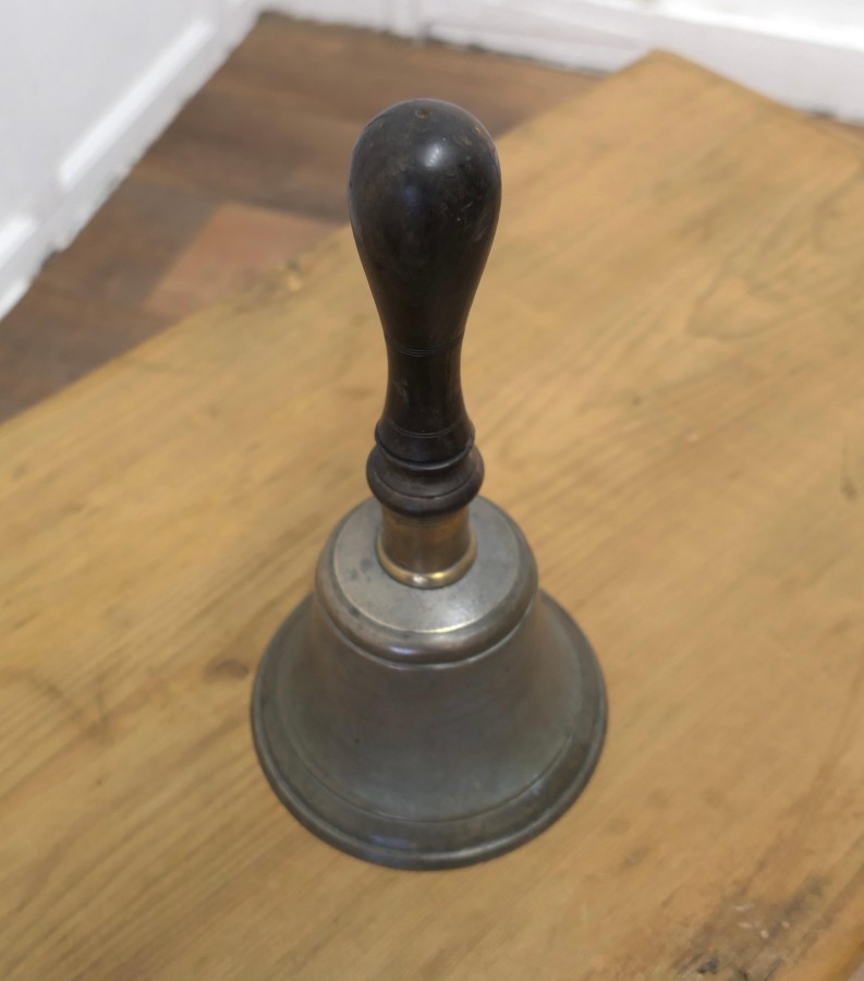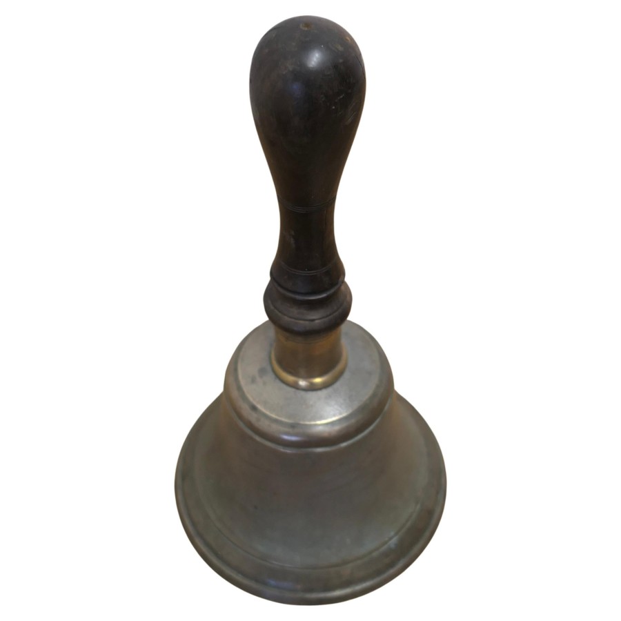 Old Bronze Hand Bell, Town Cryer’s or School Bell A Great piece, the bell is made in solid bronze and has a beautiful lignum vitae turned handle and a loud ring The bell is 12” high, and 6” in diameter VY40 Manufacture Date : 19th century Materials : Bronze