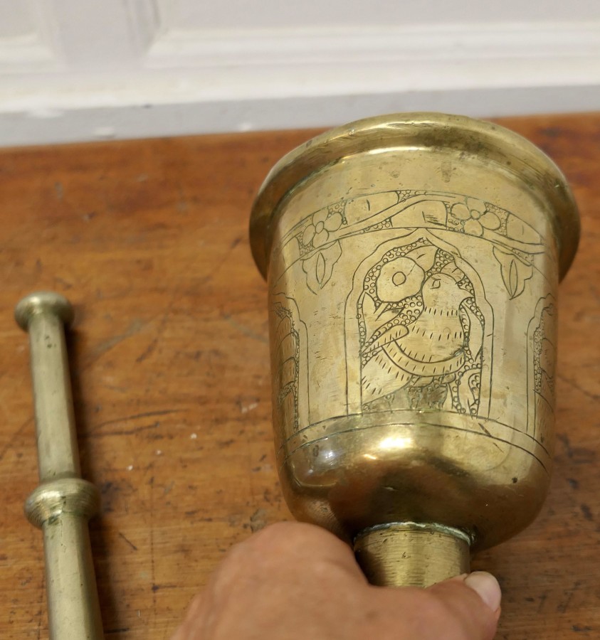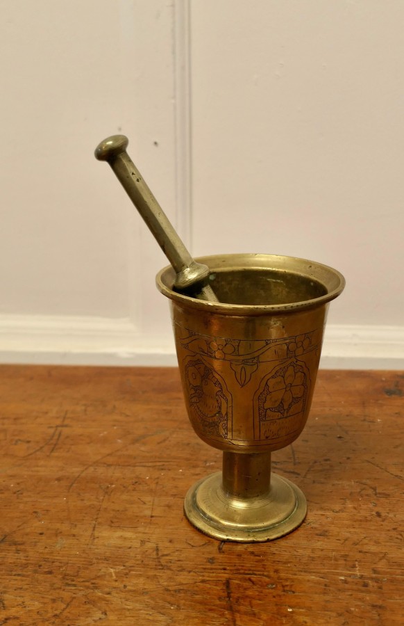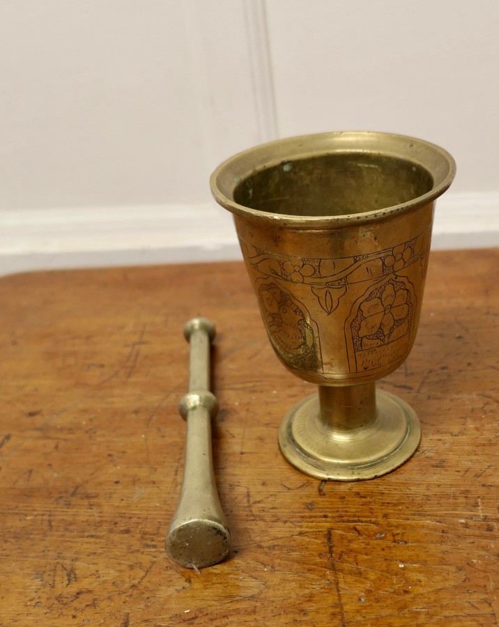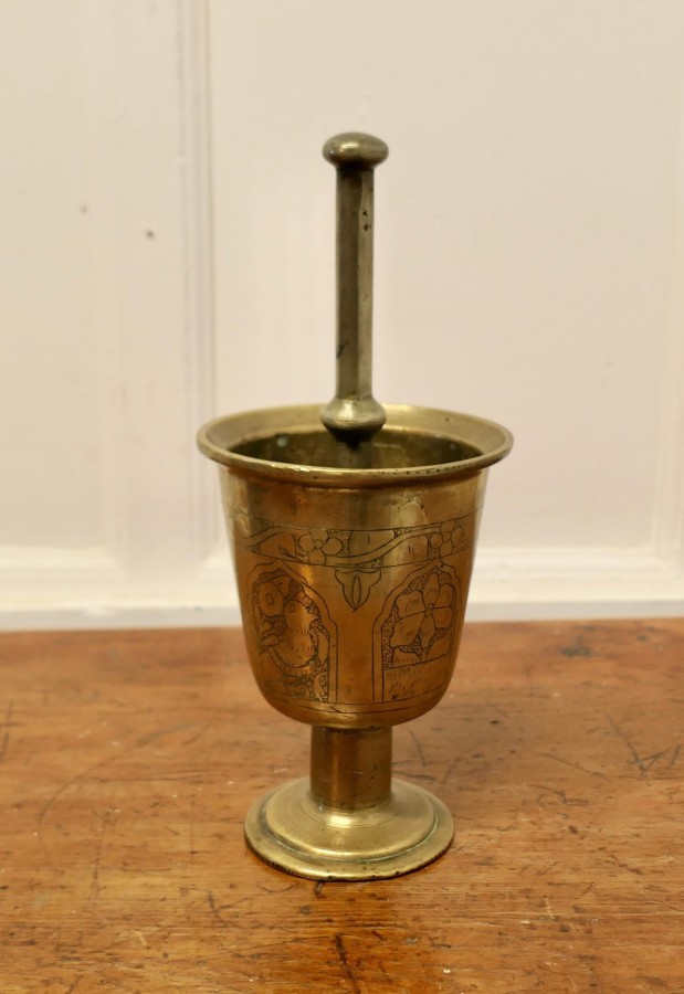 Oriental Brass Pestle and Mortar An unusual pair probably made for the preparation of herbal treatments The mortar is clean inside so it could be used in your kitchen, this is a very heavy pair, the Mortar is decorated with Flower and Birds In good used condition, a charming culinary piece The Mortar is 8” high and 6” in diameter, the pestle is 11” long SW200 Manufacture Date : 19th century Materials : Brass