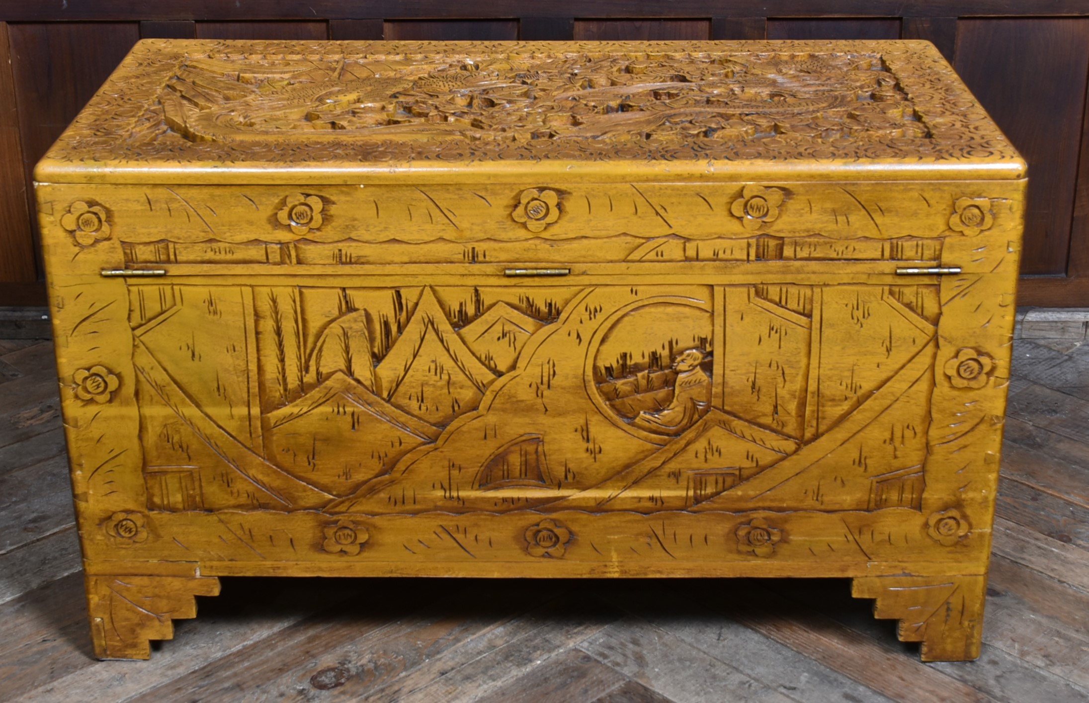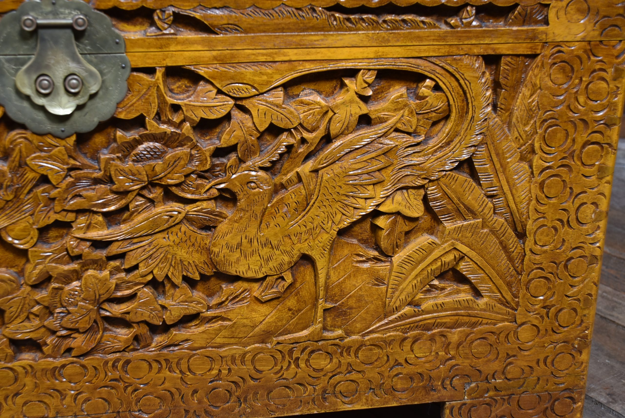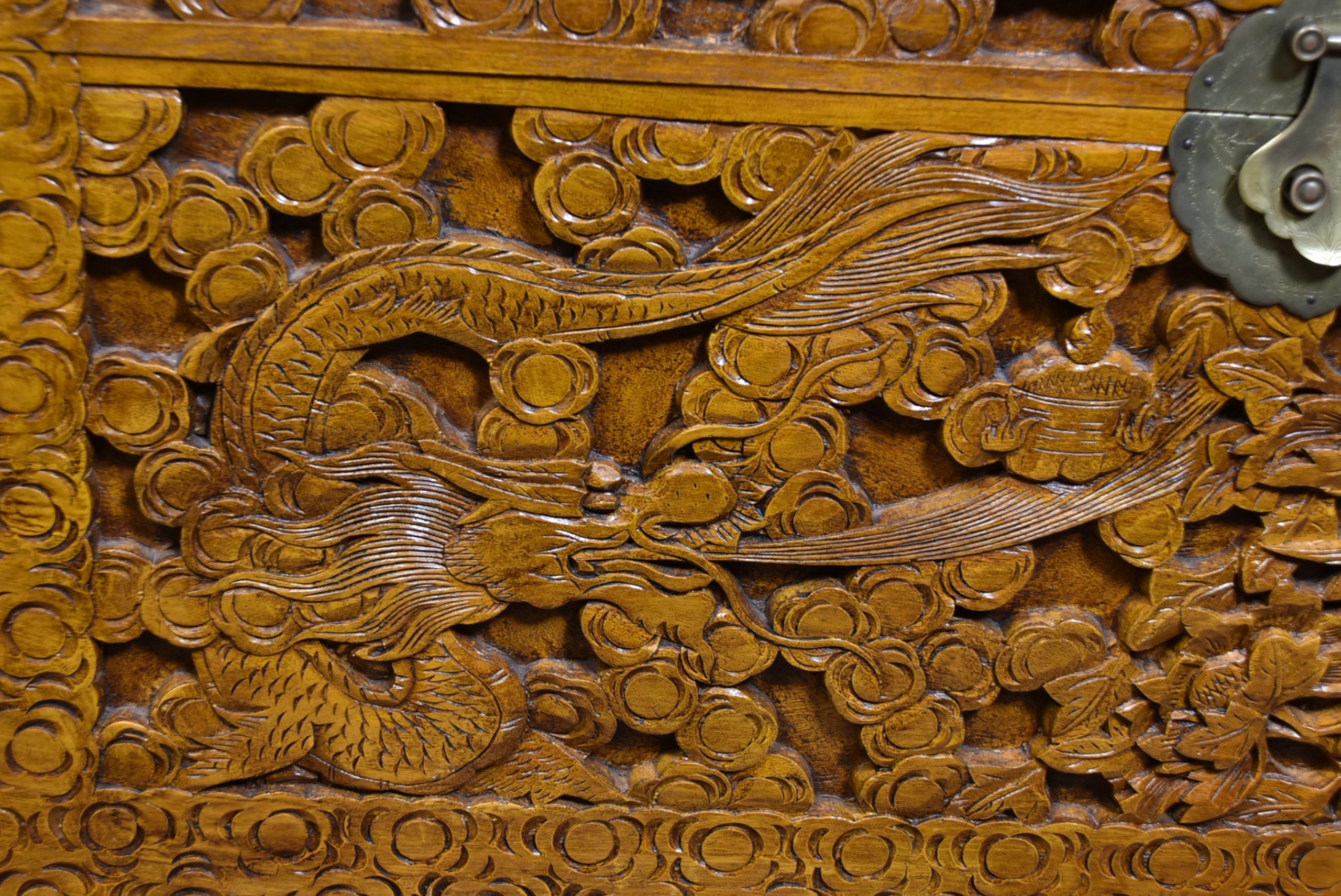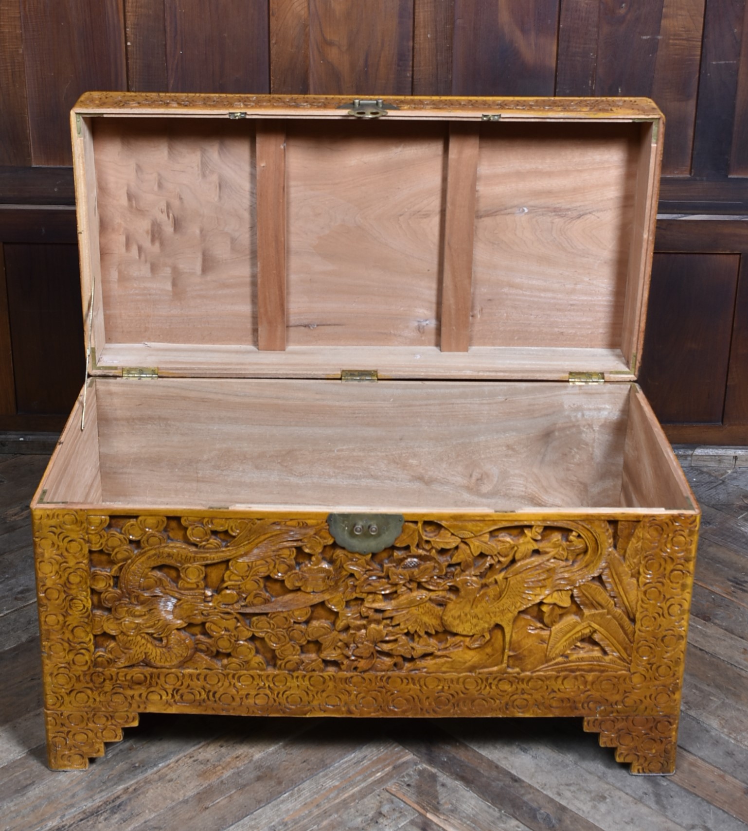 A fantastic Oriental camphor wood blanket or storage chest, intricately carved with dragons that dance across the front and top. The carvings extend to the sides and back, revealing exceptional depth and craftsmanship. Its warm, polished tone and decorative metal latch lend a sense of richness and refinement. Inside, the chest is clean and generously proportioned—perfect for storing blankets, pillows, or linens. Whether placed at the foot of a bed or repurposed as a coffee table, it offers both practical storage and striking decorative presence. A true statement piece, steeped in symbolism and timeless artistry.