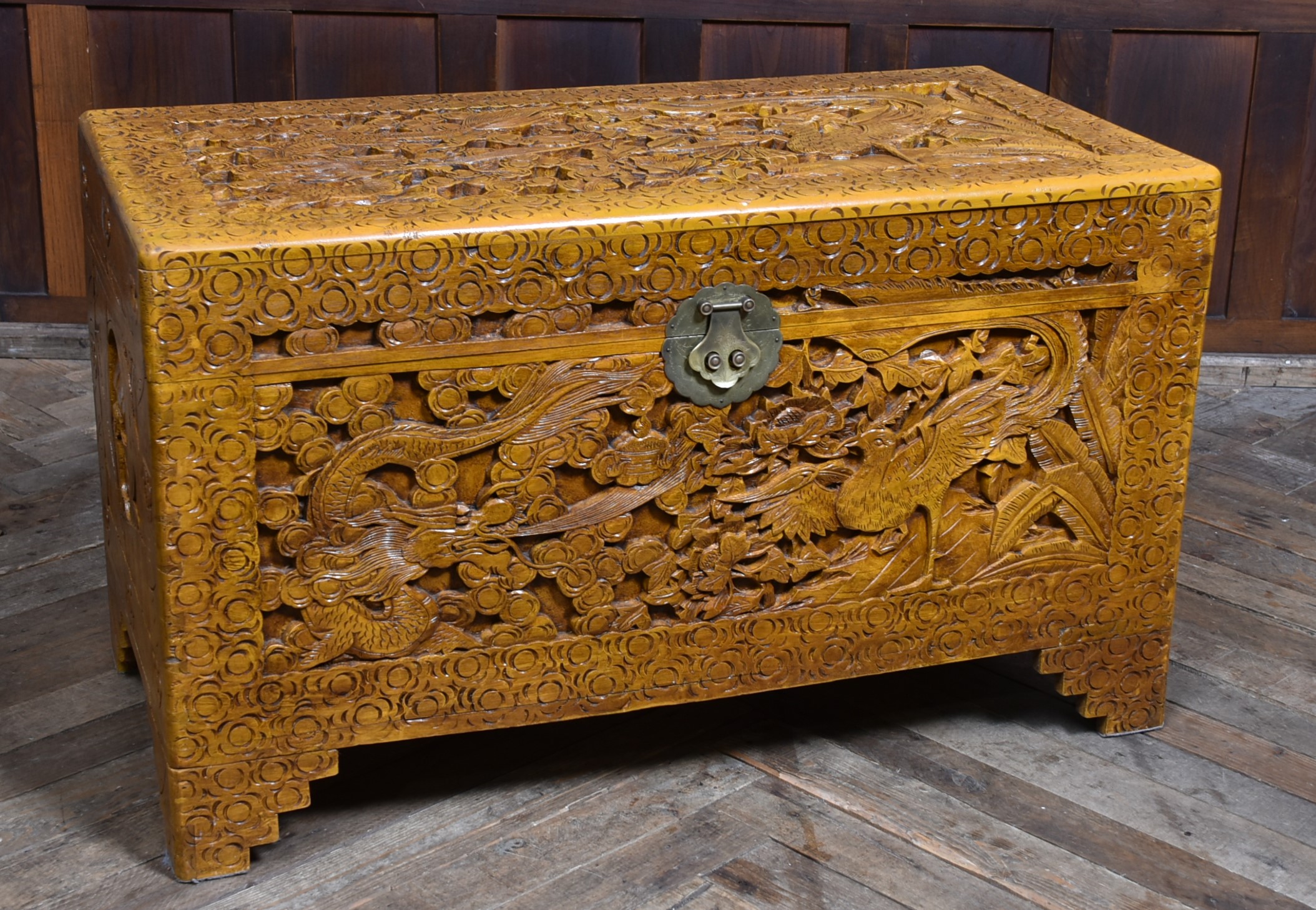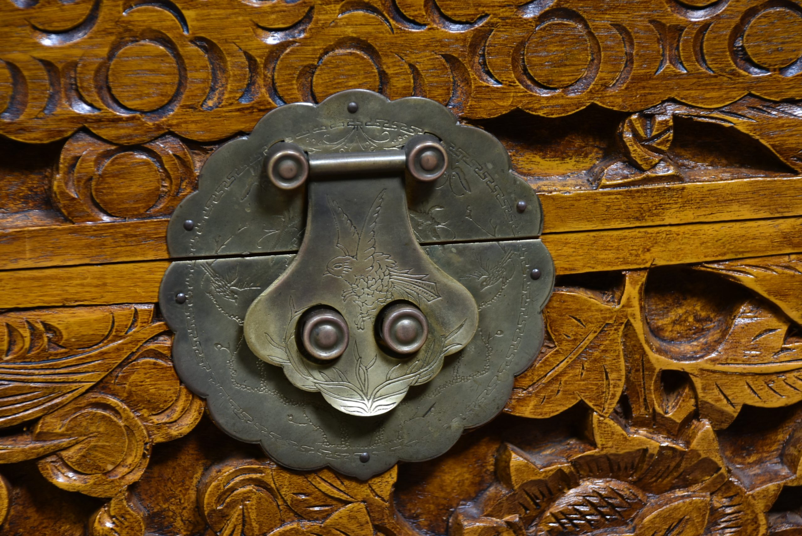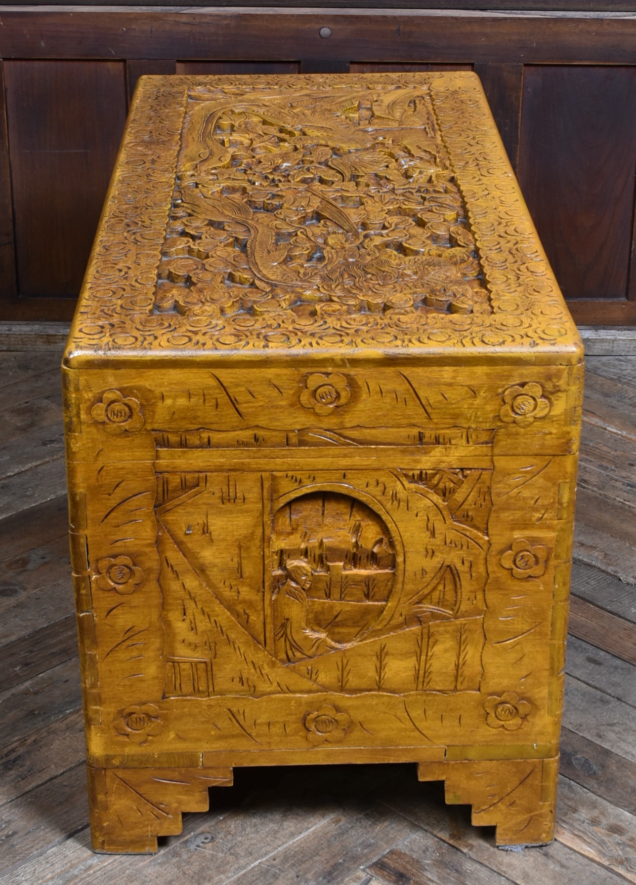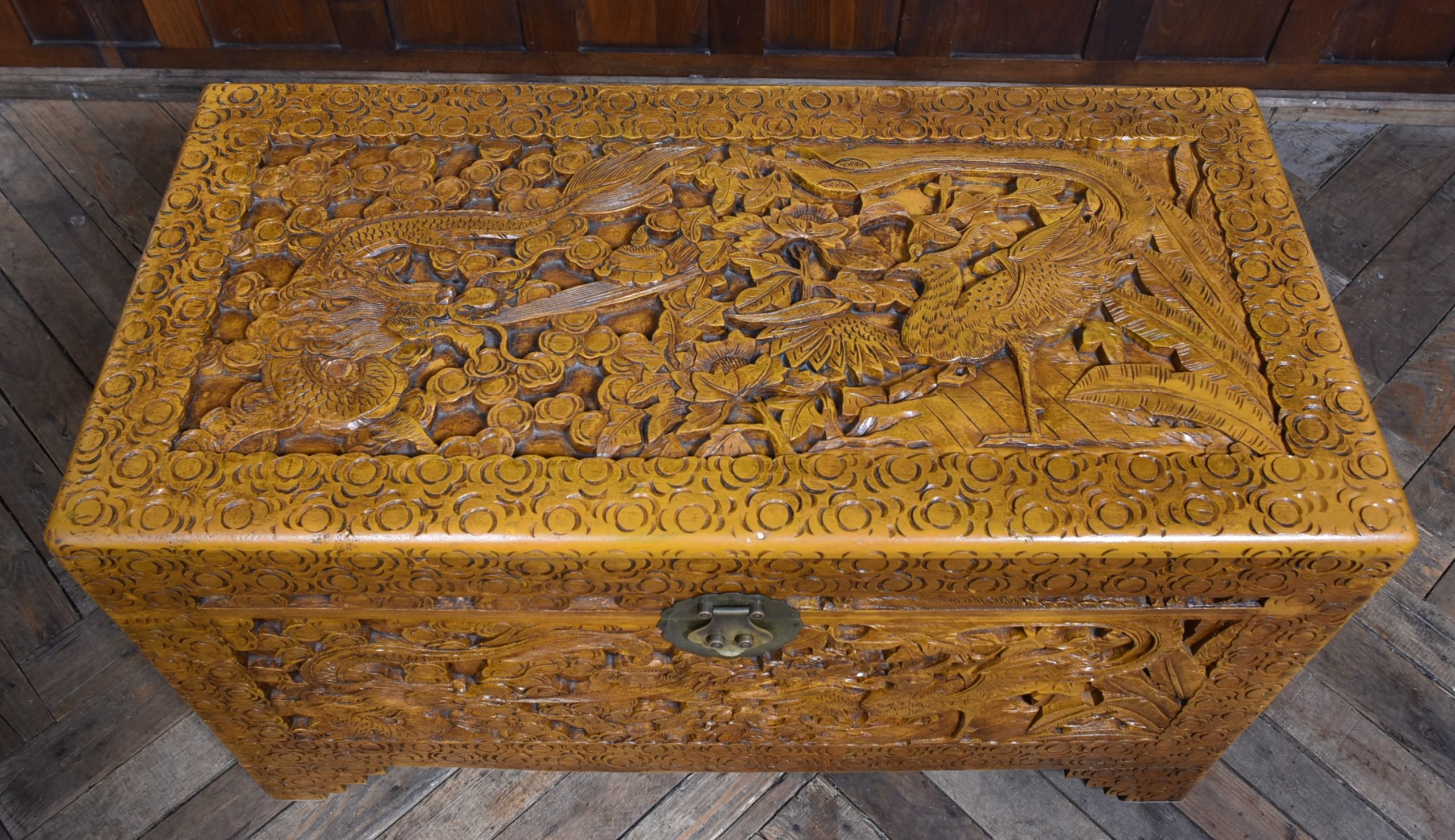 A fantastic Oriental camphor wood blanket or storage chest, intricately carved with dragons that dance across the front and top. The carvings extend to the sides and back, revealing exceptional depth and craftsmanship. Its warm, polished tone and decorative metal latch lend a sense of richness and refinement. Inside, the chest is clean and generously proportioned—perfect for storing blankets, pillows, or linens. Whether placed at the foot of a bed or repurposed as a coffee table, it offers both practical storage and striking decorative presence. A true statement piece, steeped in symbolism and timeless artistry.