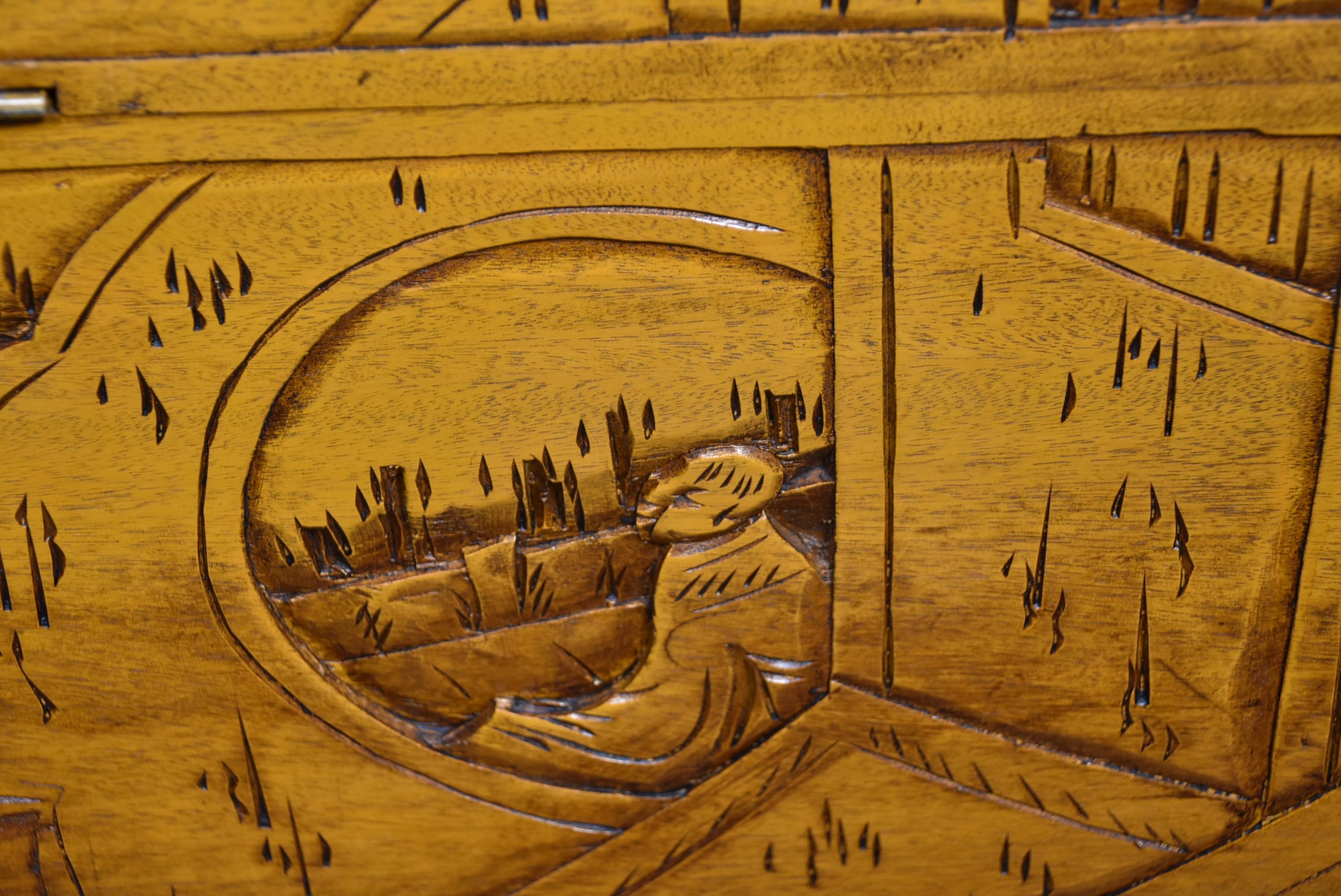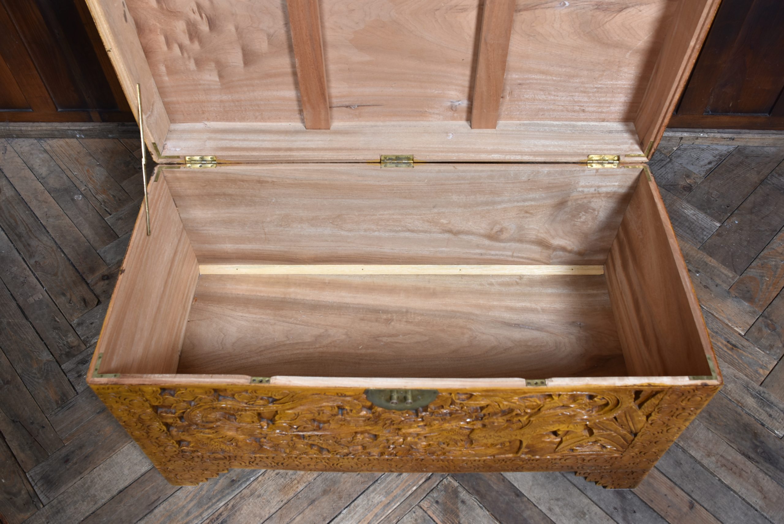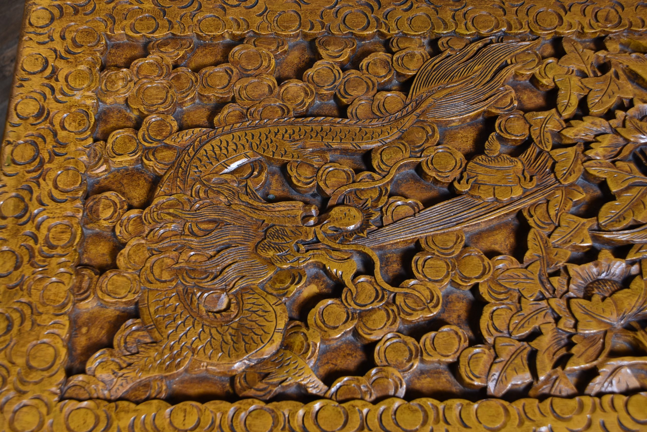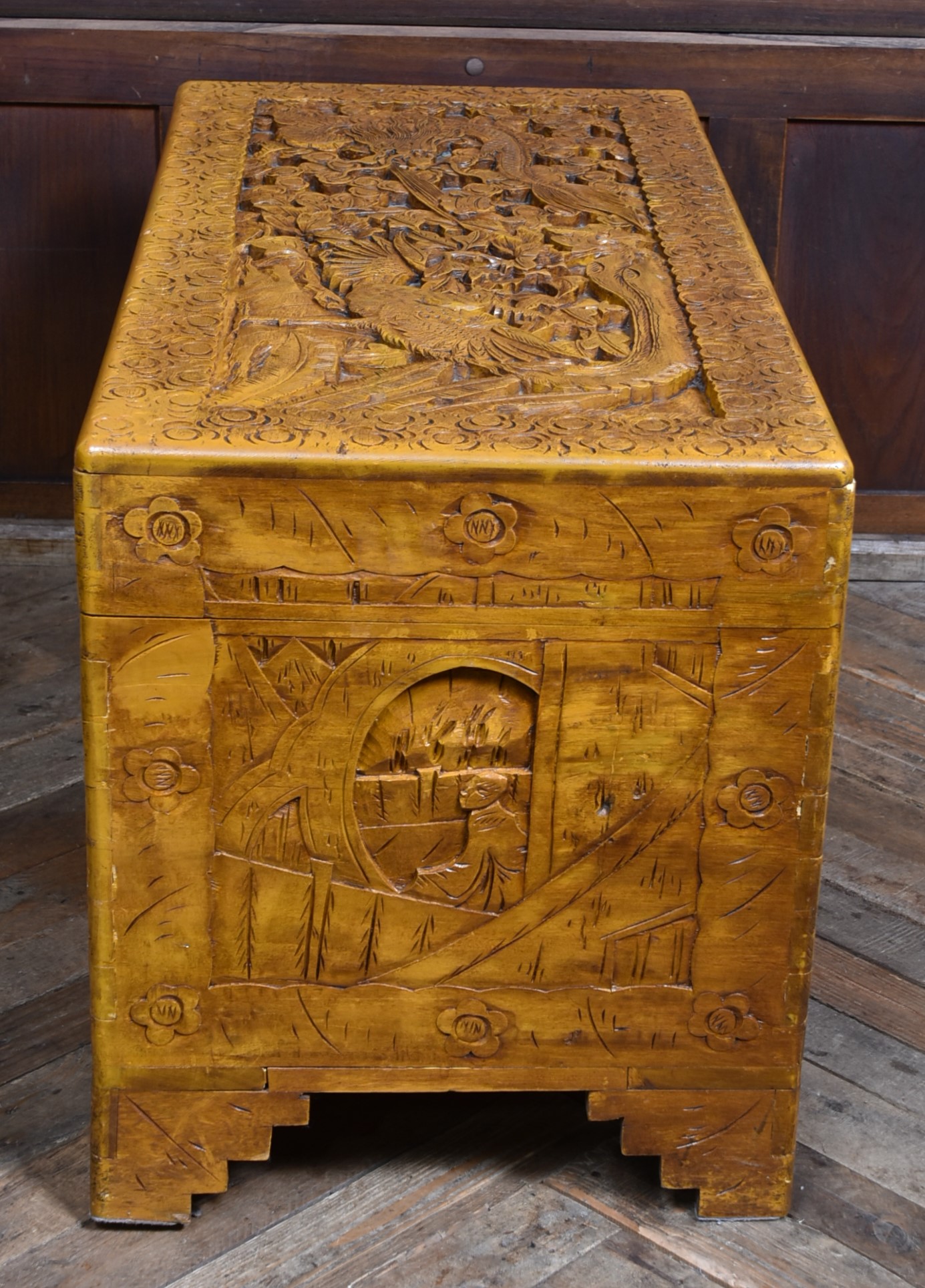 A fantastic Oriental camphor wood blanket or storage chest, intricately carved with dragons that dance across the front and top. The carvings extend to the sides and back, revealing exceptional depth and craftsmanship. Its warm, polished tone and decorative metal latch lend a sense of richness and refinement. Inside, the chest is clean and generously proportioned—perfect for storing blankets, pillows, or linens. Whether placed at the foot of a bed or repurposed as a coffee table, it offers both practical storage and striking decorative presence. A true statement piece, steeped in symbolism and timeless artistry.