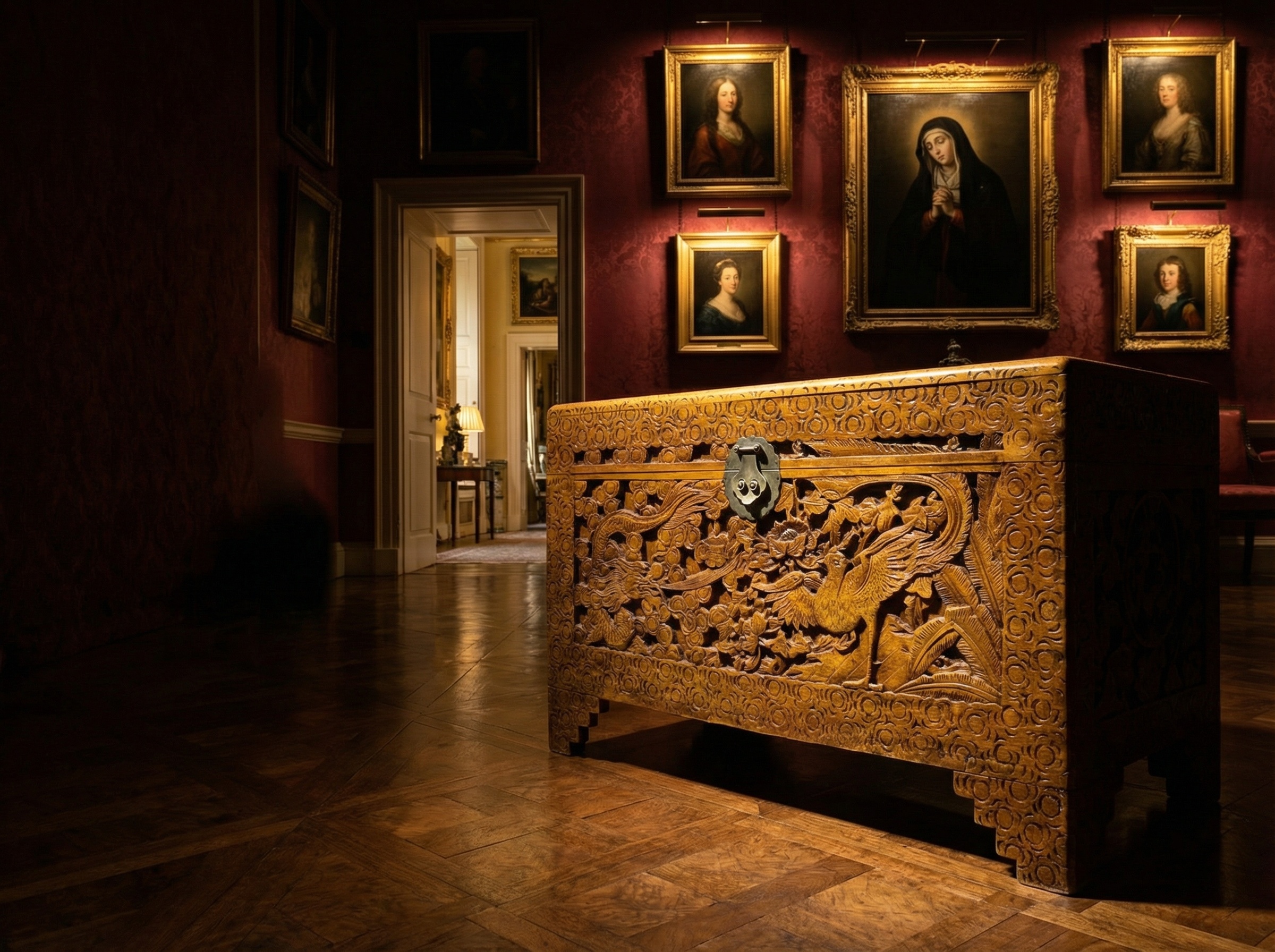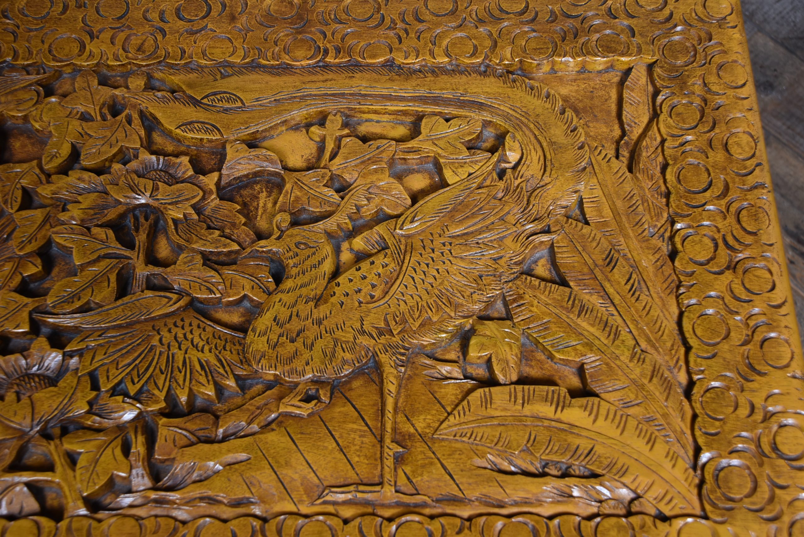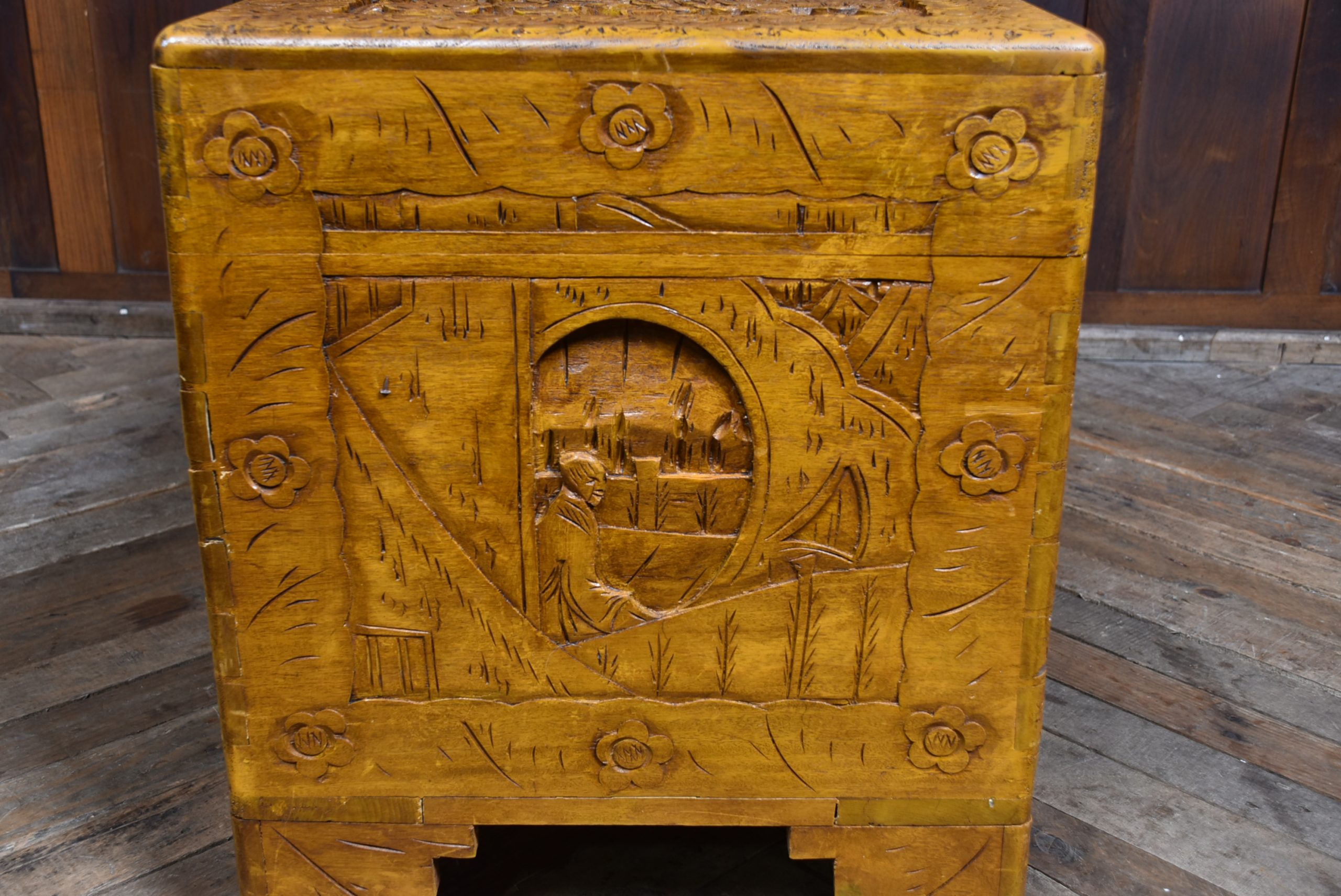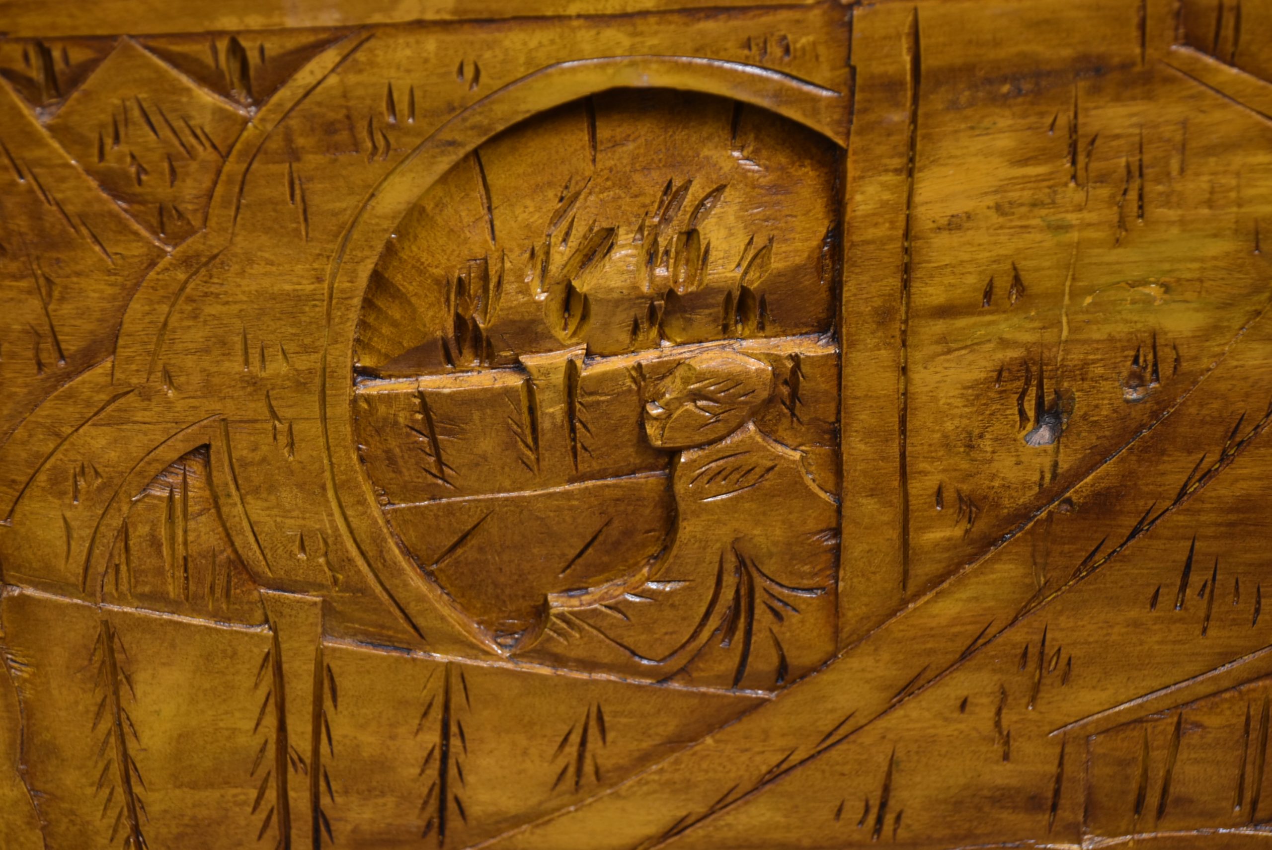 A fantastic Oriental camphor wood blanket or storage chest, intricately carved with dragons that dance across the front and top. The carvings extend to the sides and back, revealing exceptional depth and craftsmanship. Its warm, polished tone and decorative metal latch lend a sense of richness and refinement. Inside, the chest is clean and generously proportioned—perfect for storing blankets, pillows, or linens. Whether placed at the foot of a bed or repurposed as a coffee table, it offers both practical storage and striking decorative presence. A true statement piece, steeped in symbolism and timeless artistry.