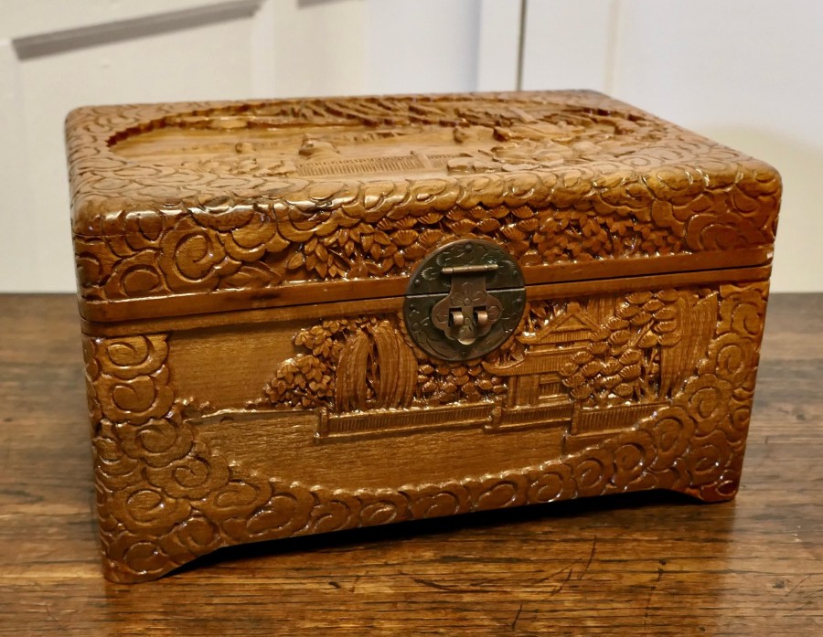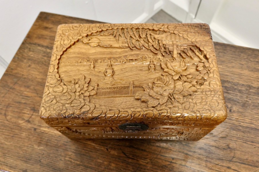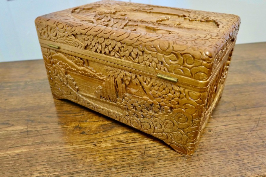 Oriental carved camphor wood chest, jewellery casket. This beautiful carved chest is made from camphor wood, for those of you who do not know camphor wood it is a hard wood which lends itself very well to carving and it has an excellent fragrance. The carvings are mainly of ships, trees and flowers, the chest is carved on every side, and has brass clasp on the front. The chest is in good condition, it is 6.5” high, 12” long and 8” deep. CC148 Manufacture Date : 1950 Materials : Wood