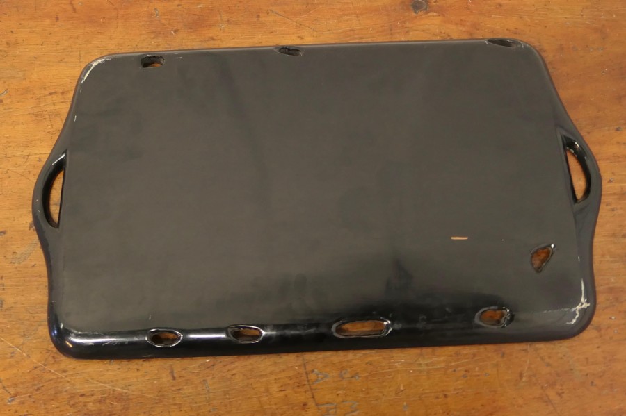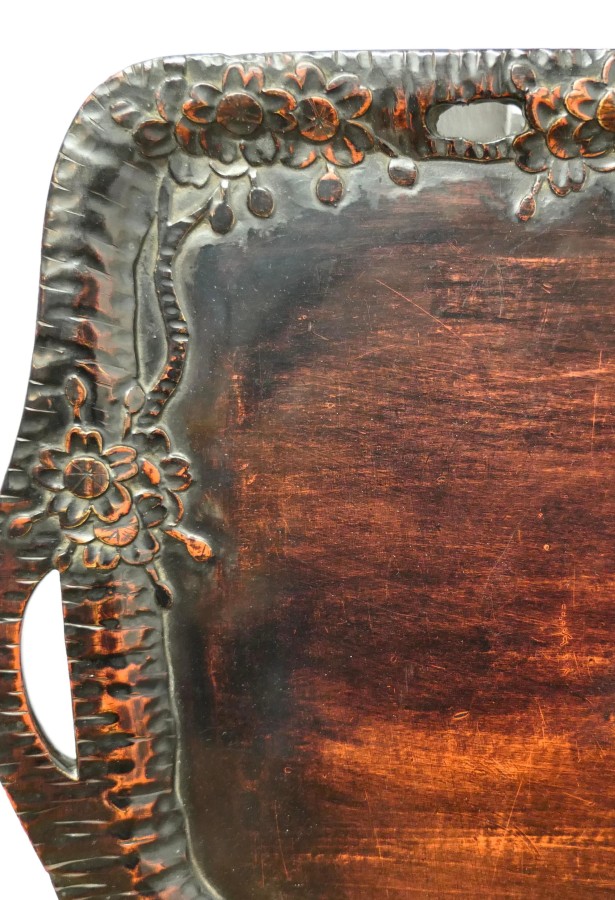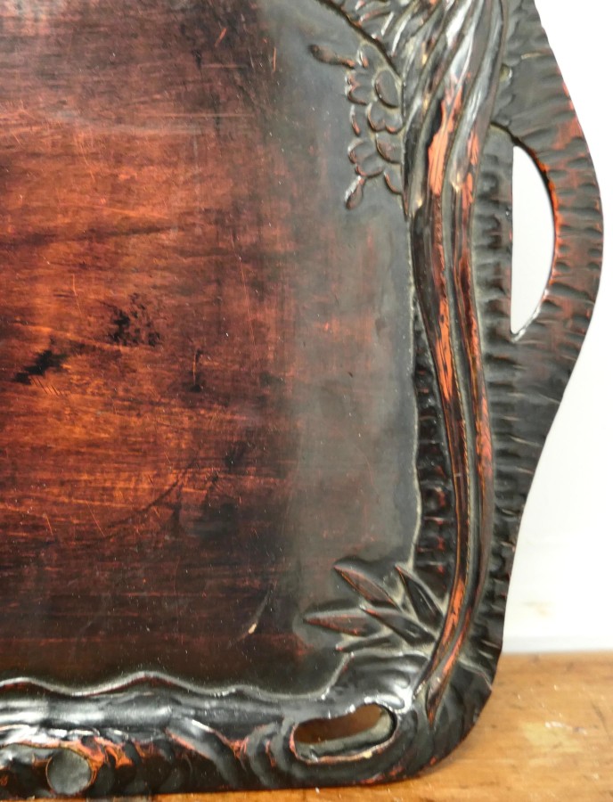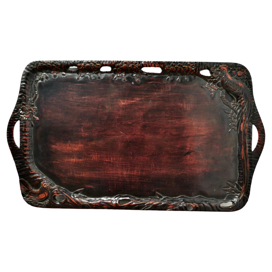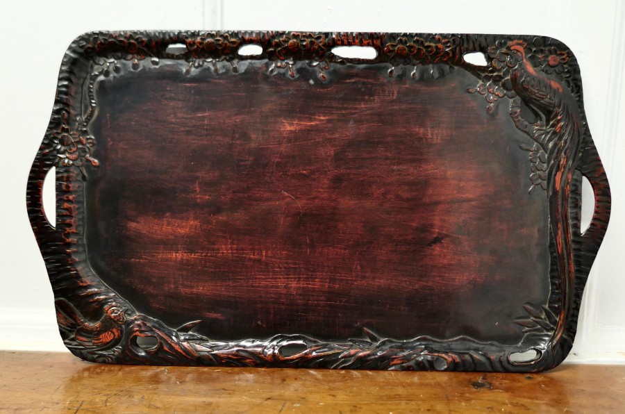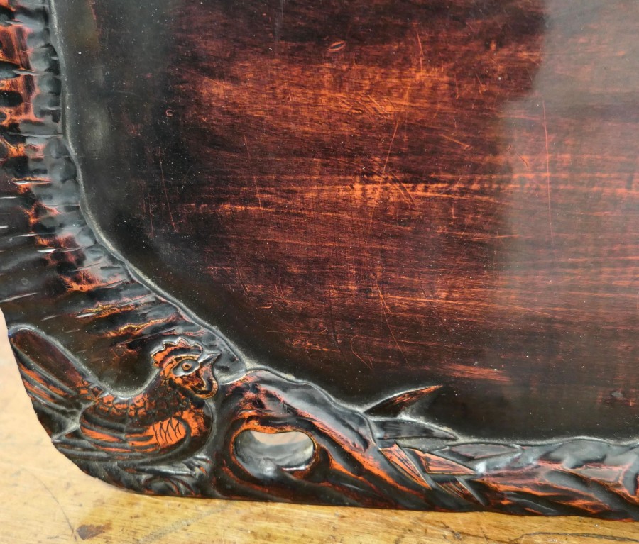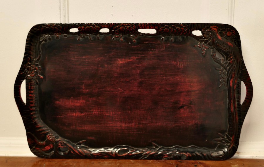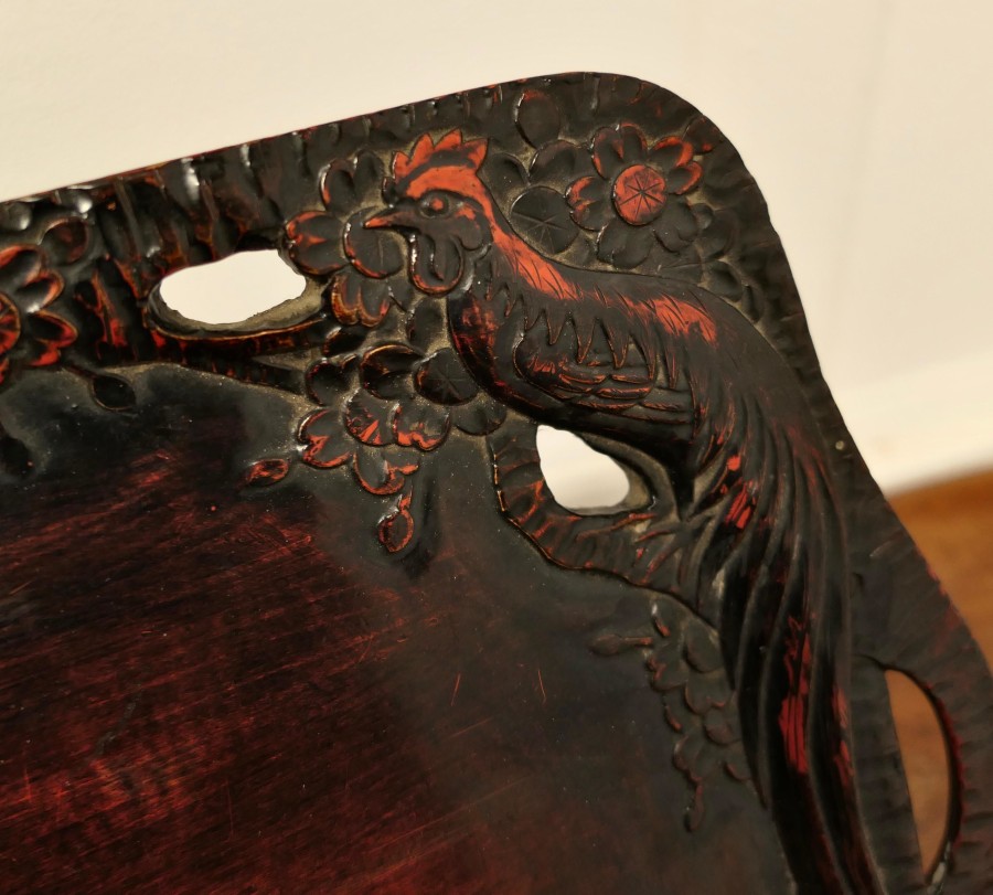 Oriental Folk Art Carved Red Lacquer Tray Decorated with Cockerels This is a superb piece of hand carving, the edge of the tray is in the form of a cockerels with their tails entwined all the way around A superb piece in Black and Red lacquer with hand hold openings at each end The tray is 1” high, and is 12” x 14” in a rectangular shape SW197 Manufacture Date : 1920 Materials : Lacquer