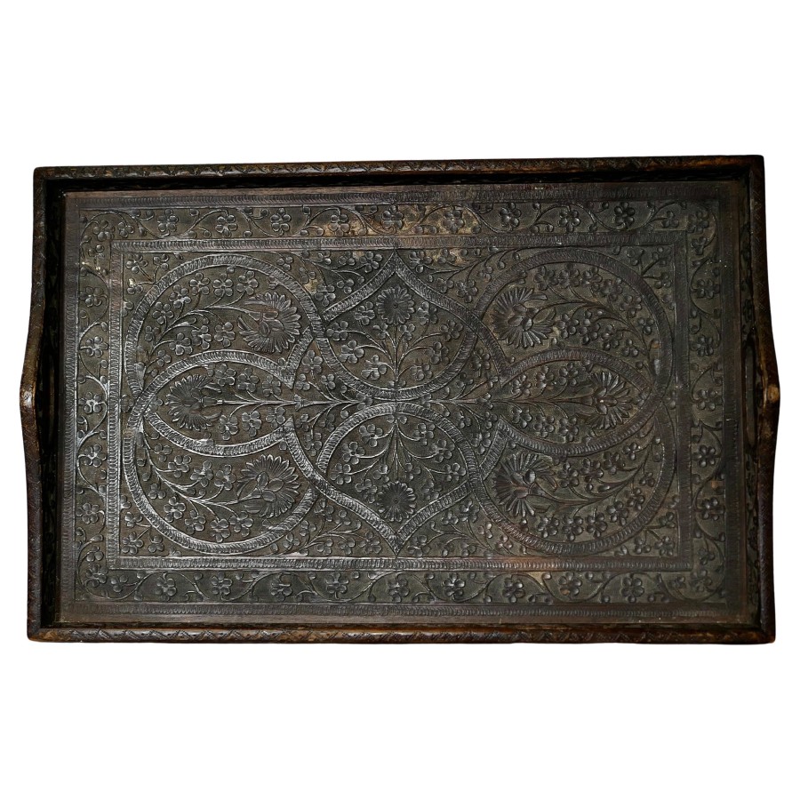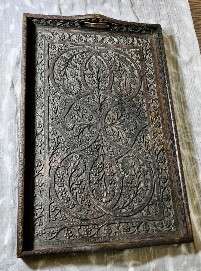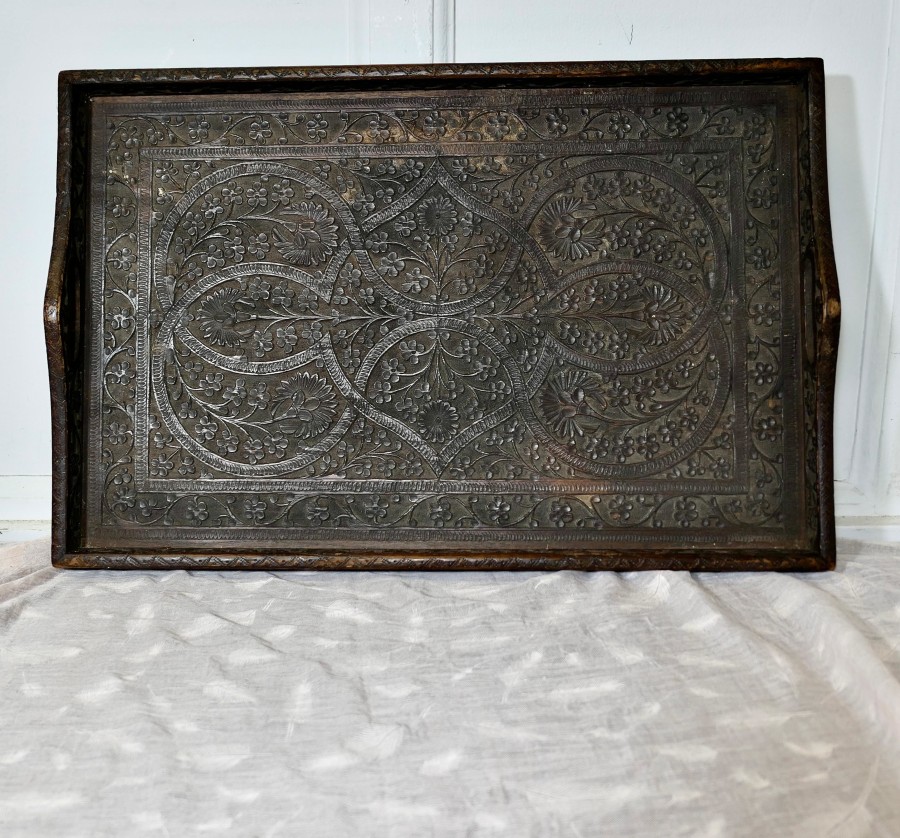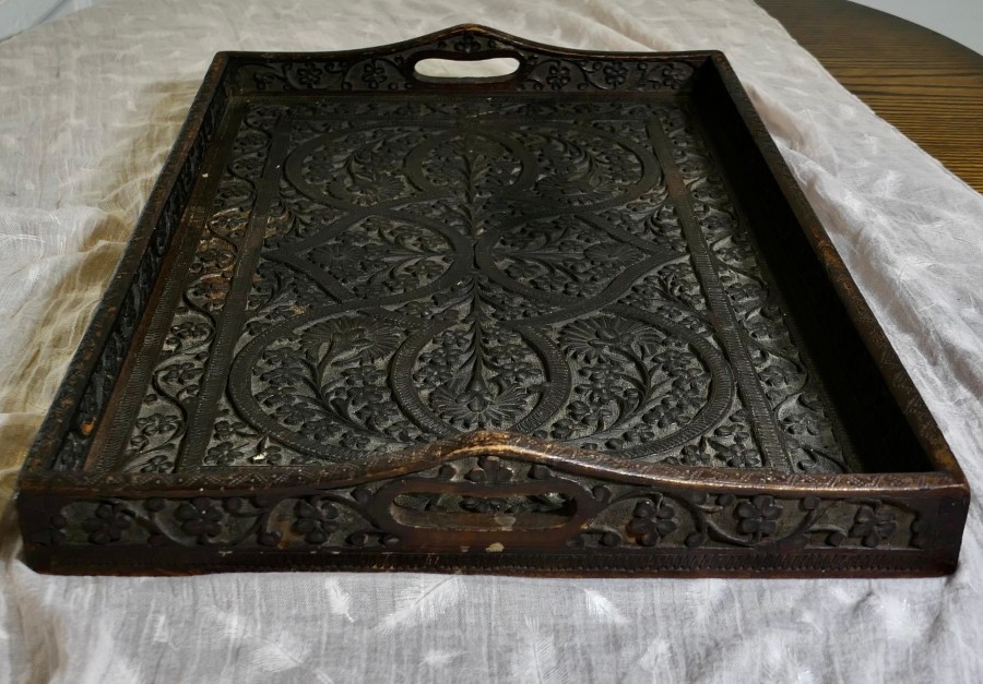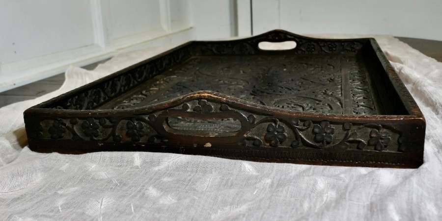 Oriental Folk Art Carved Tray This is a skilfully hand carved piece, the base, the sides and the edges (which form the handles) are all carved with flowers and leaves A superb piece which needs to be viewed from all sides to see its true charm The tray is 2.5” high, and is 23” x 15” CS97 Manufacture Date : 1900 Materials : Padouk
