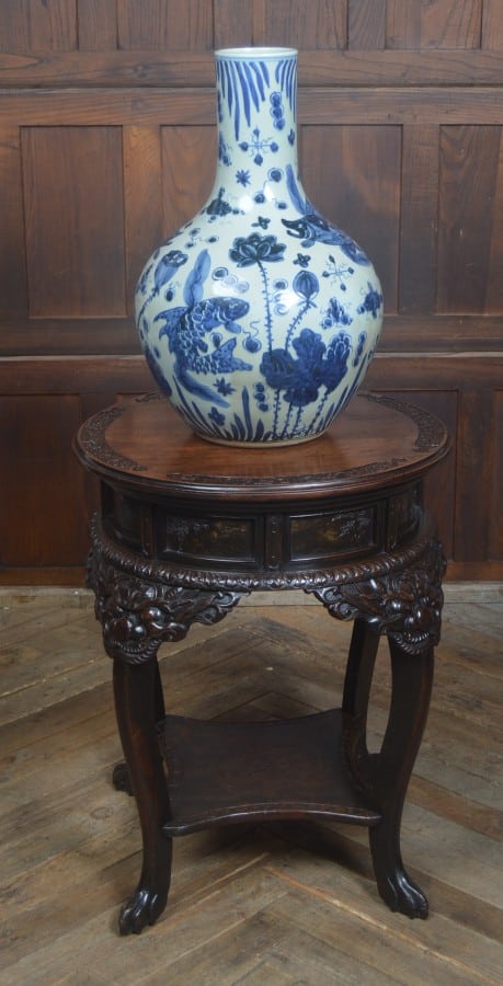 Fantastic oriental jardinière stand made from solid mahogany in excellent sturdy condition. The top is carved around the edge with carved panels in the freeze. The legs have carved masks to the top and carved claw feet united by a shaped lower tier. Like all antique furniture there are some imperfections however these only add to the character and charm of this gorgeous stand.