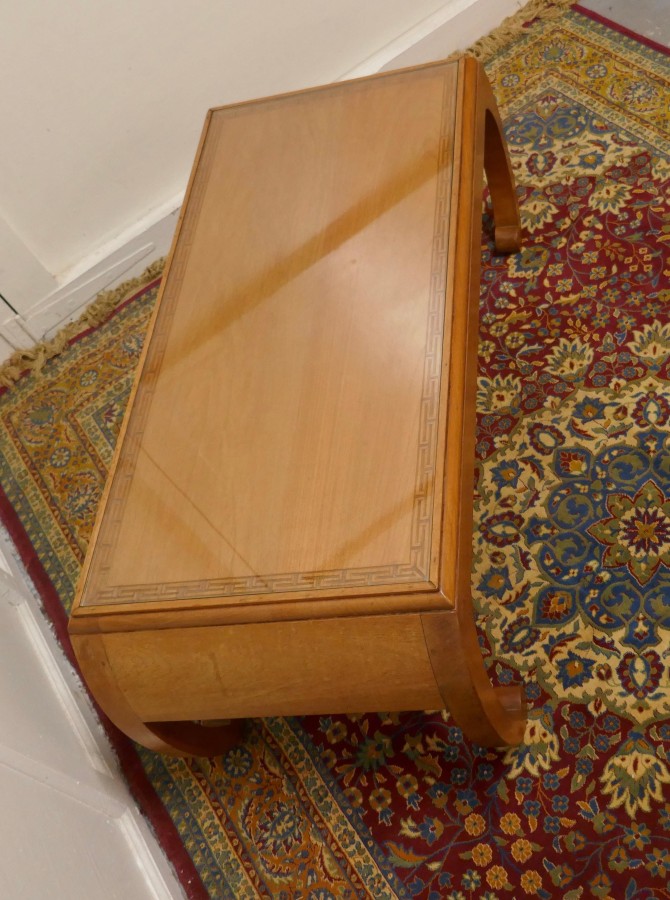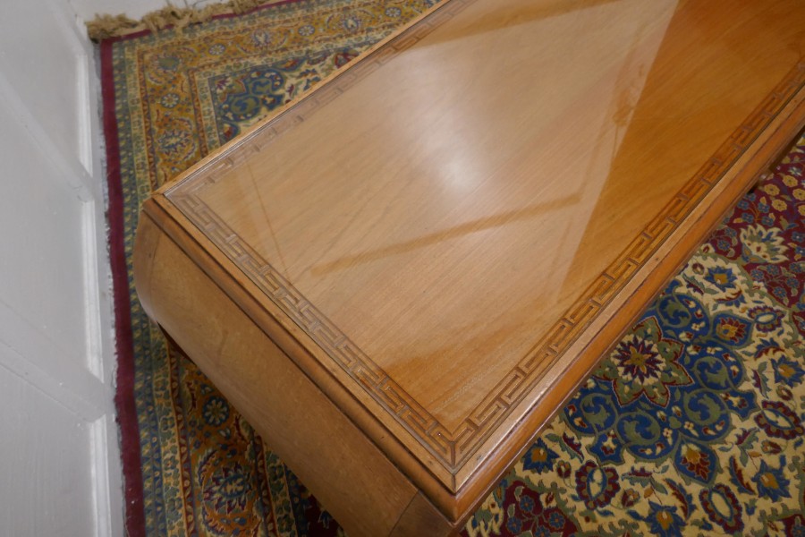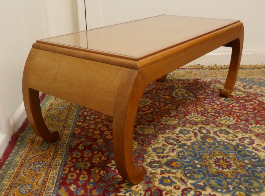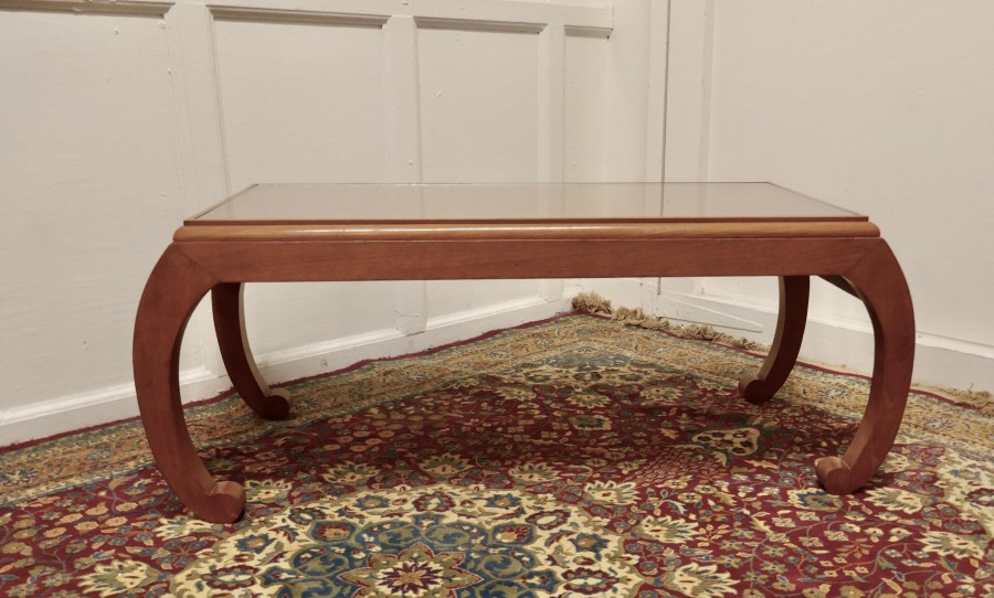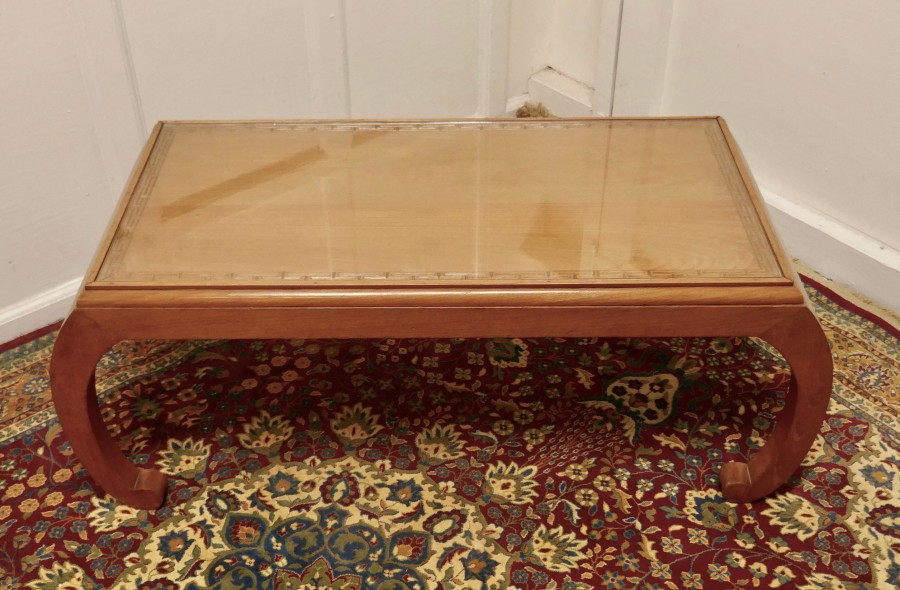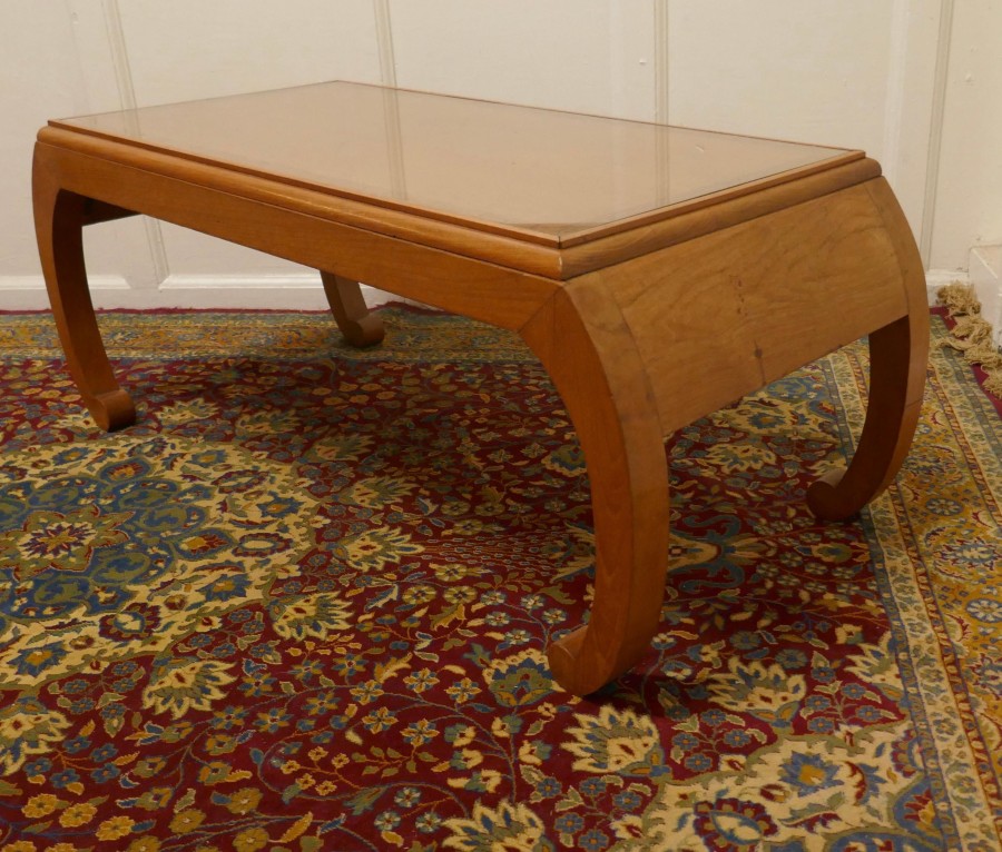 Oriental Satin walnut low table, coffee table This is a very attractive piece, the table is in the style of an opium table, it has a carved border beneath the plate glass top The table has an inset plate glass top which protects the the top when in use The table has curled legs, it is sound with a good patina, it would work well as either a coffee or as a floor seated dining table Measures: The table is 41” long, 18” deep and 16” high NV322. Manufacture Date : 1920 Materials : Satinwood