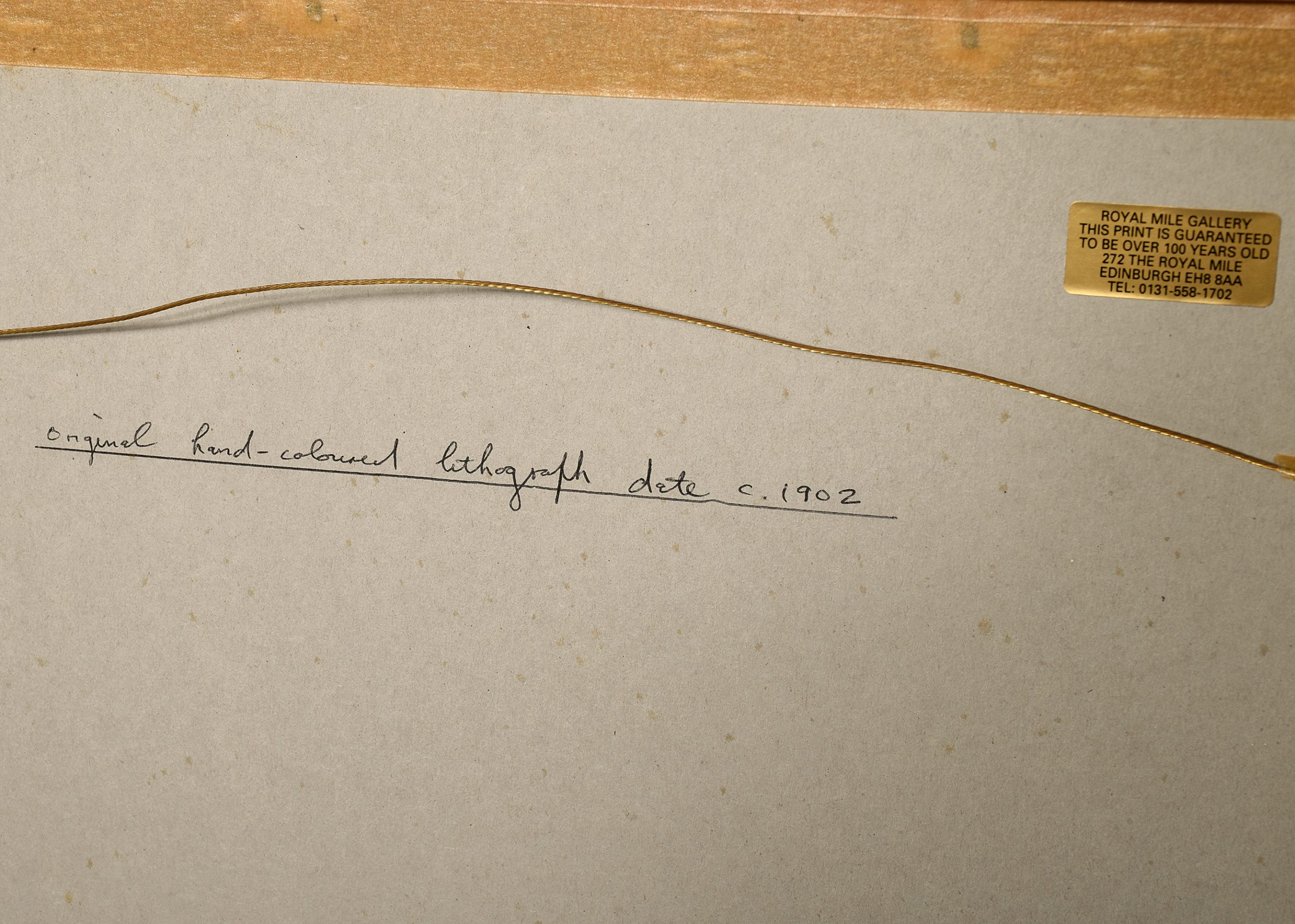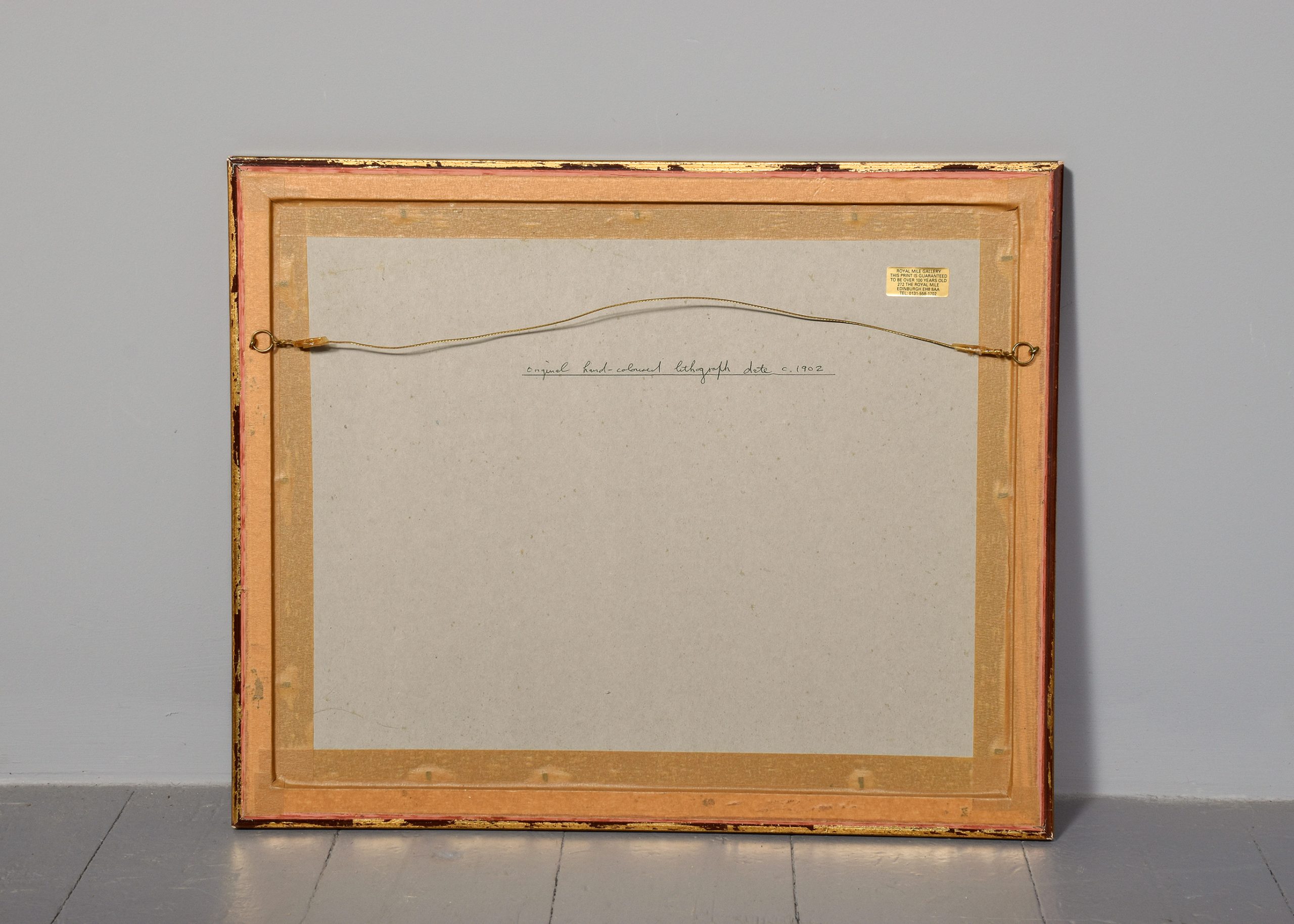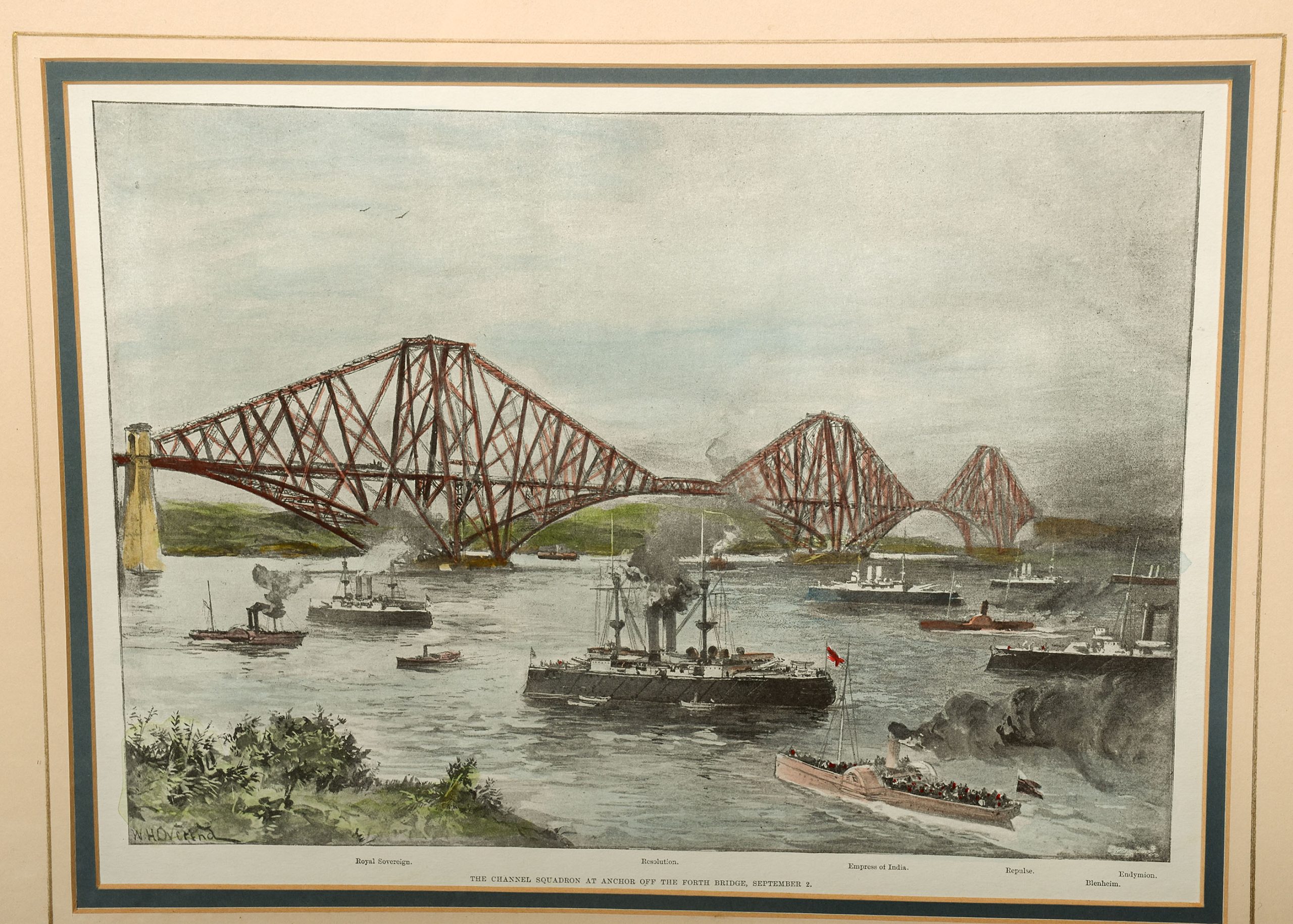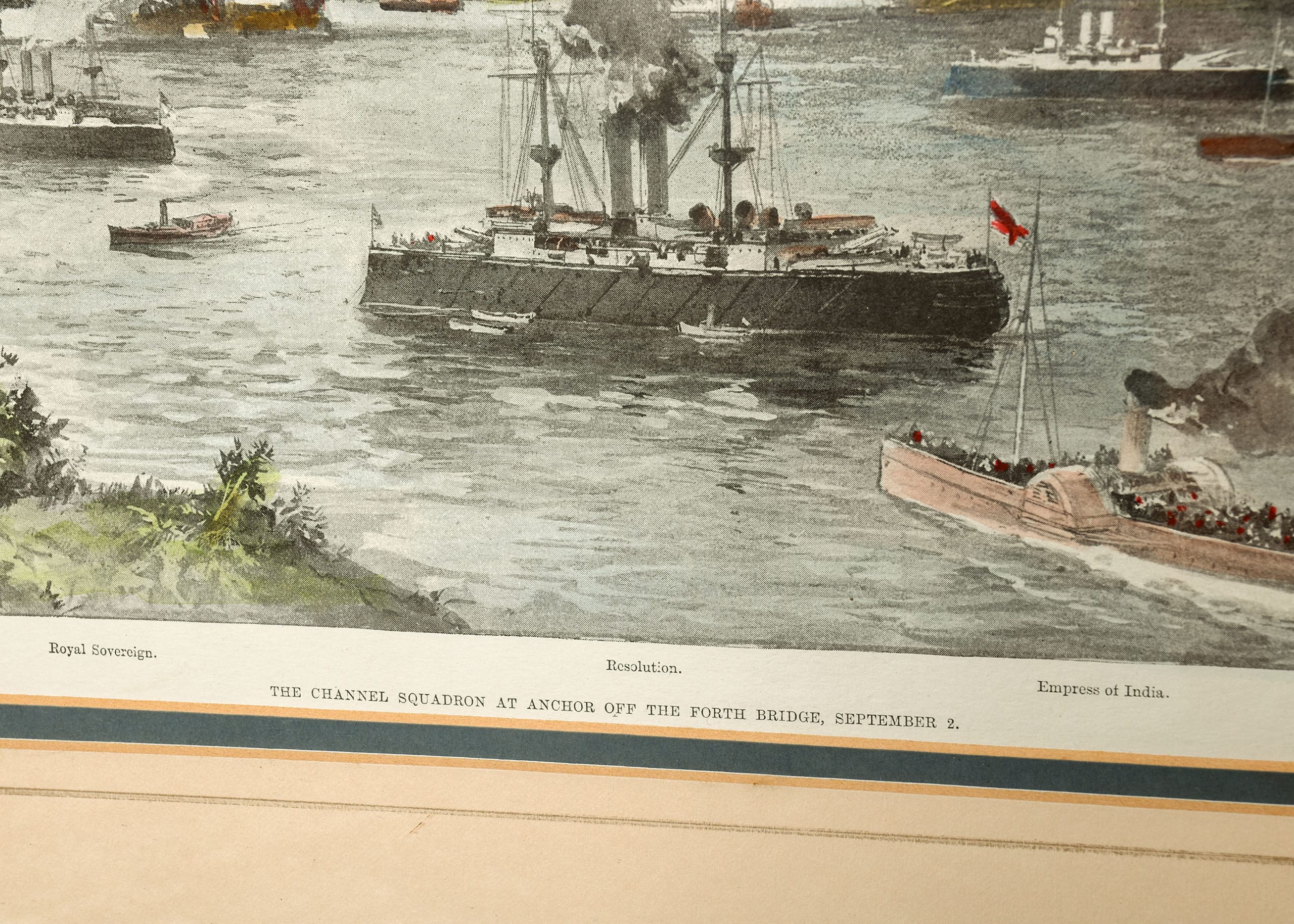 An original hand coloured lithograph dated 1902, showing The Channel Squadron at anchor off the Forth Bridge, September 2nd. Ships include the Royal Sovereign, Revolution, Empress of India, Blenheim and Repulse. Gilt-framed and in excellent condition.