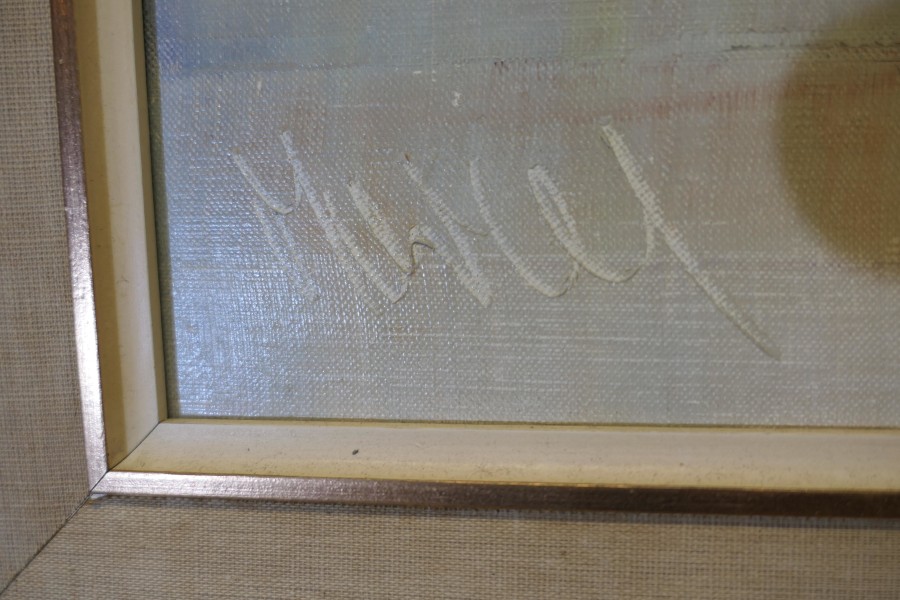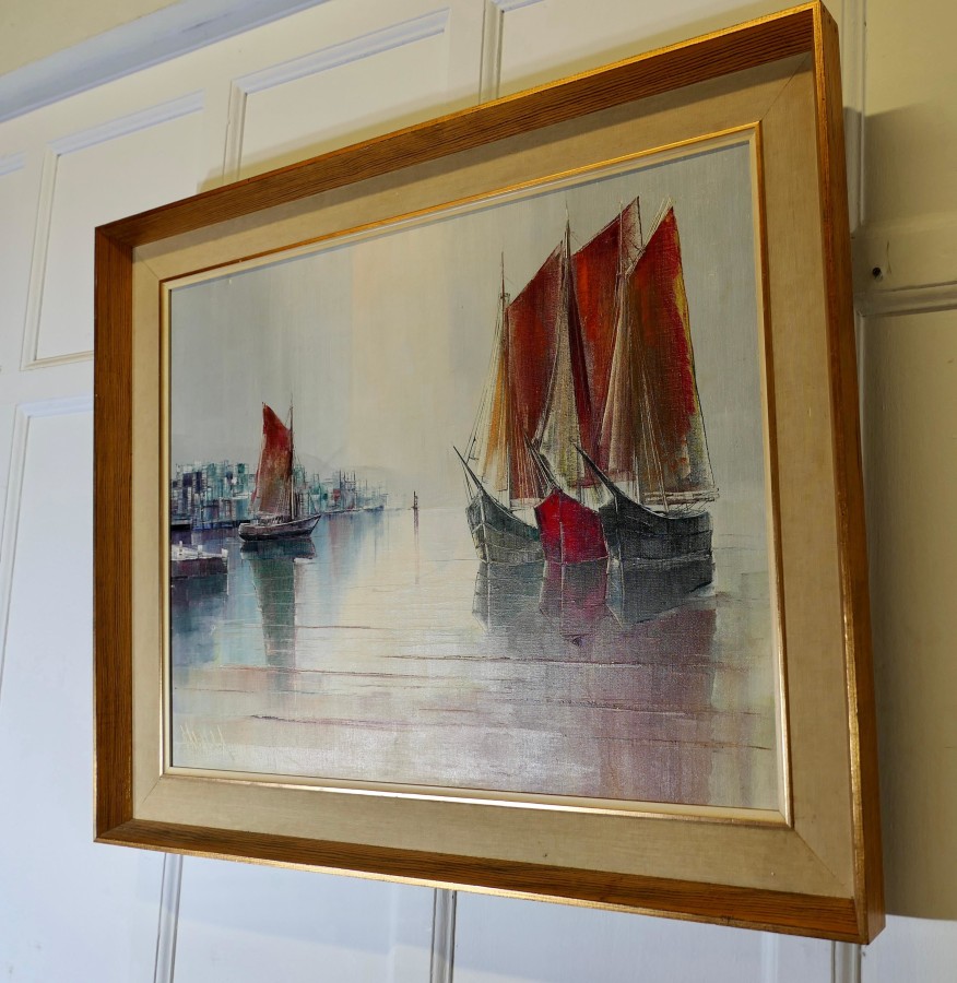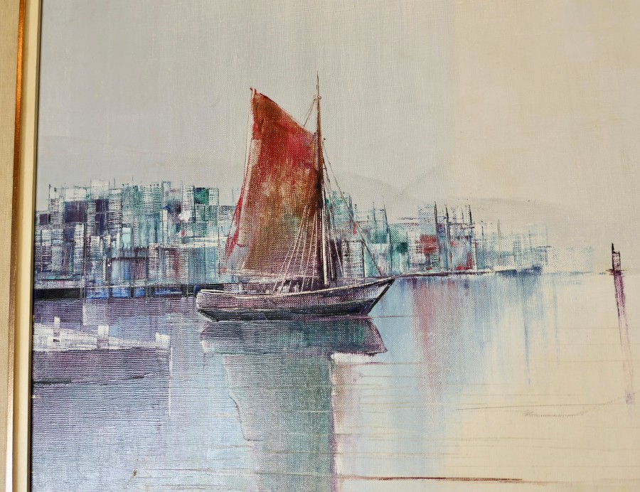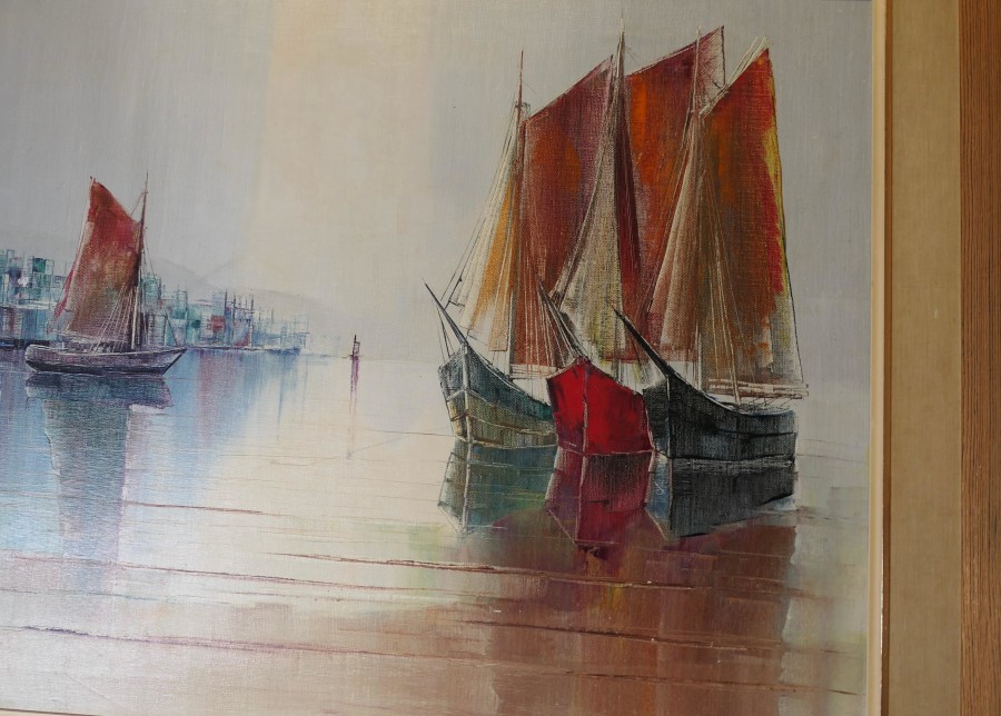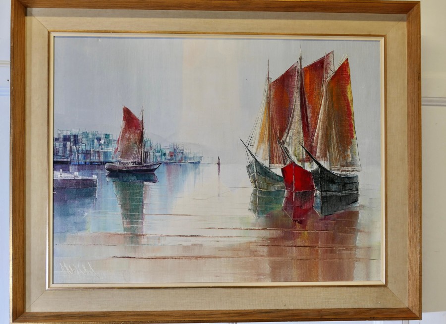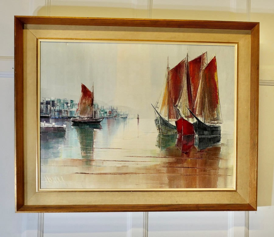 Original Signed Yachts in Harbour Oil Painting A desirable original decorative Oil on Canvas painting of Large Yachts and pewter signed “Muriel”, this is an oil painting on canvas, a very attractive piece from the 1960s The painting is in its original linen mount and frame 30” high and 38 ” wide ZX328 Manufacture Date : 1970 Materials : Canvas