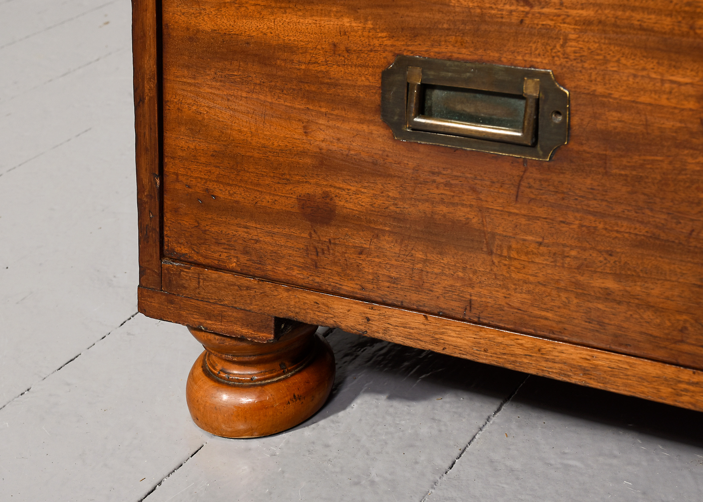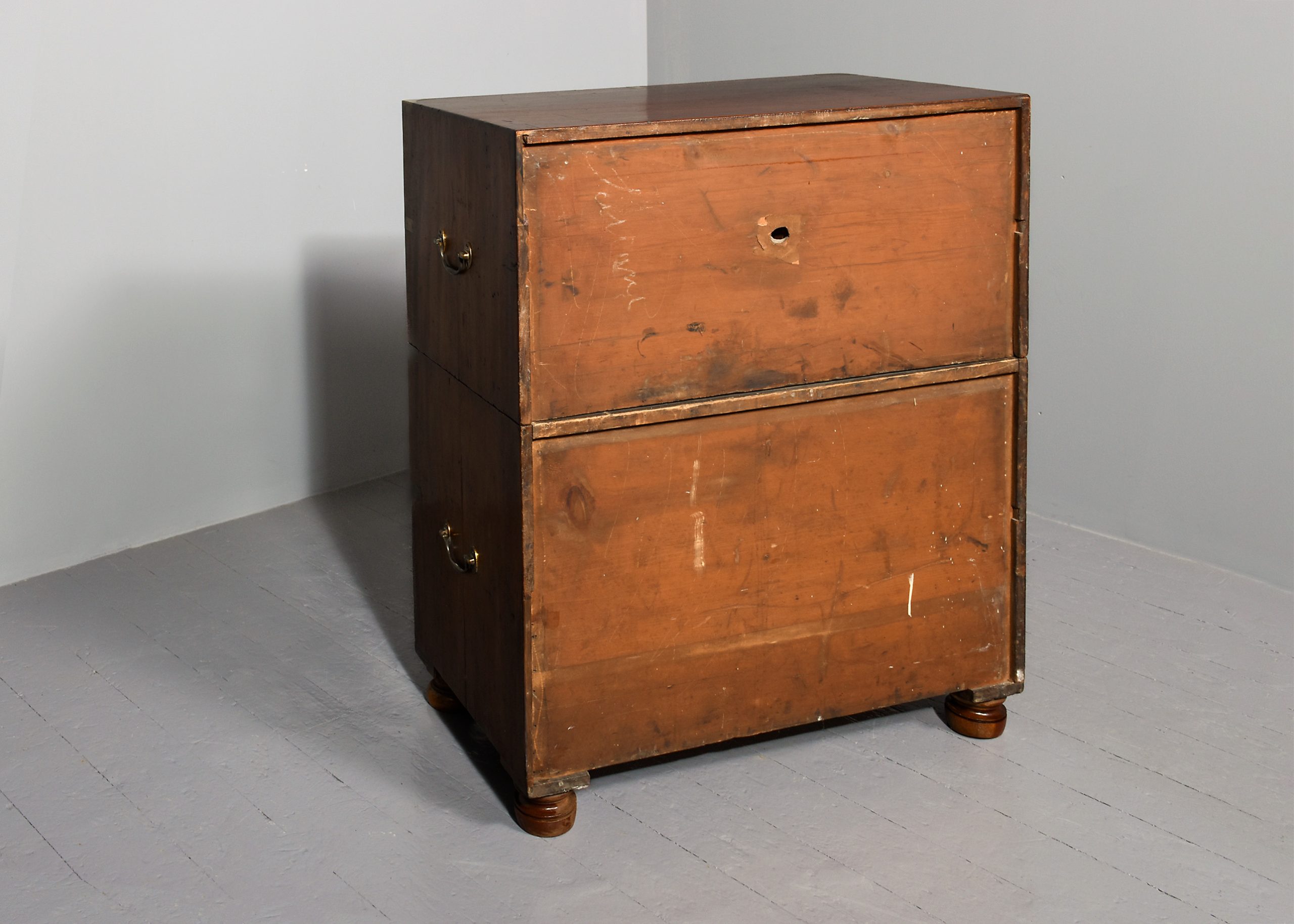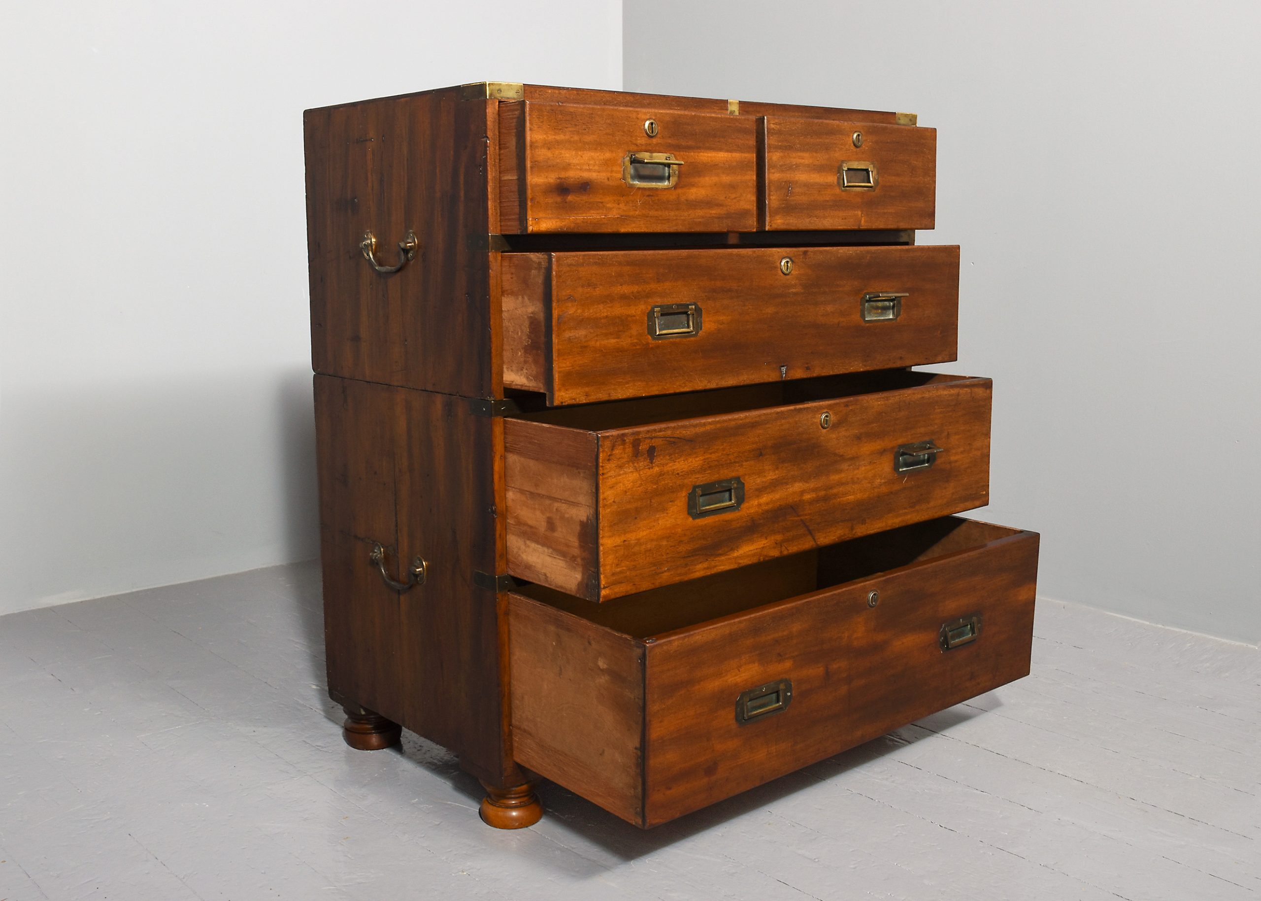 Circa 1850. Original Victorian mahogany two-part military chest fully traditionally restored. The top with a nice mellow colour and excellent patina with brass corners and brass strapping. With two short and one long drawer in the upper section with inset military handles and original brass locks. The base with two matching longer drawers and all on bun feet with brass carrying handles to the sides.