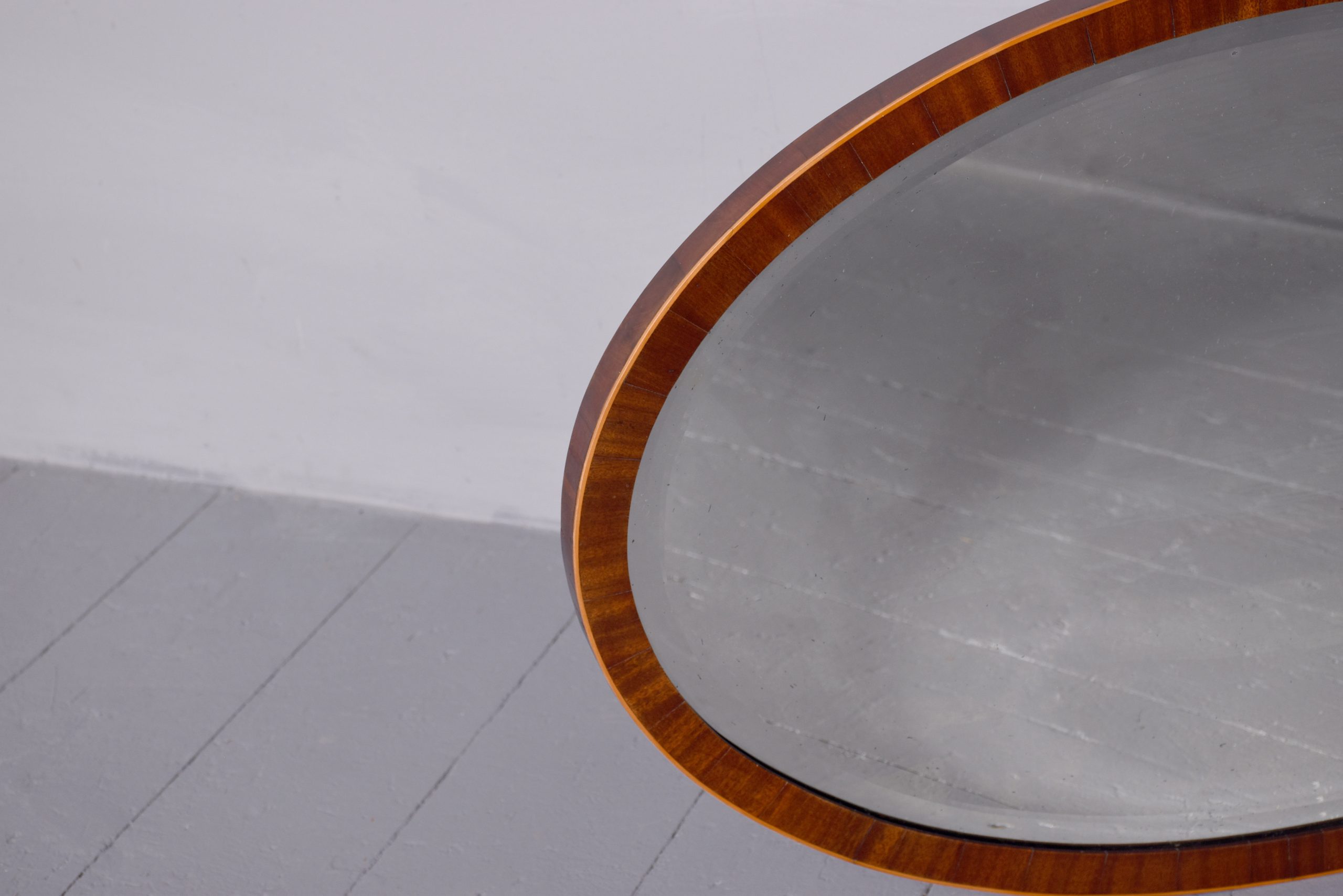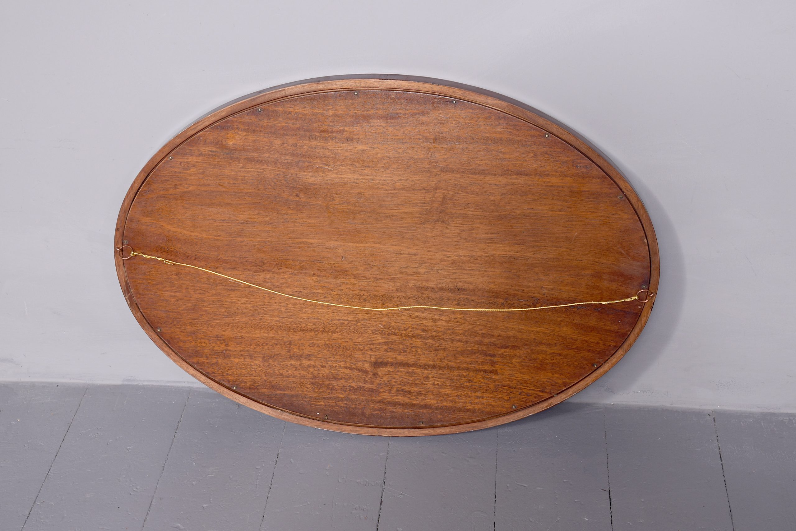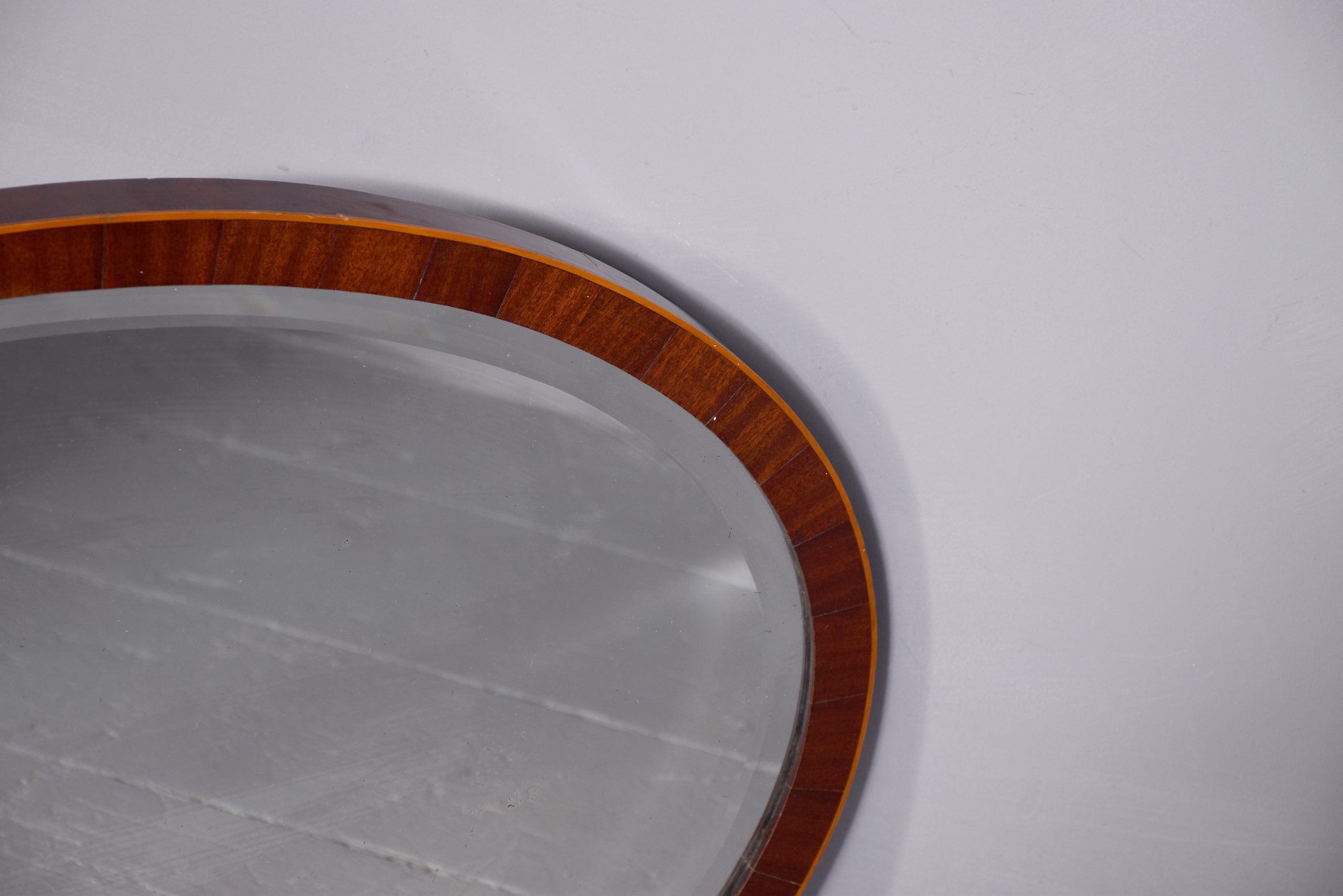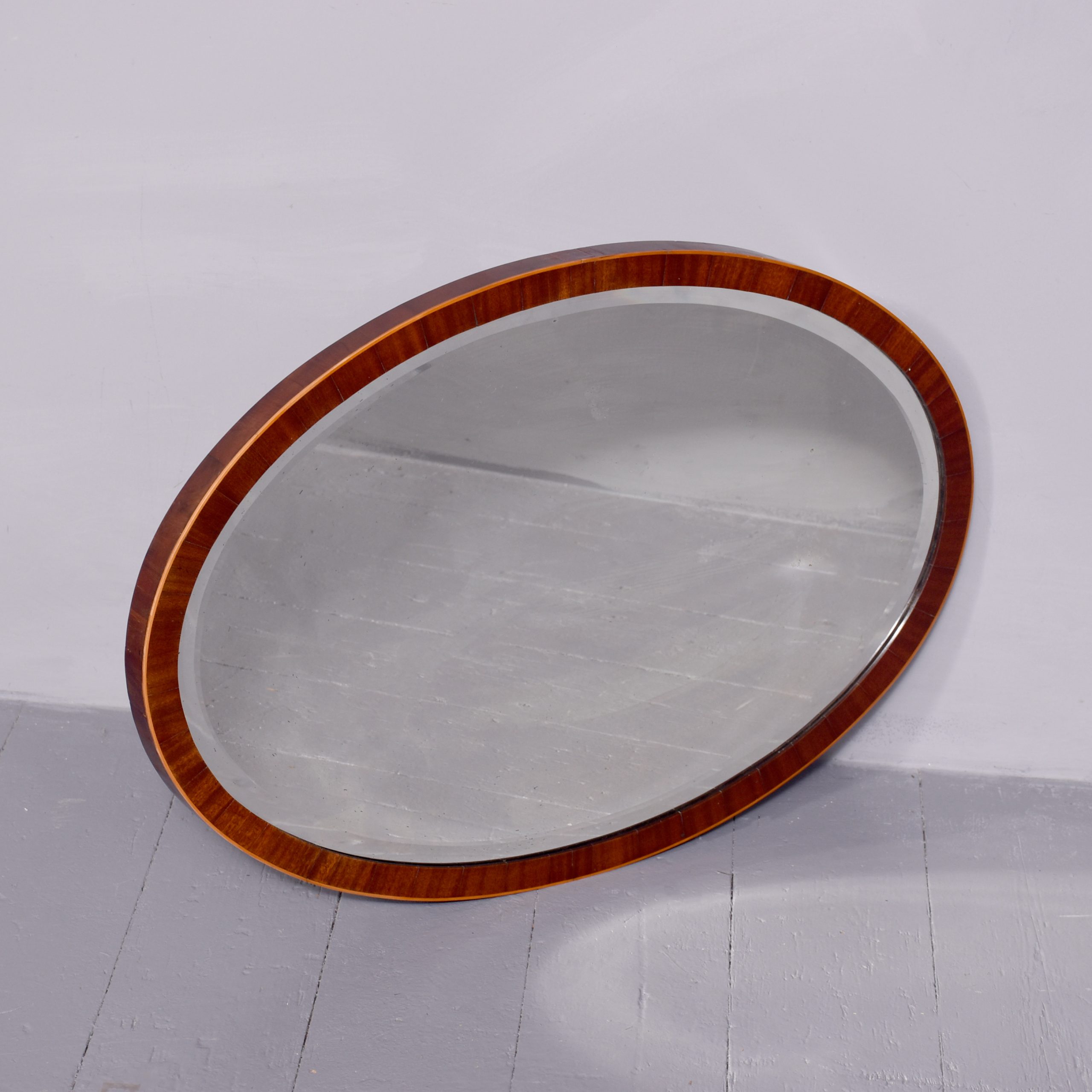 Circa 1900. An inlaid mahogany Sheraton style over wall mirror, the mahogany frame with boxwood string inlay to the fore-edge, retaining its original bevel edged mirror and polished sides and back. Can be hung either landscape or portrait.