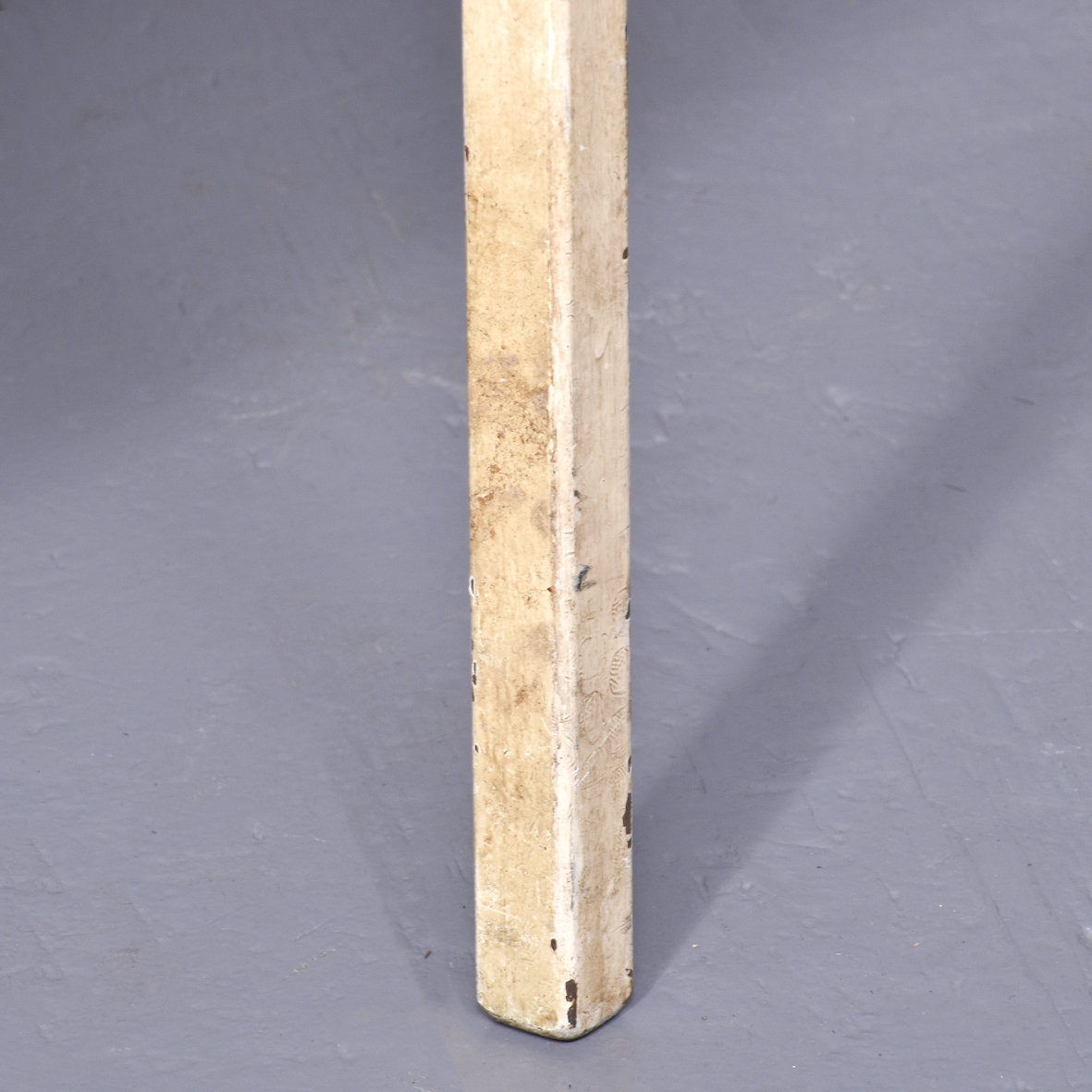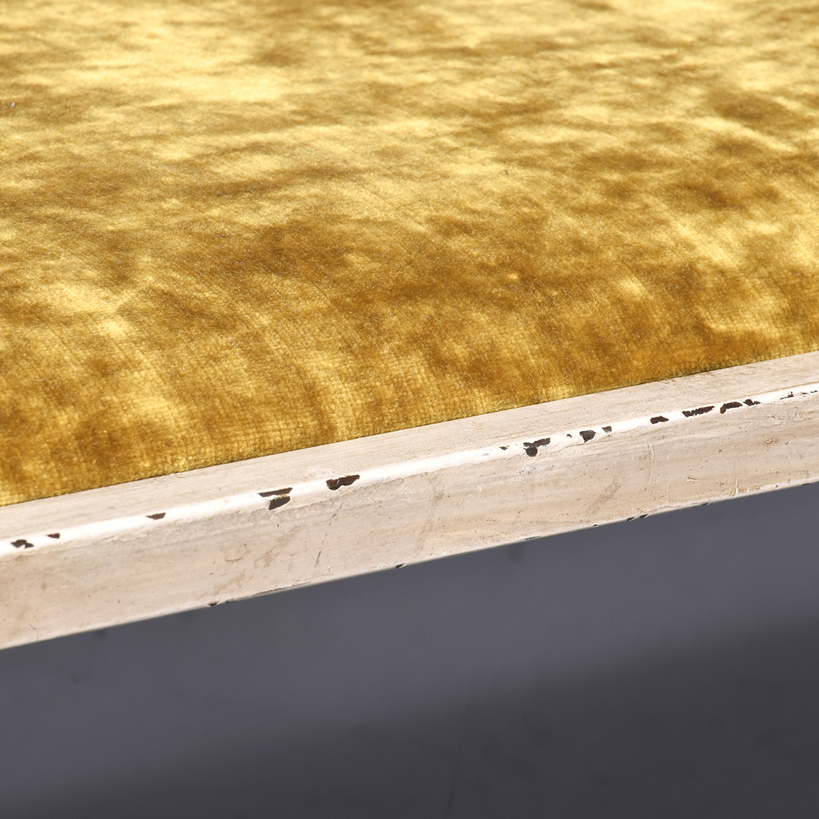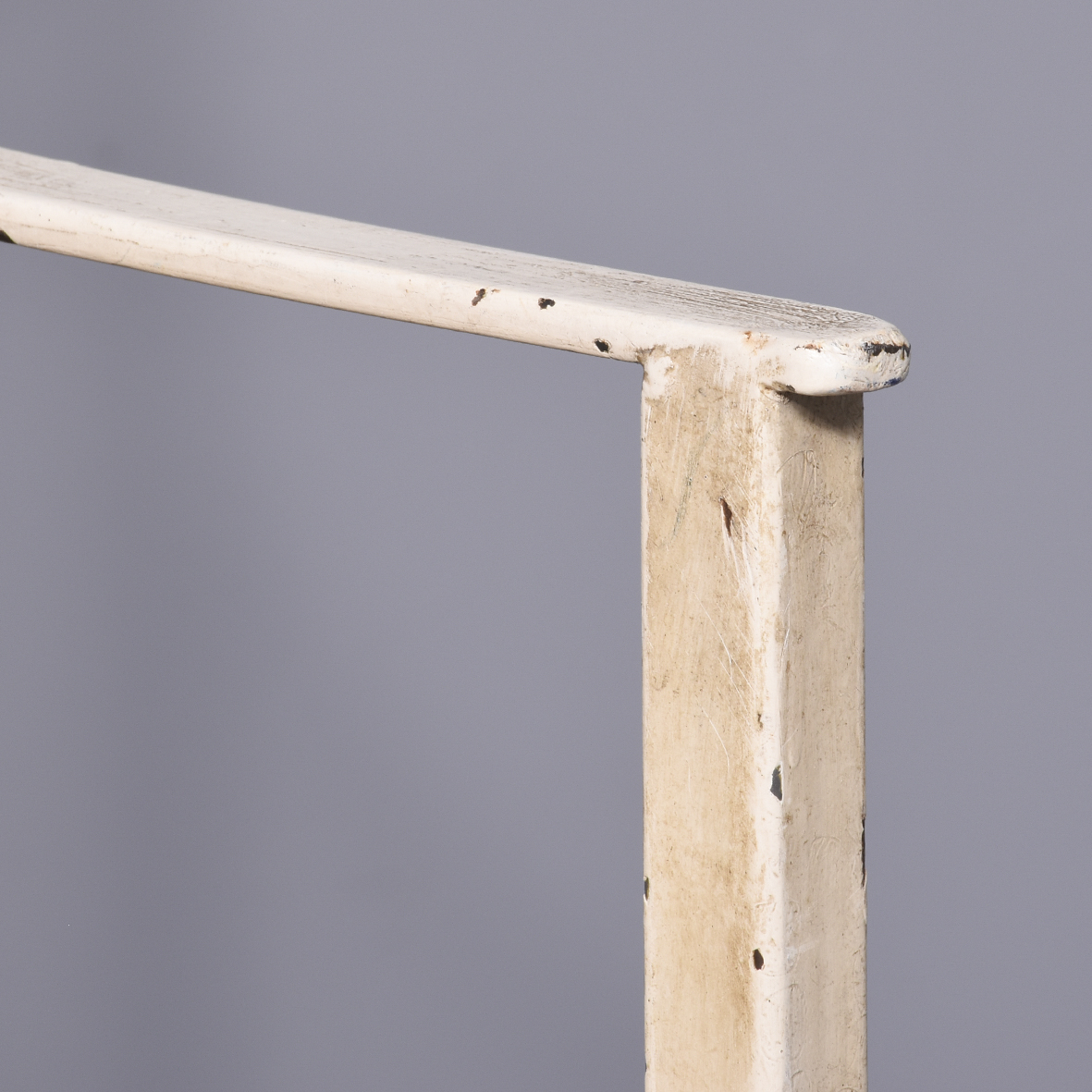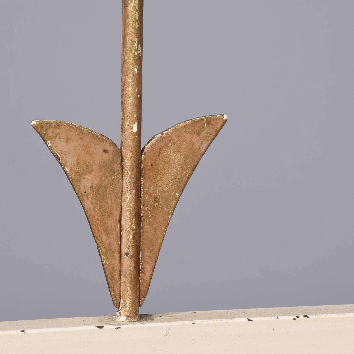 Circa 1970s. An interesting and stylish Italian metal, upholstered and painted hall bench. The top with a simple rail, with gilded finials, the back with six metal arrows, upholstered seat with two simple shaped arms supported on rectangular uprights, back legs are slightly out swept, with square front legs. The arrows and finials are gilded and the rest of the bench is in off white.