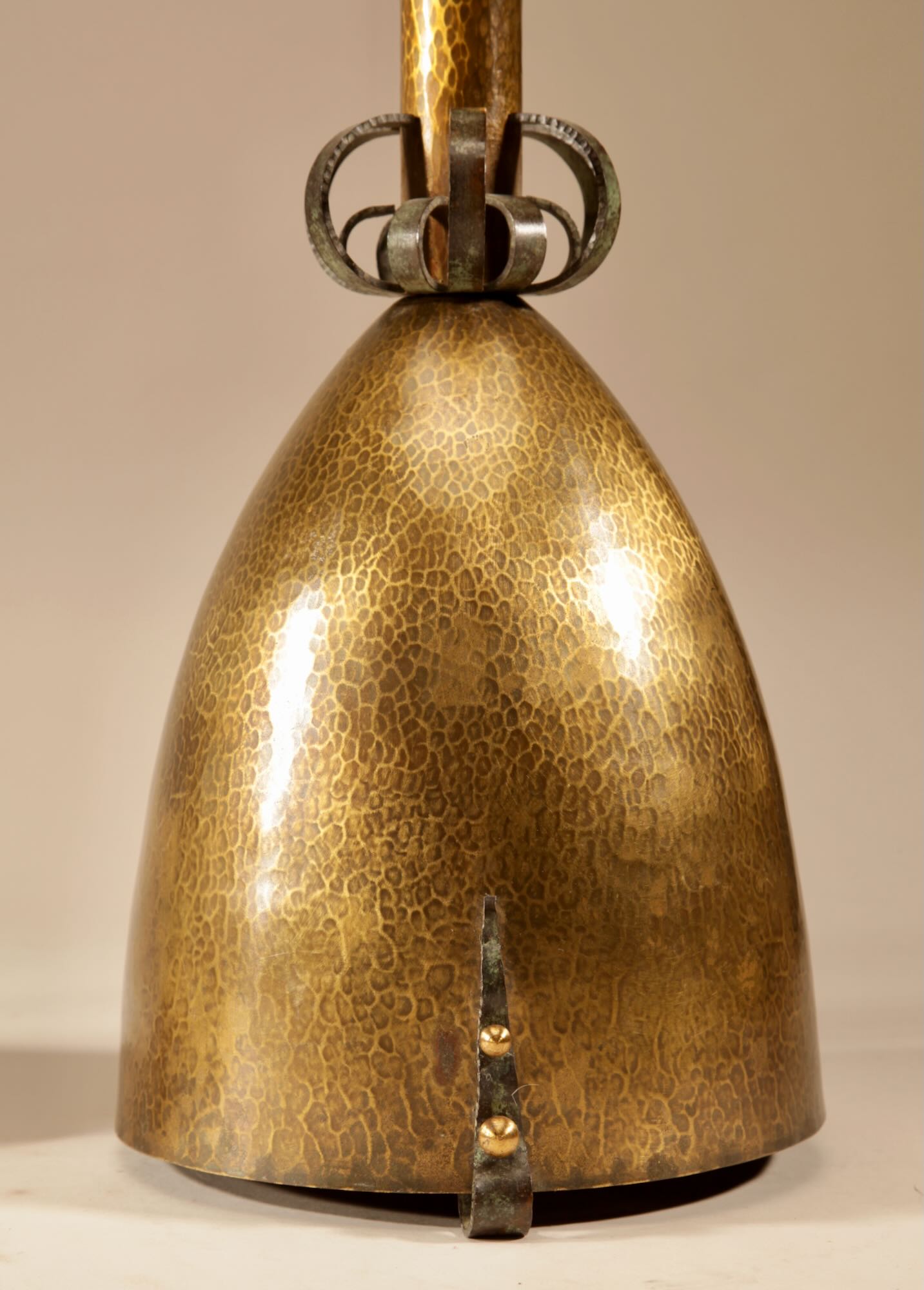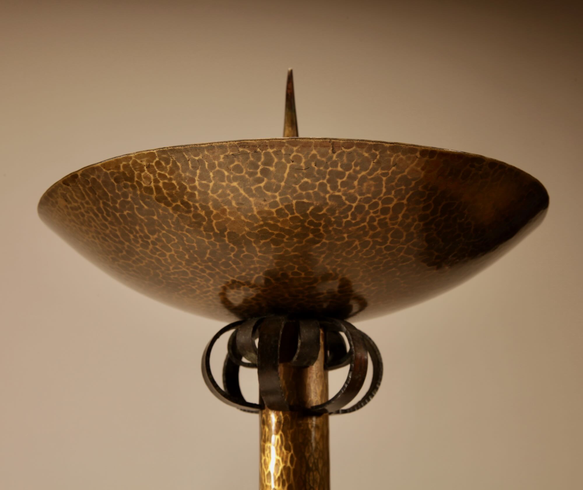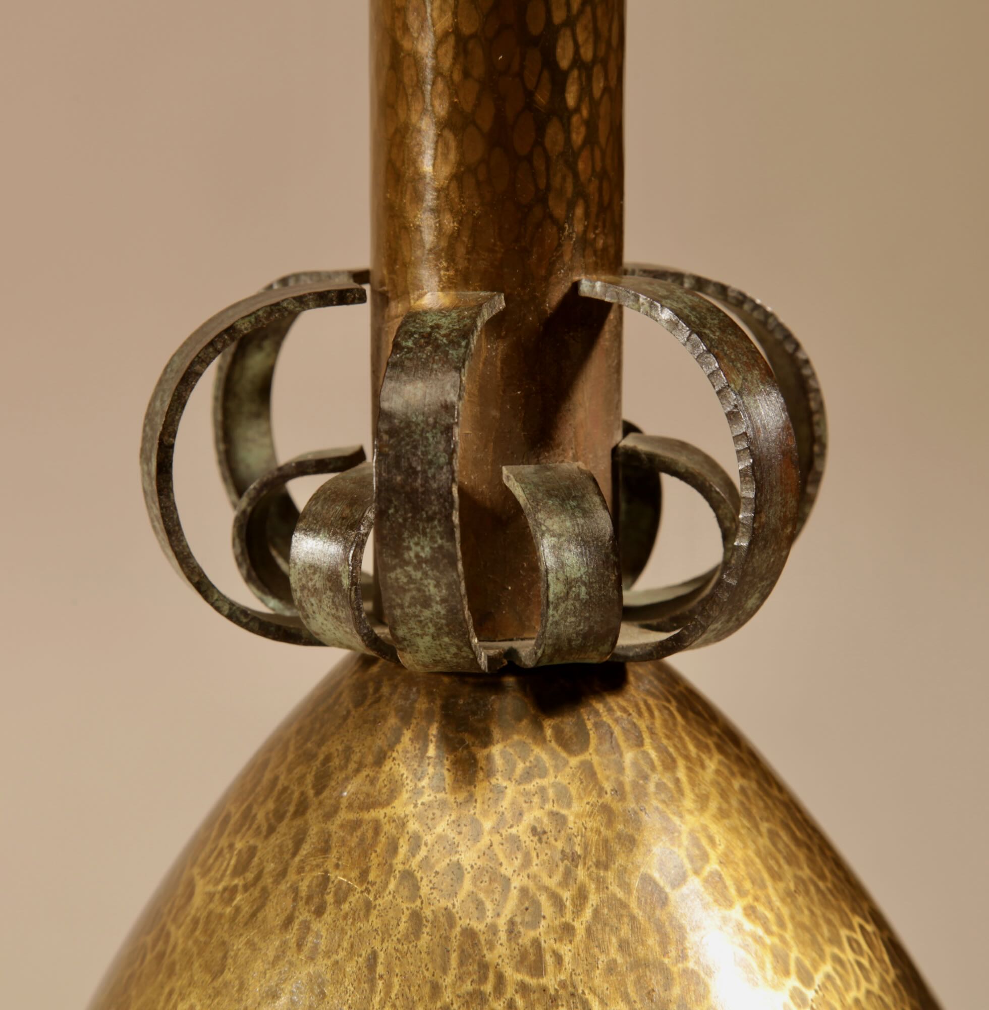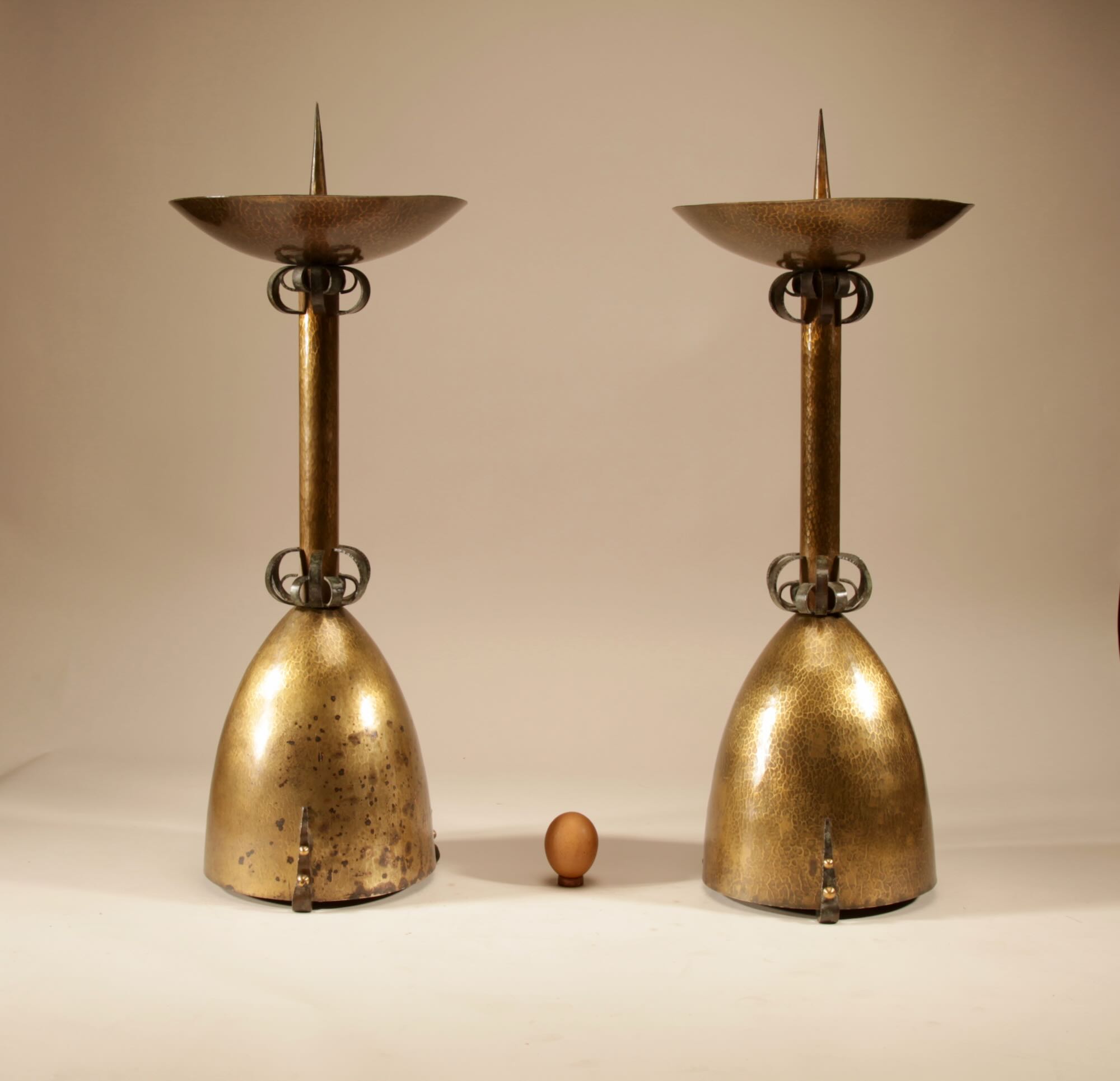 The candlesticks are fully brass hammered and with fine wrought iron ornaments on the stems.