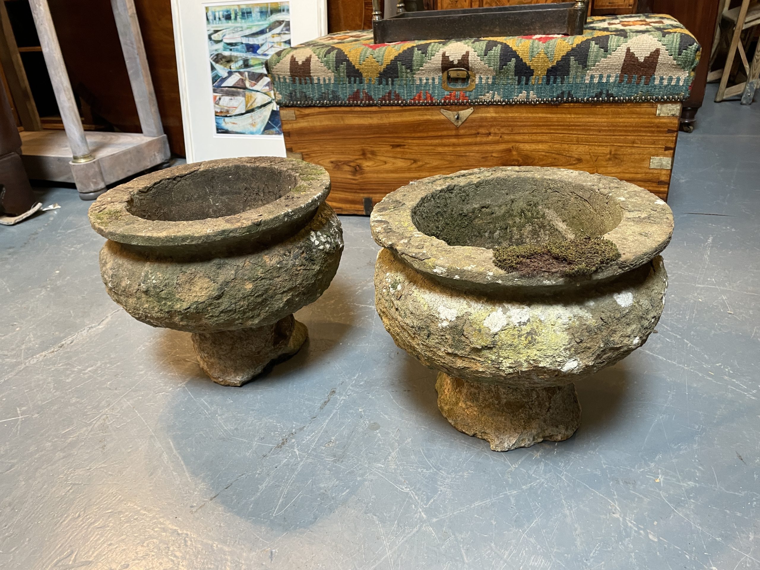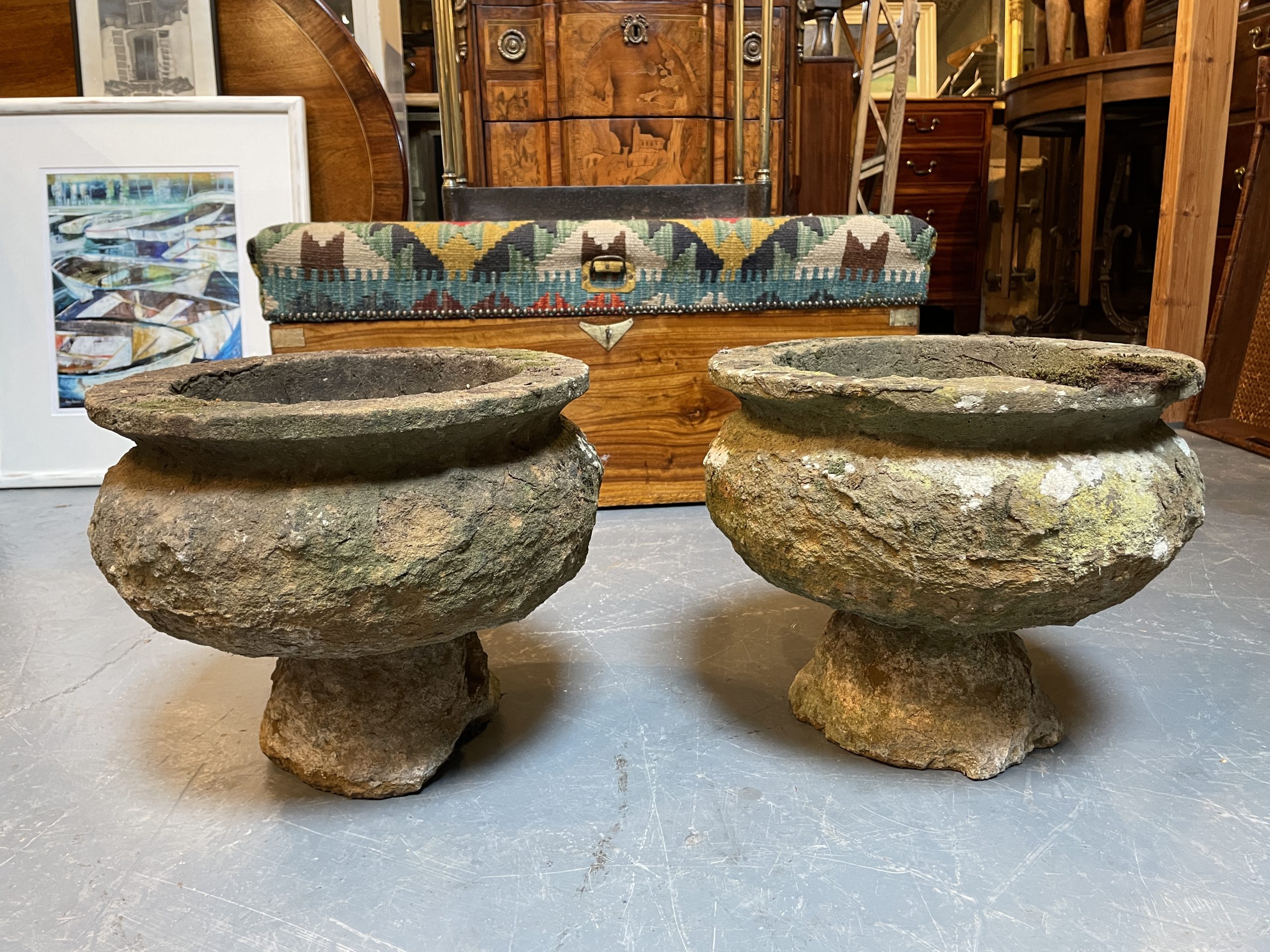 C19th carved soft stone urns retaining a heavily textured surface and weathered patination, raised on a worn socle base.