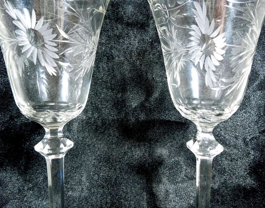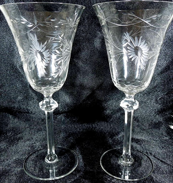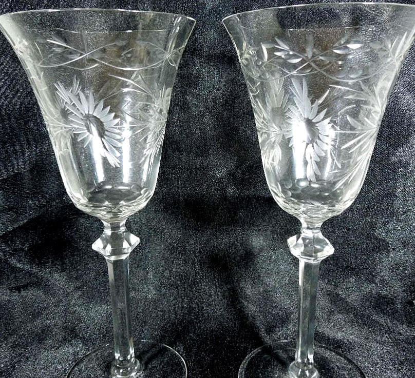 Fine pair of wine glasses, hand blown, etched bowls and cut crystal stems. C1900-1910.