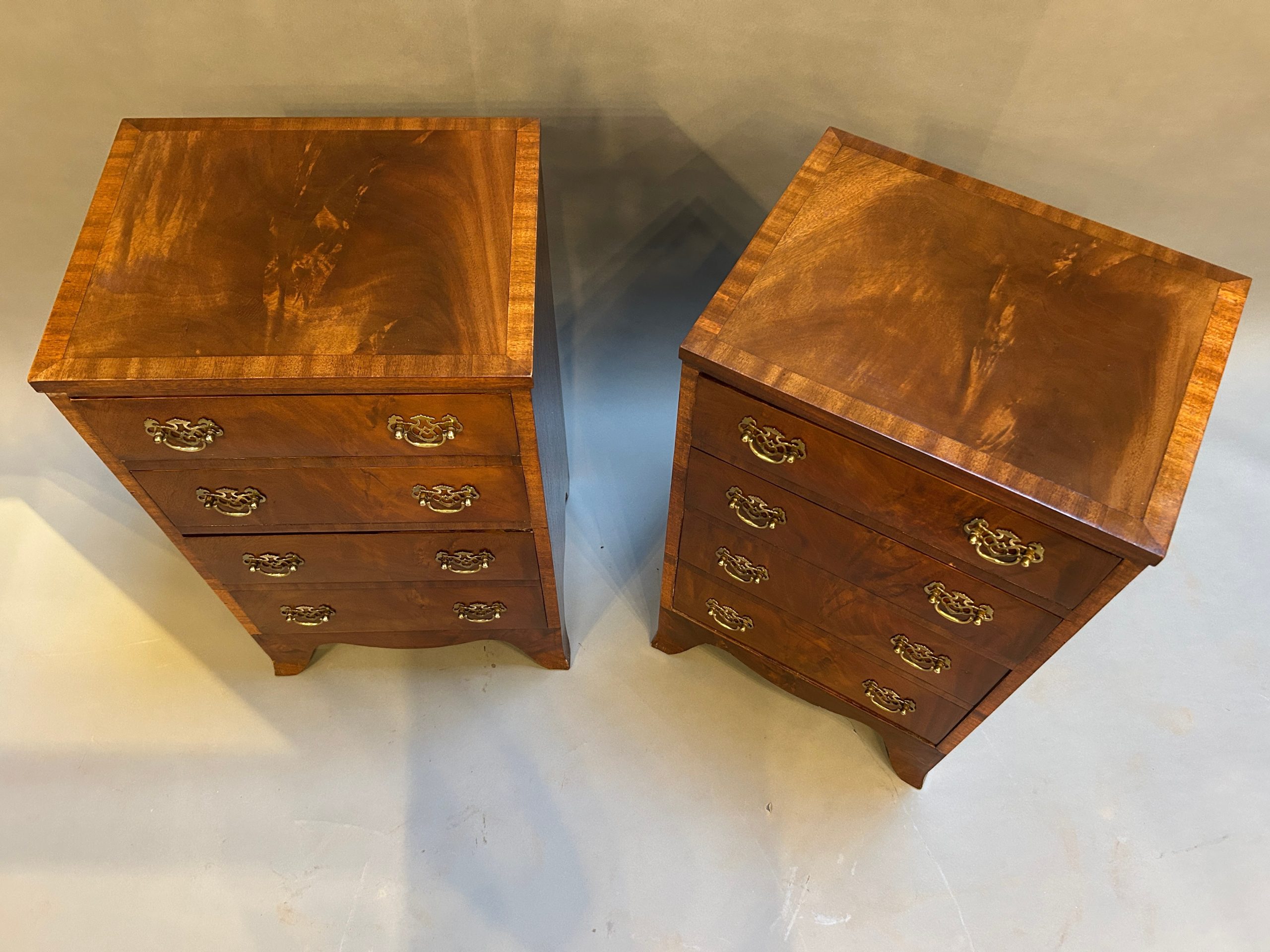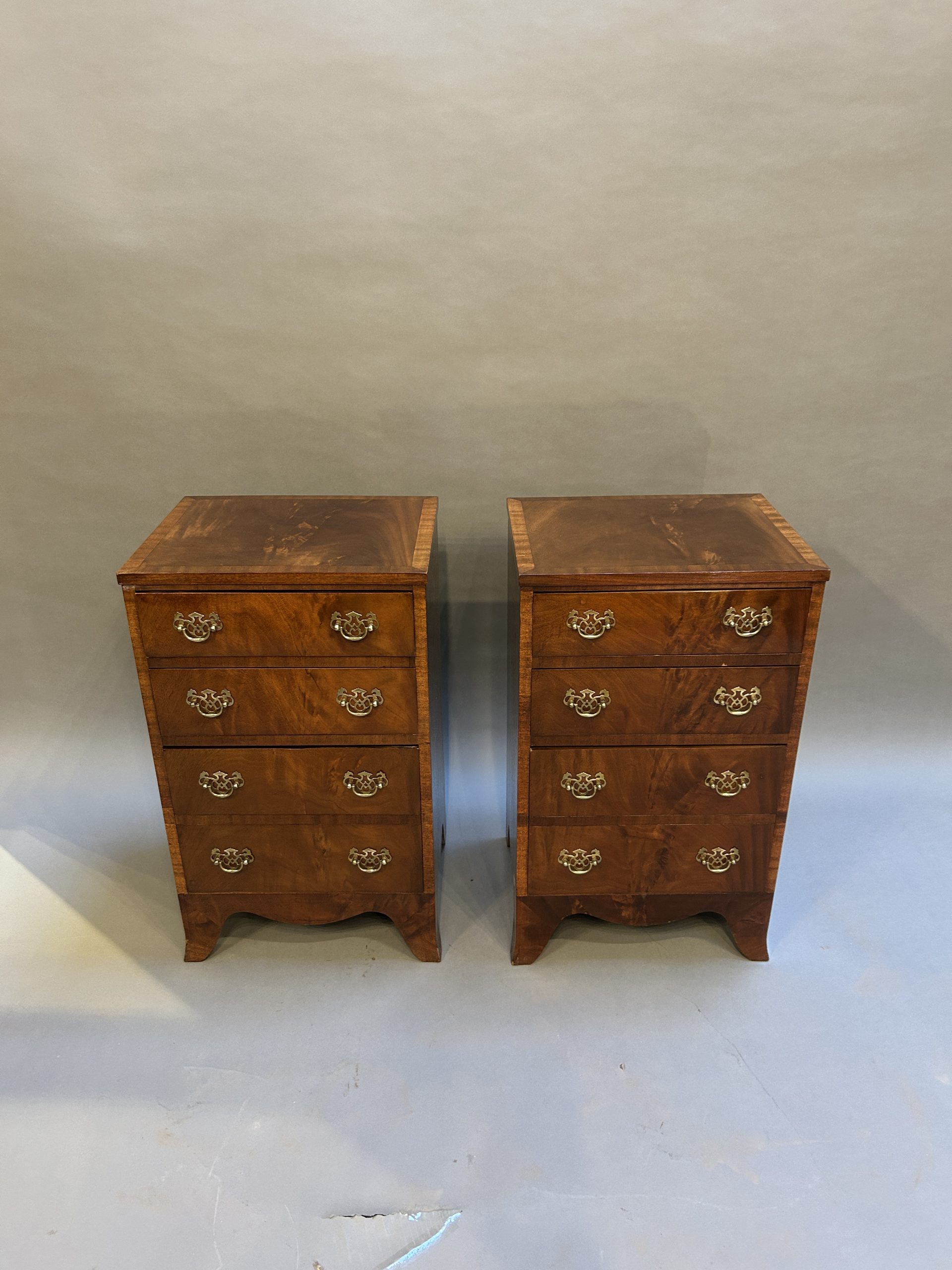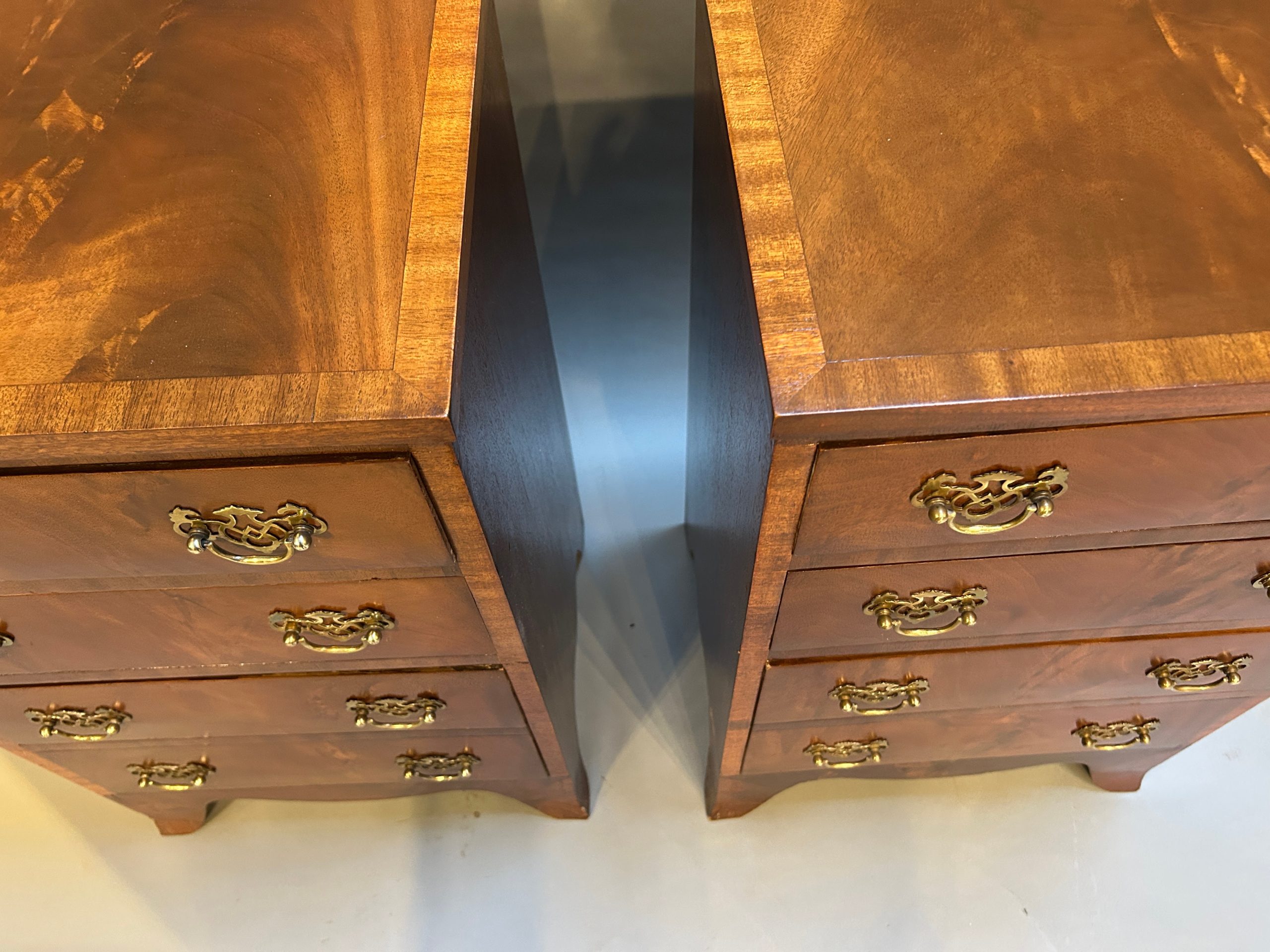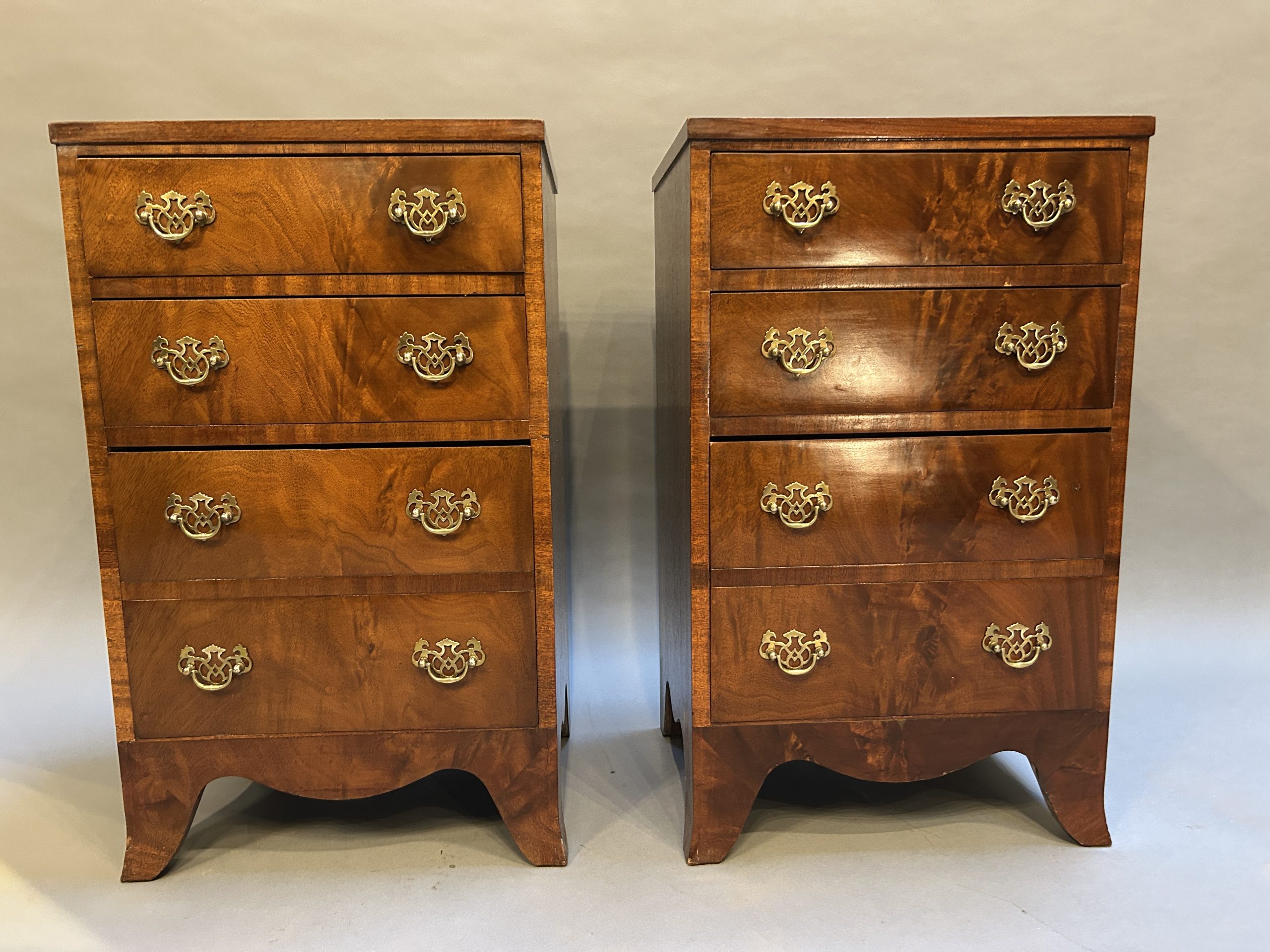 A pair of figured mahogany bedside chests the crossbanded tops over arrangement of graduated drawers with fret cut plate handles, raised on shaped apron and bracket feet.